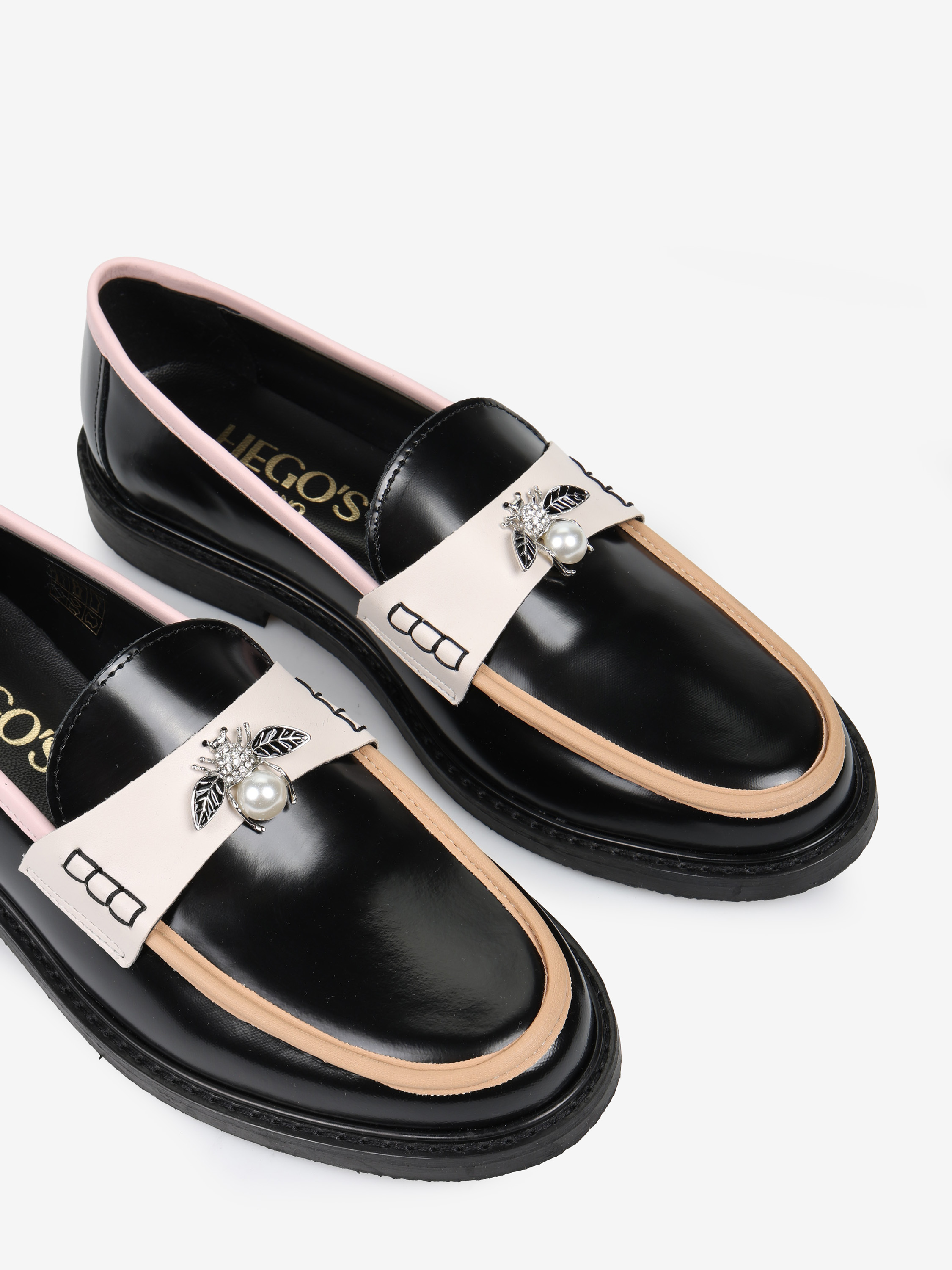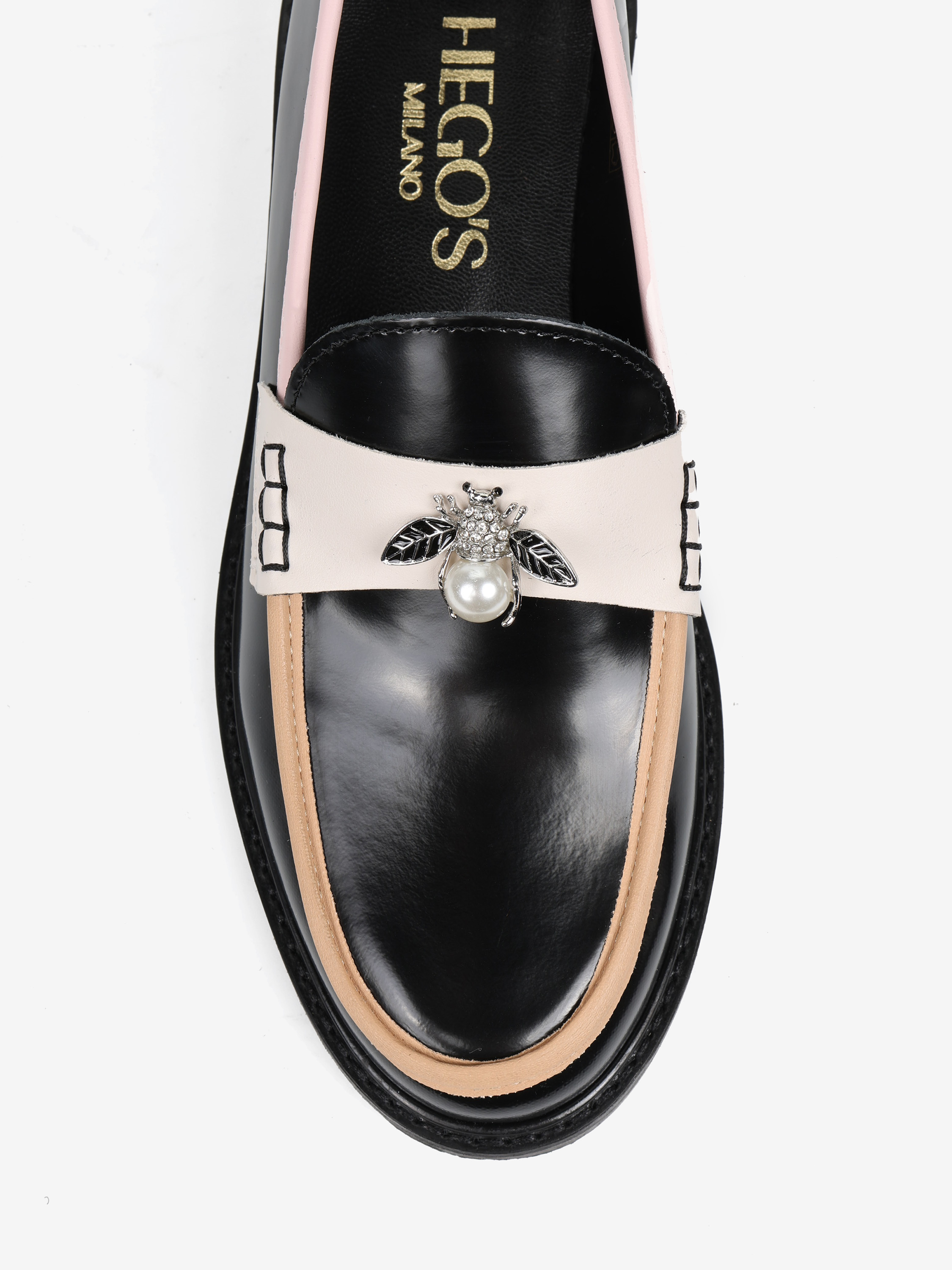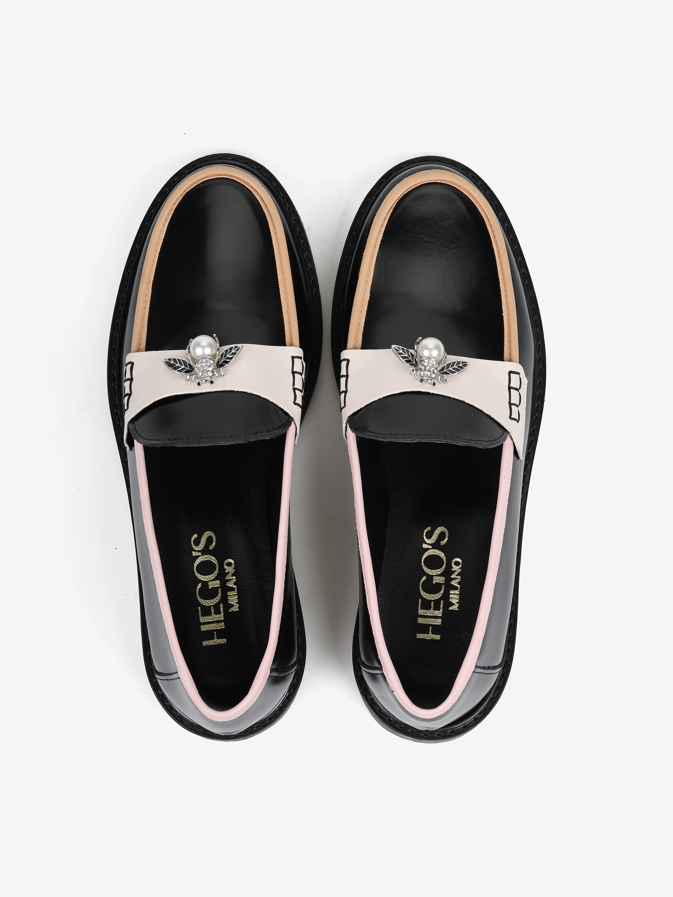 Mokasyny na płaskim obcasie to must have kobiecej garderoby. Wykonane są z włoskiej, naturalnej skóry.  Fason w stylu lordsy posiada wysoki język, charakterystyczny dla tego modelu. Modne połączenie kolorystyczne i broszka pszczoły to detale wyróżniające ten model.