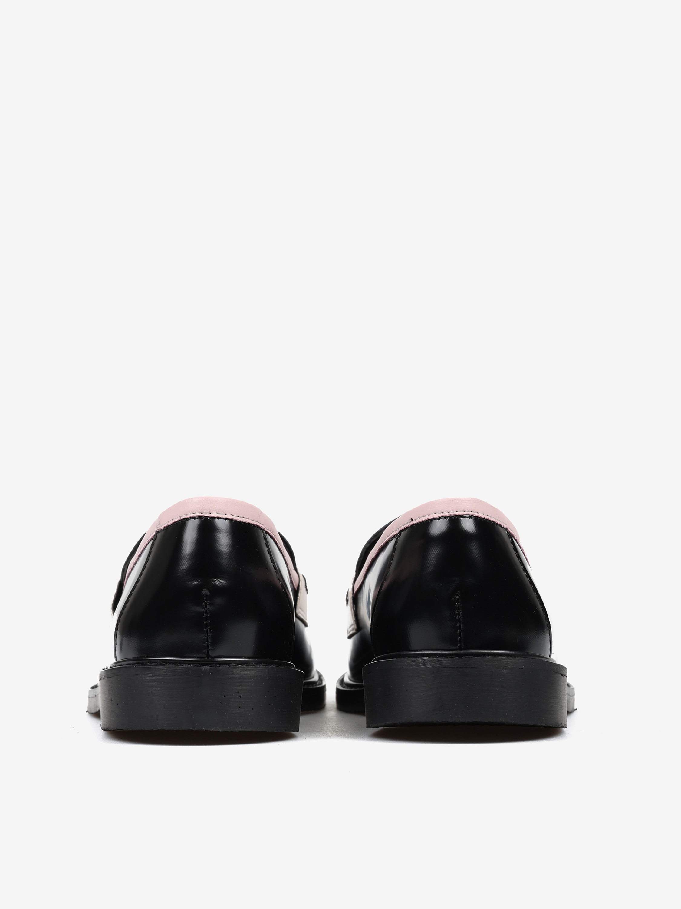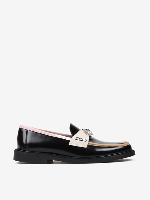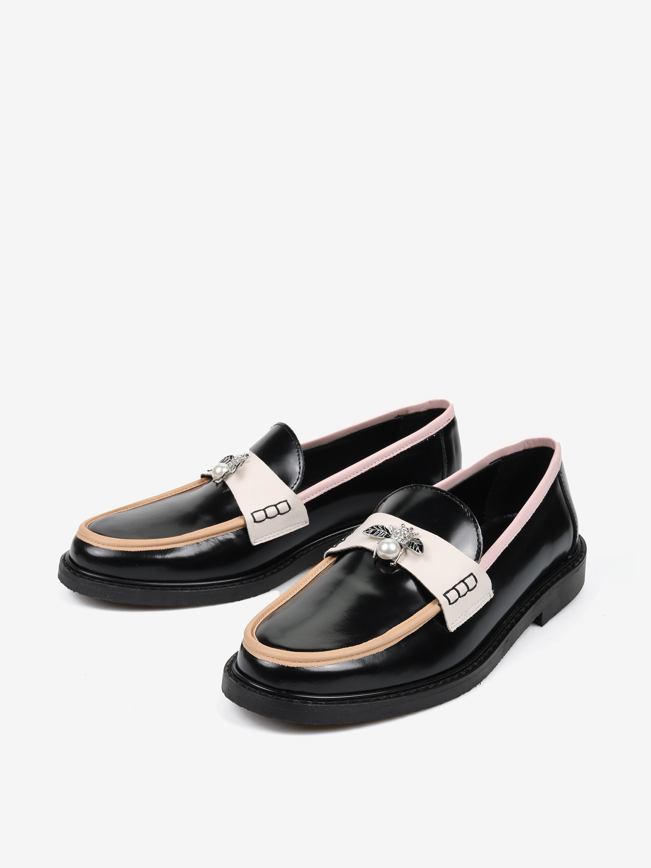 Mokasyny na płaskim obcasie to must have kobiecej garderoby. Wykonane są z włoskiej, naturalnej skóry.  Fason w stylu lordsy posiada wysoki język, charakterystyczny dla tego modelu. Modne połączenie kolorystyczne i broszka pszczoły to detale wyróżniające ten model.