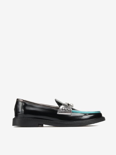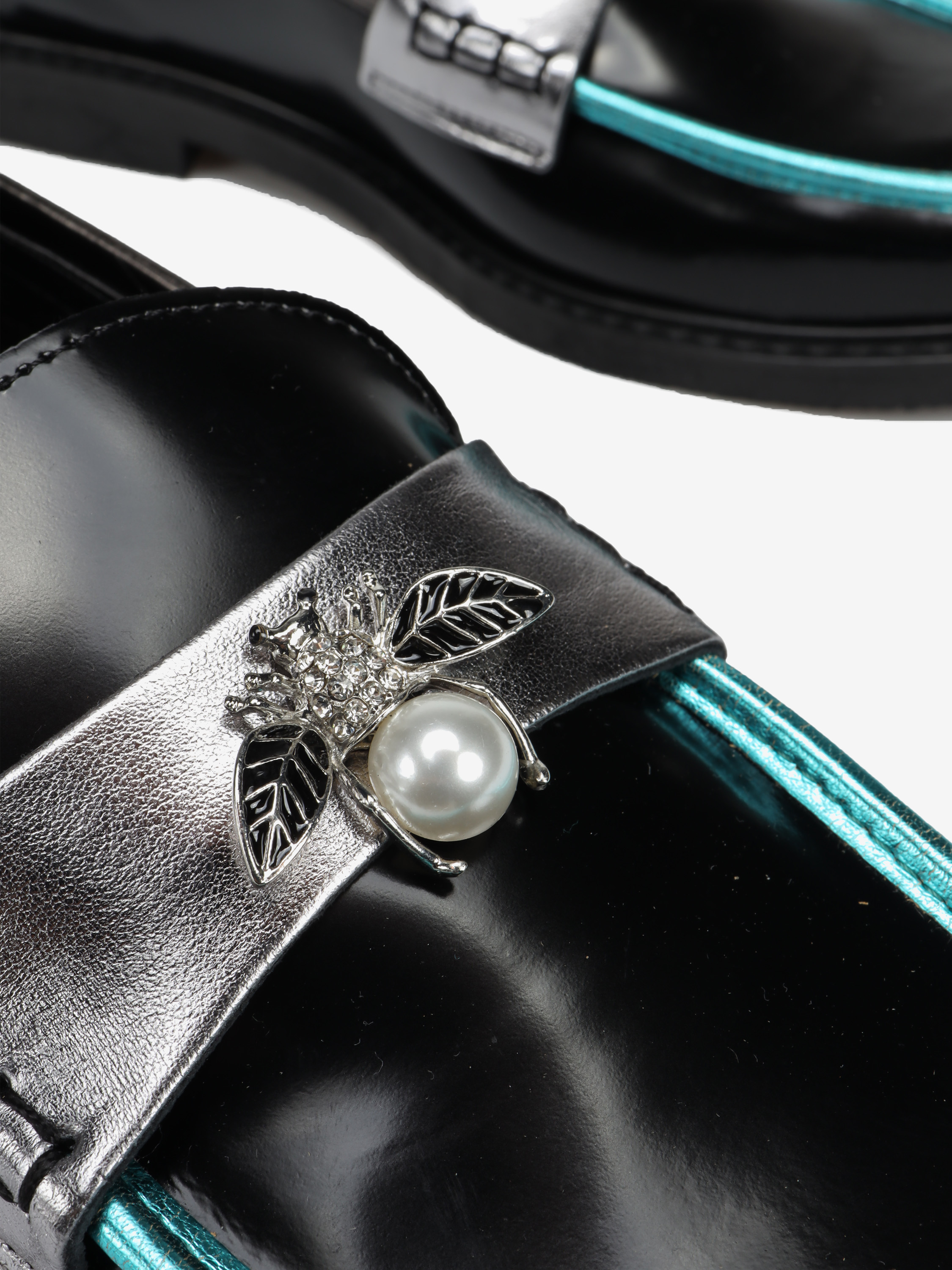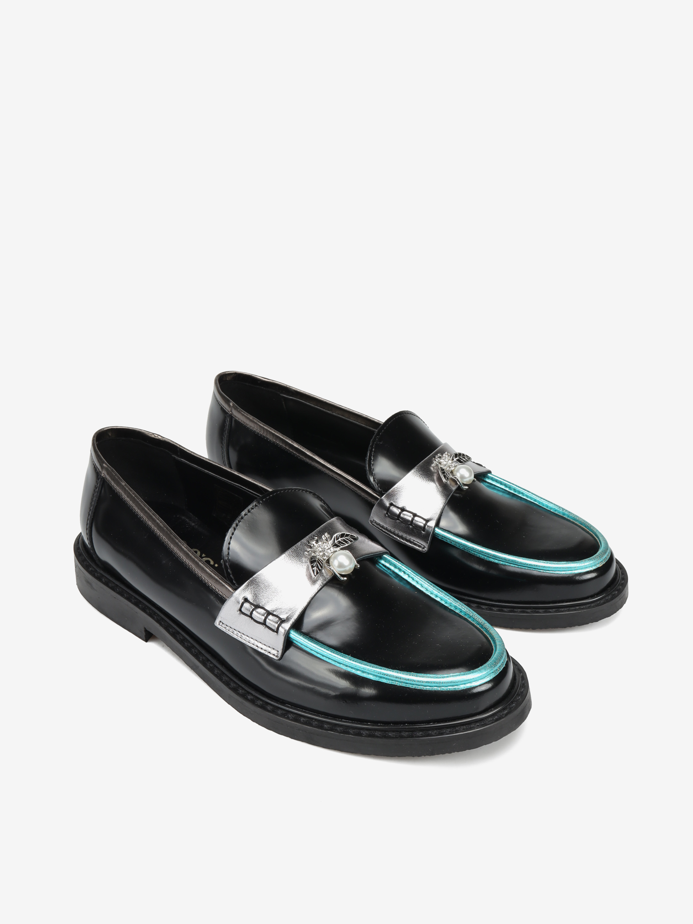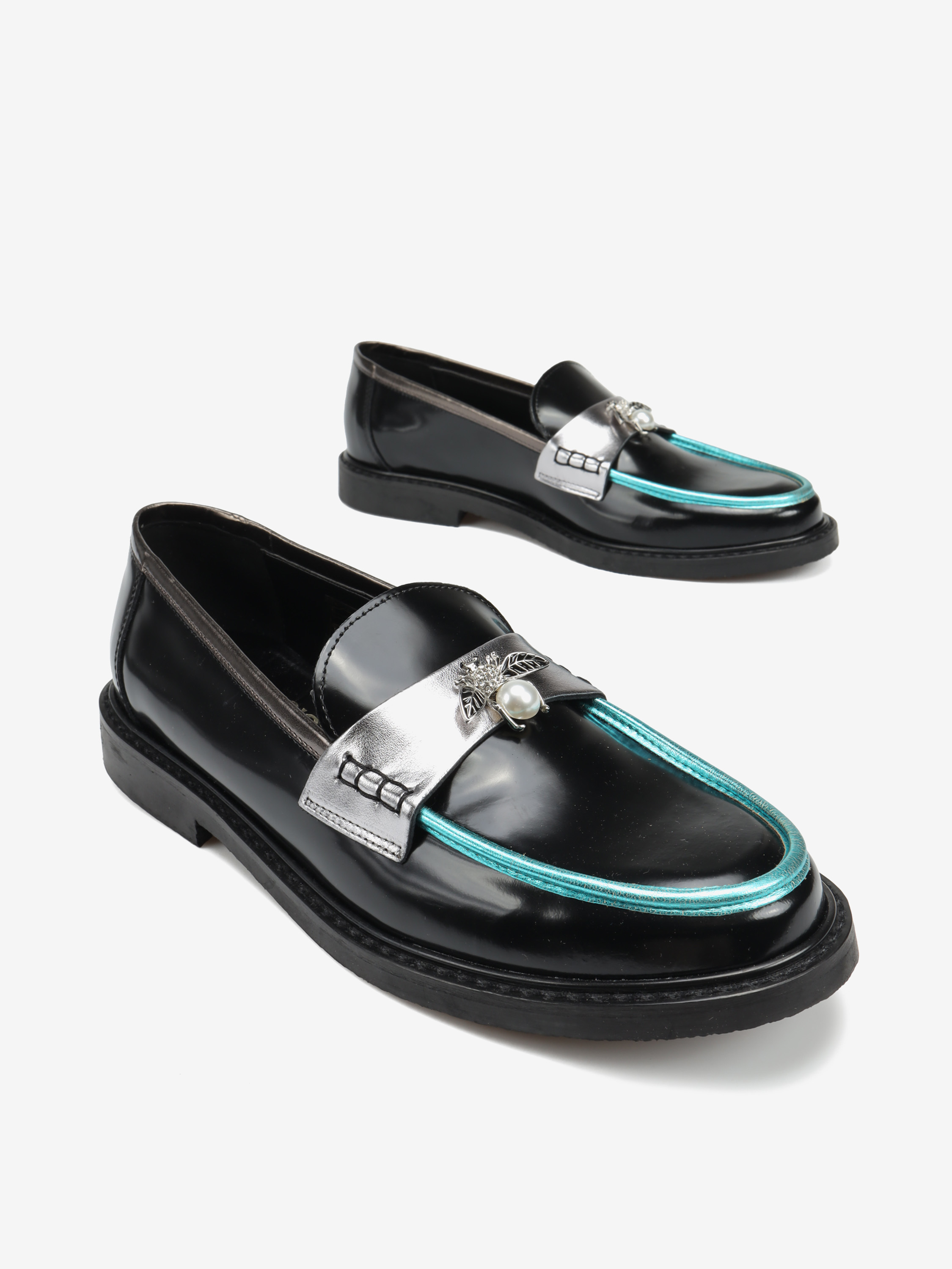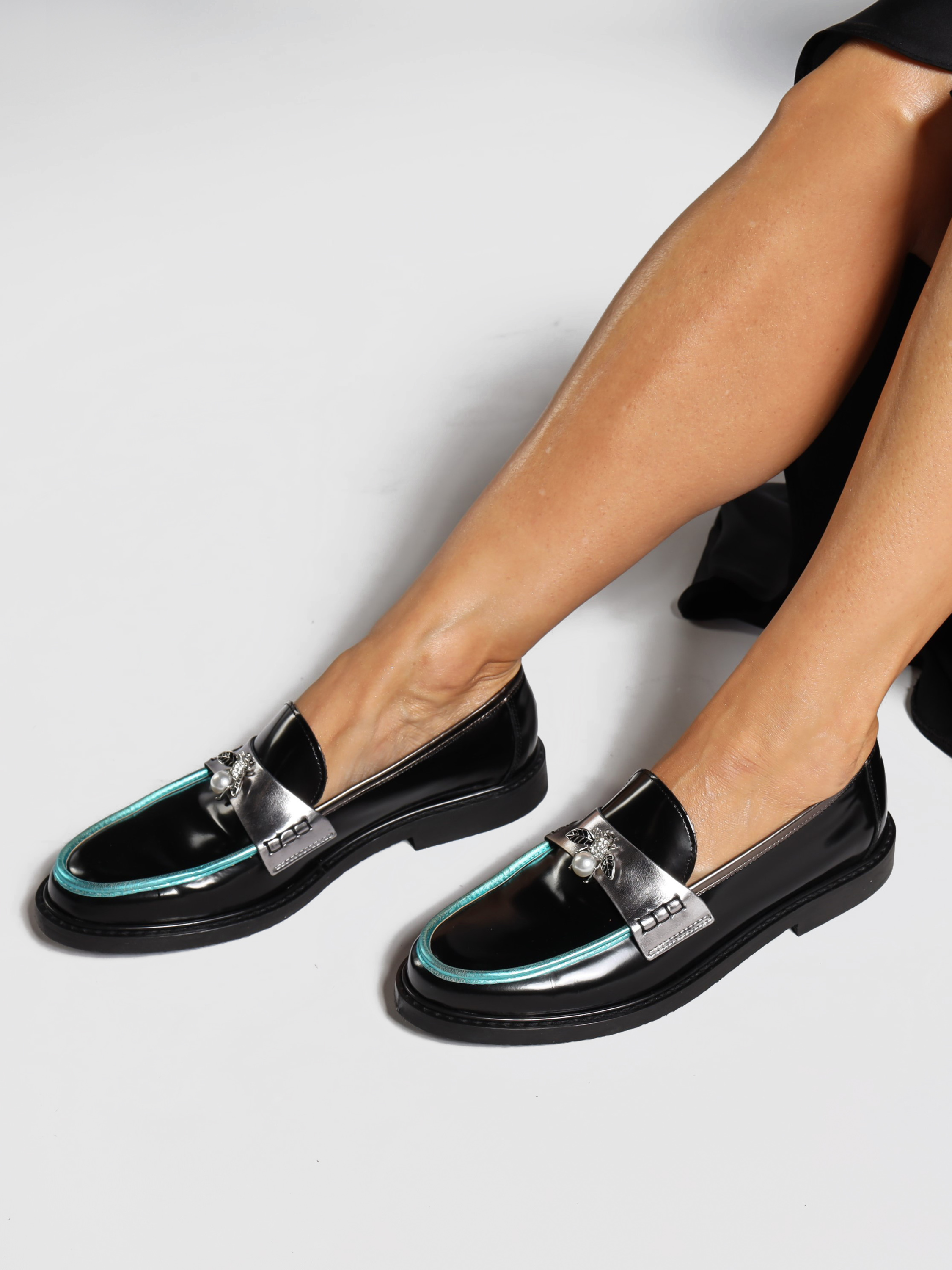 Mokasyny na płaskim obcasie to must have kobiecej garderoby. Wykonane są z włoskiej, naturalnej skóry.  Fason w stylu lordsy posiada wysoki język, charakterystyczny dla tego modelu. Modne połączenie kolorystyczne i broszka pszczoły to detale wyróżniające ten model.