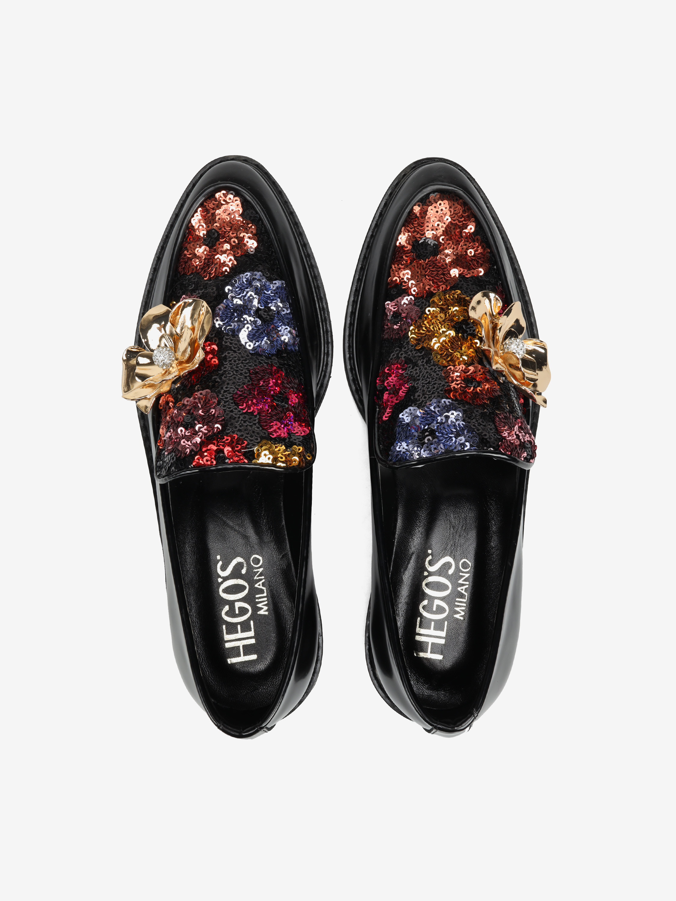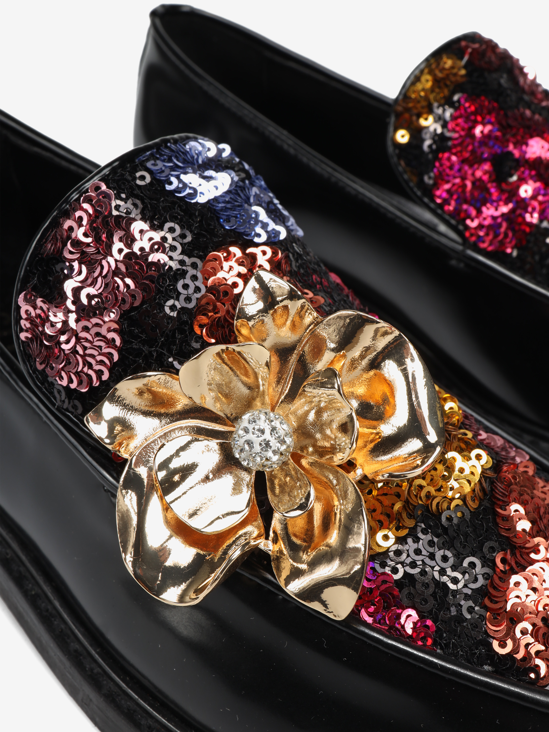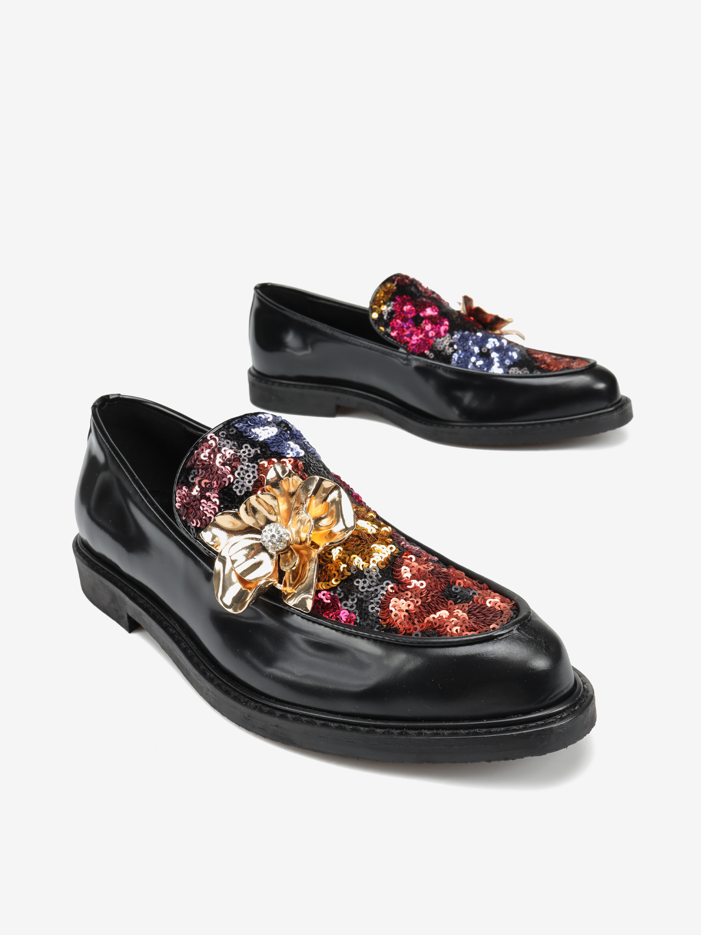 Mokasyny wykonane z wysokopolerowanej skóry, ozdobione wielobarwnymi cekinami i metalowym, biżuteryjnym kwiatem.