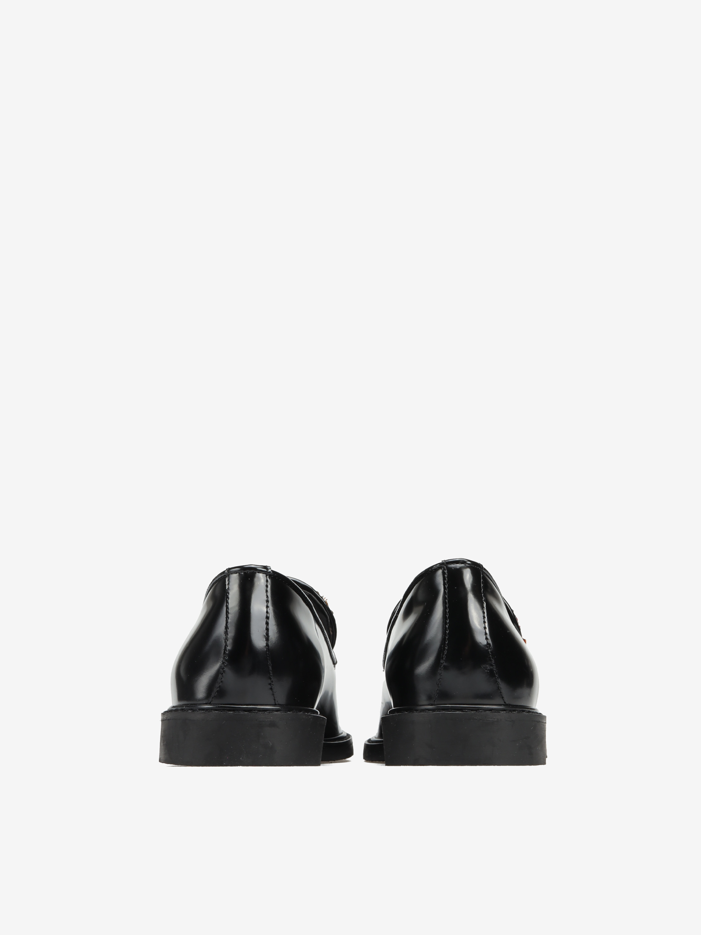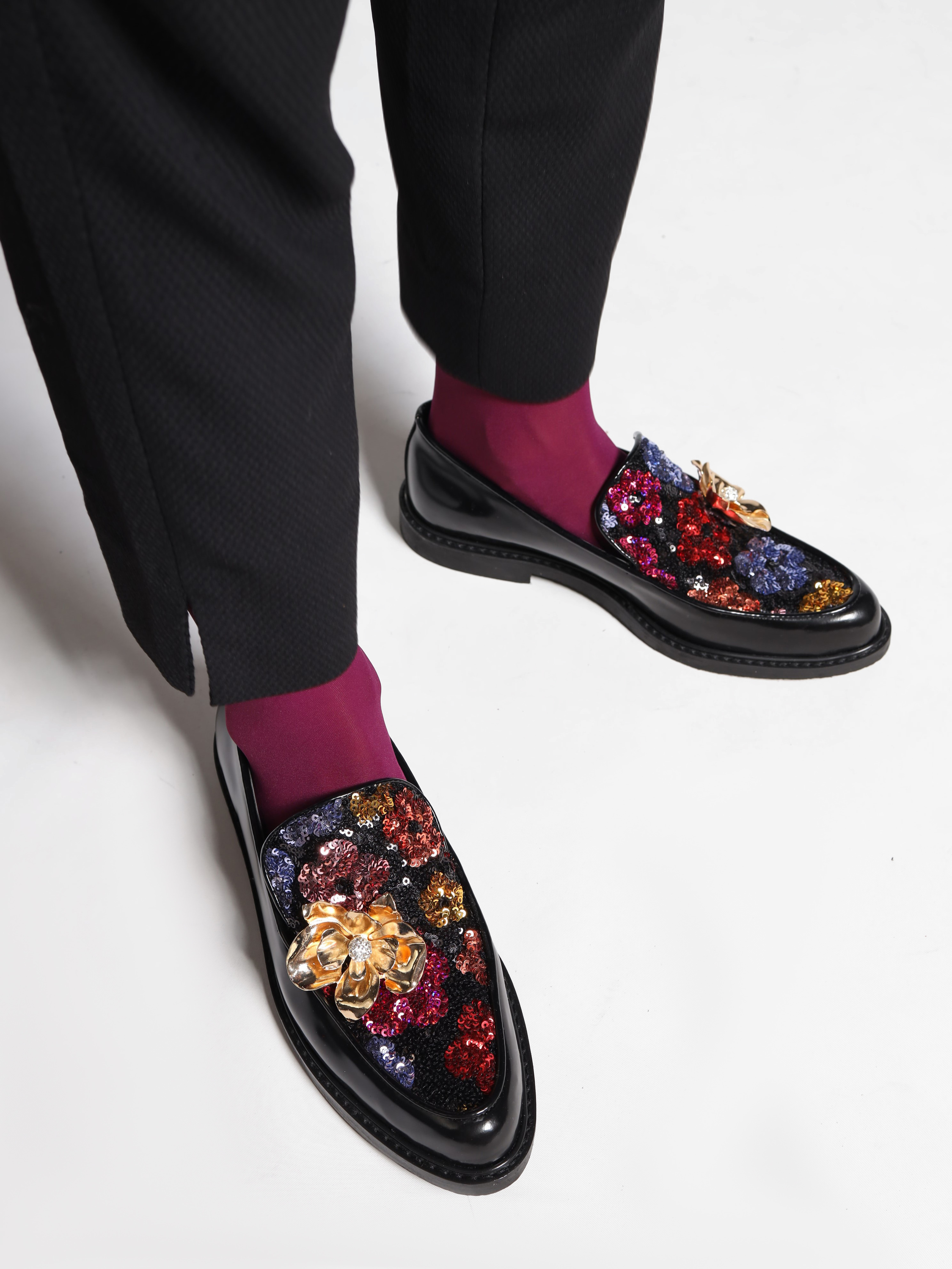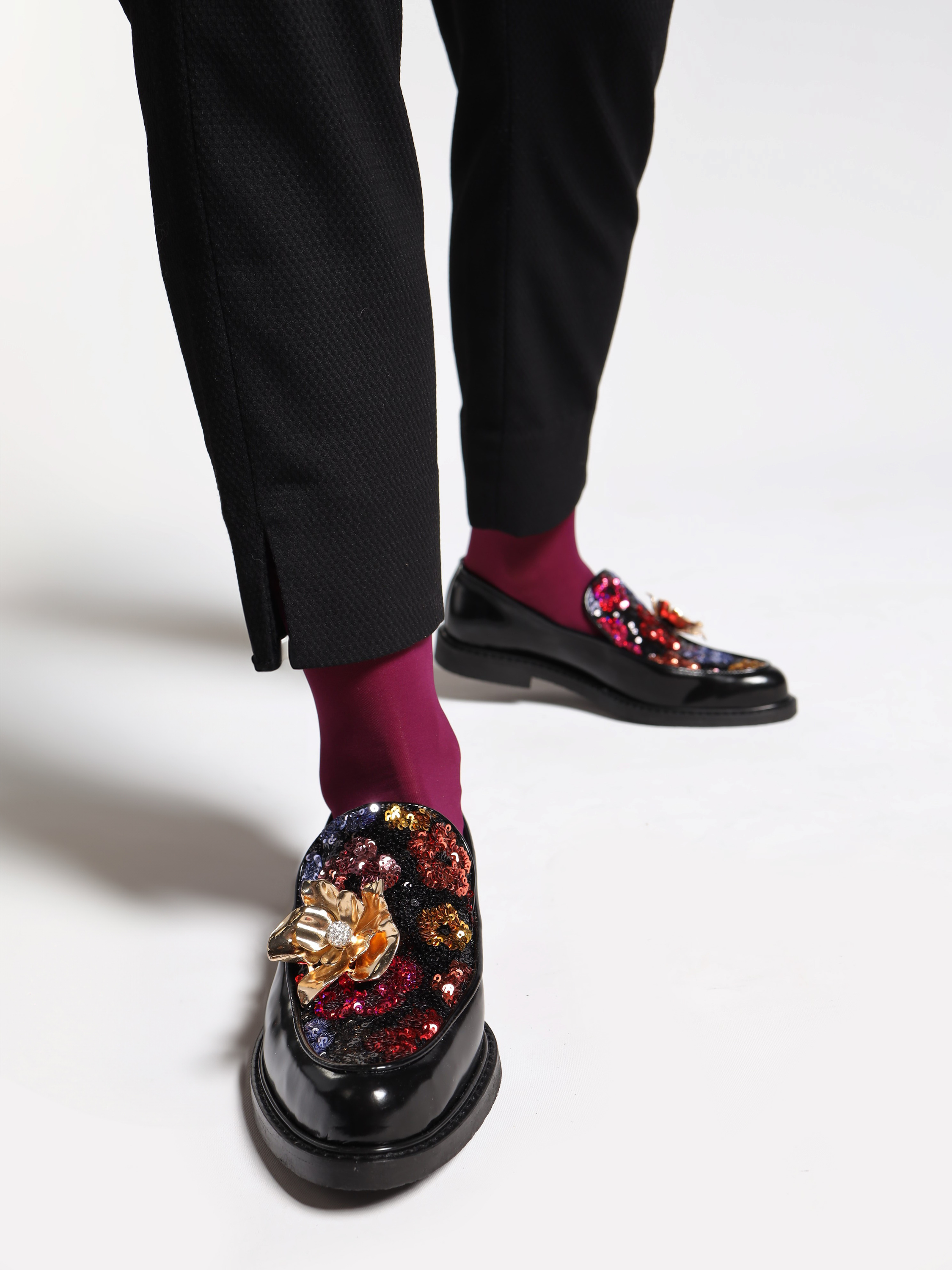 Mokasyny wykonane z wysokopolerowanej skóry, ozdobione wielobarwnymi cekinami i metalowym, biżuteryjnym kwiatem.