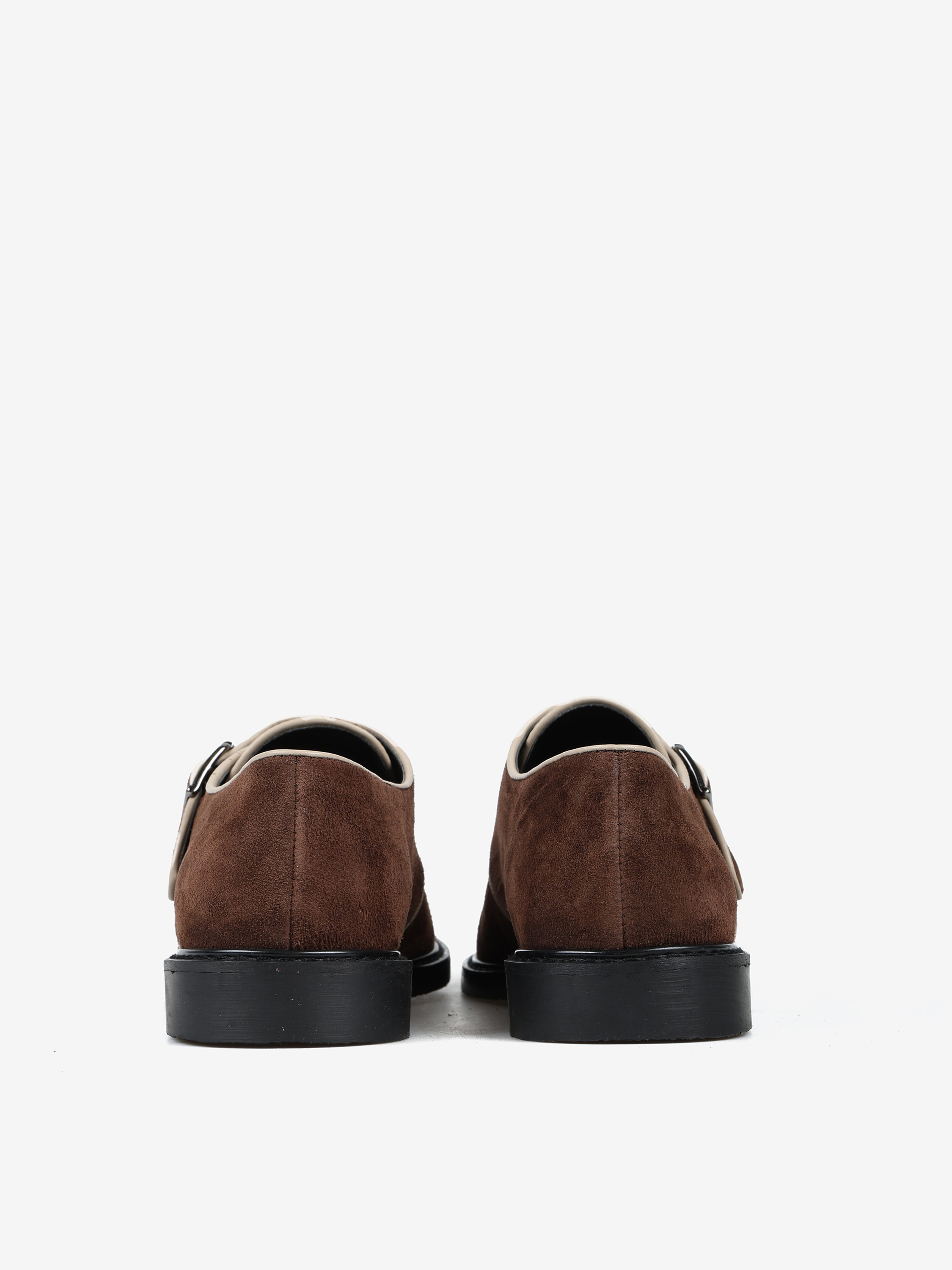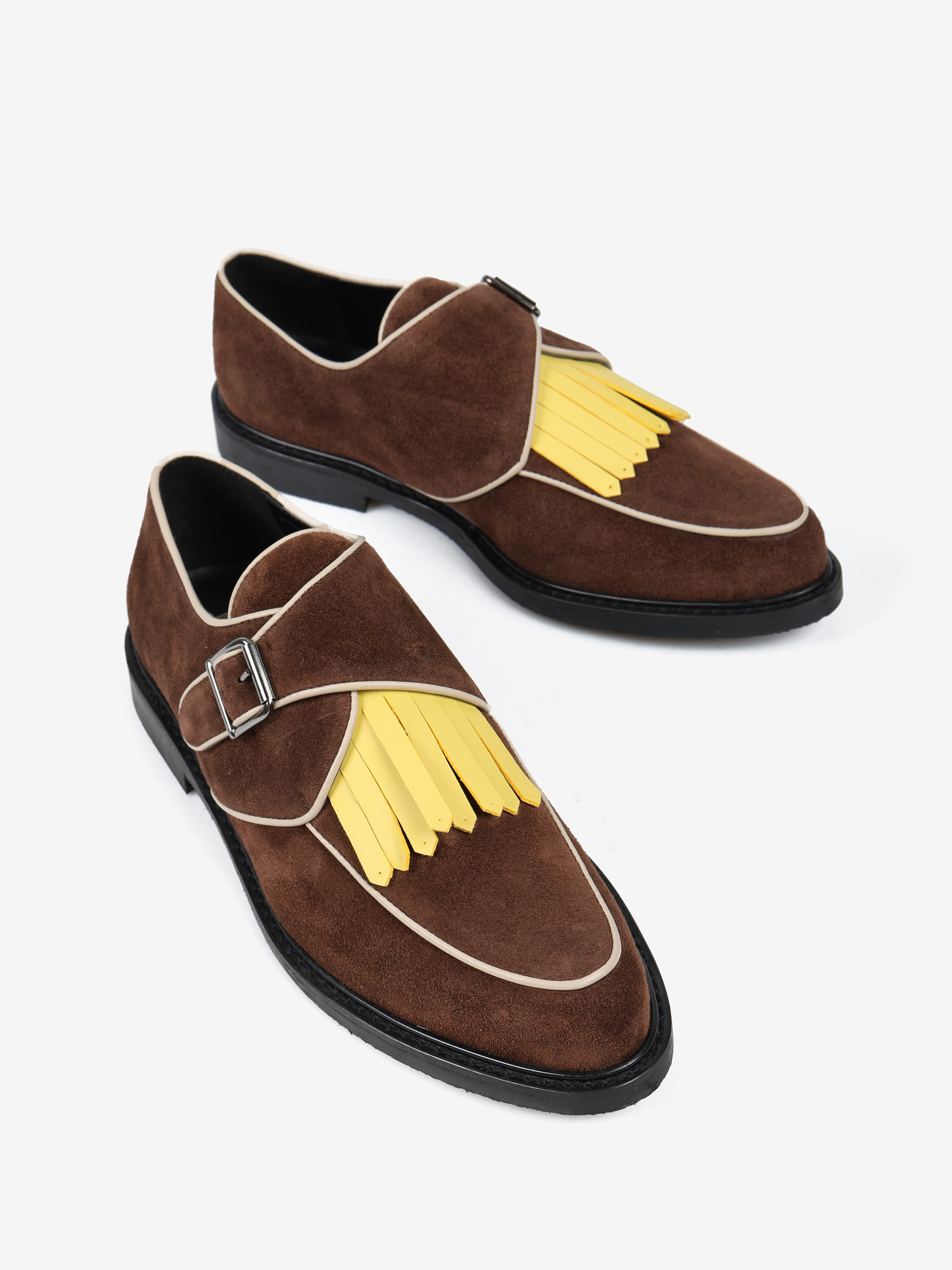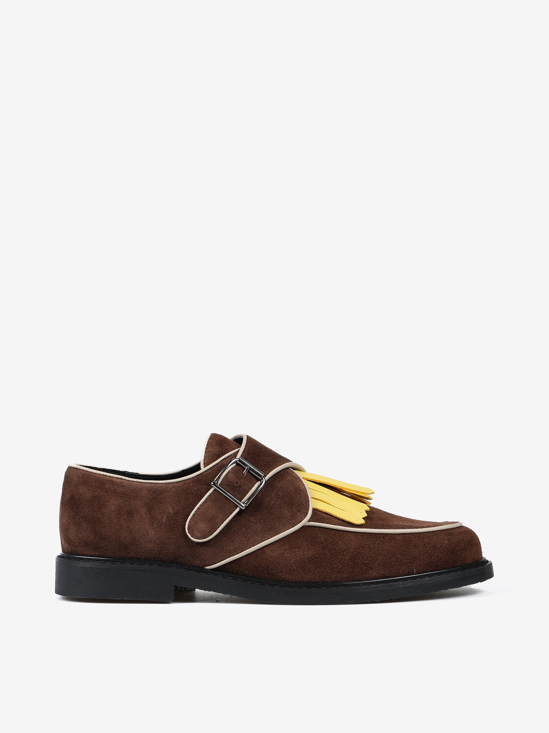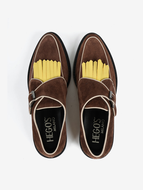 Zamszowe półbuty z regulowanym zapięciem. Kontrastująca, kremowa lamówka i ozdobne frędzle.