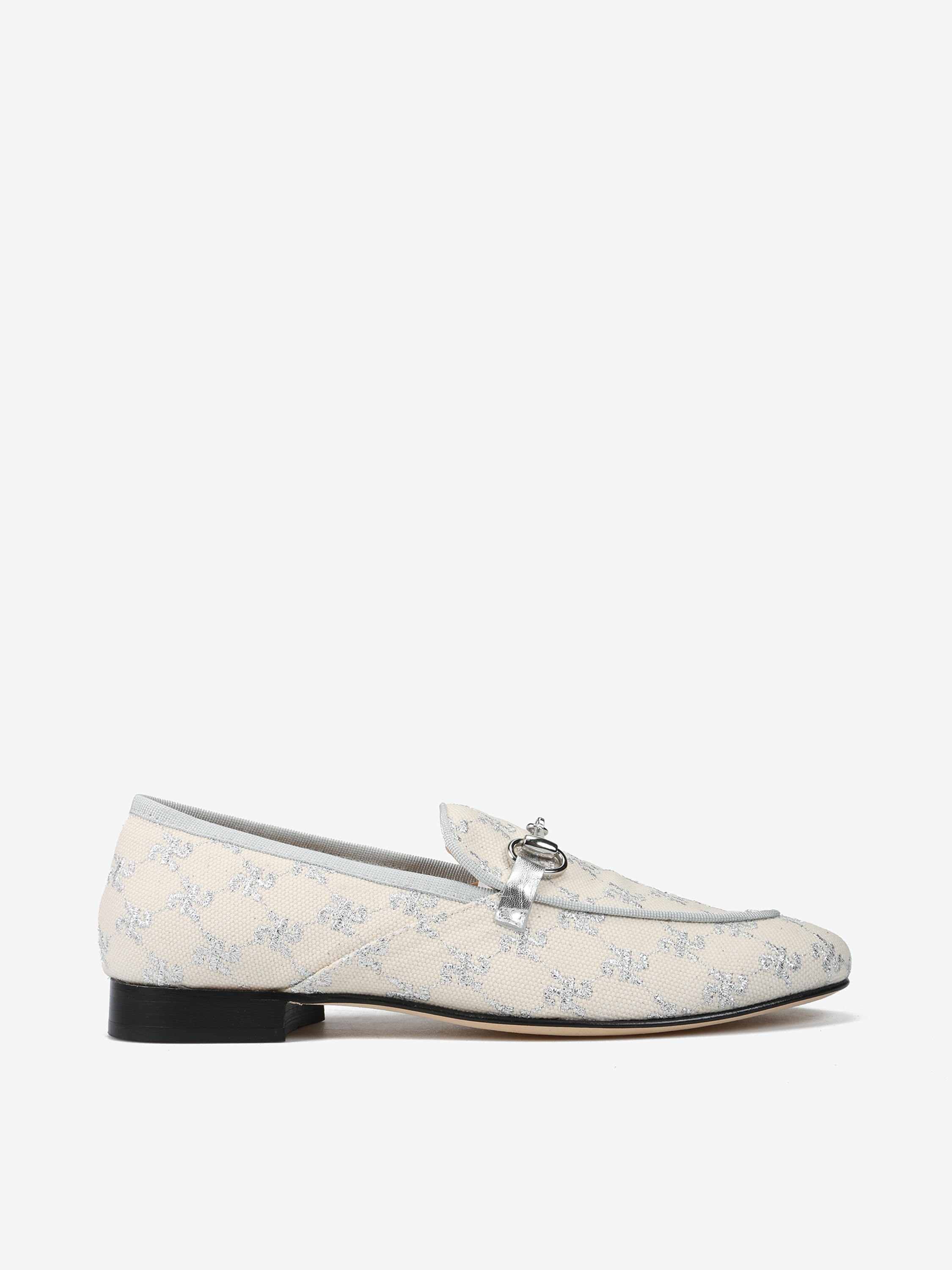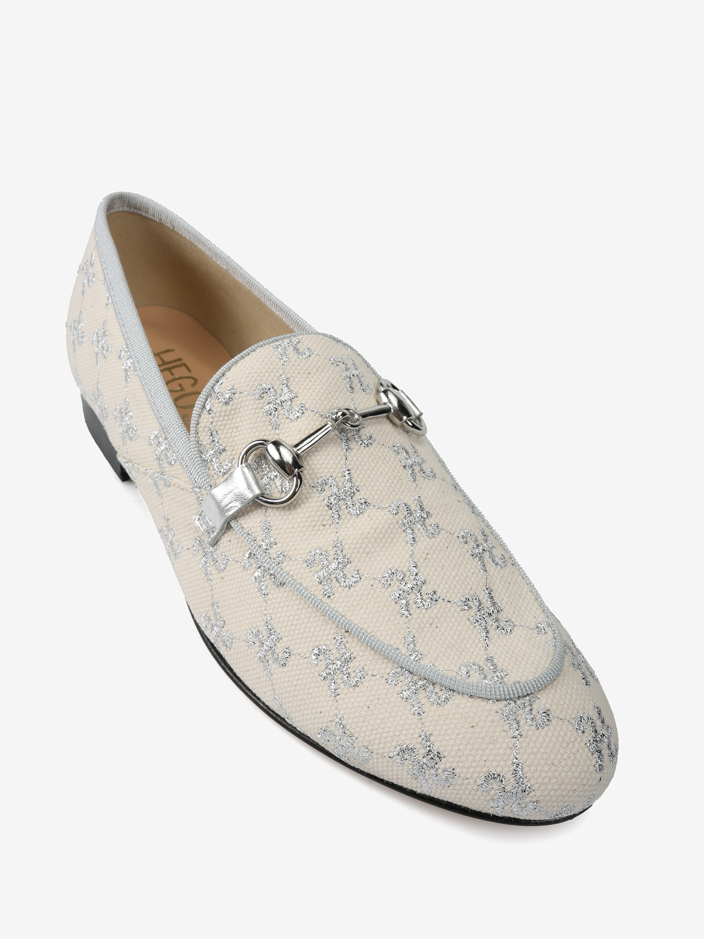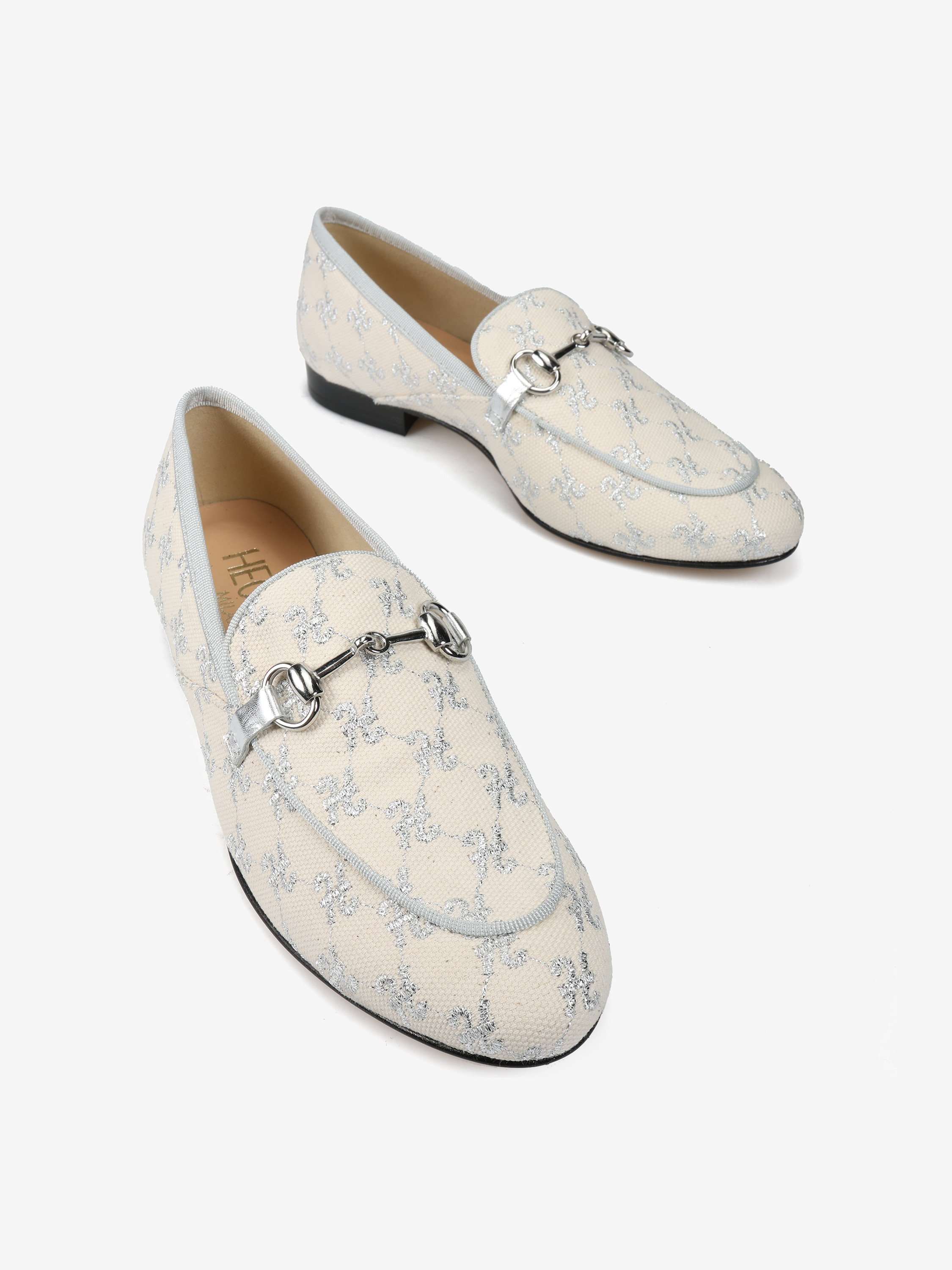 Mokasyny z haftowanym monogramem i metalowym wędzidłem.