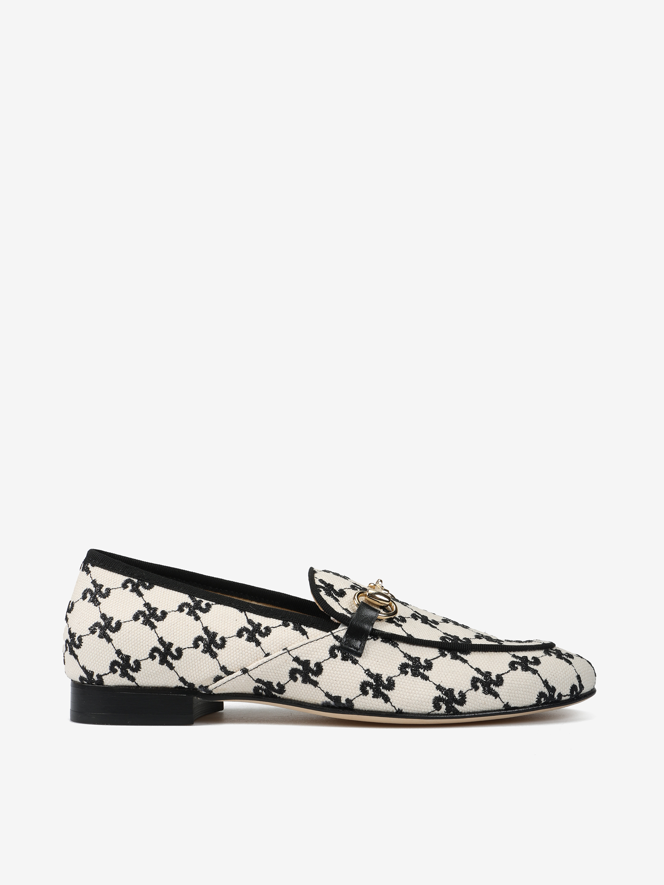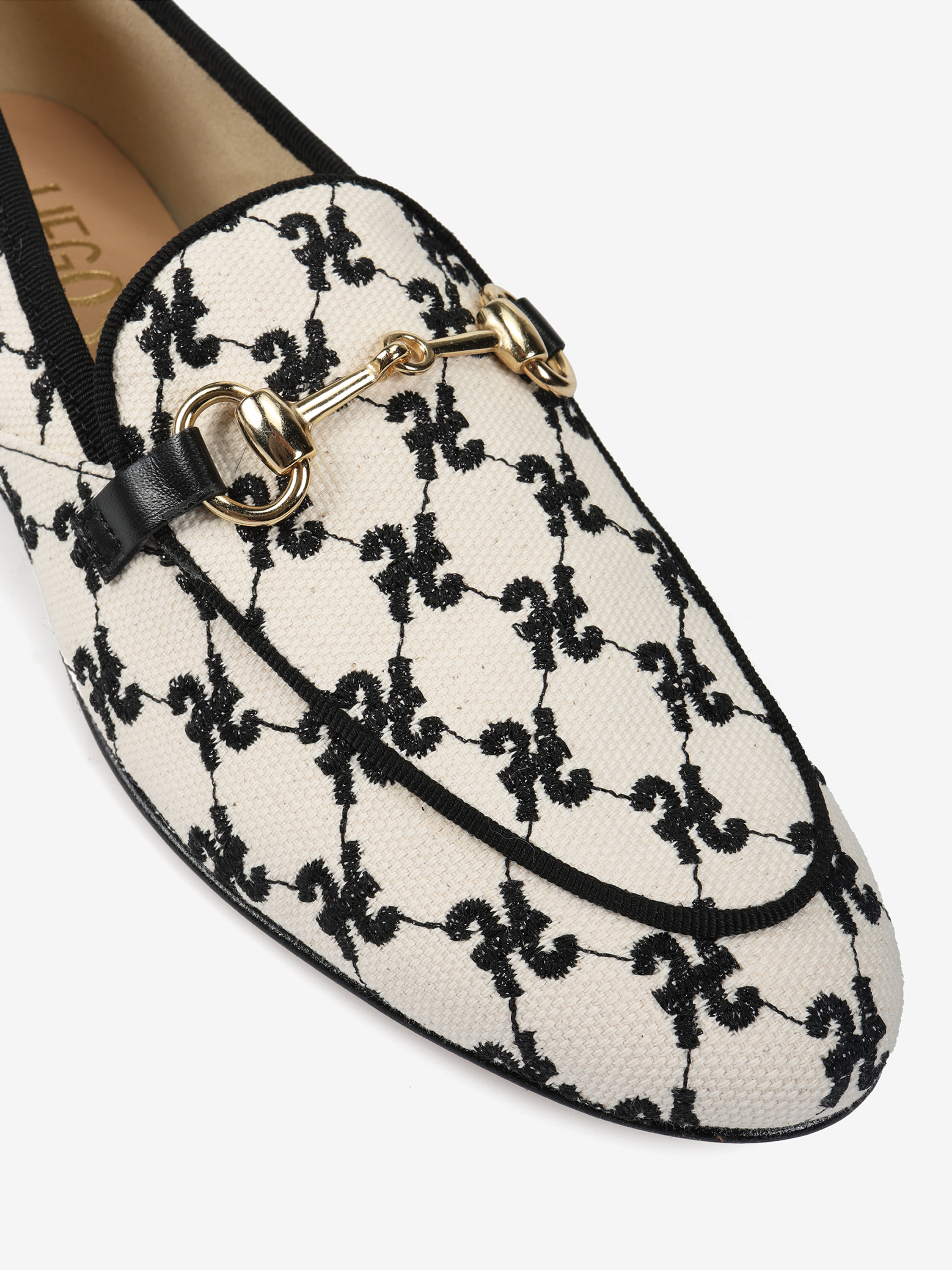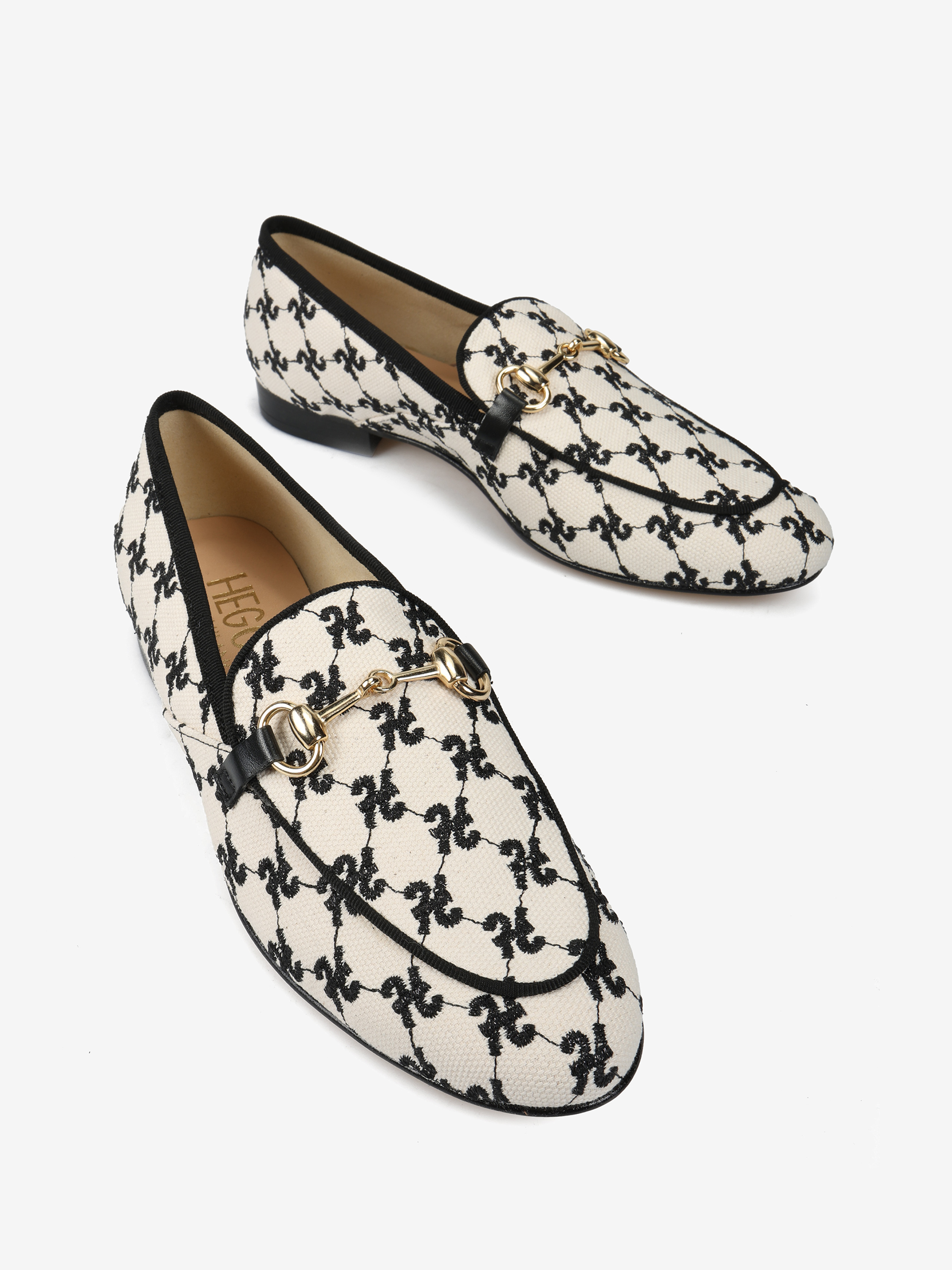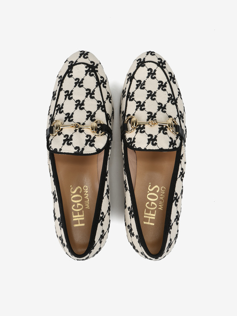 Mokasyny z haftowanym monogramem i metalowym wędzidłem.