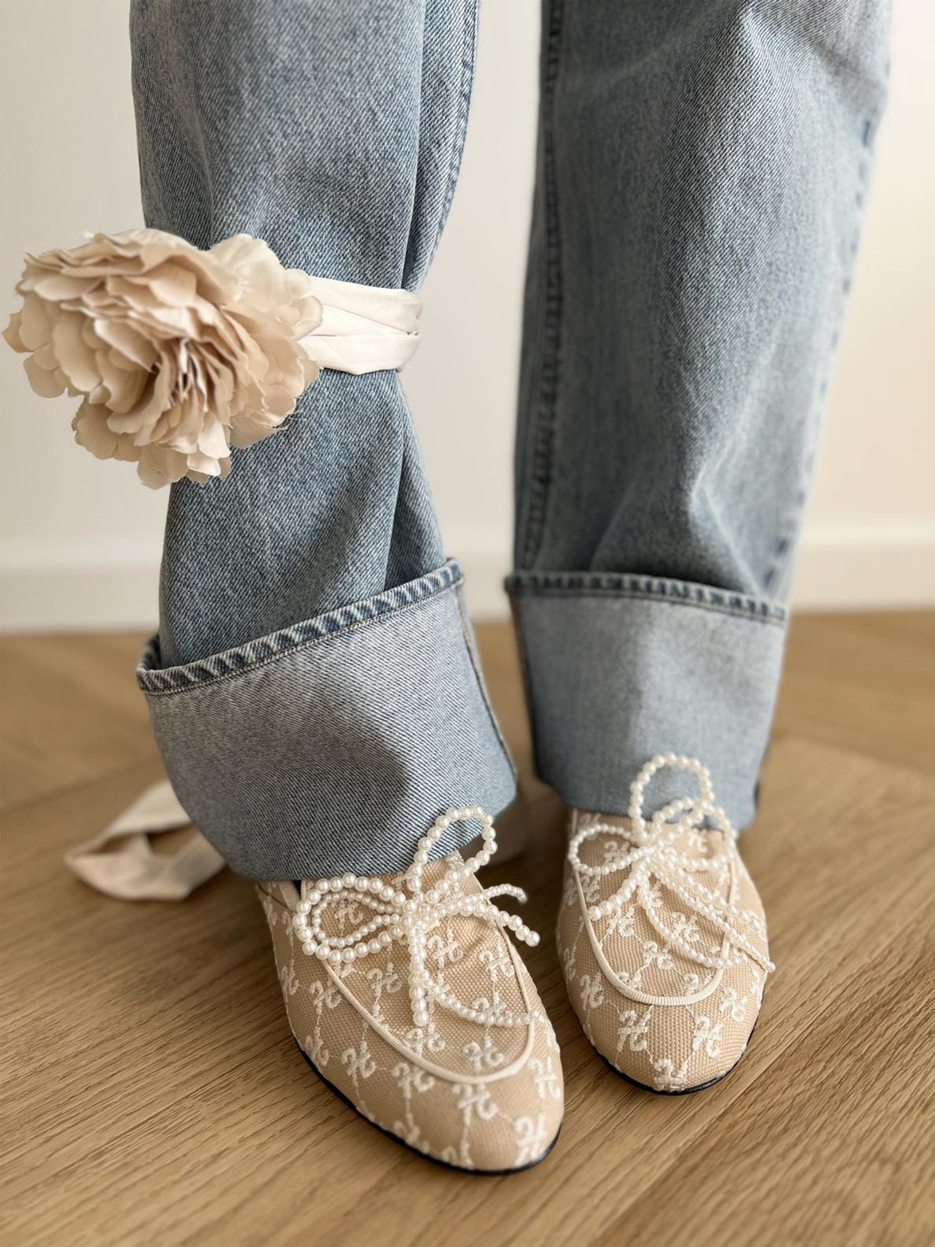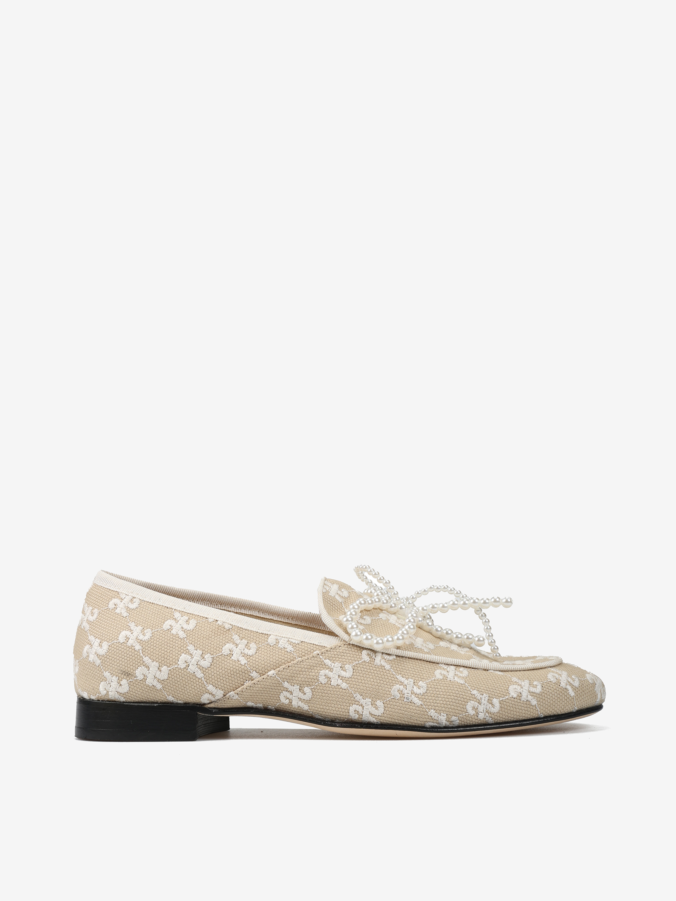Mokasyny z haftowanym monogramem i kokardką z pereł.