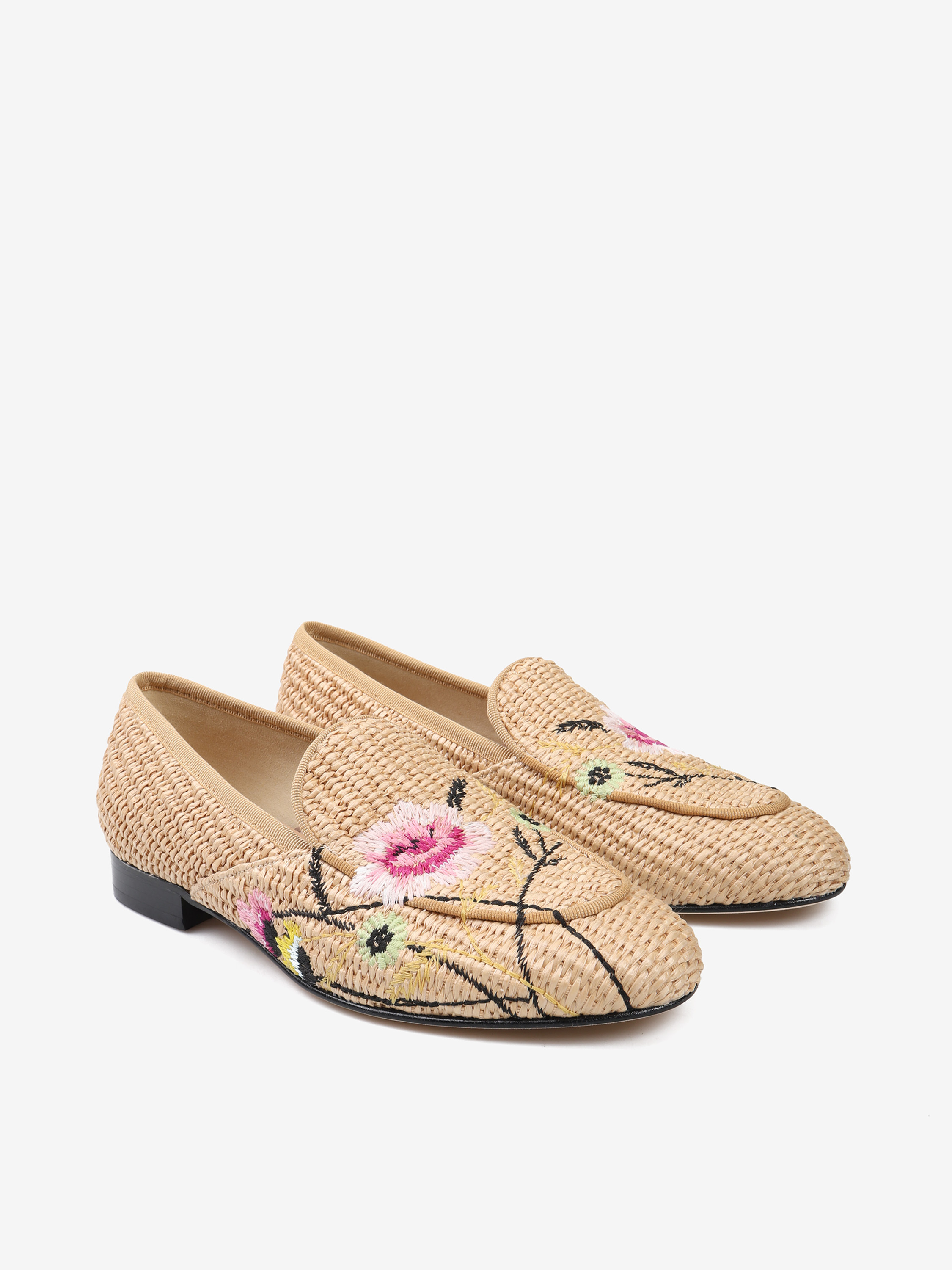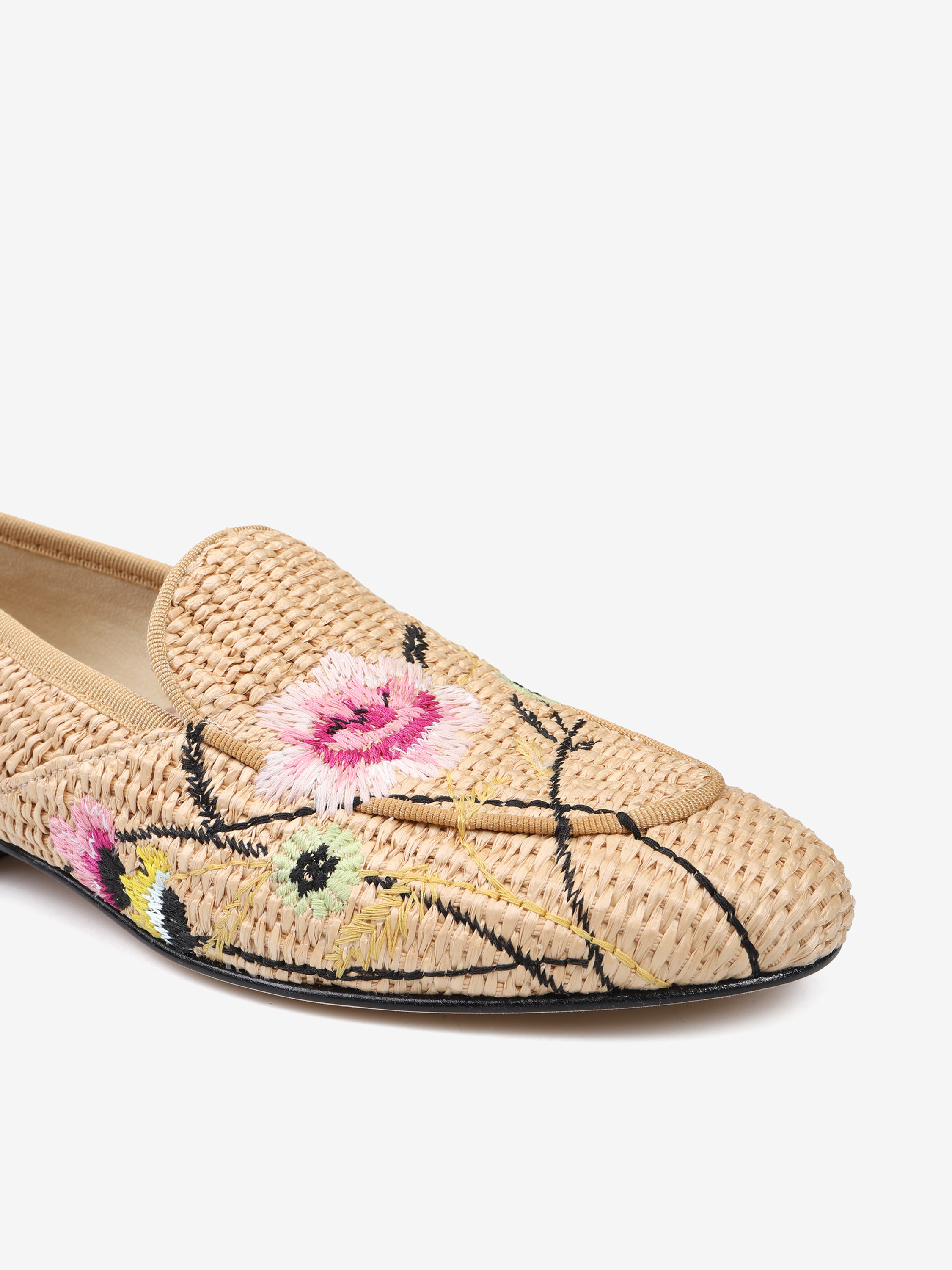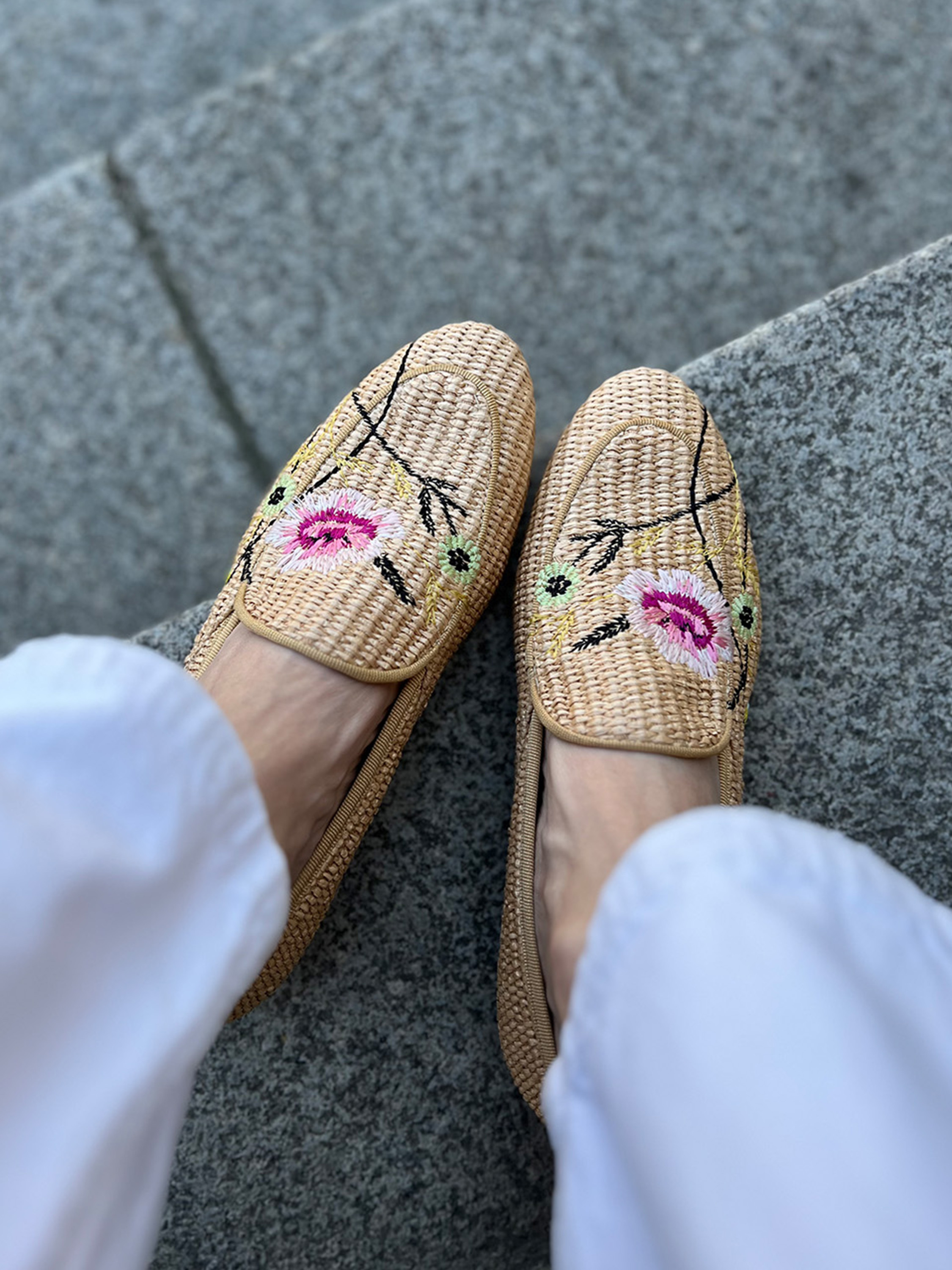 Mokasyny wykonane z rafii z ozdobnymi, haftowanymi kwiatami.