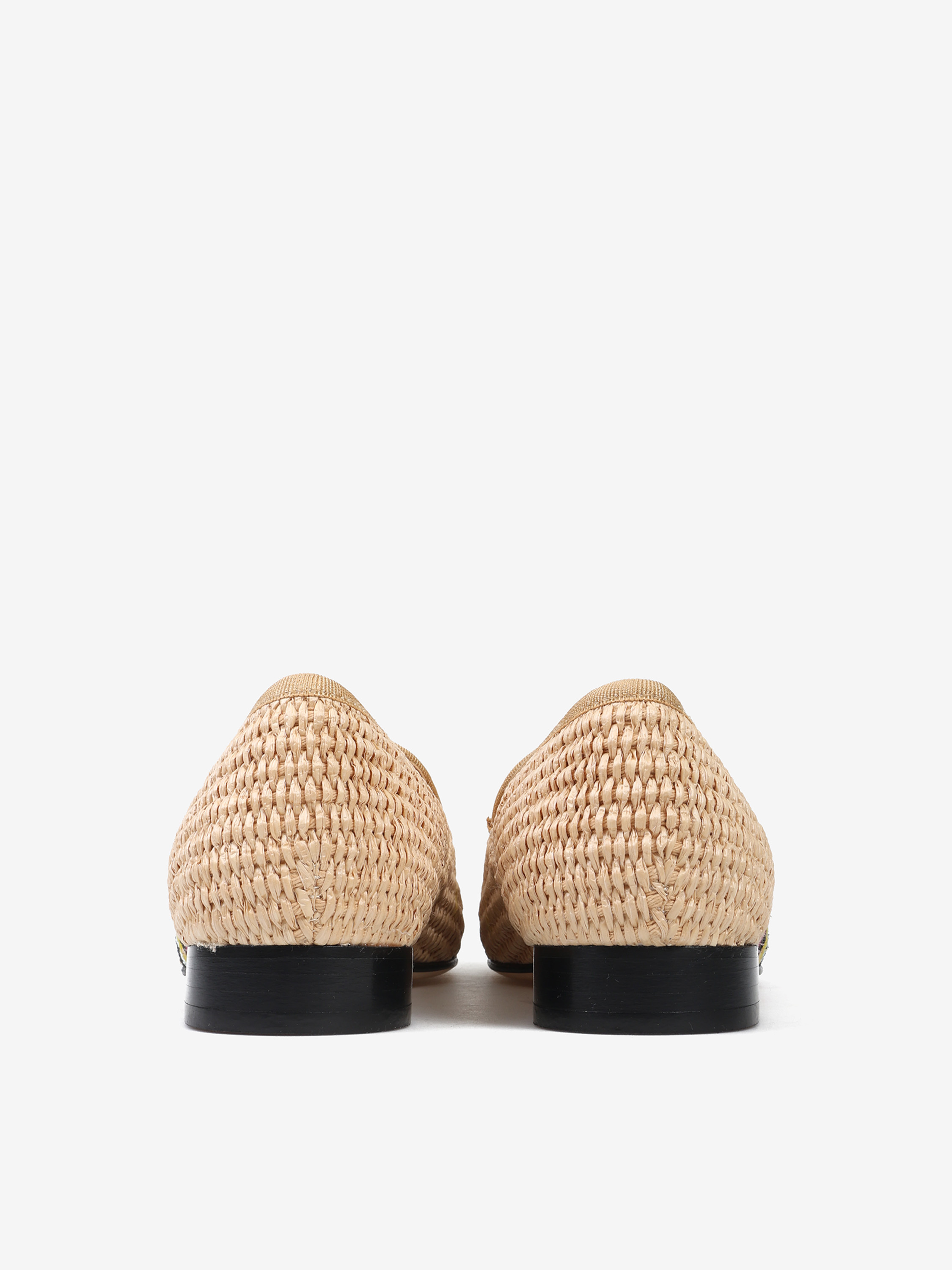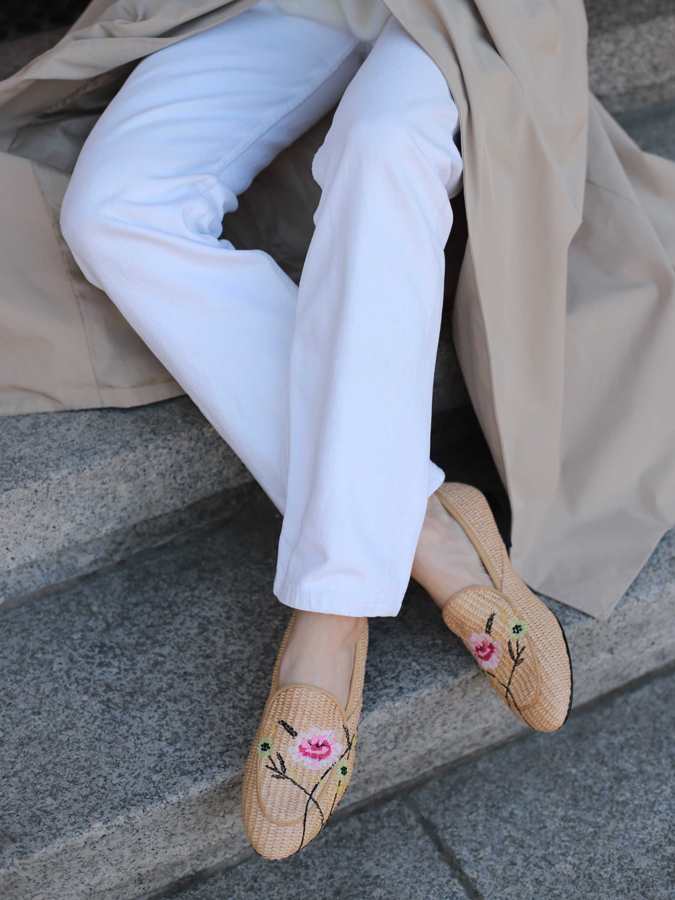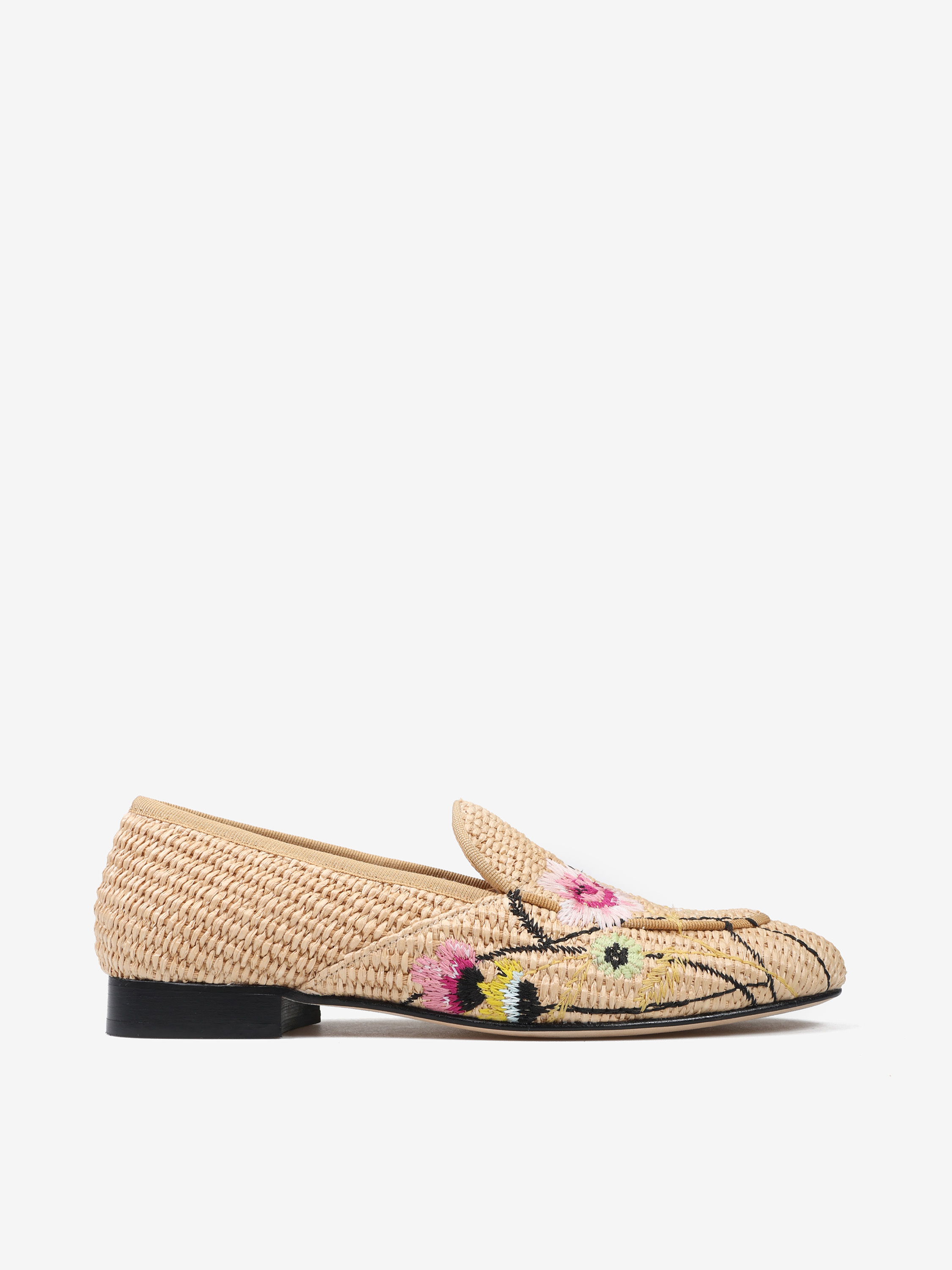 Mokasyny wykonane z rafii z ozdobnymi, haftowanymi kwiatami.