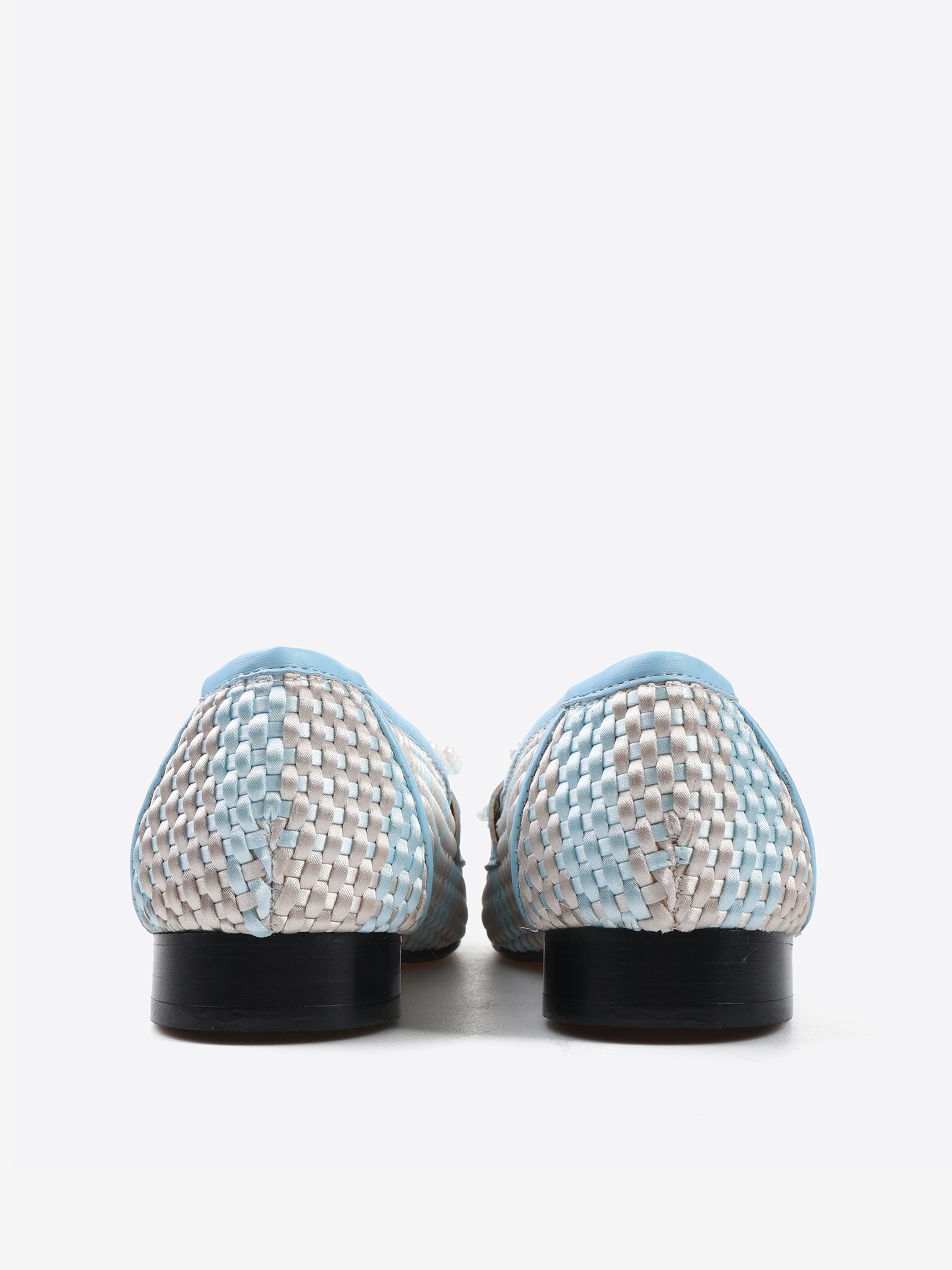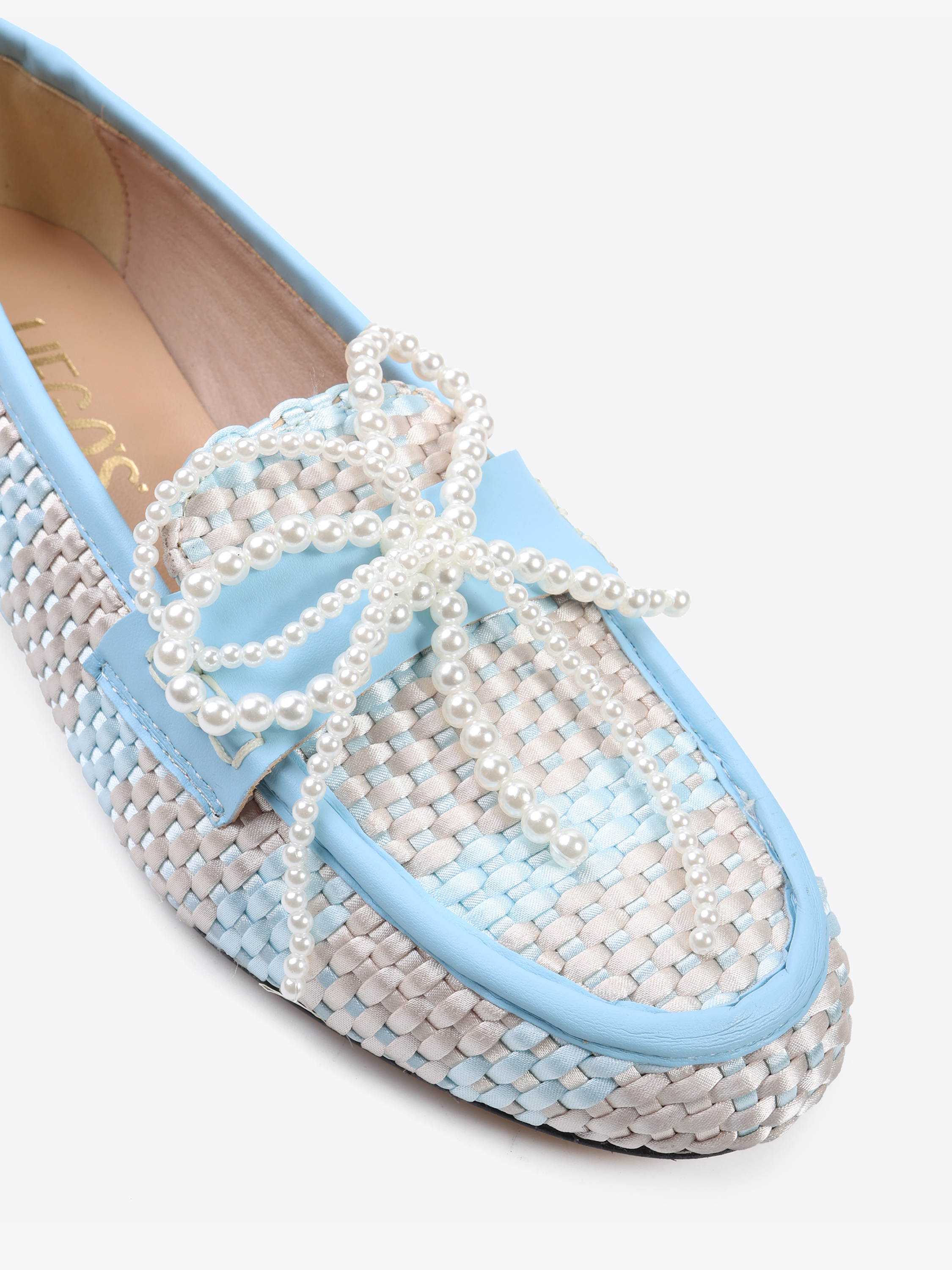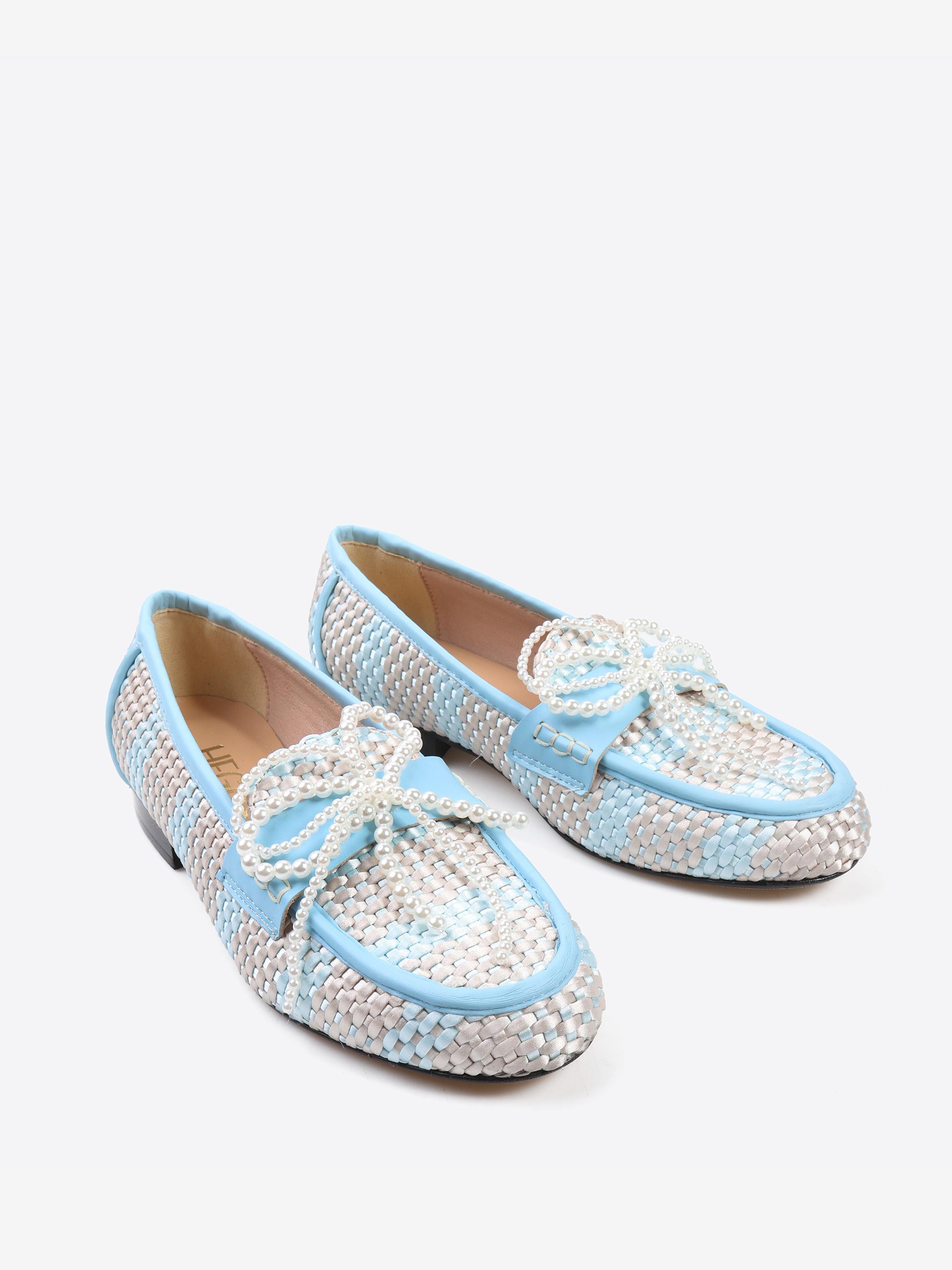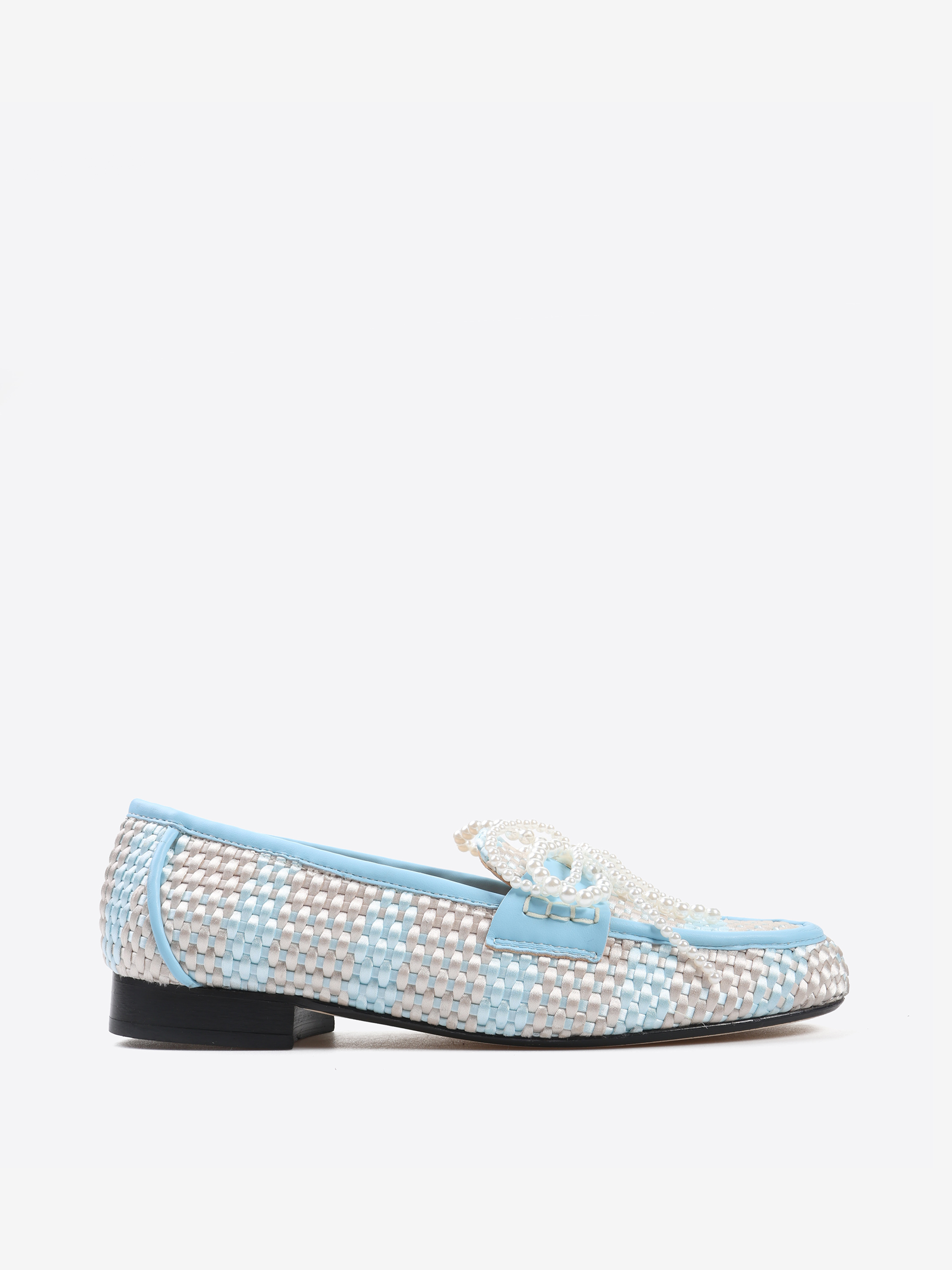 Mokasyny z haftowanym monogramem, skórzanymi przeszyciami i kokardką z pereł.
