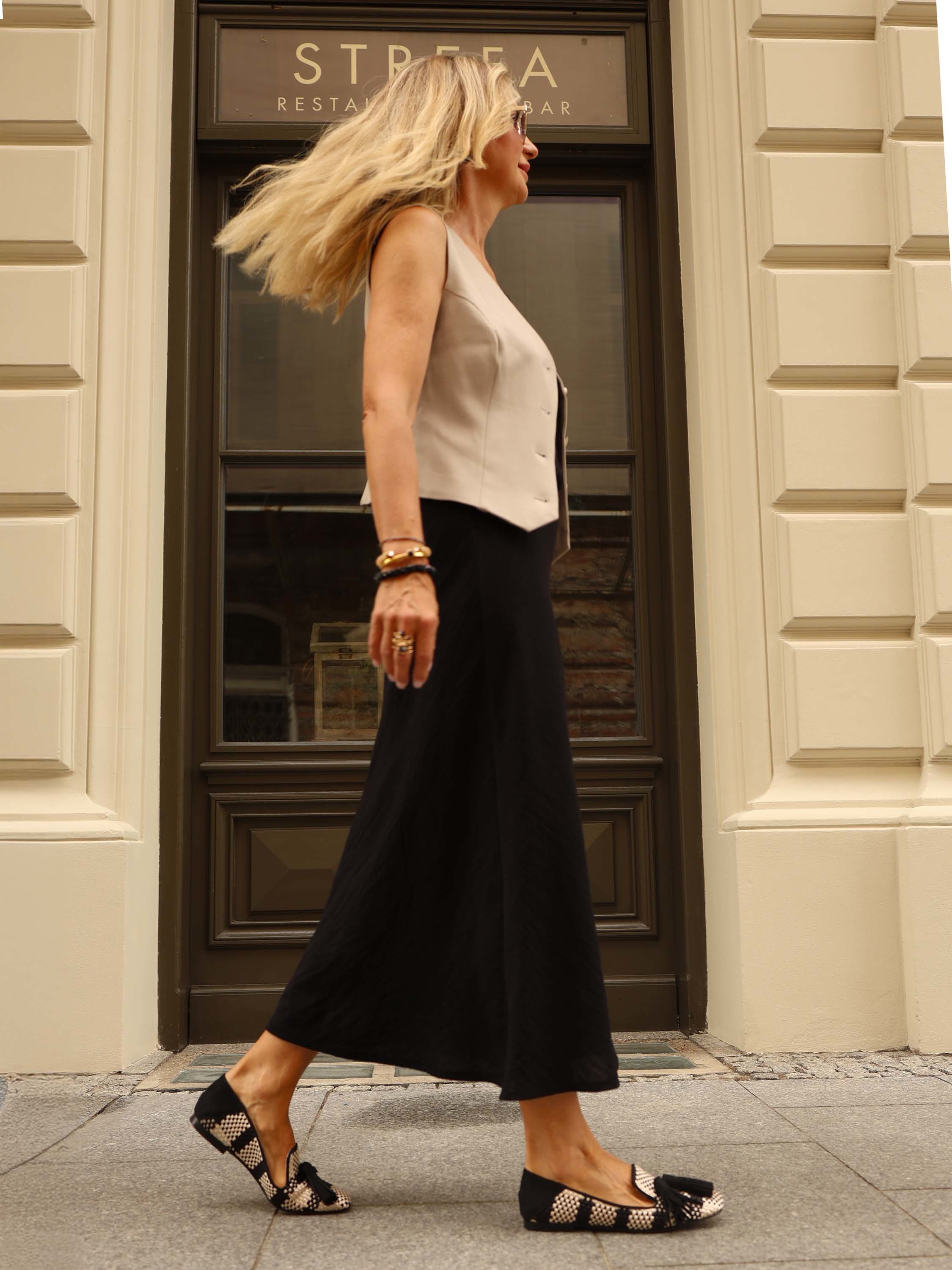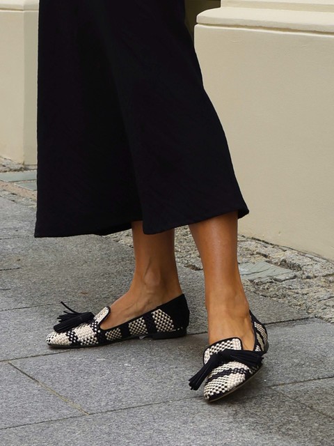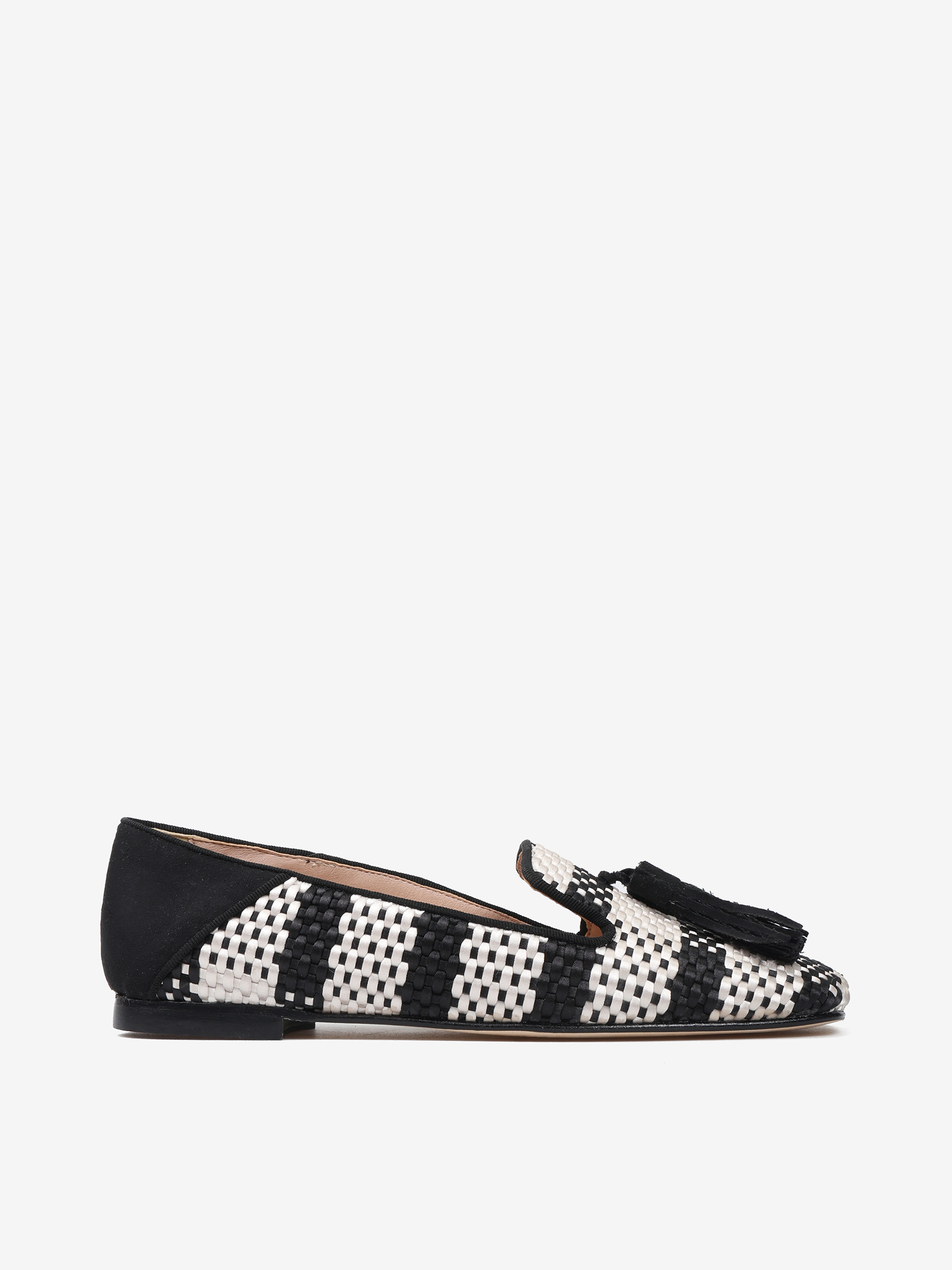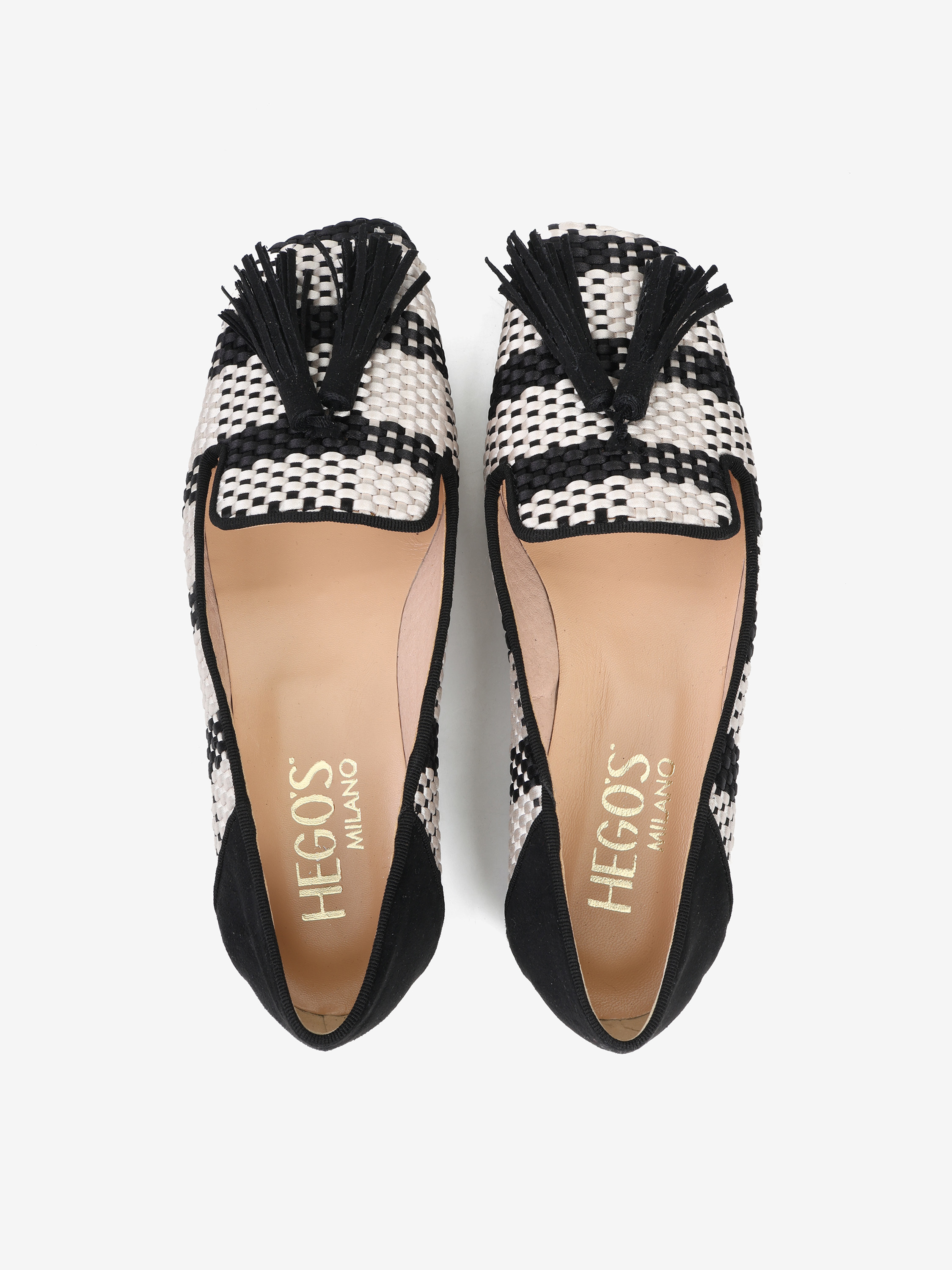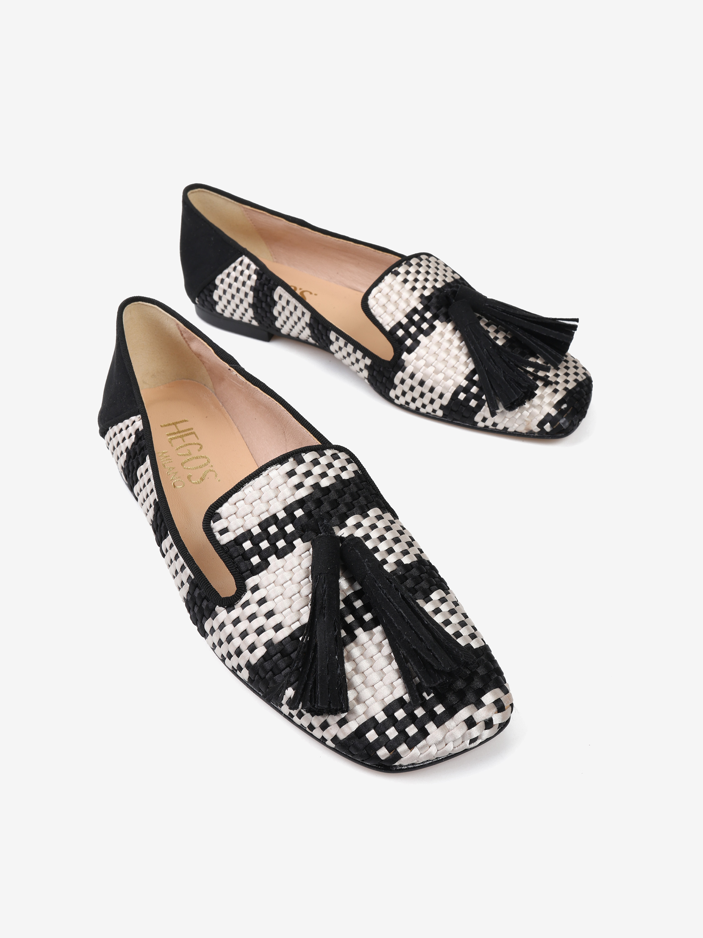 Mokasyny z kwadratowym noskiem. Pleciony materiał i ozdobne frędzle.