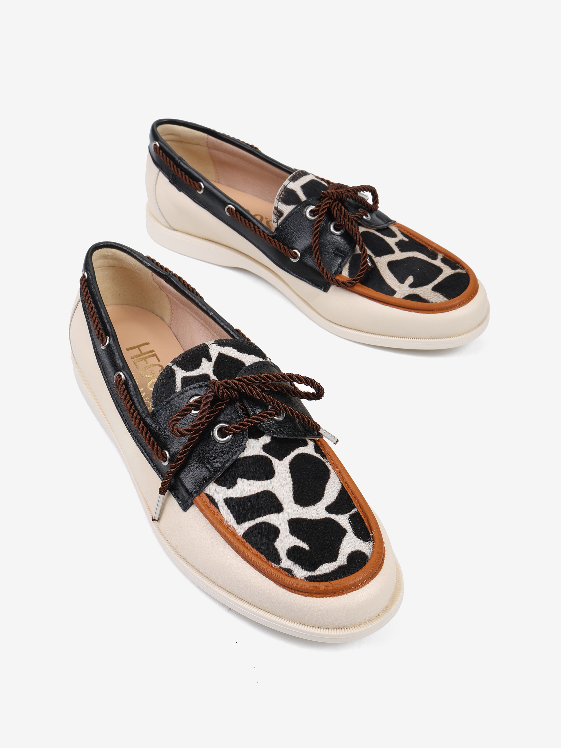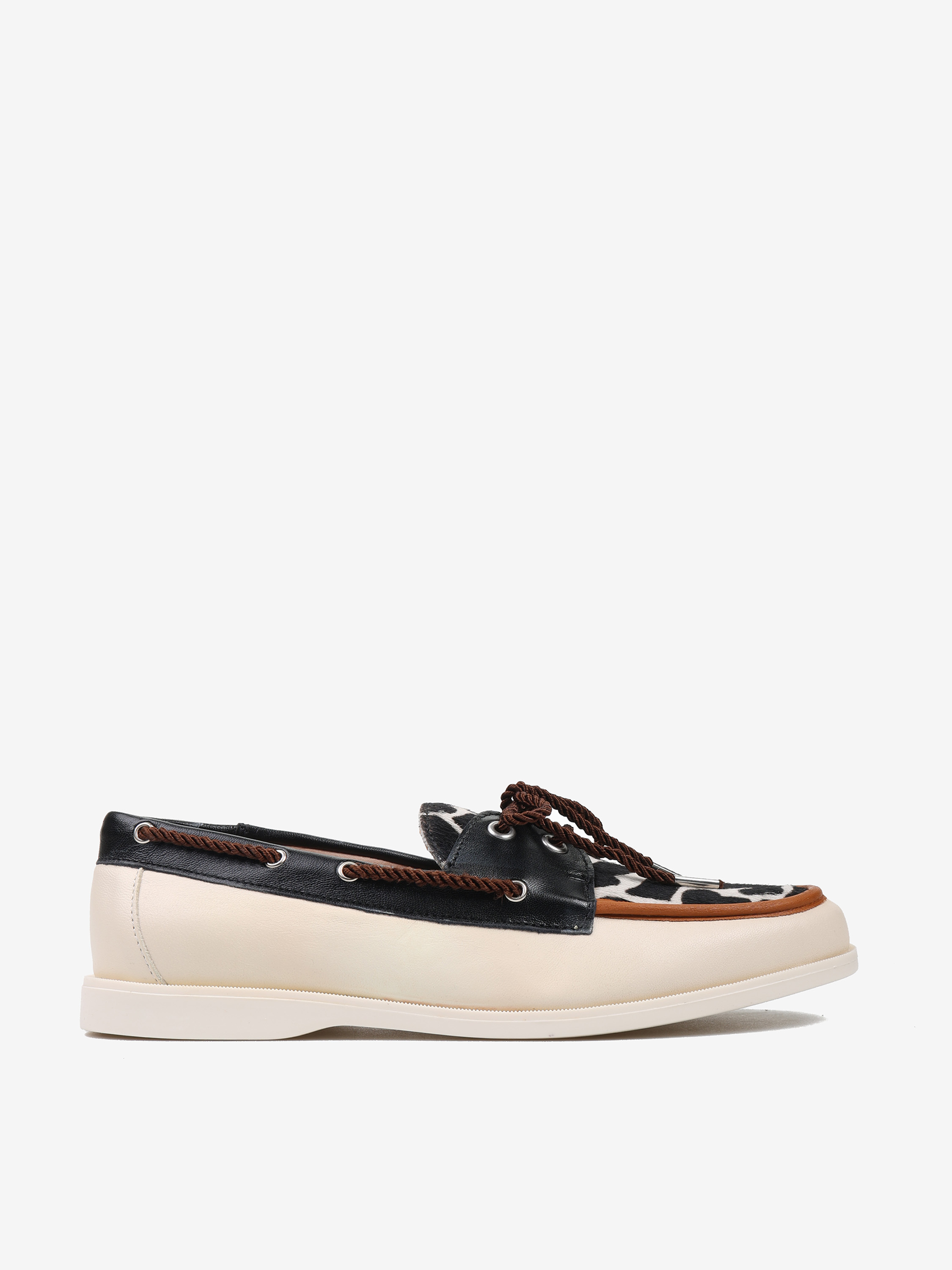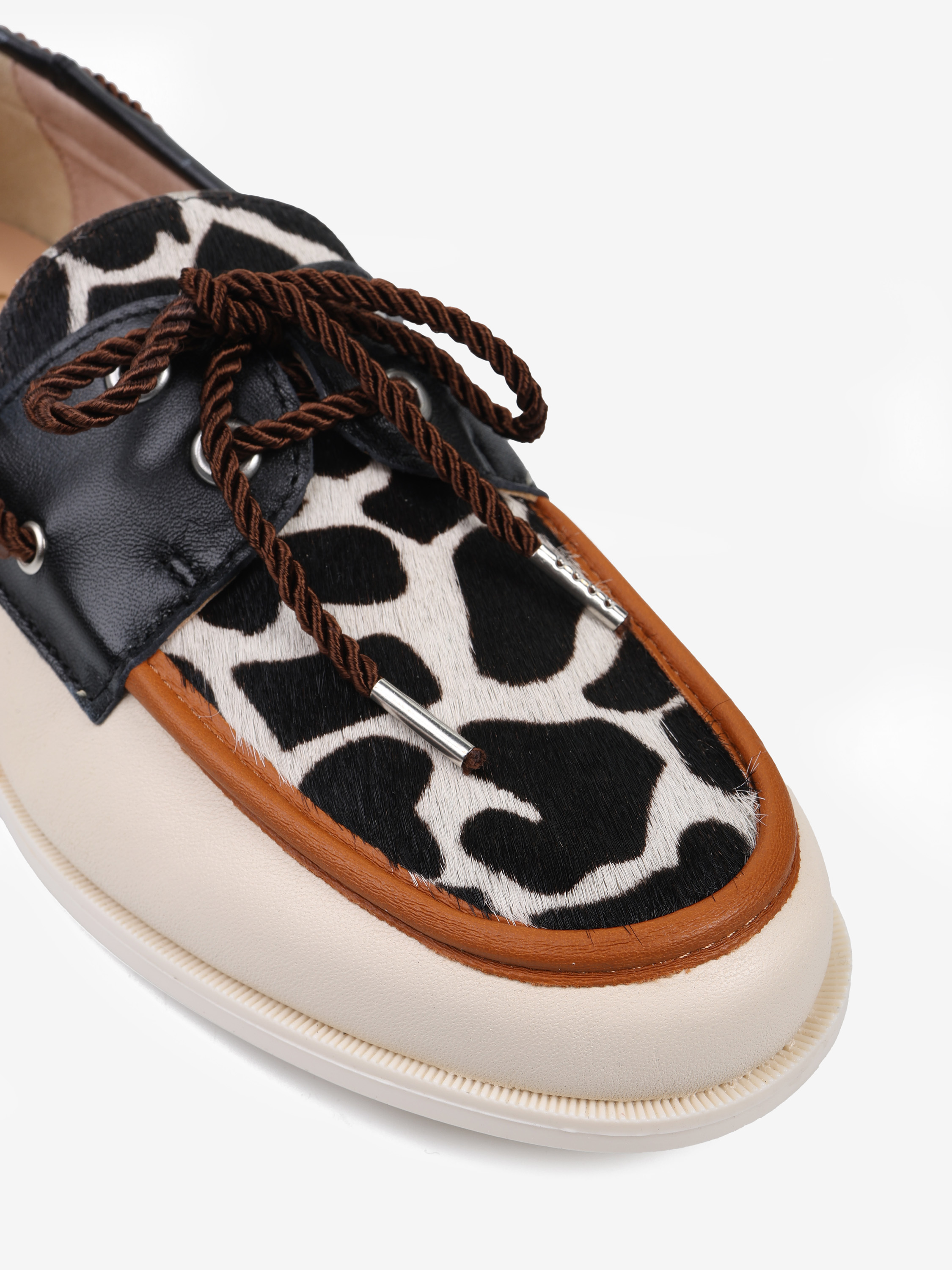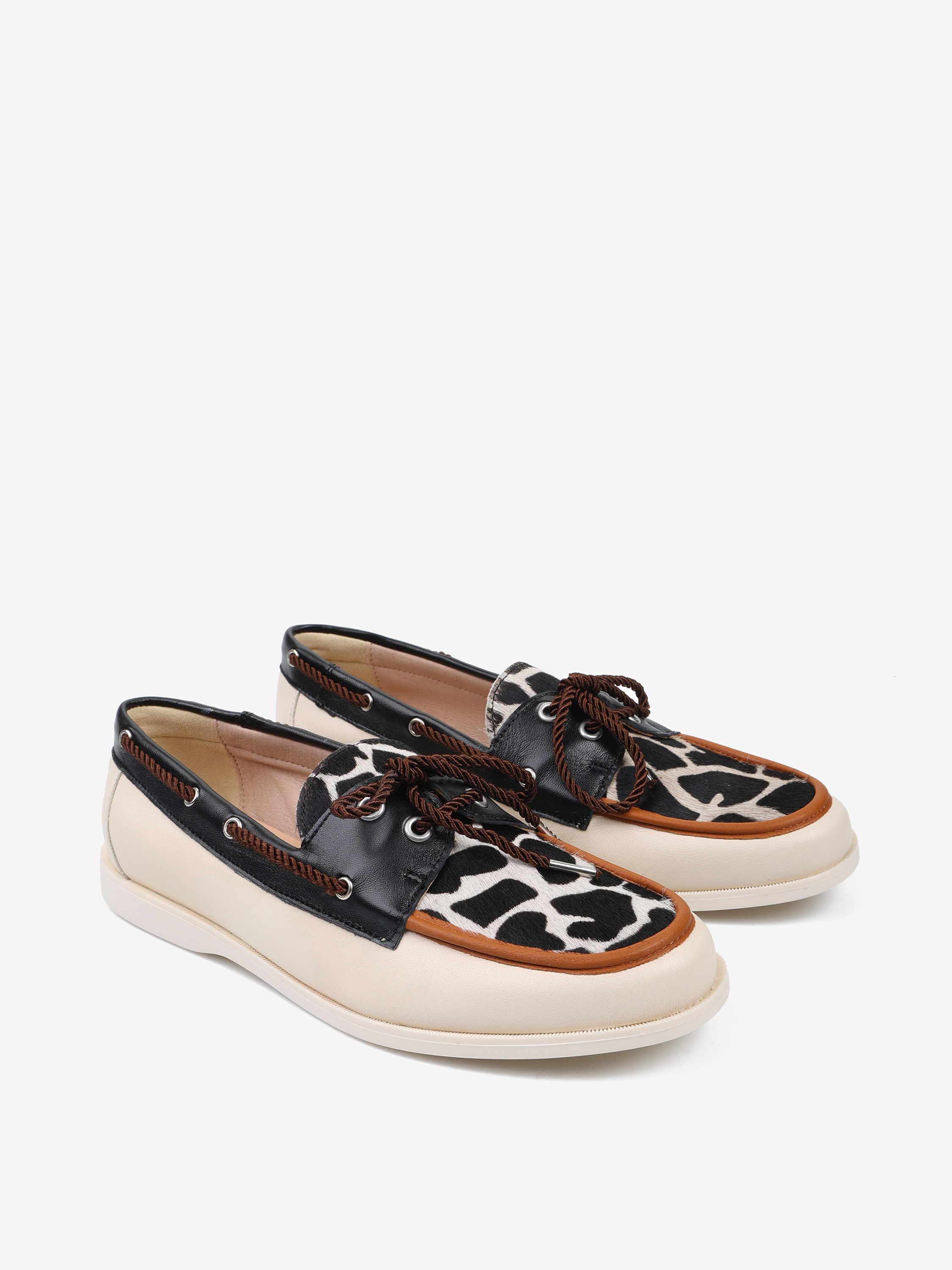 Mokasyny w stylu marynarskim ze wstawką w zwierzęcy wzór. Wiązanie pozwala na idealne dopasowanie buta.