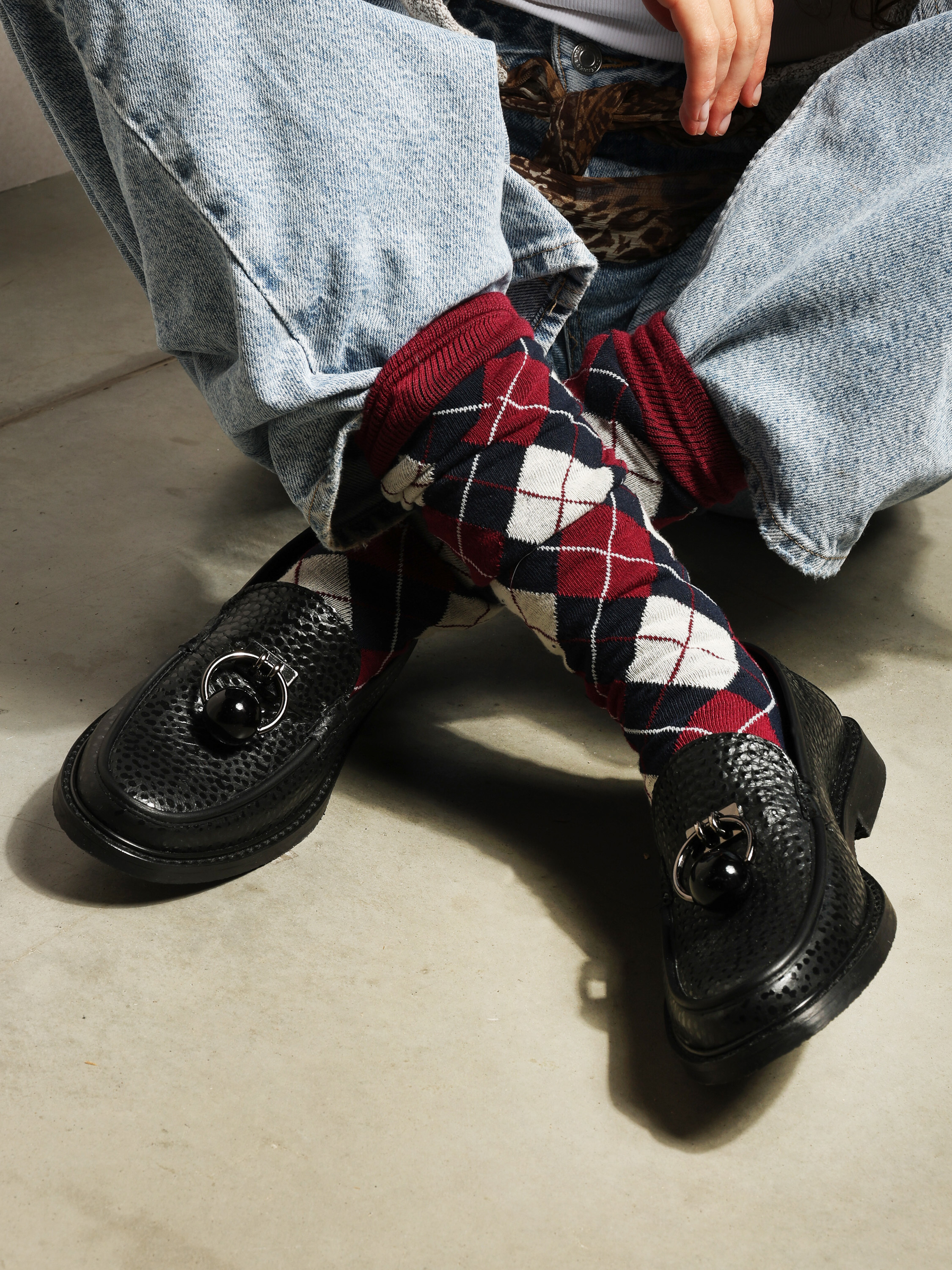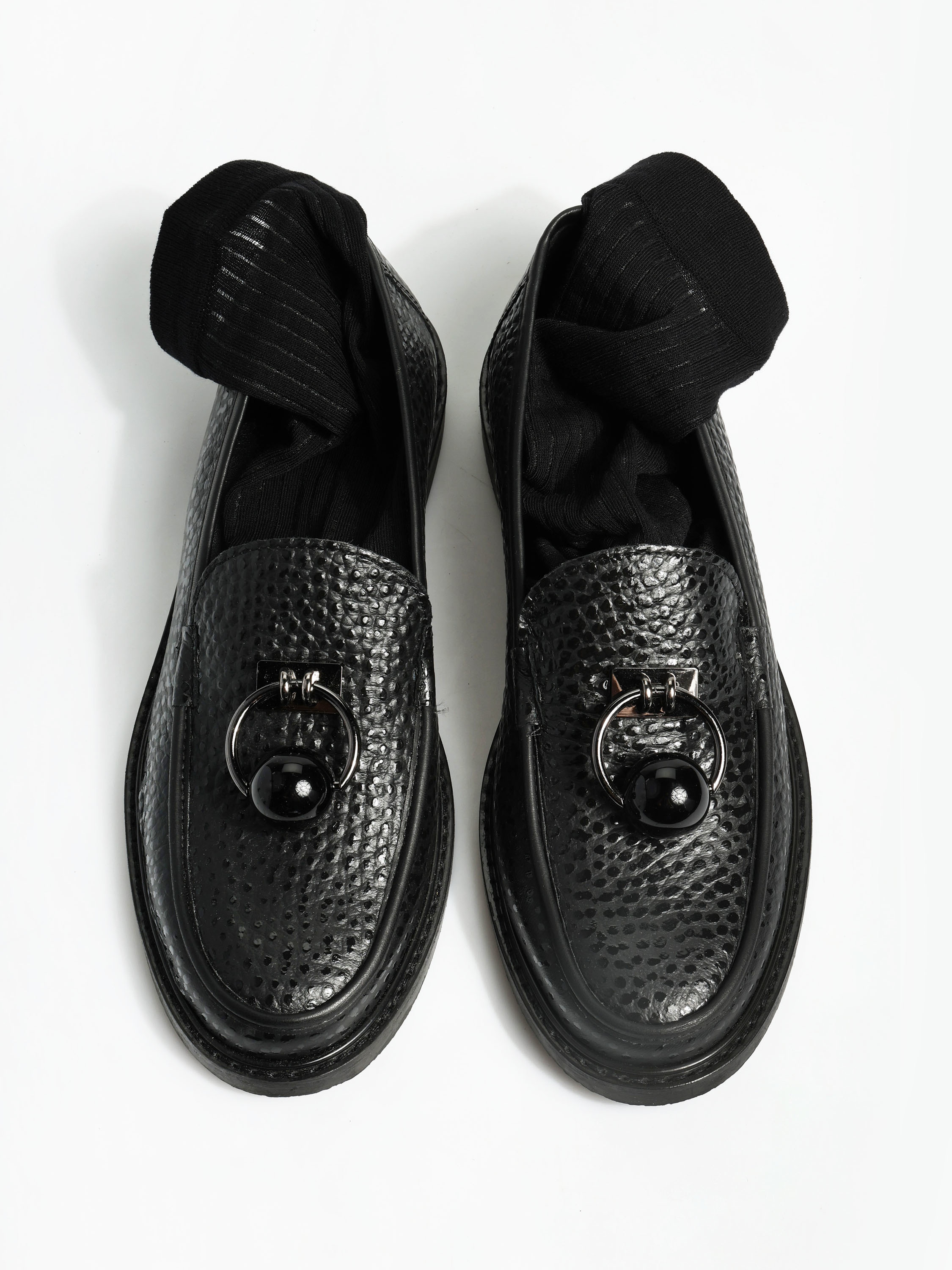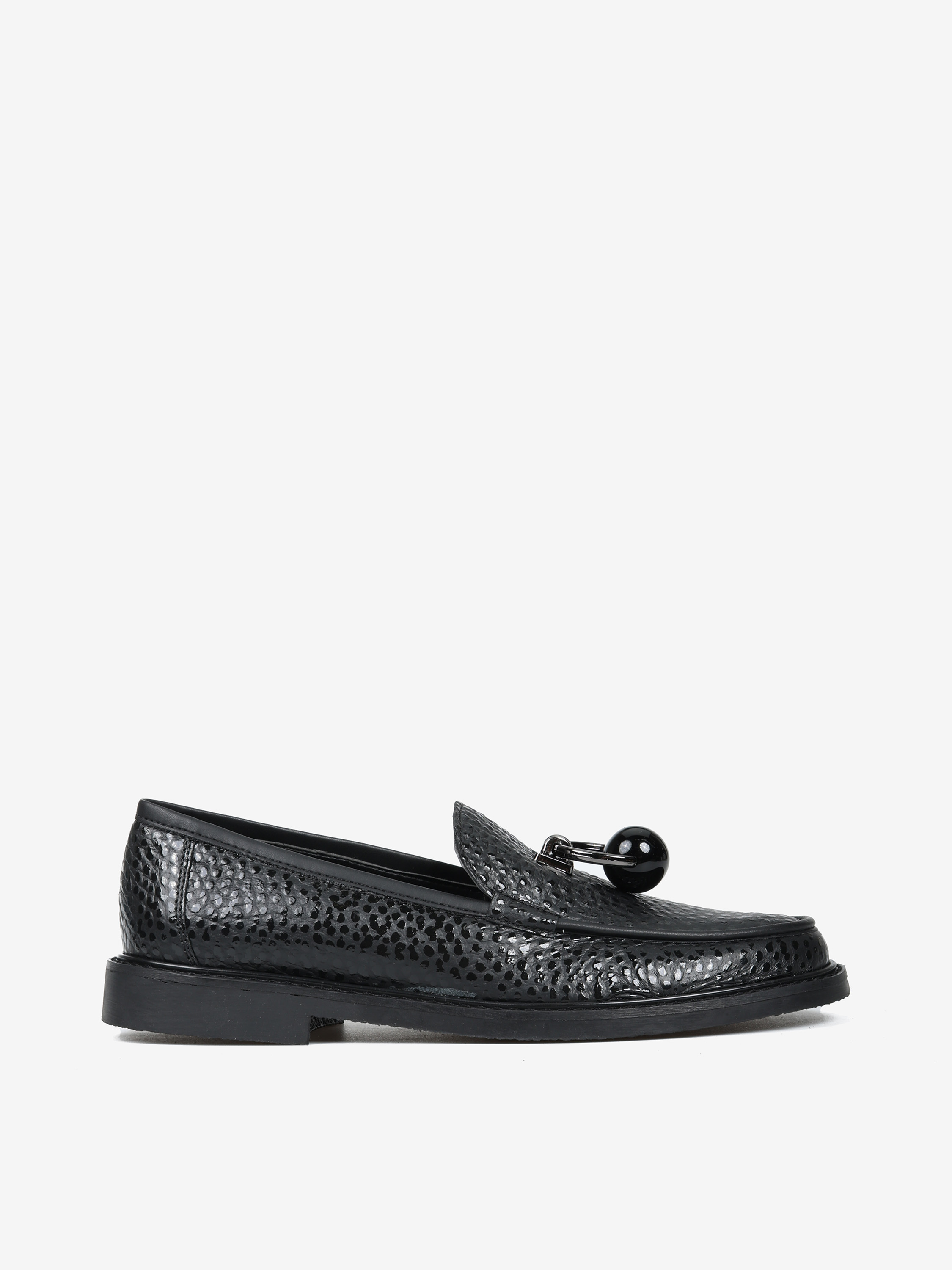 Czarne mokasyny wykonane z mięsistej skóry. Biżuteryjna aplikacja z czarną perłą.