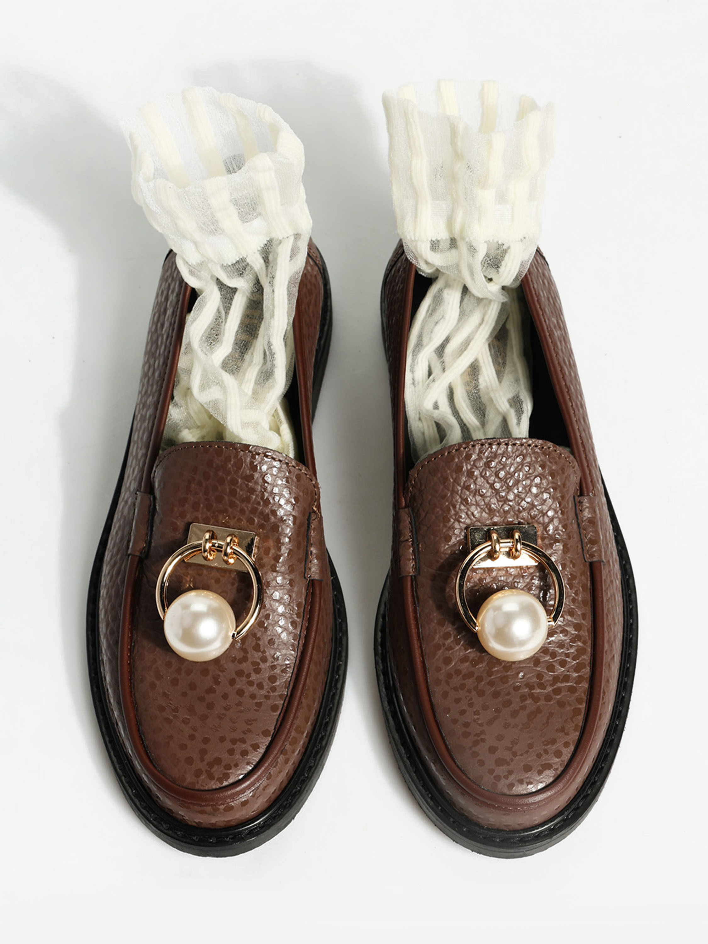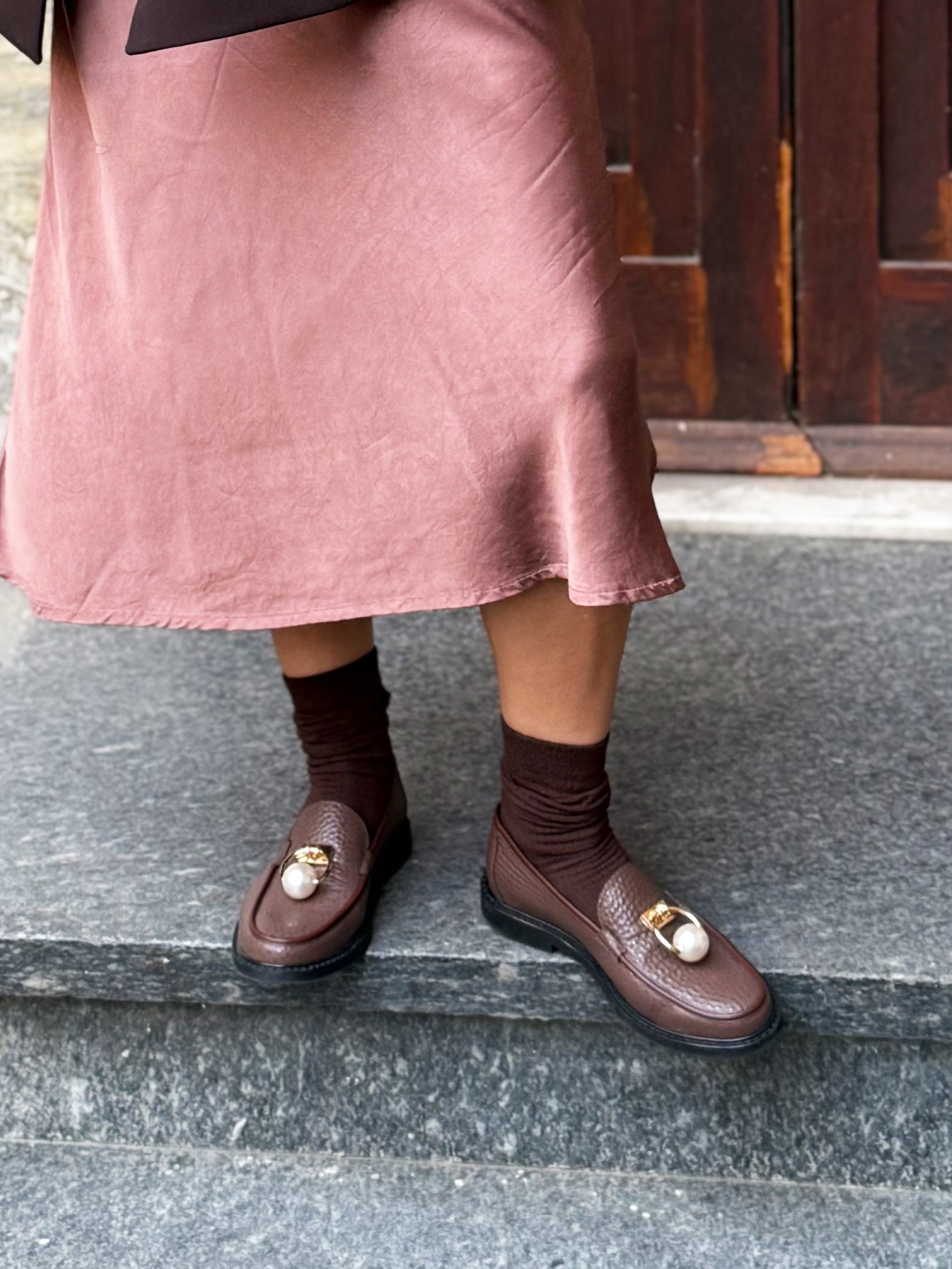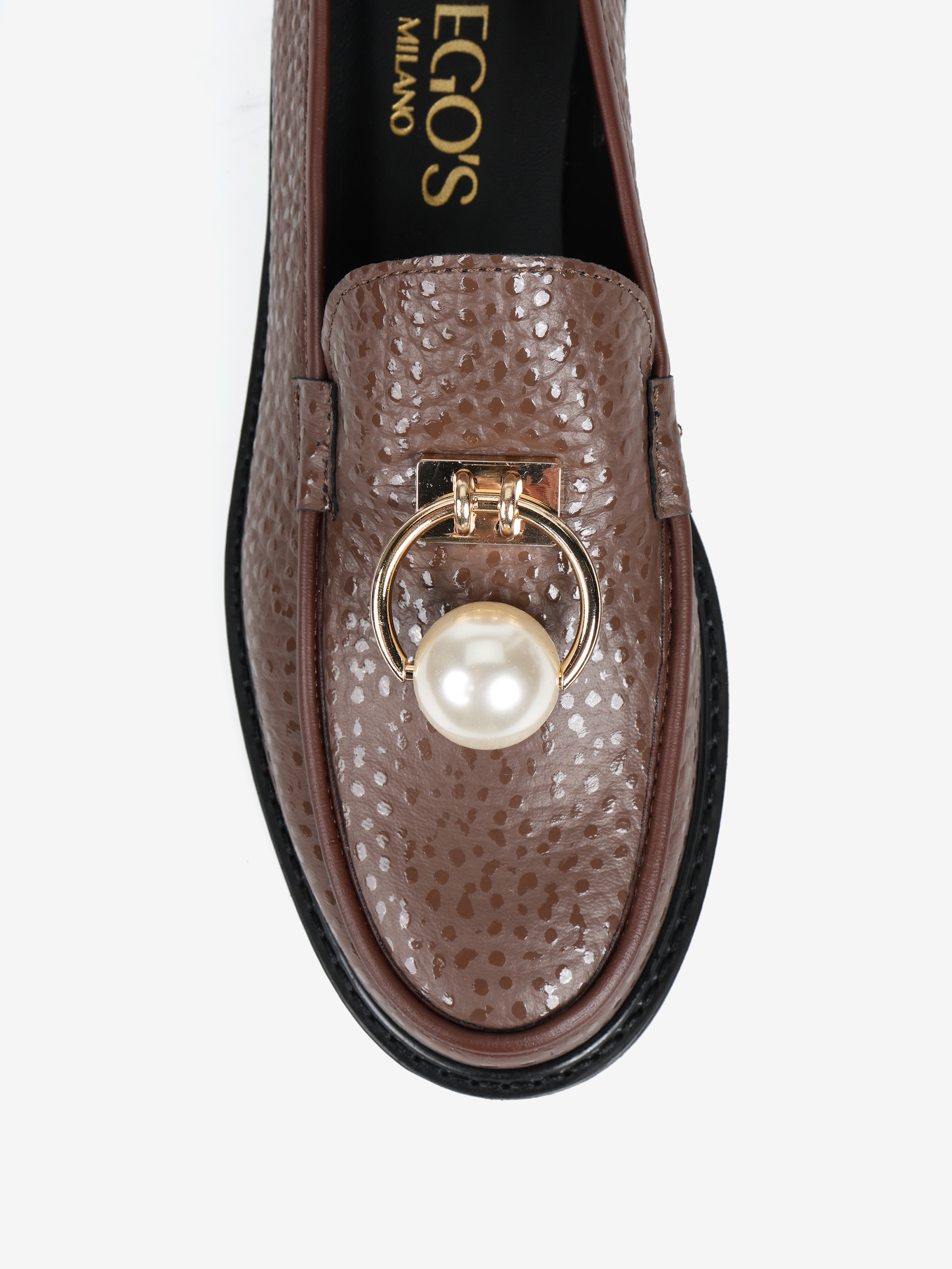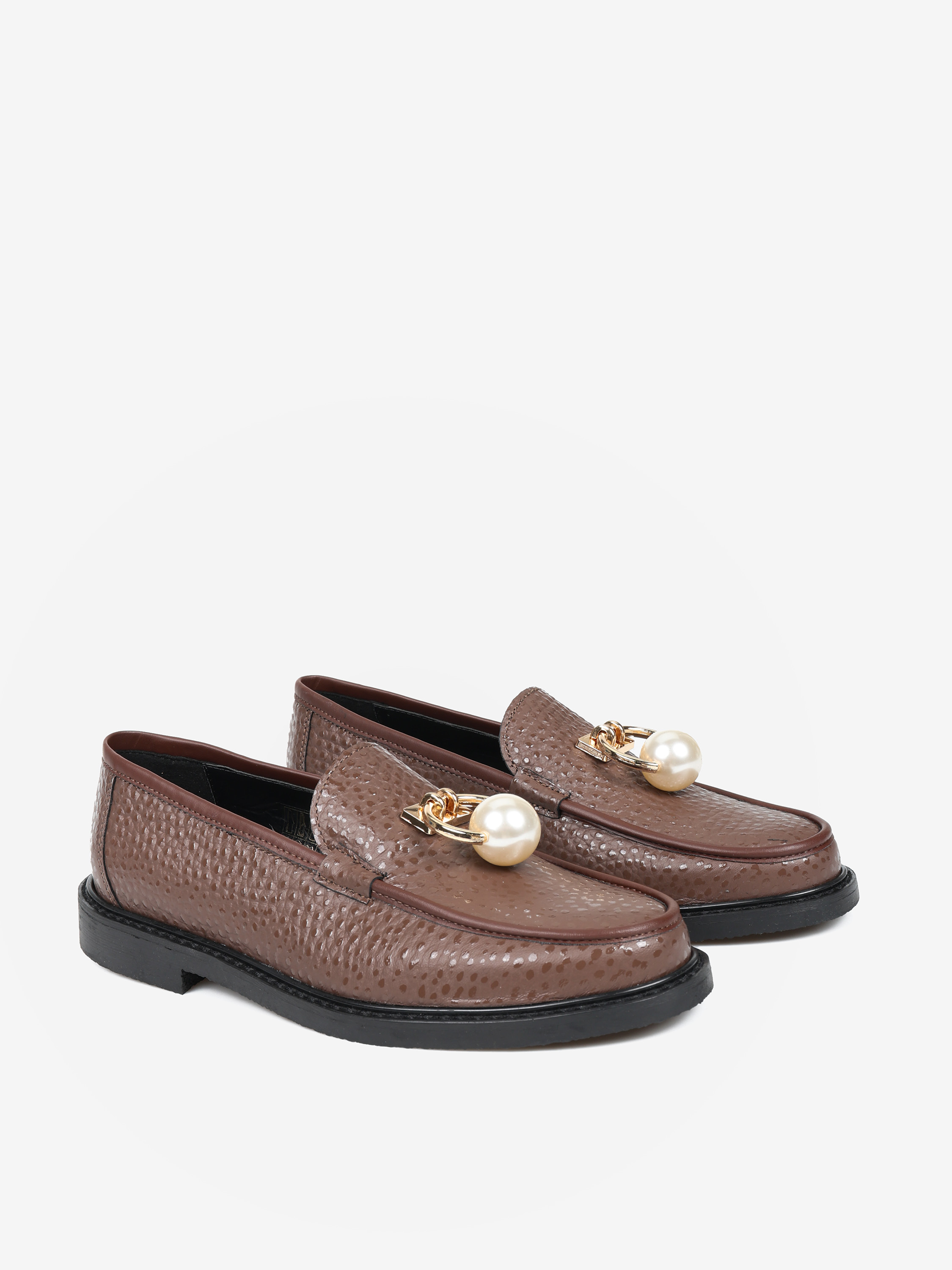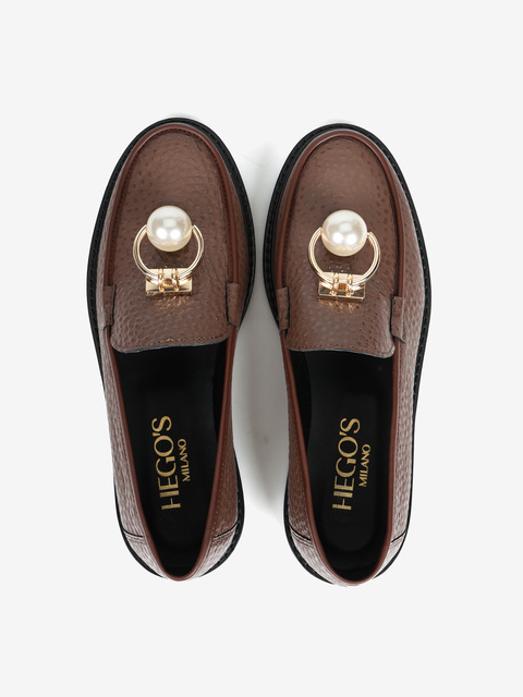 Brązowe mokasyny wykonane z mięsistej skóry. Biżuteryjna aplikacja z perłą.