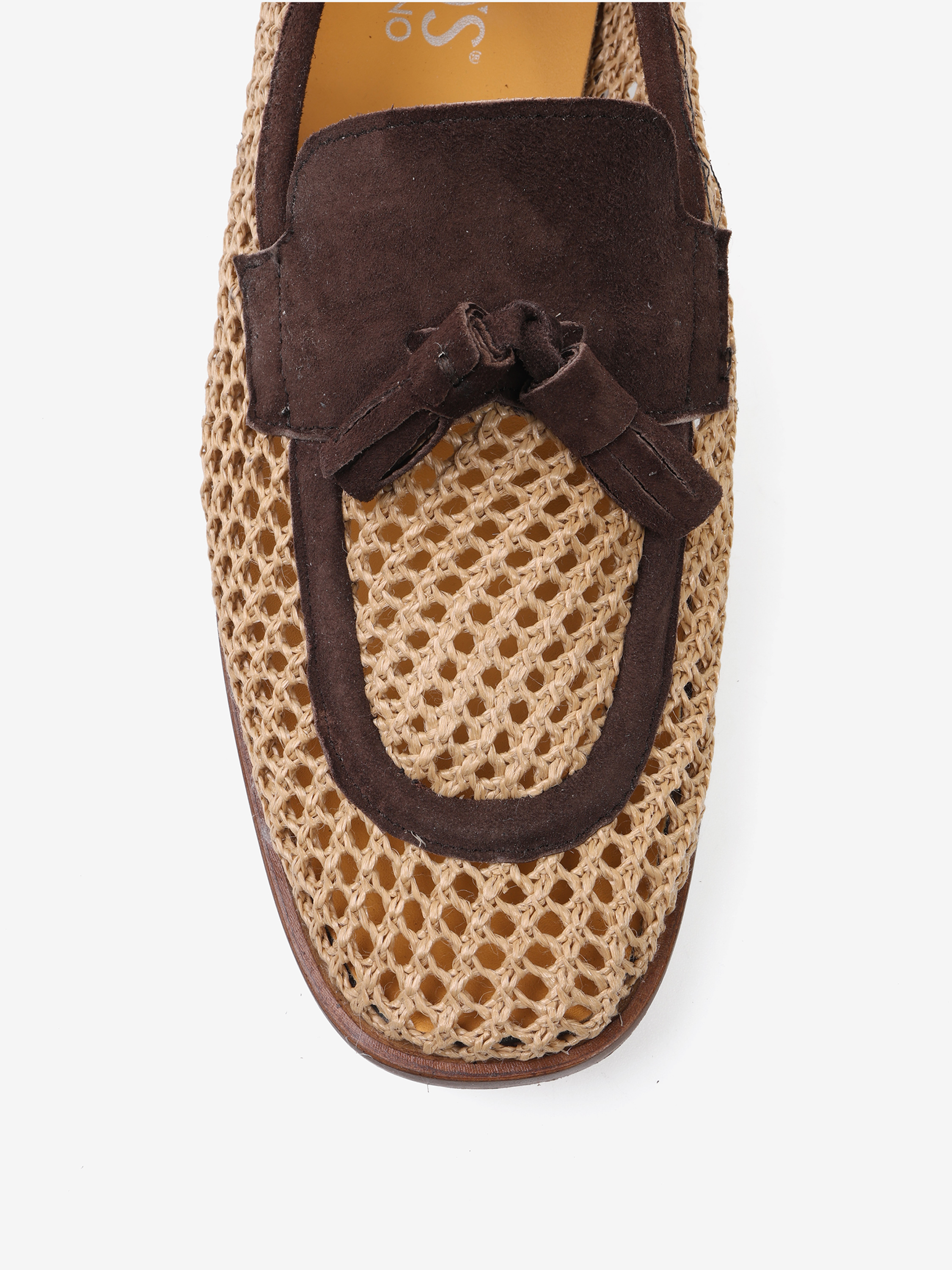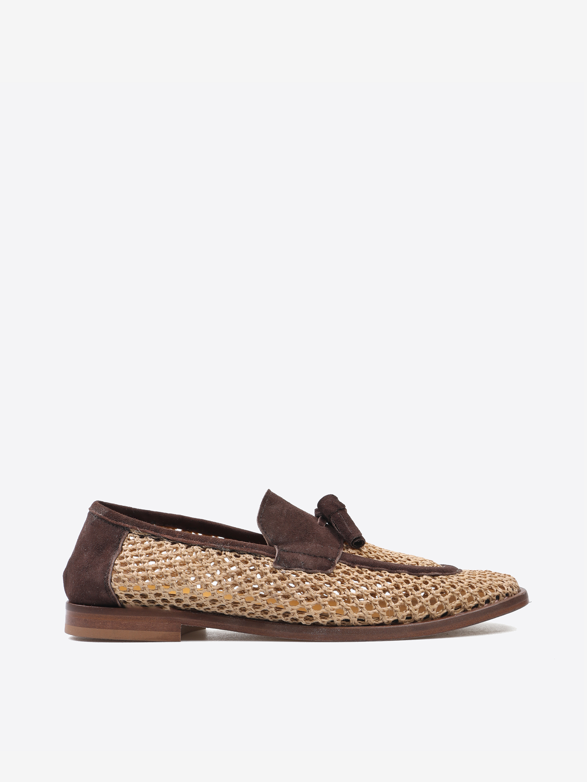 Mokasyny z ażurowej plecionki. Zamszowa pięta, lamówka, język i ozdobne frędzle.