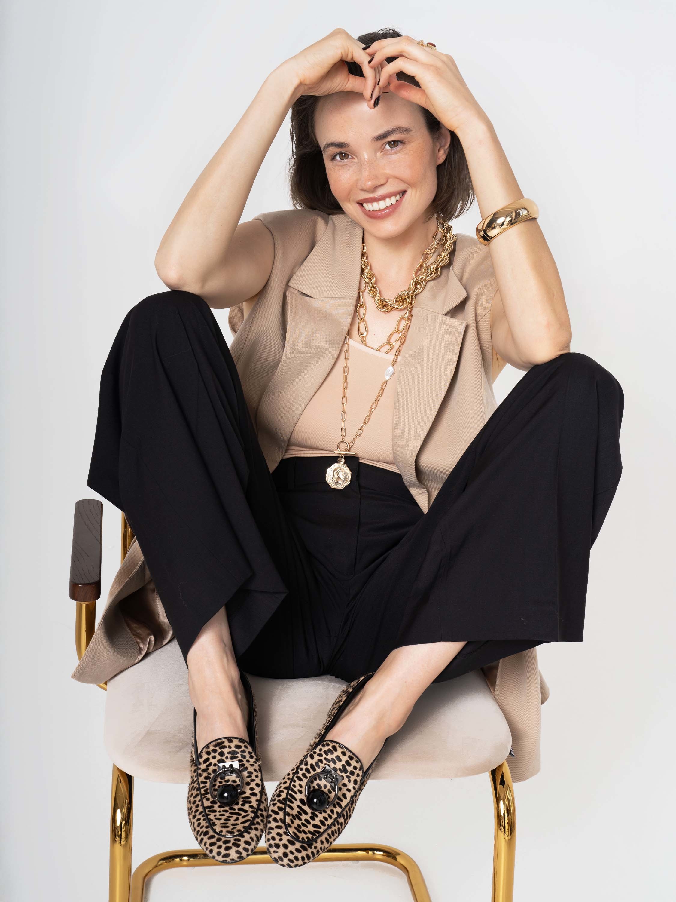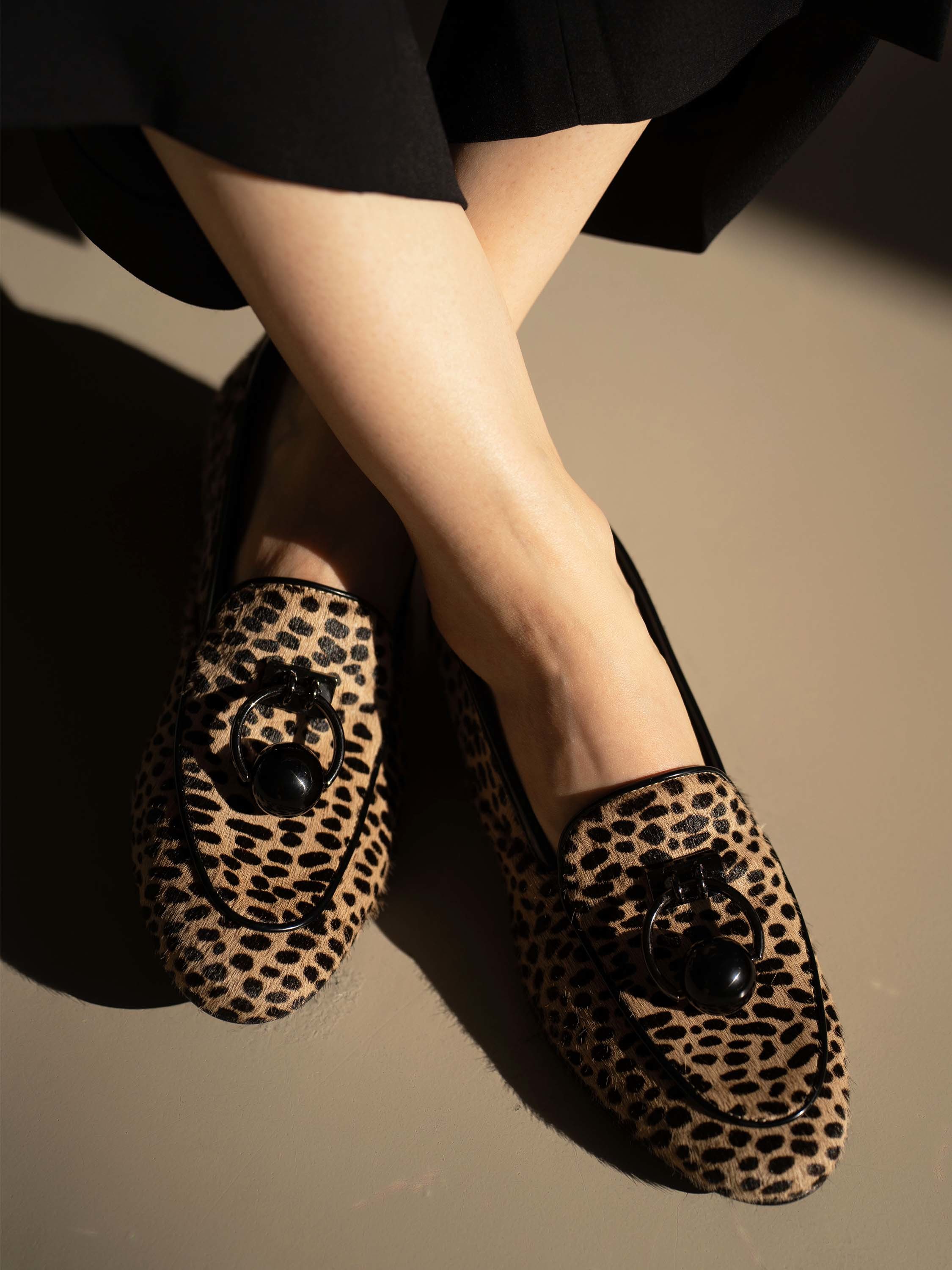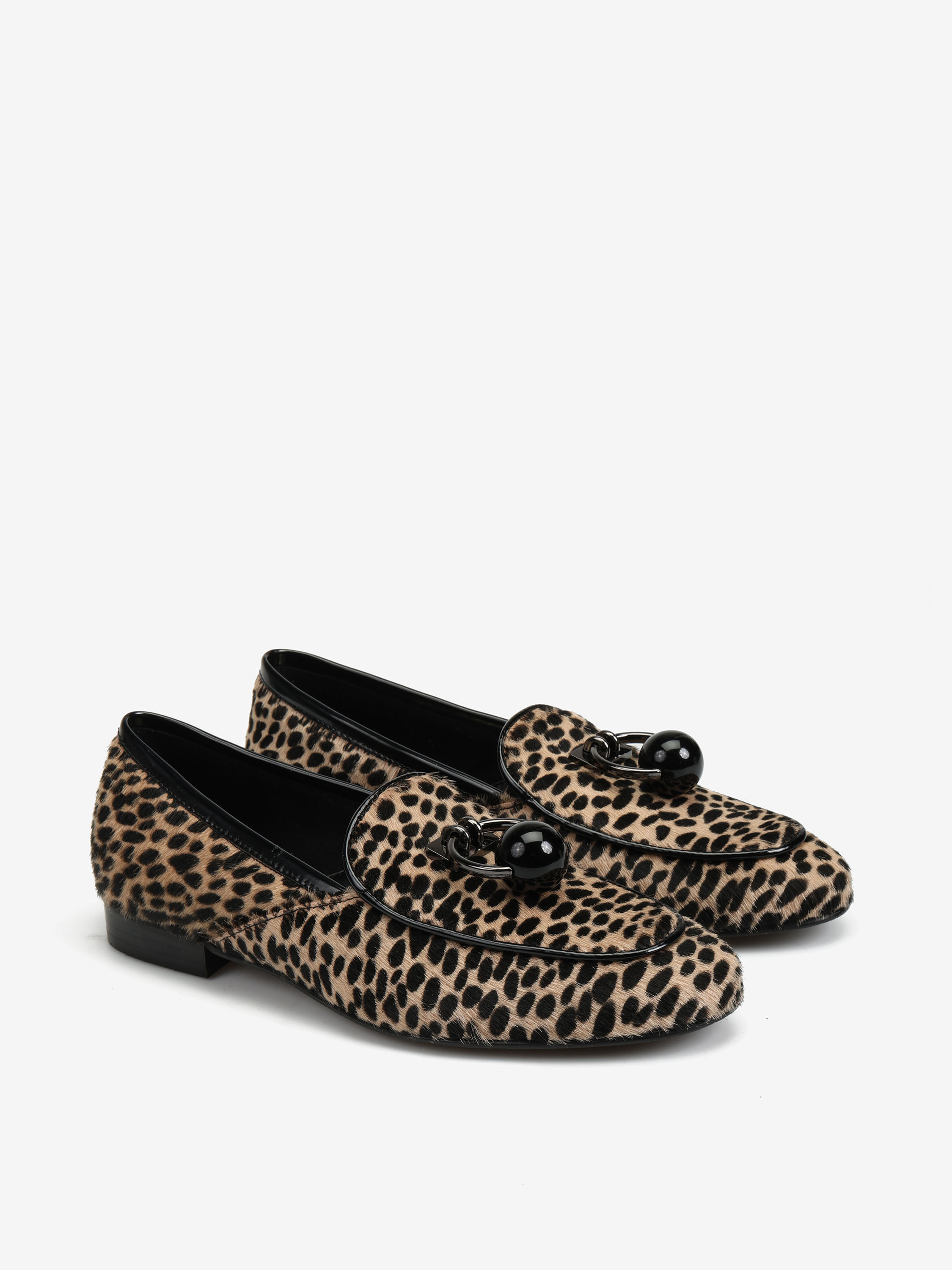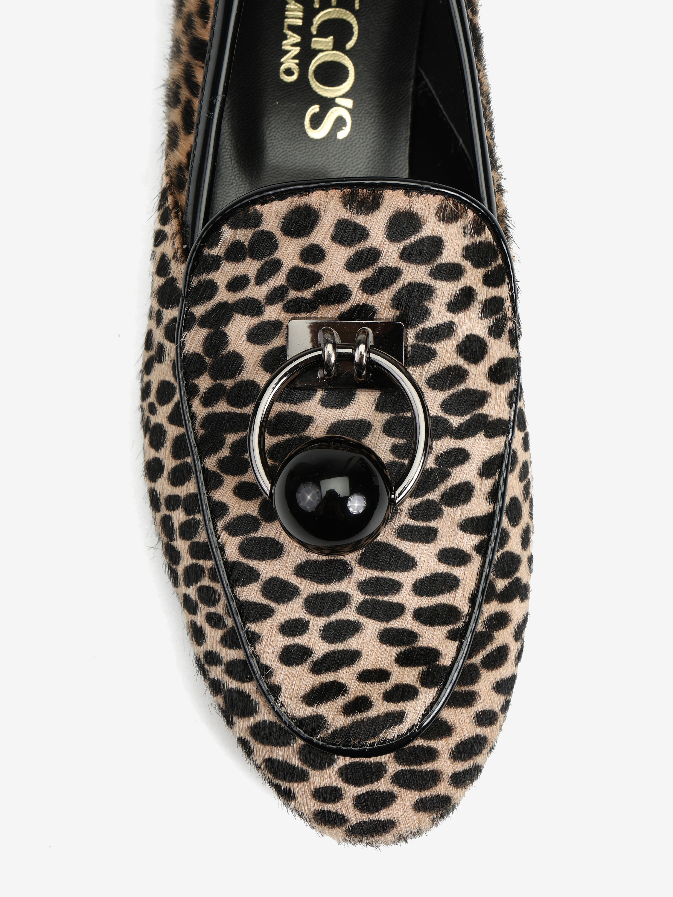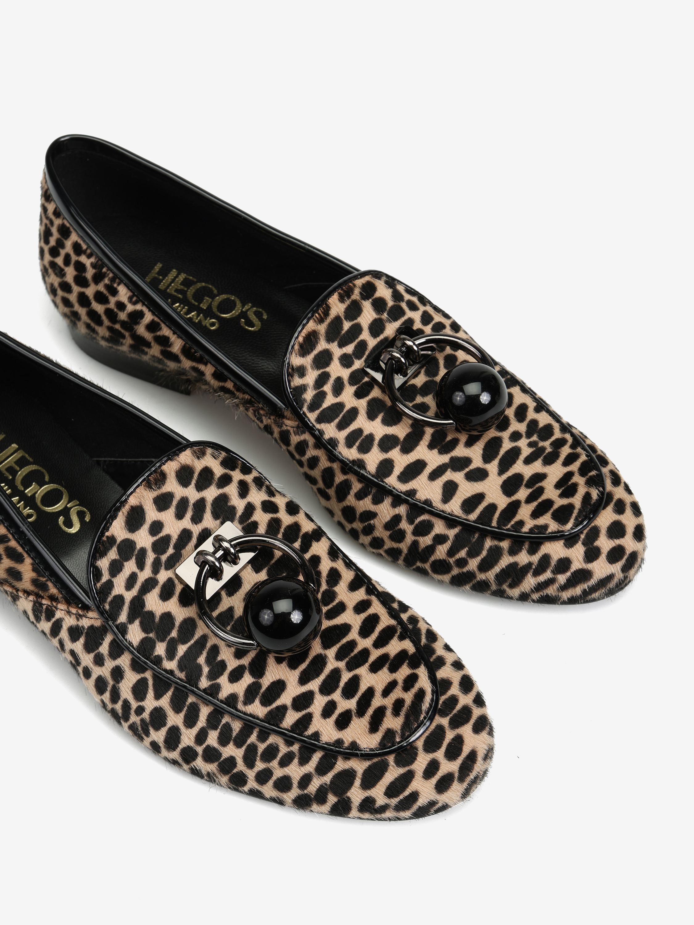 Mokasyny wykonane ze skóry z włosiem w cętki. Biżuteryjna aplikacja z perłą i połyskująca lamówka.