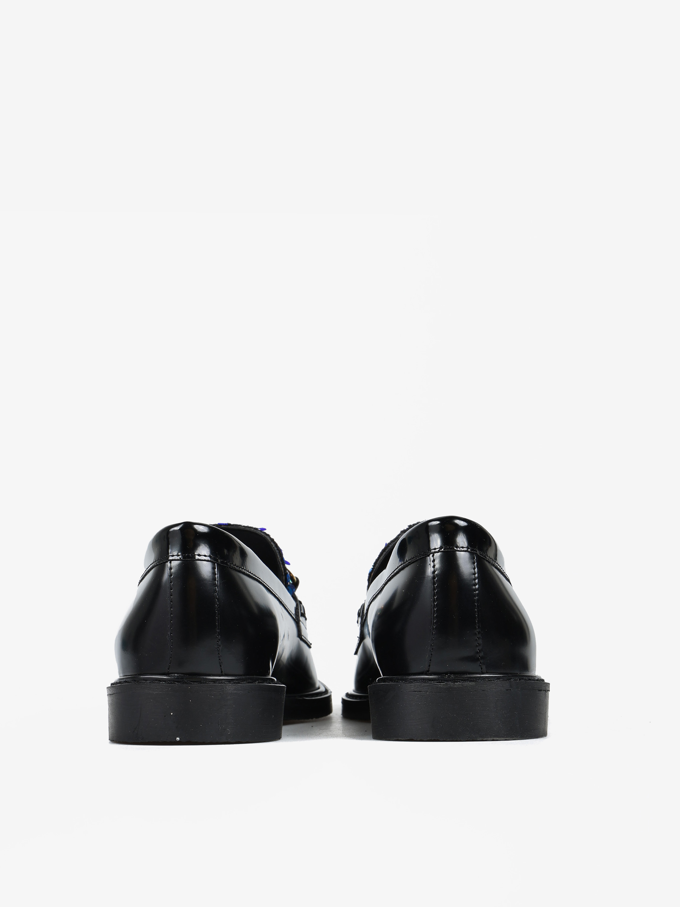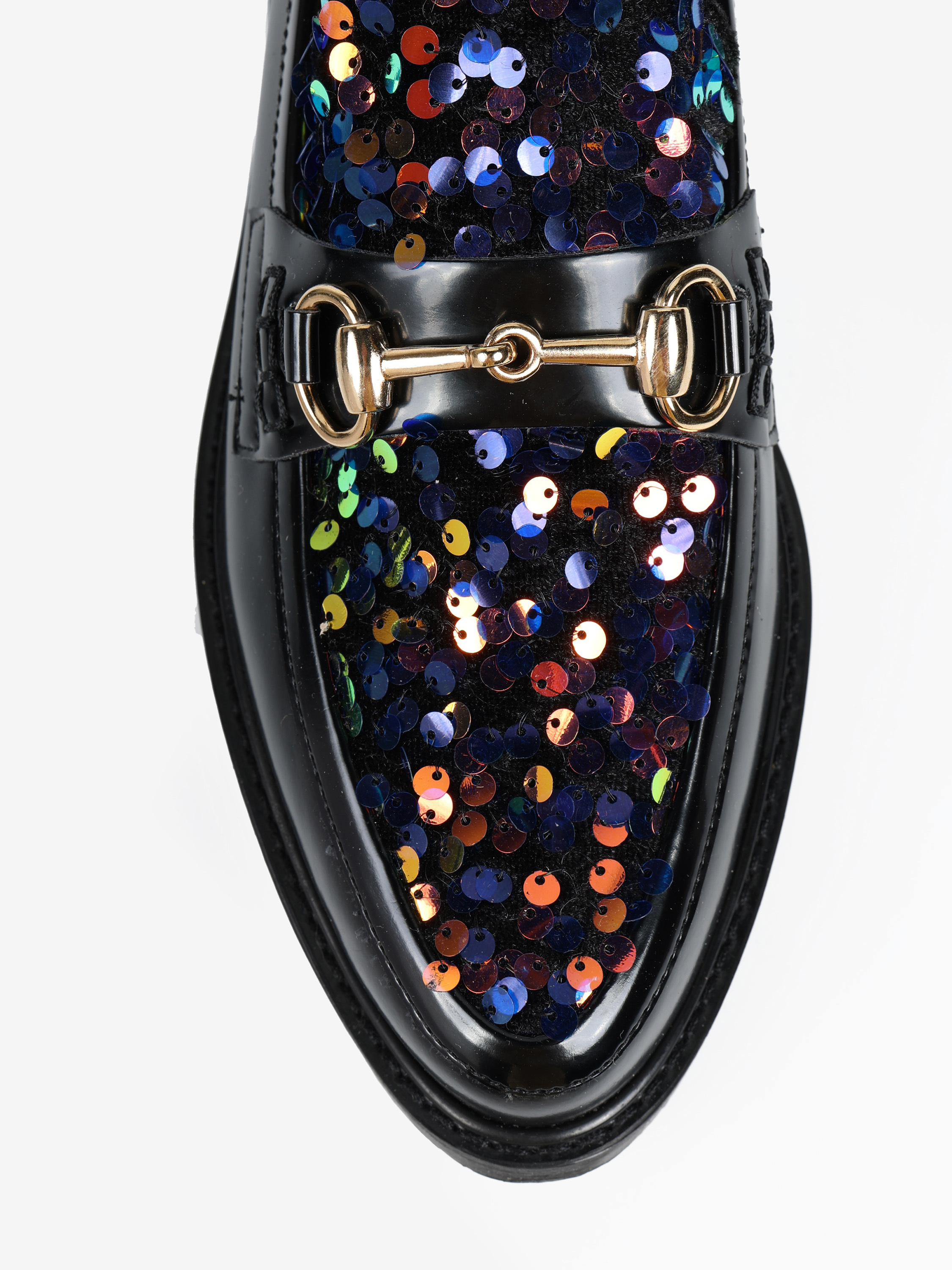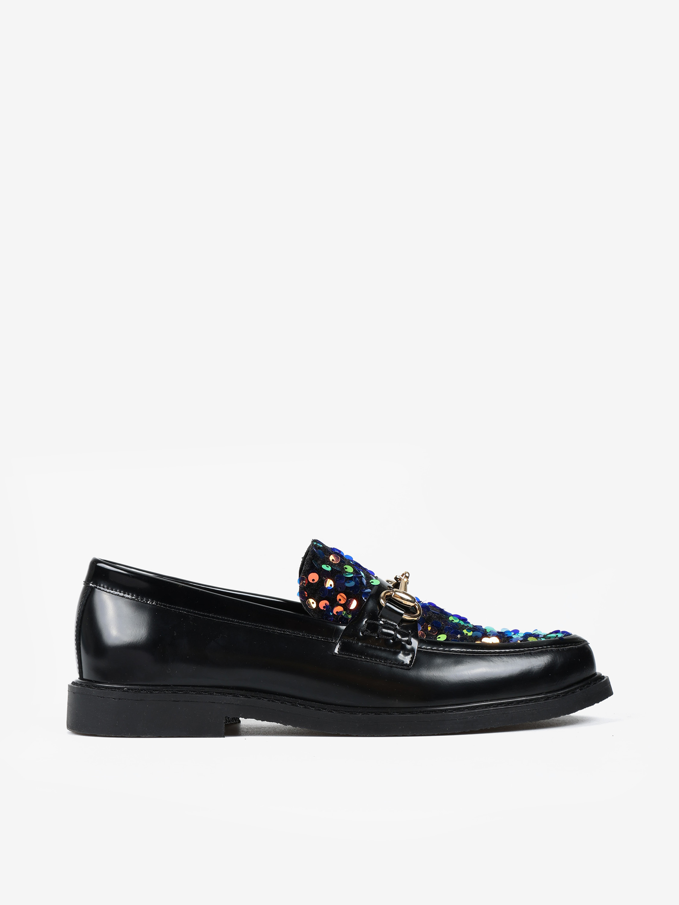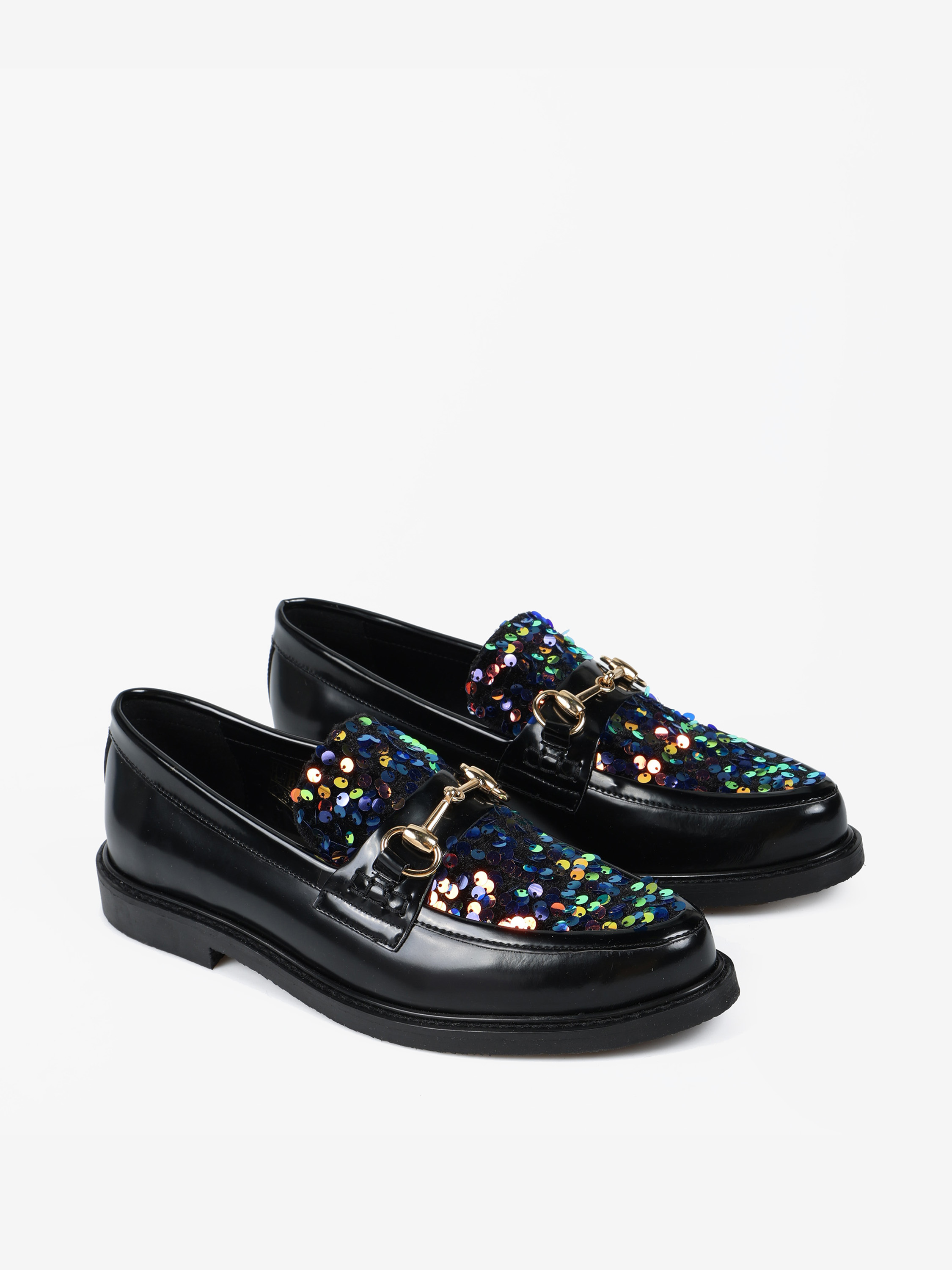 Mokasyny z patką i wędzidłem wykonane z wysokopolerowanej skóry. Ozdobna wstawka wykończona cekinami.