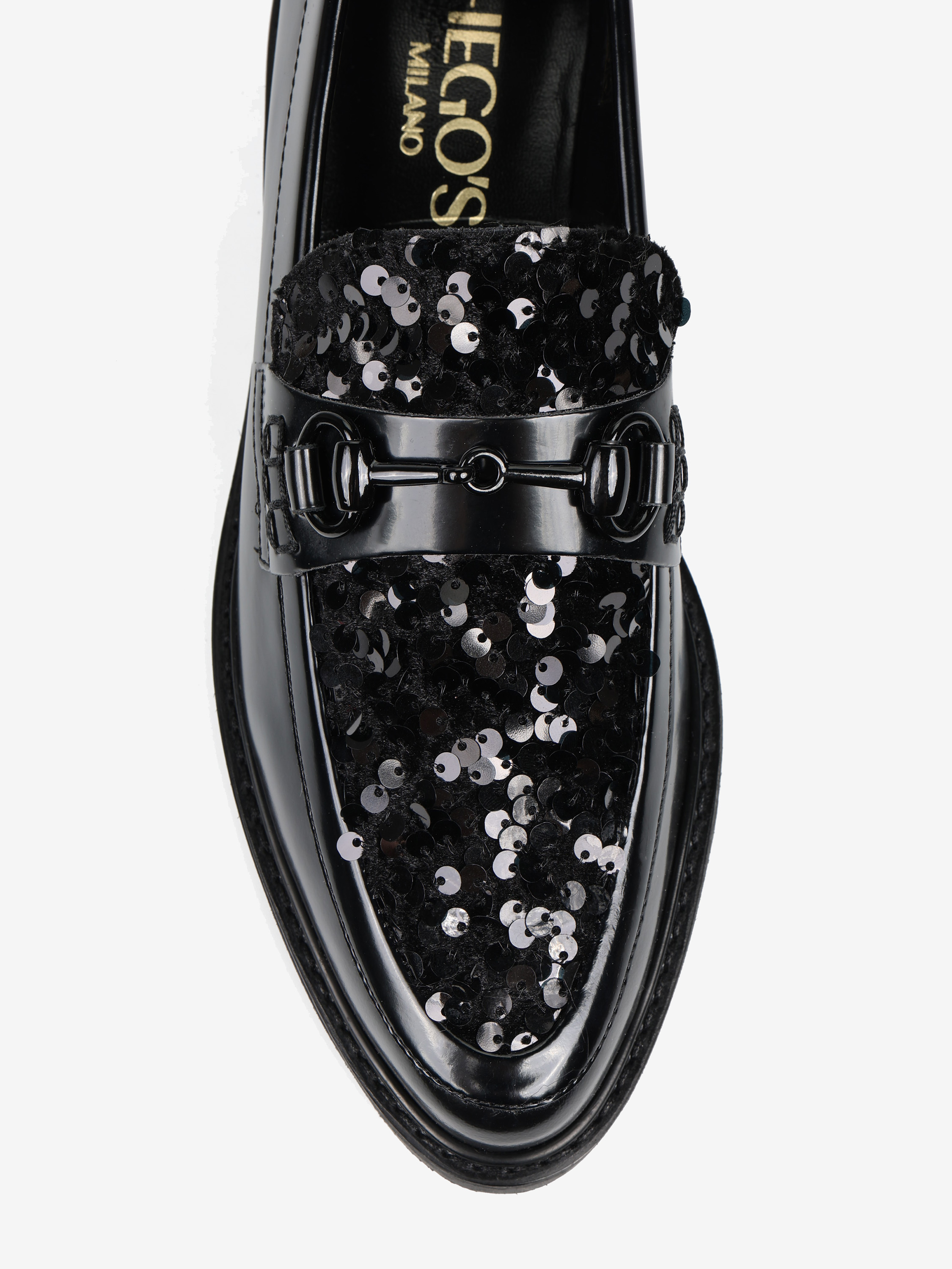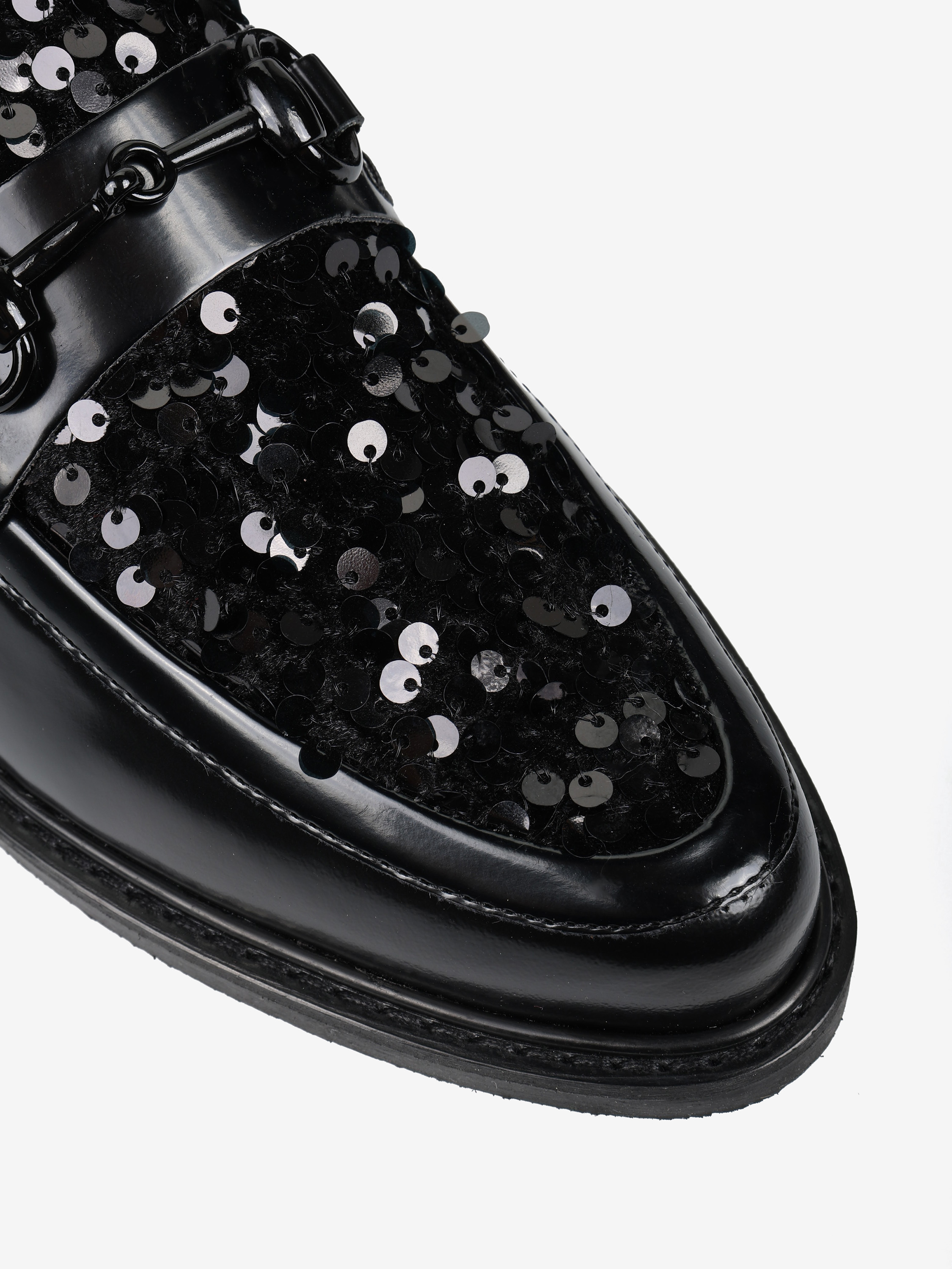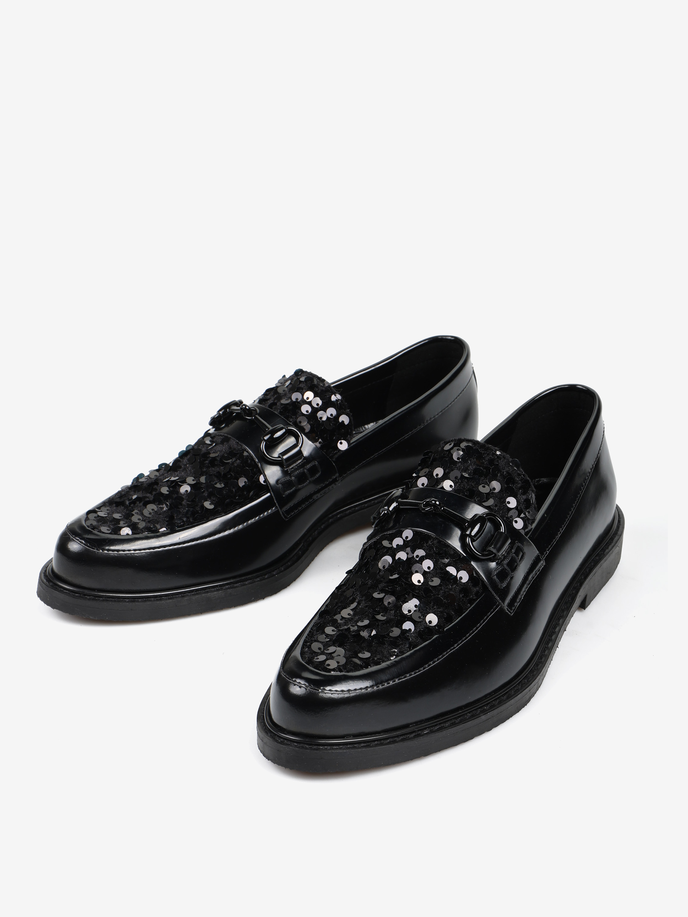 Mokasyny z patką i wędzidłem wykonane z wysokopolerowanej skóry. Ozdobna wstawka wykończona cekinami.