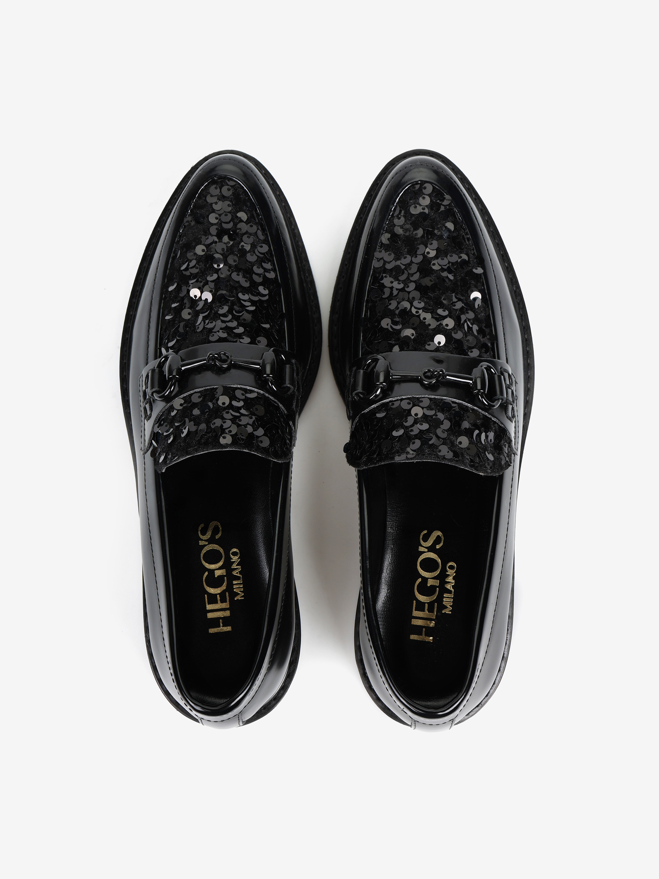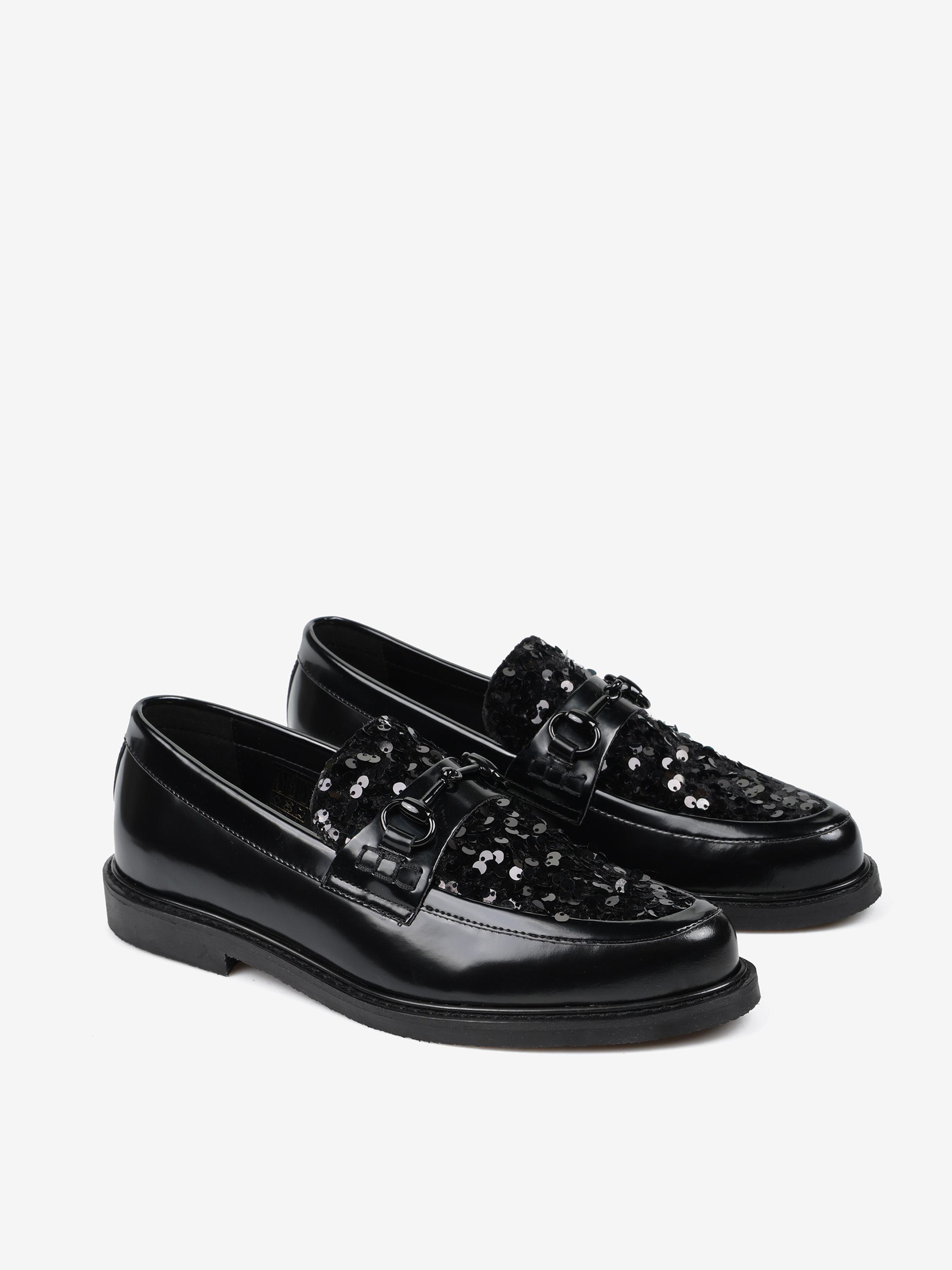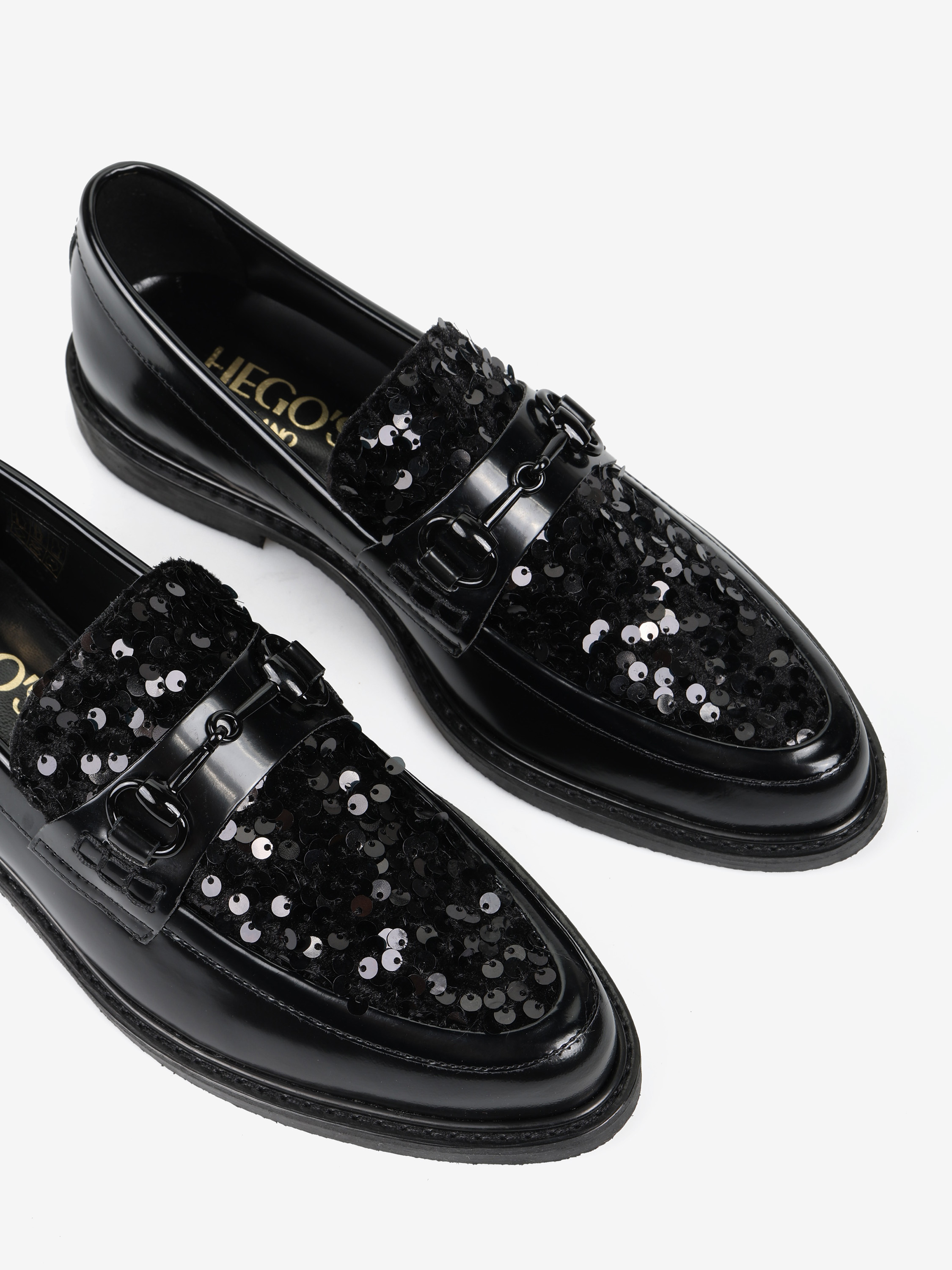 Mokasyny z patką i wędzidłem wykonane z wysokopolerowanej skóry. Ozdobna wstawka wykończona cekinami.