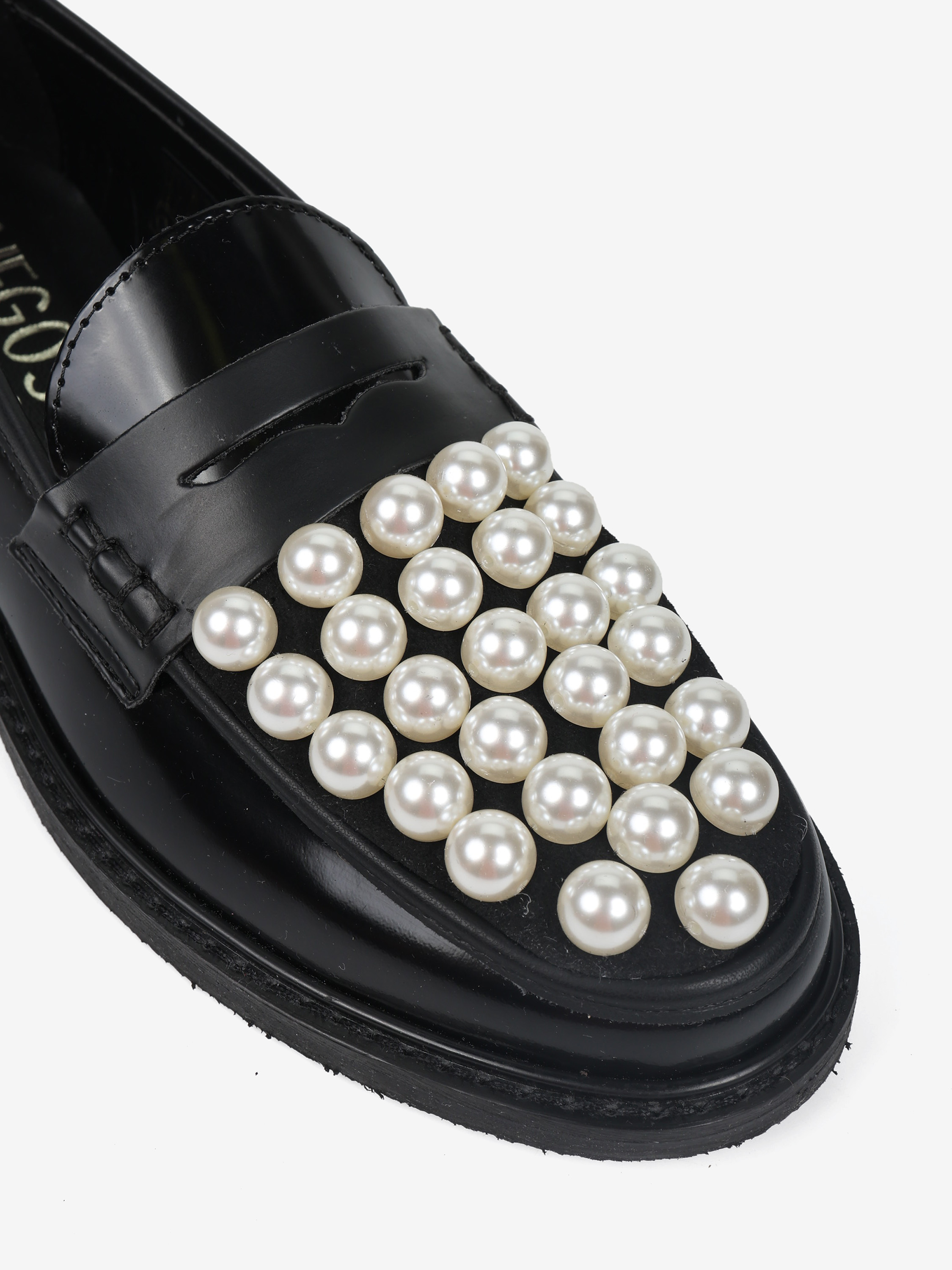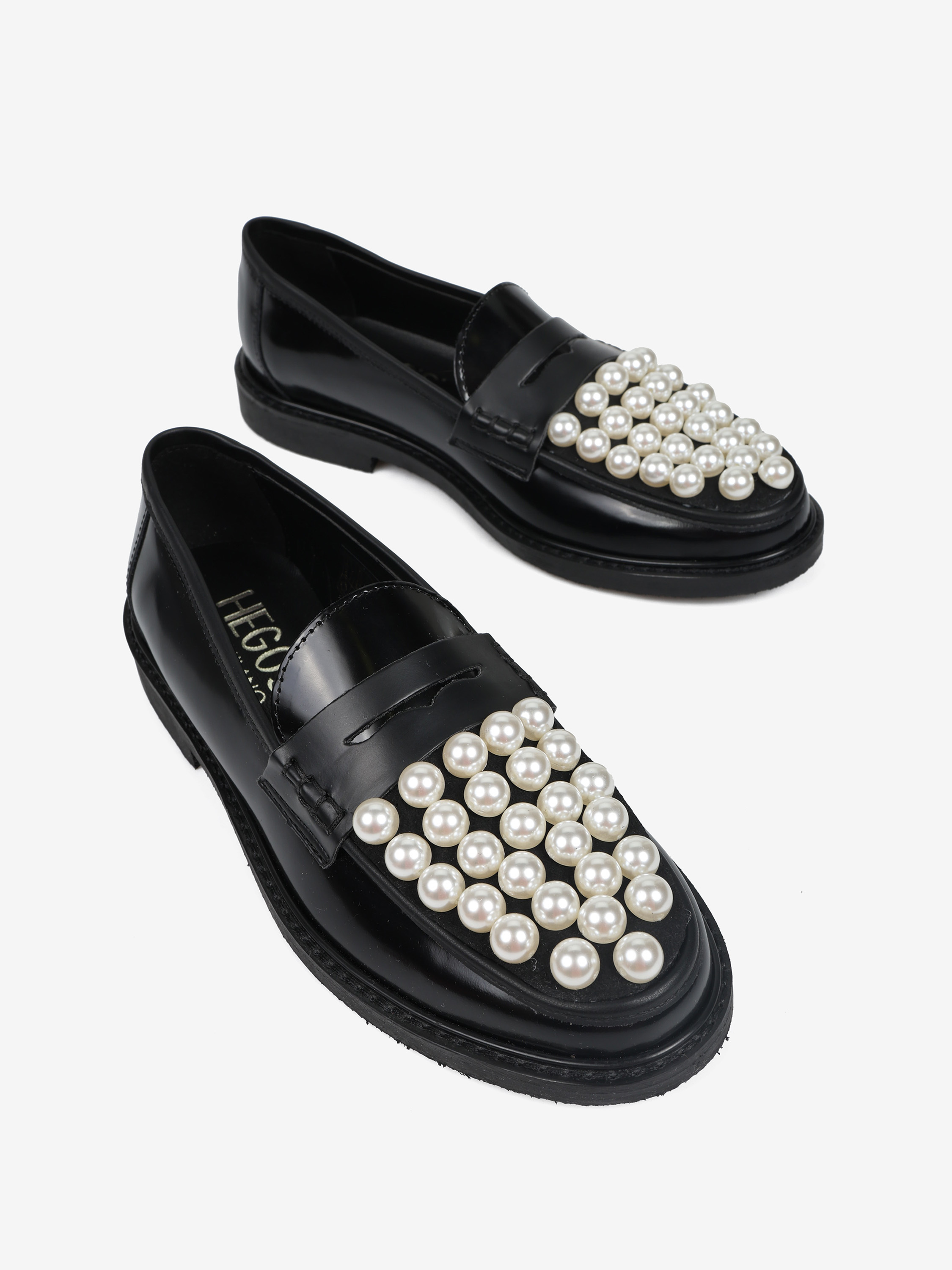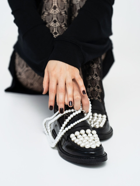 Mokasyny z ozdobnymi perłami i patką. Wykonane z wysokopolerowanej, czarnej skóry.