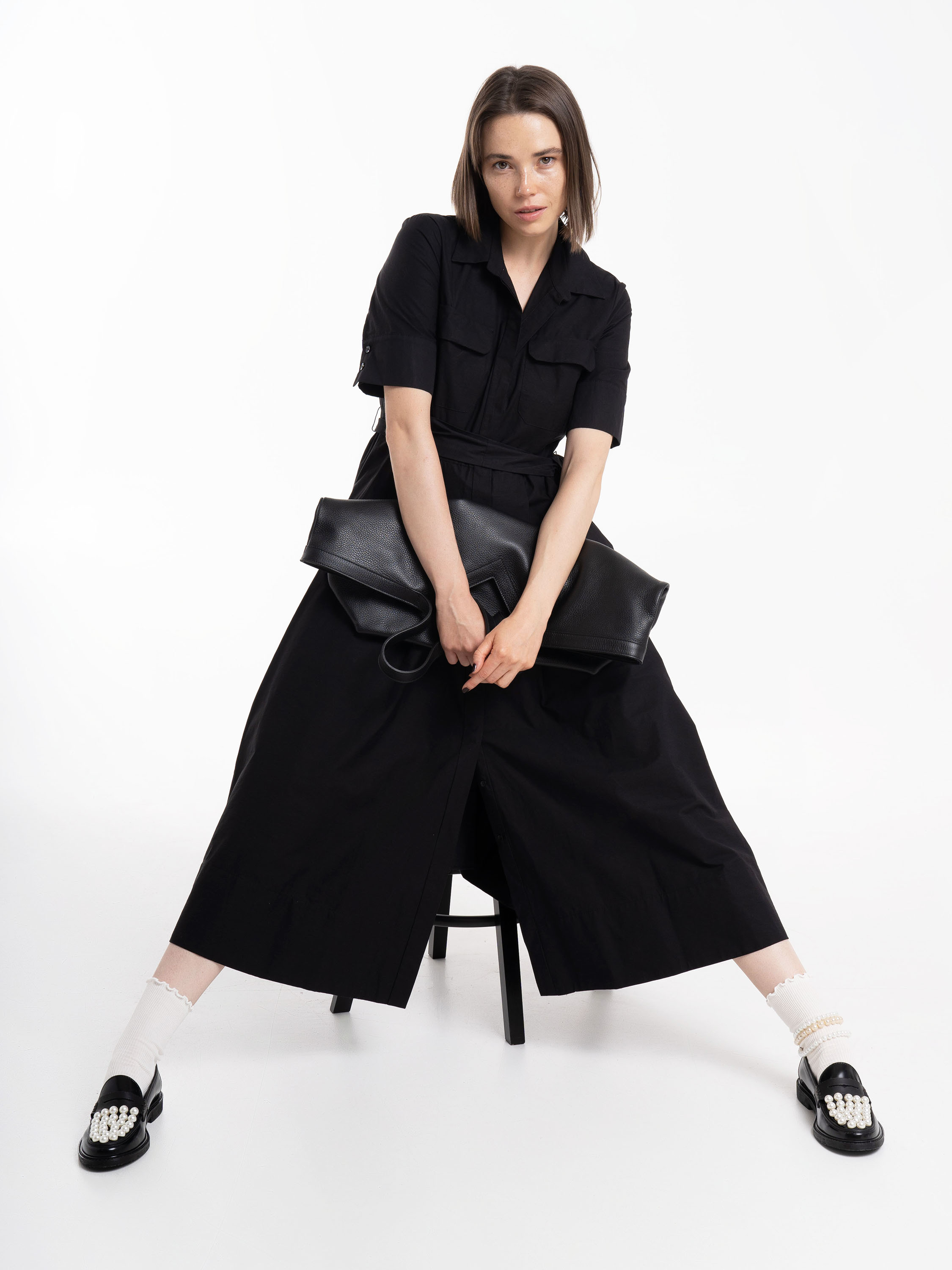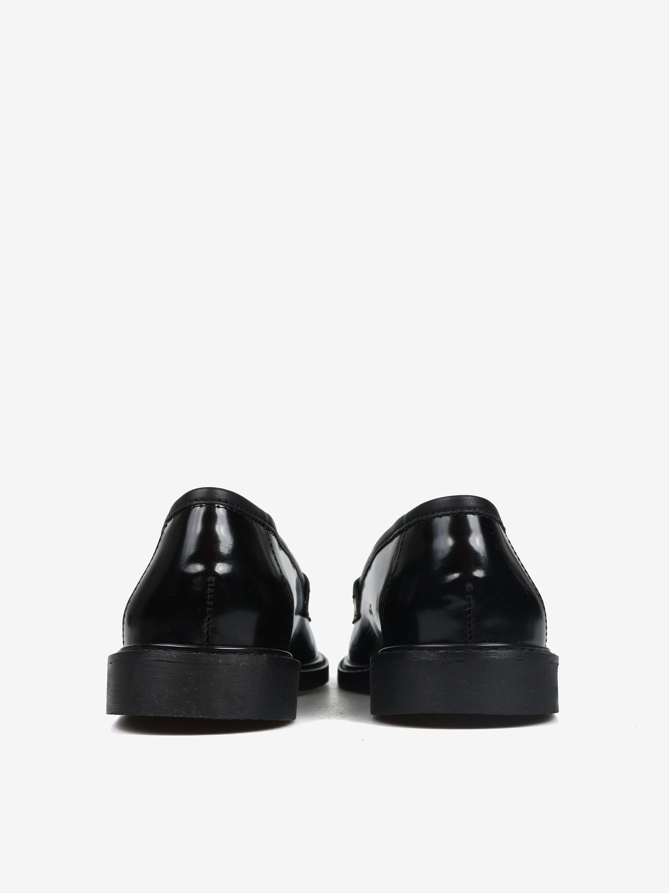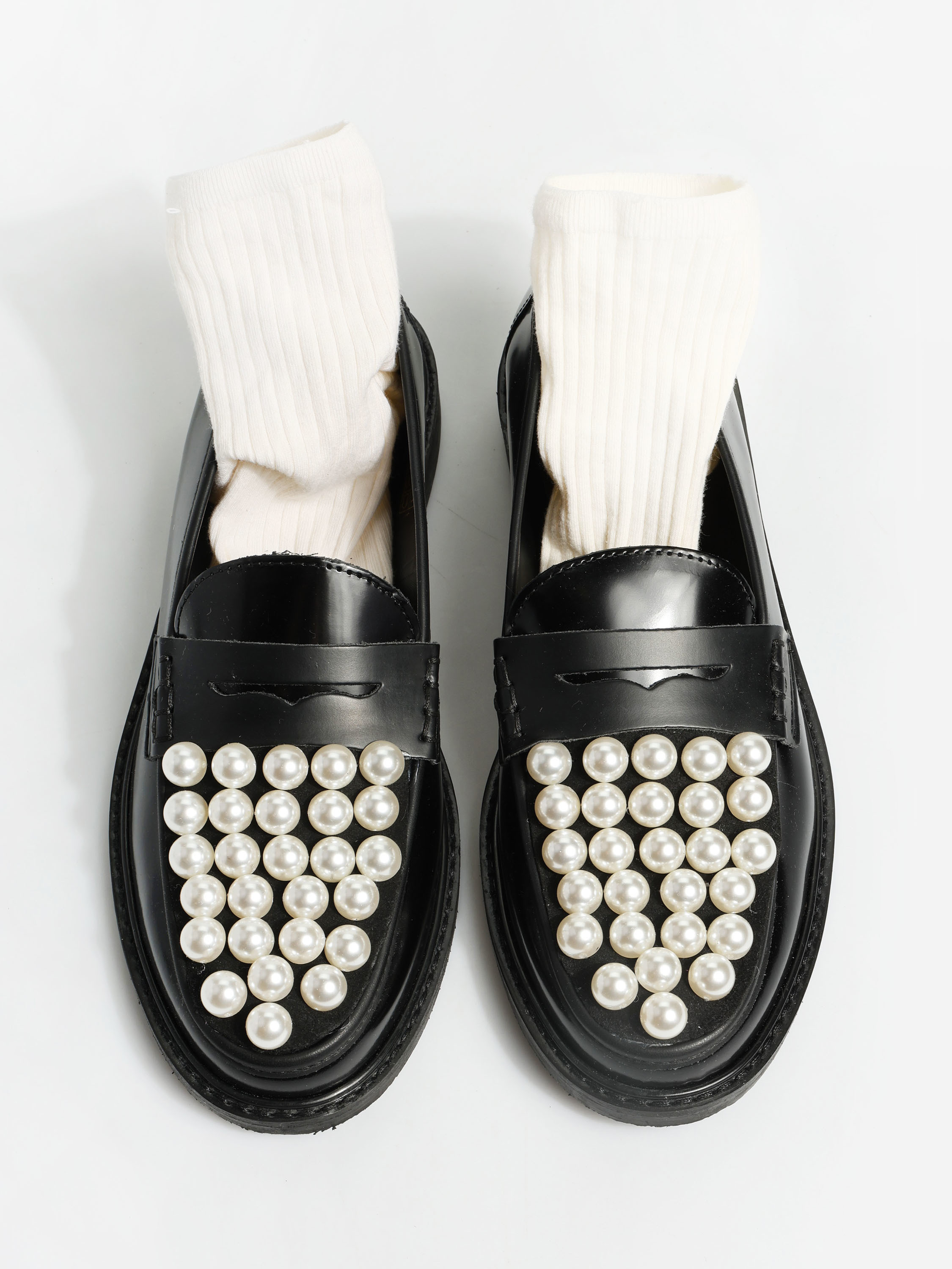 Mokasyny z ozdobnymi perłami i patką. Wykonane z wysokopolerowanej, czarnej skóry.