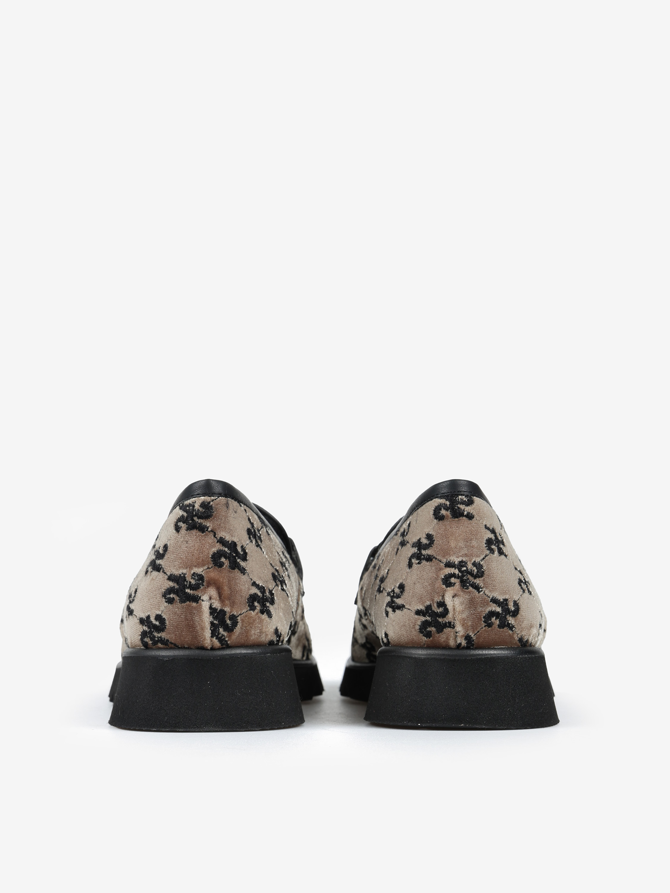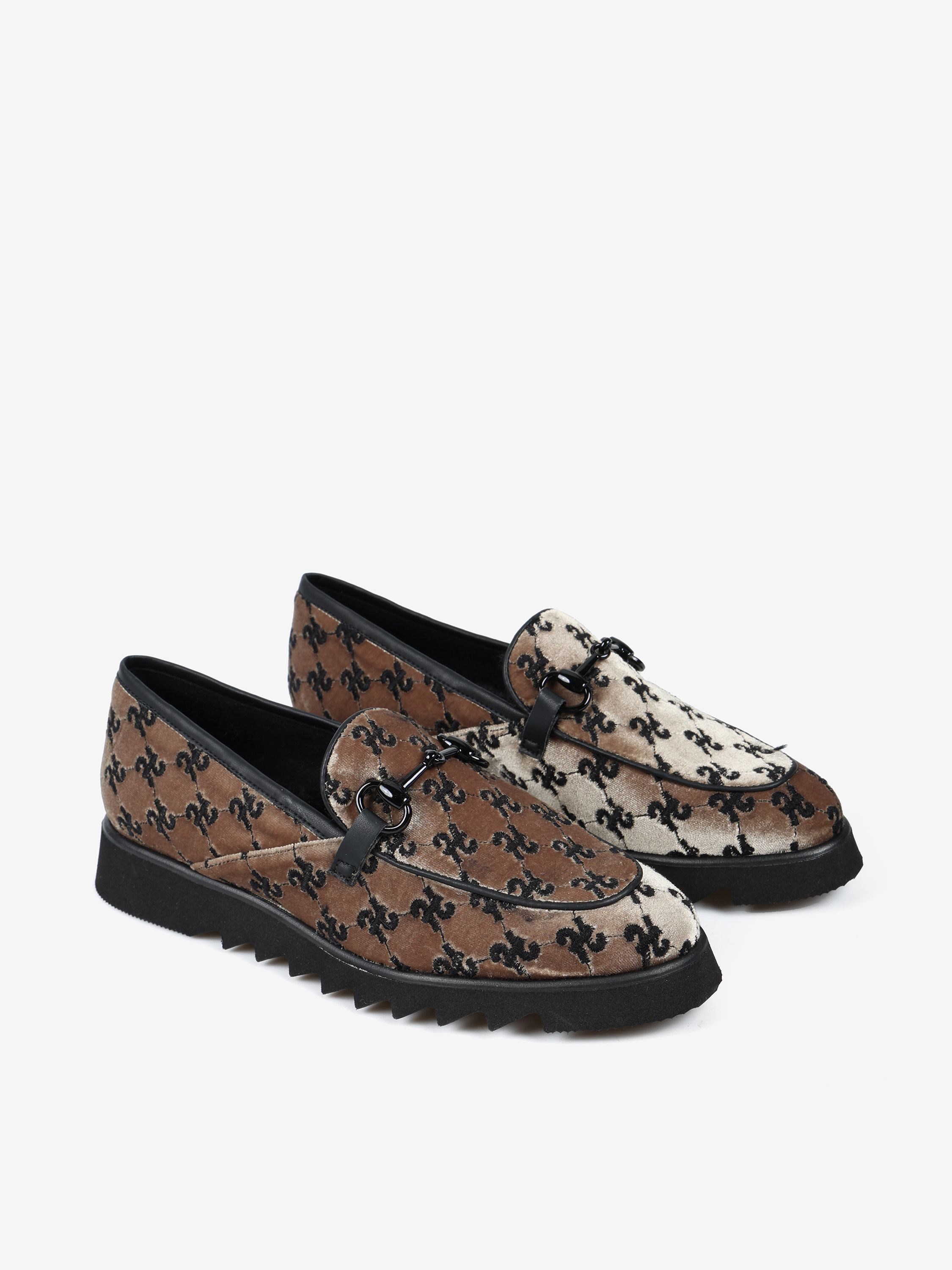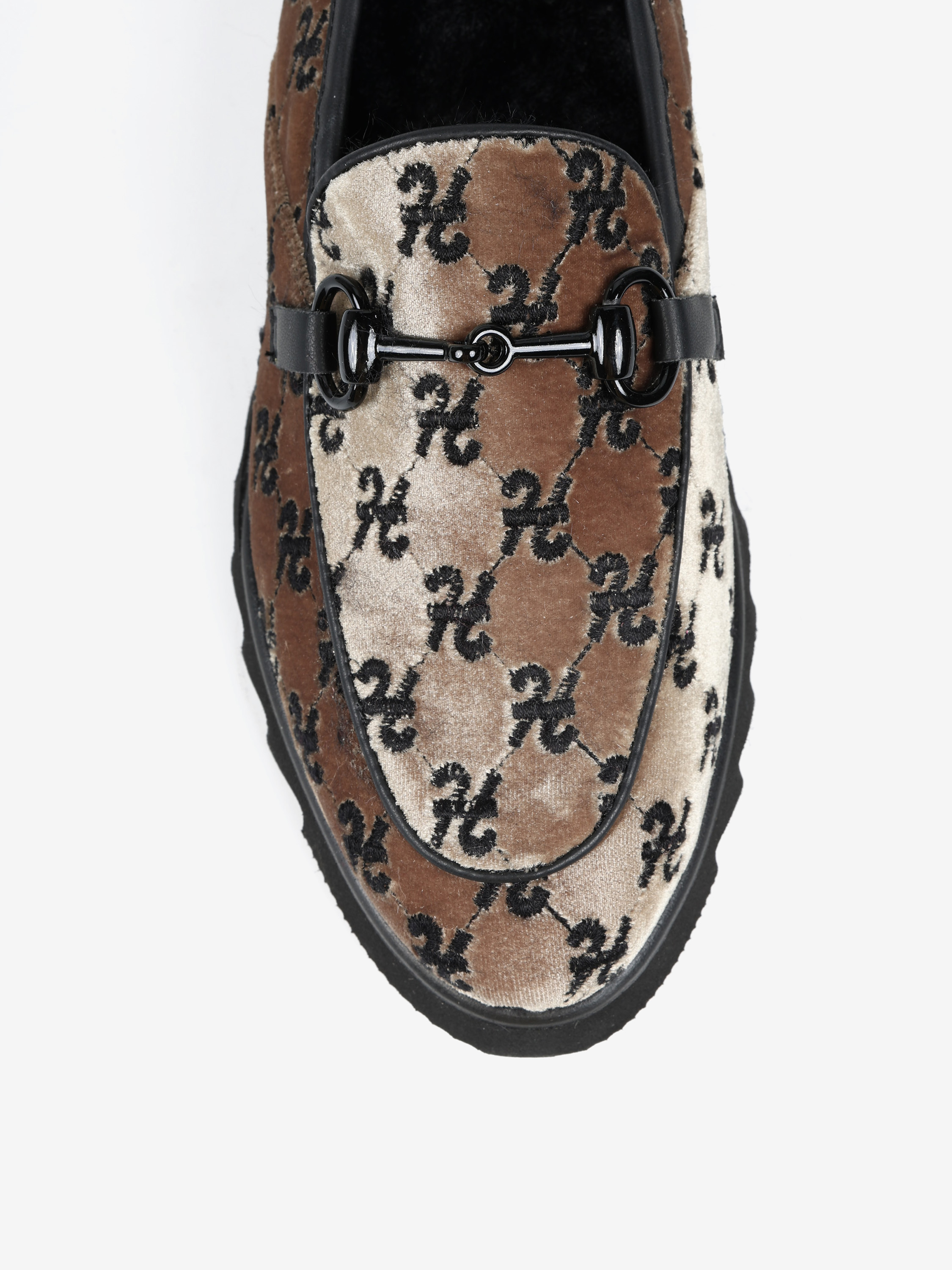 Welurowe mokasyny na efektownej podeszwie z wnętrzem wyłożonym miękkim, sztucznym futrem. Ozdobne wędzidło i haft z monogramem.