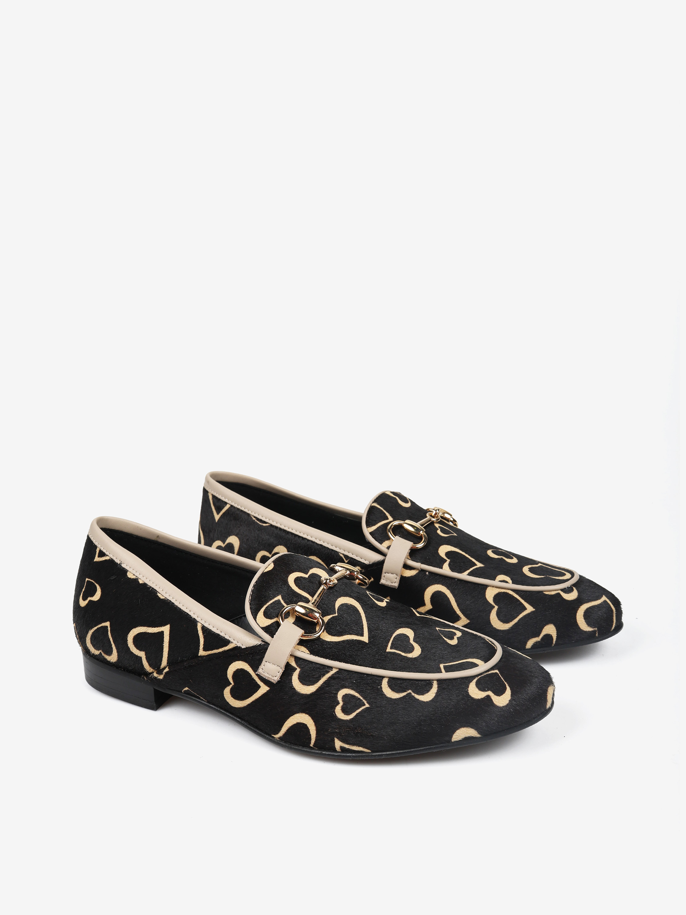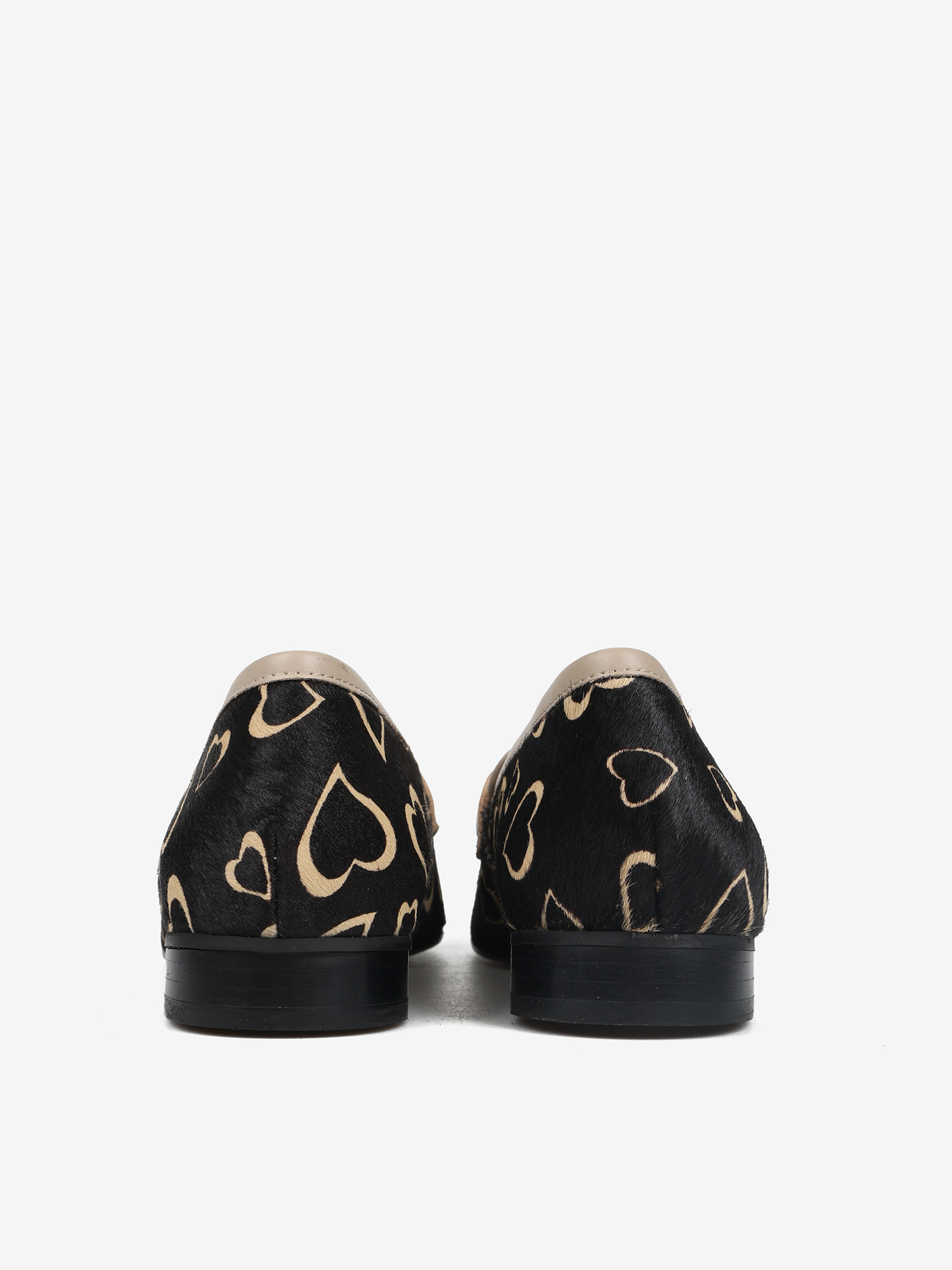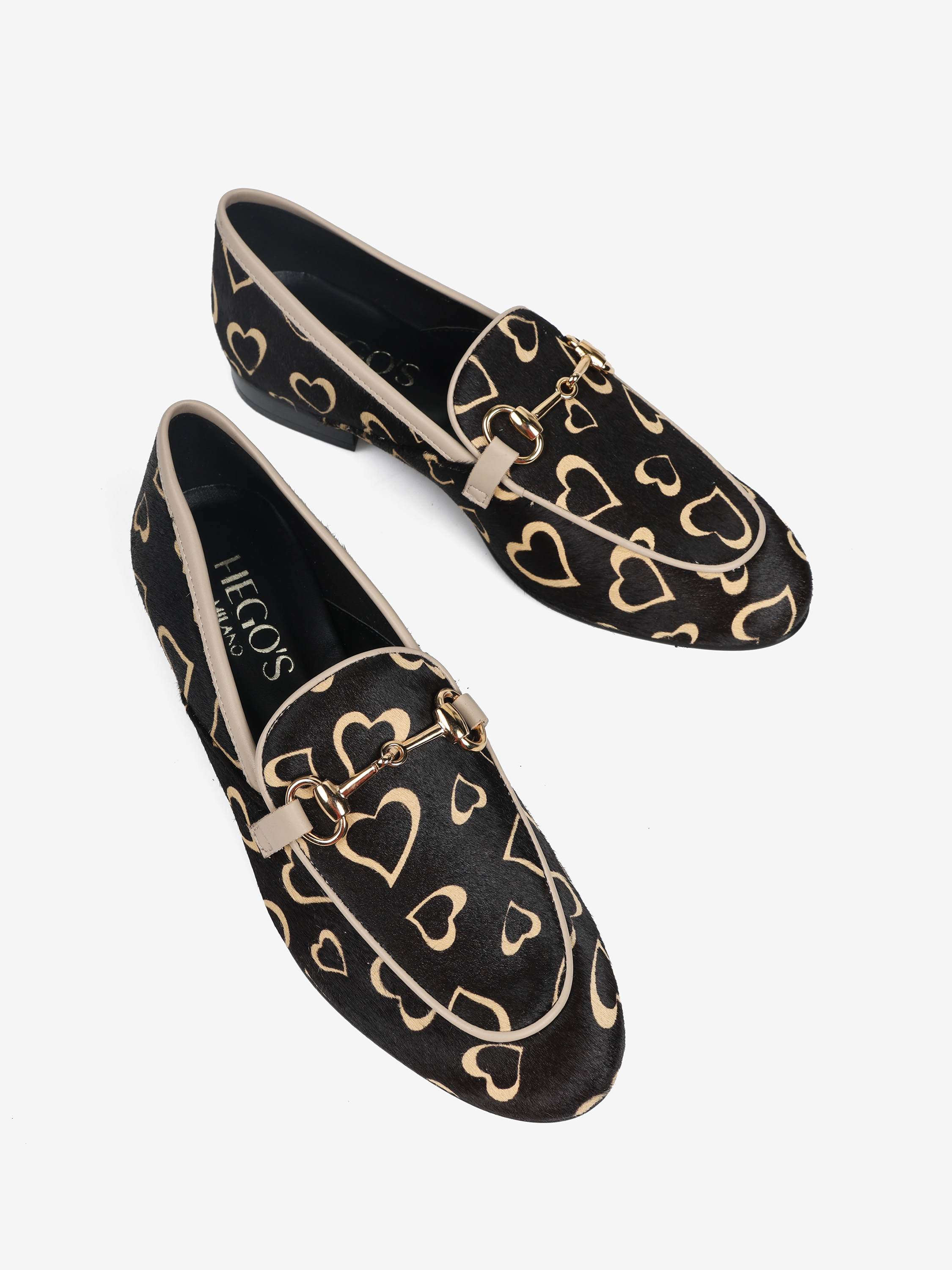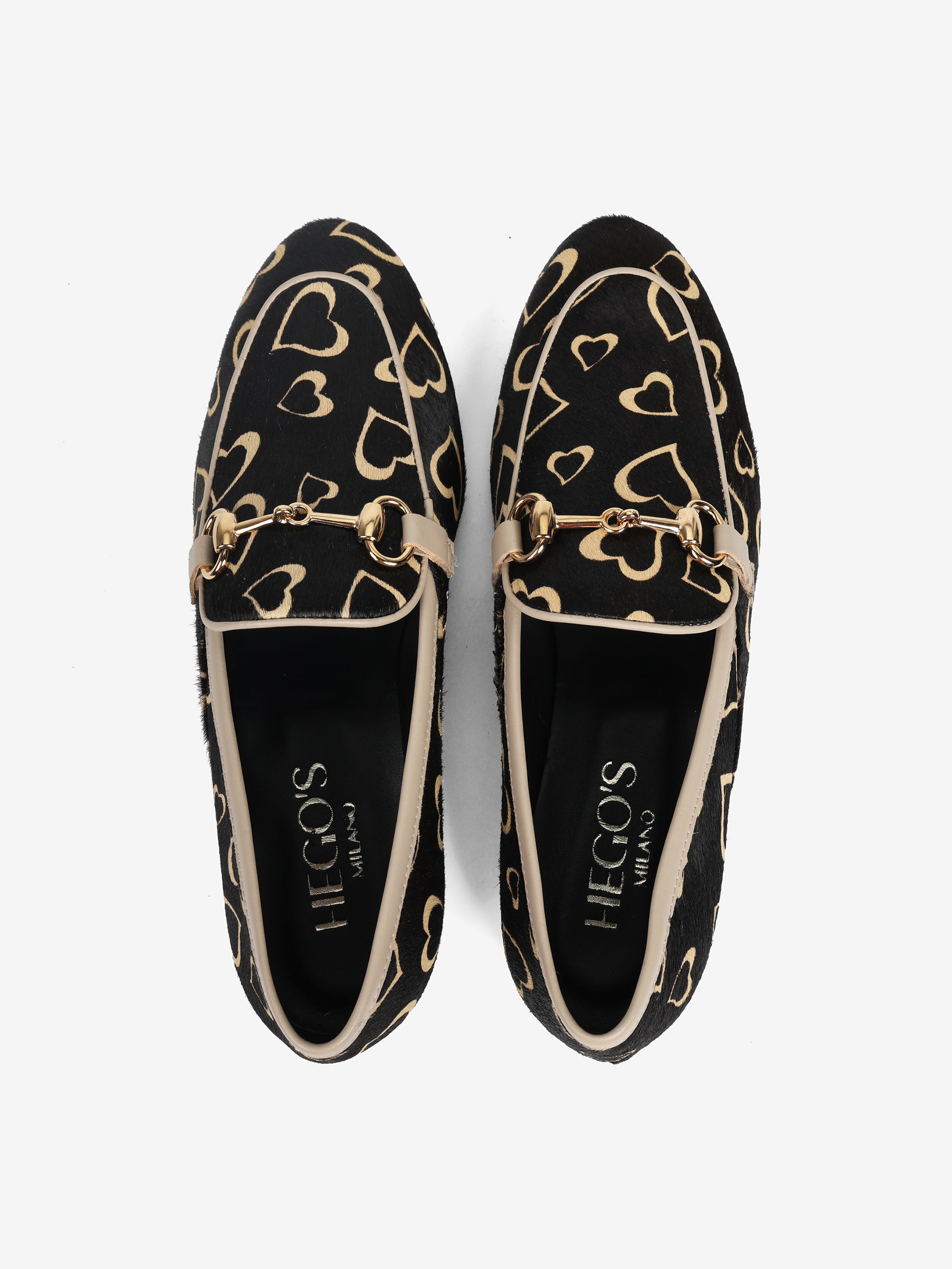 Mokasyny w serca wykonane ze skóry z włosiem. Beżowa lamówka i ozdobne, złote wędzidło.