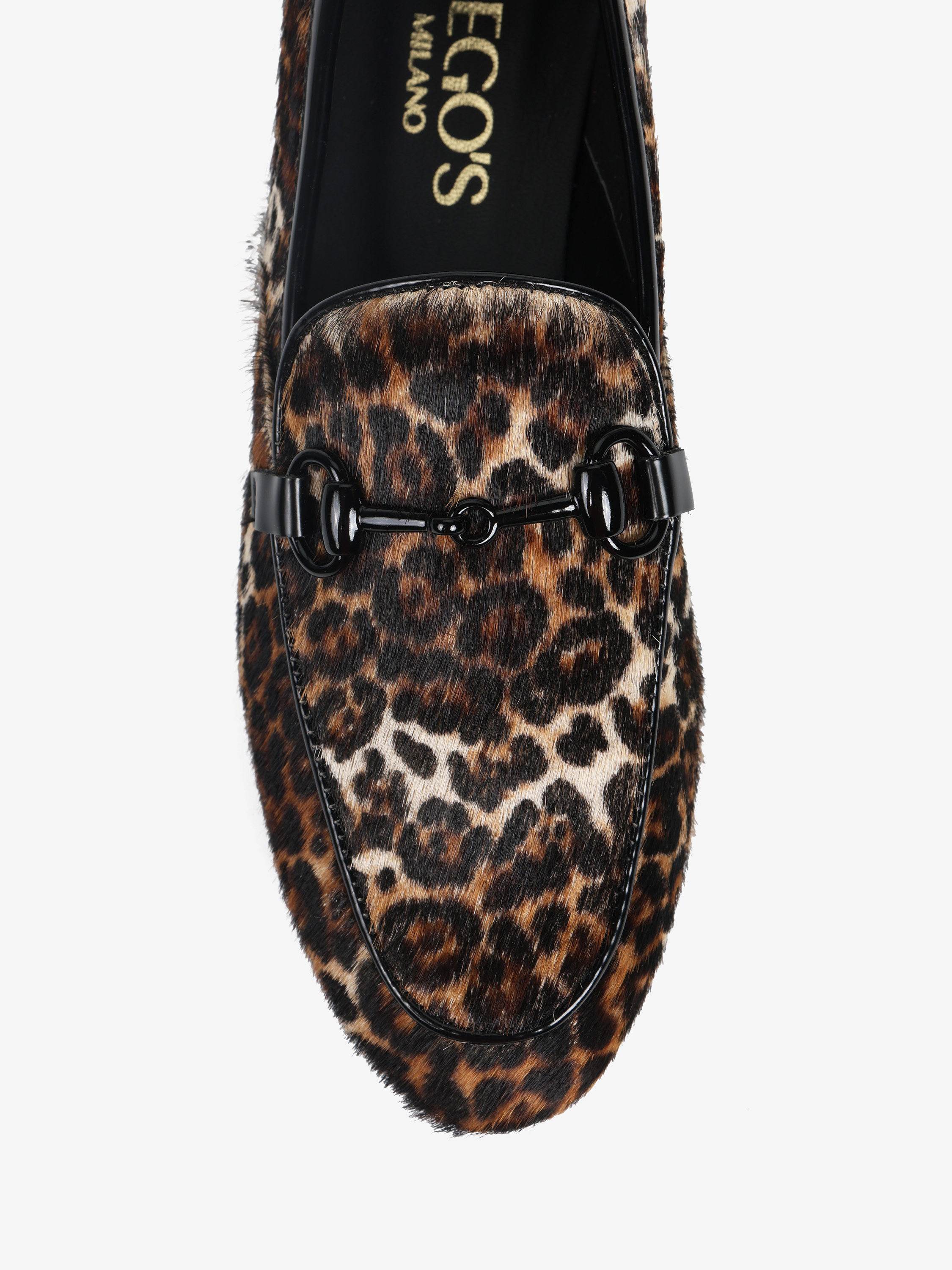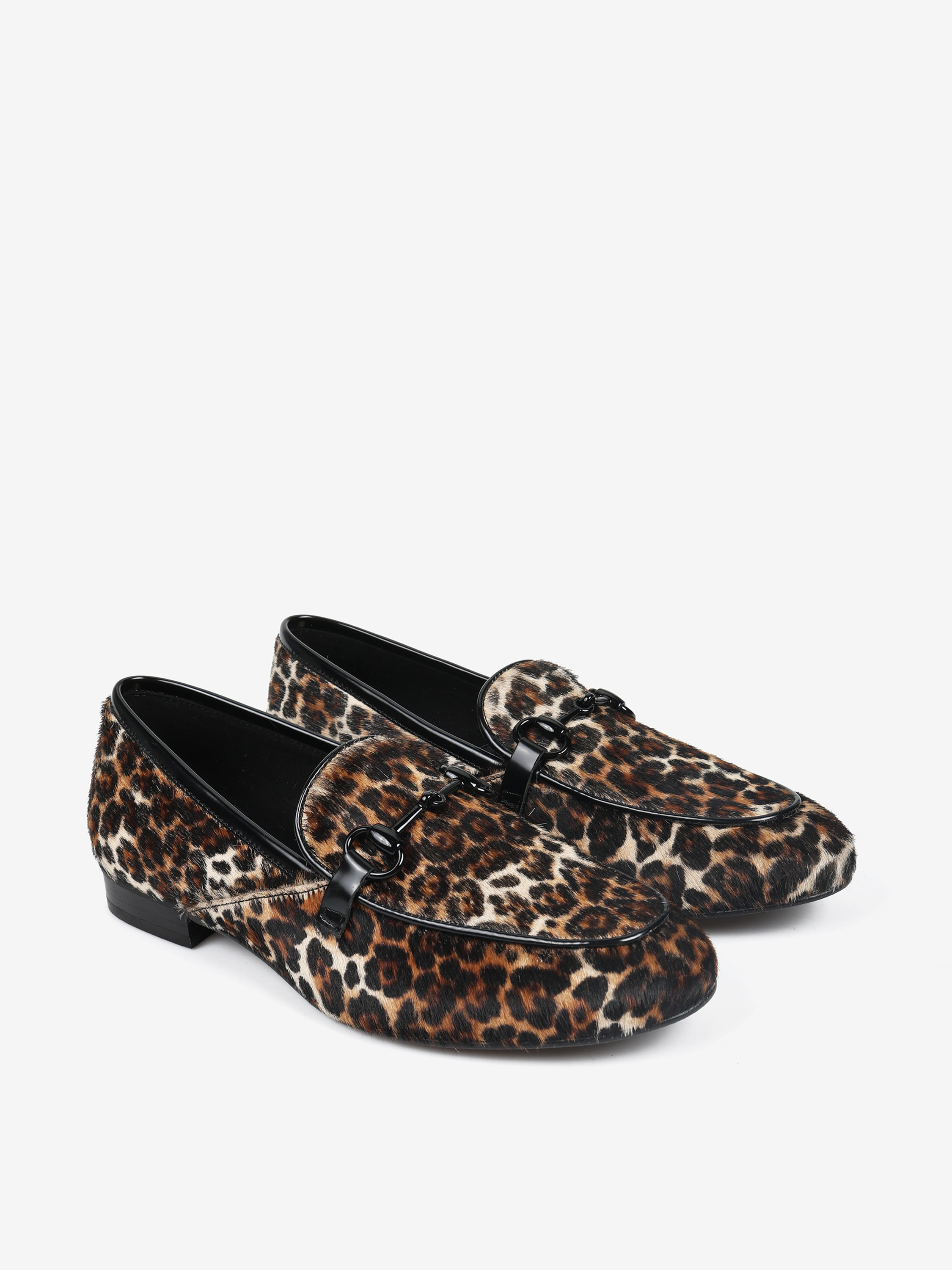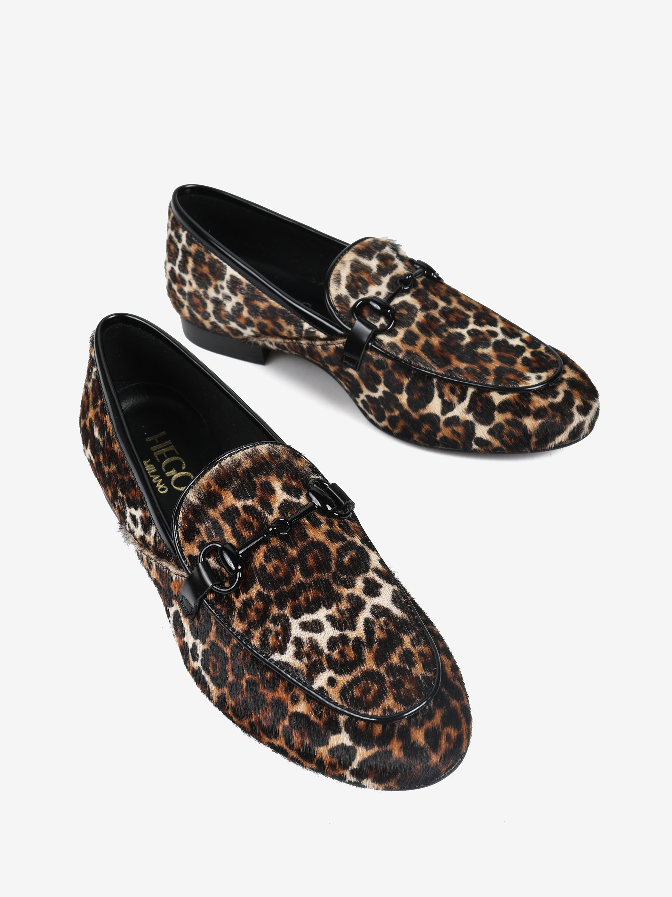 Mokasyny w zwierzęcy wzór wykonane ze skóry z włosiem. Czarna lamówka i ozdobne, metalowe wędzidło.