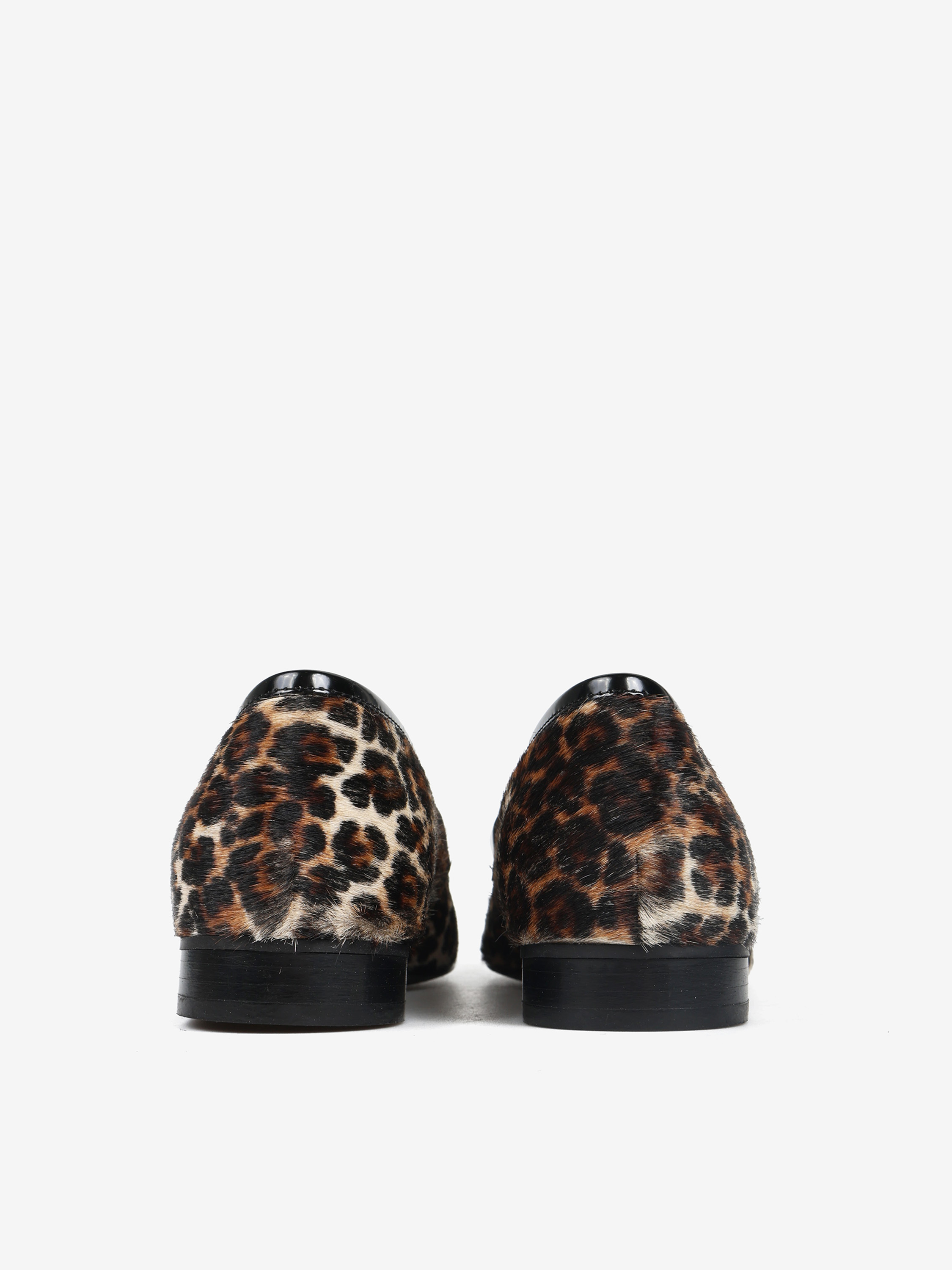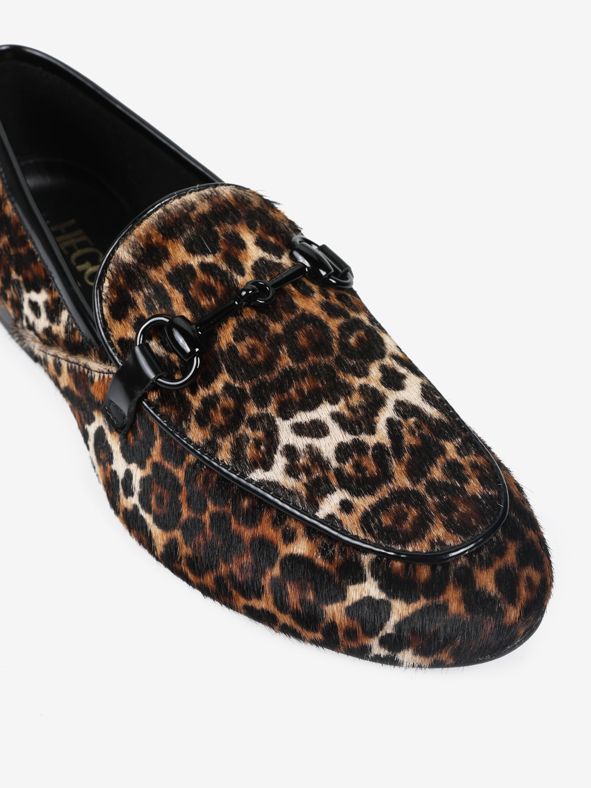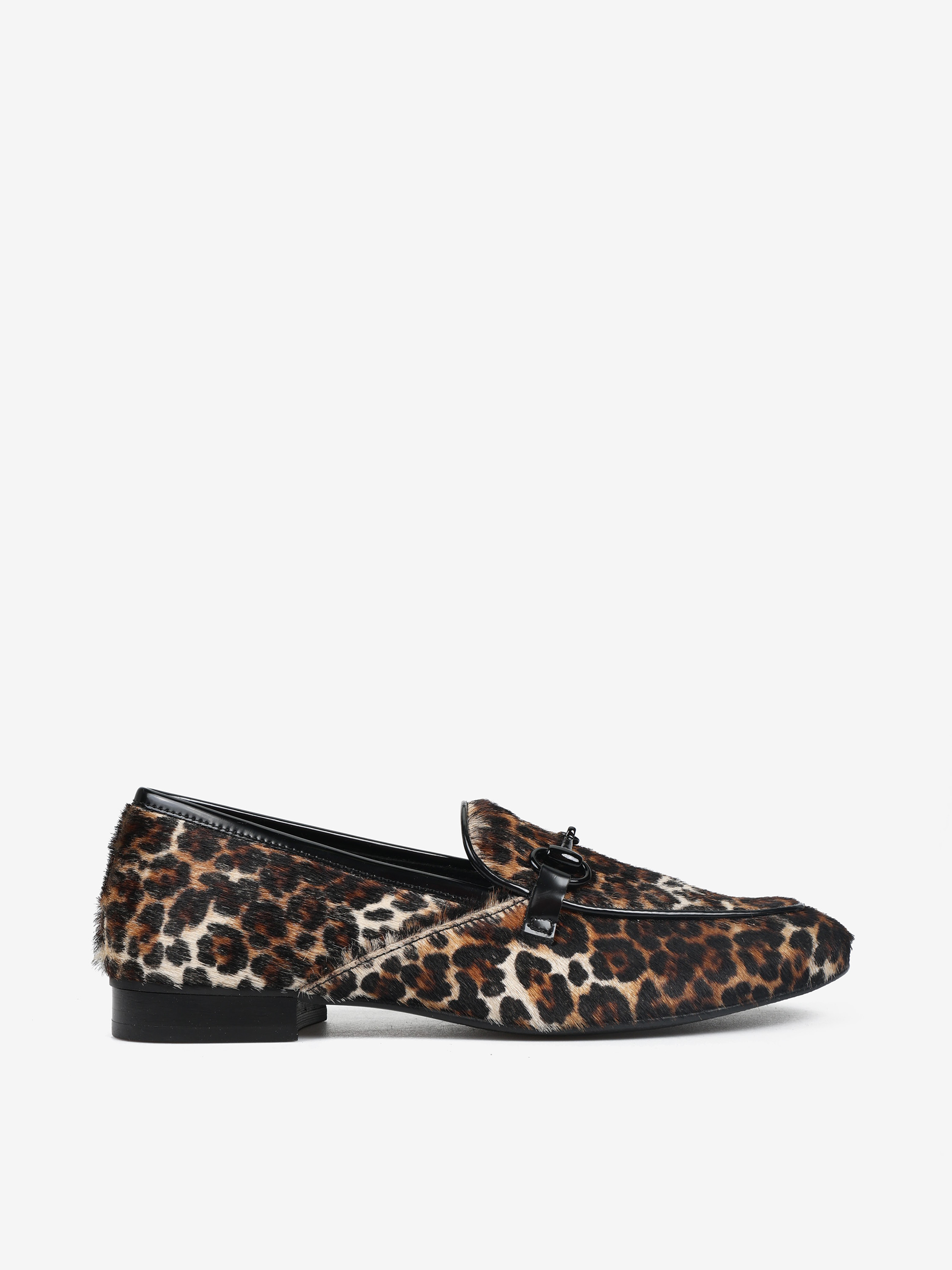 Mokasyny w zwierzęcy wzór wykonane ze skóry z włosiem. Czarna lamówka i ozdobne, metalowe wędzidło.