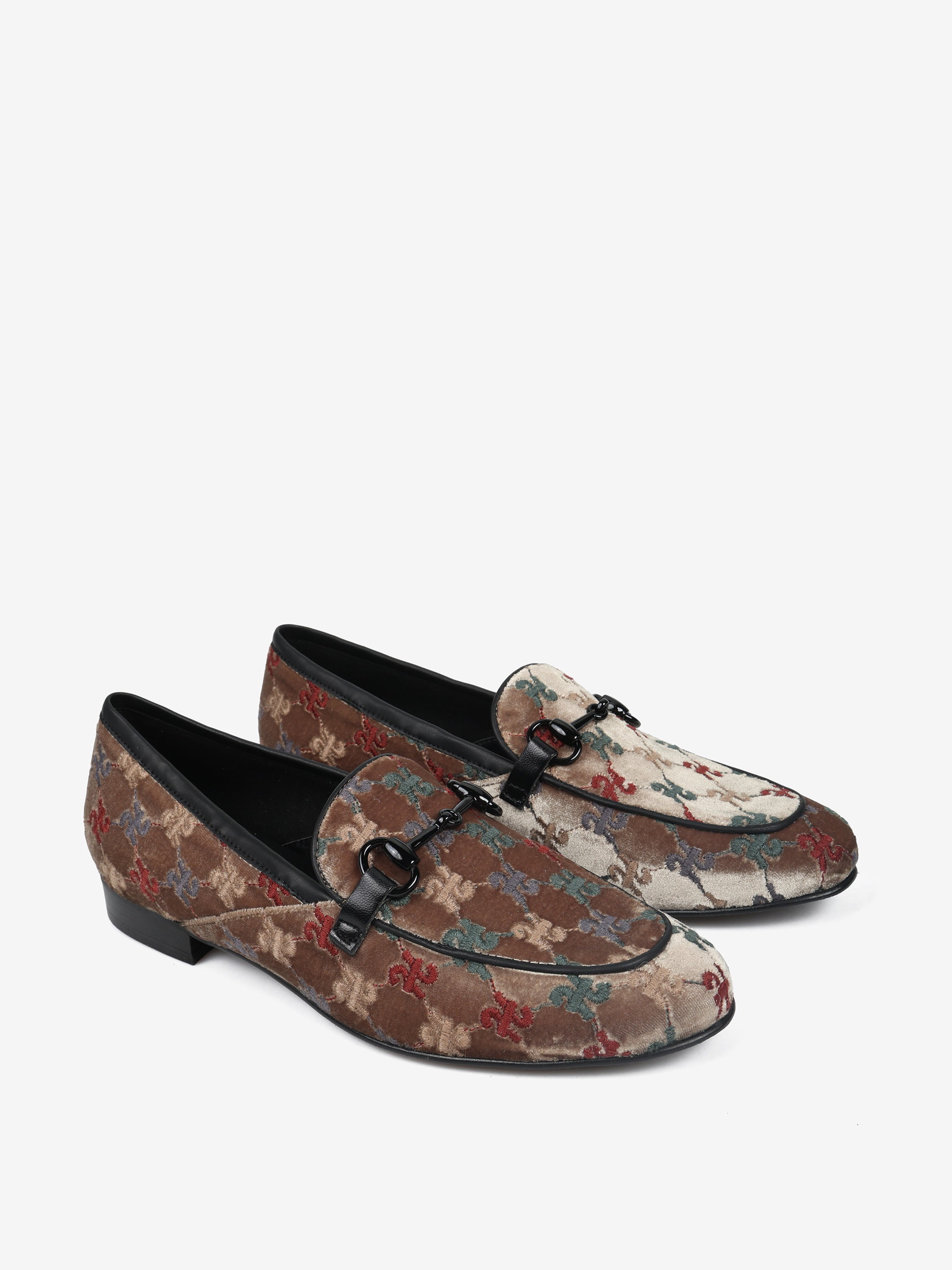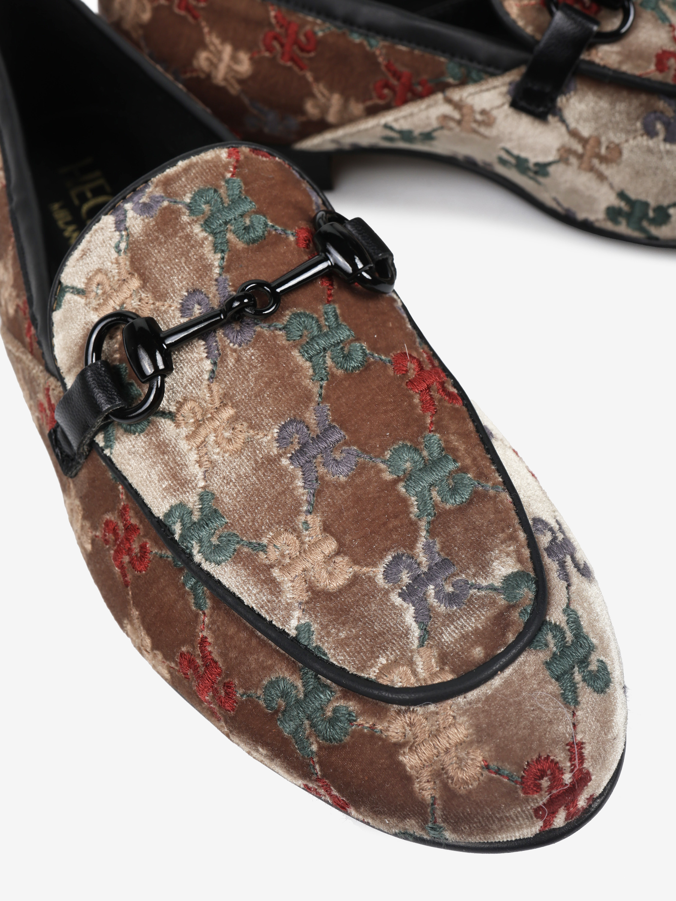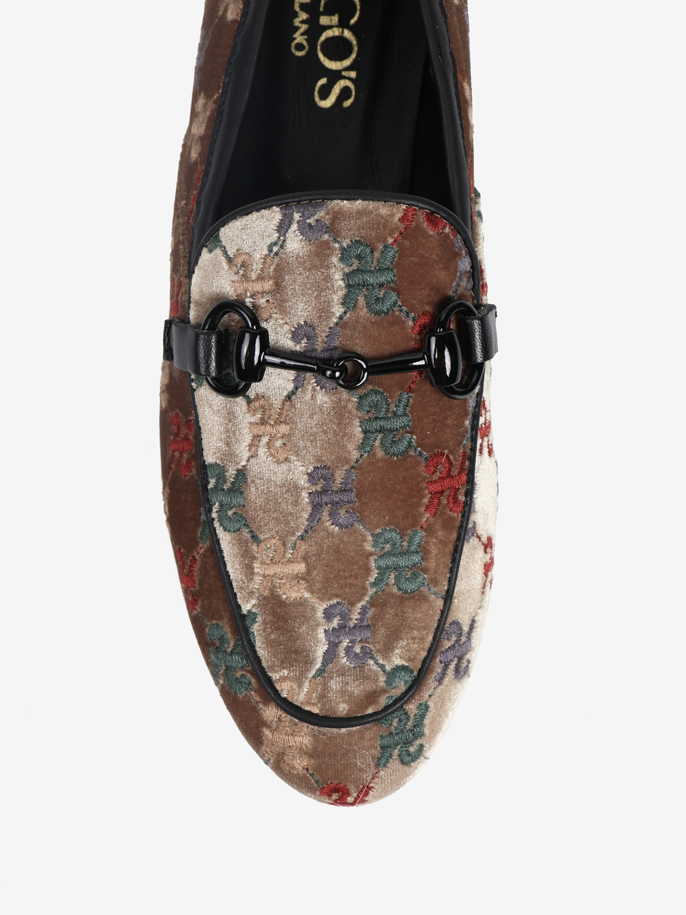 Welurowe mokasyny z haftowanym monogramem. Czarna lamówka i ozdobne, metalowe wędzidło.