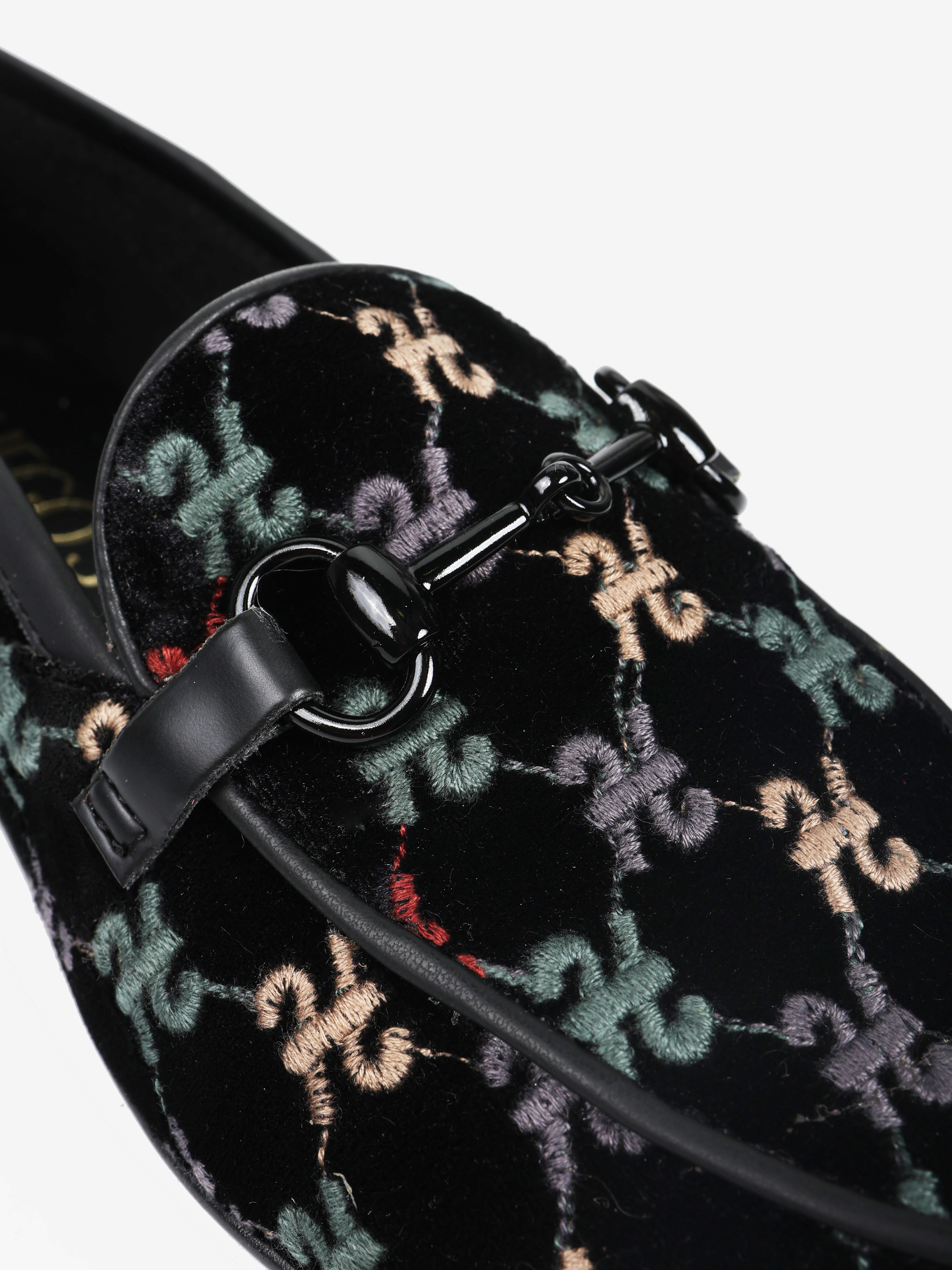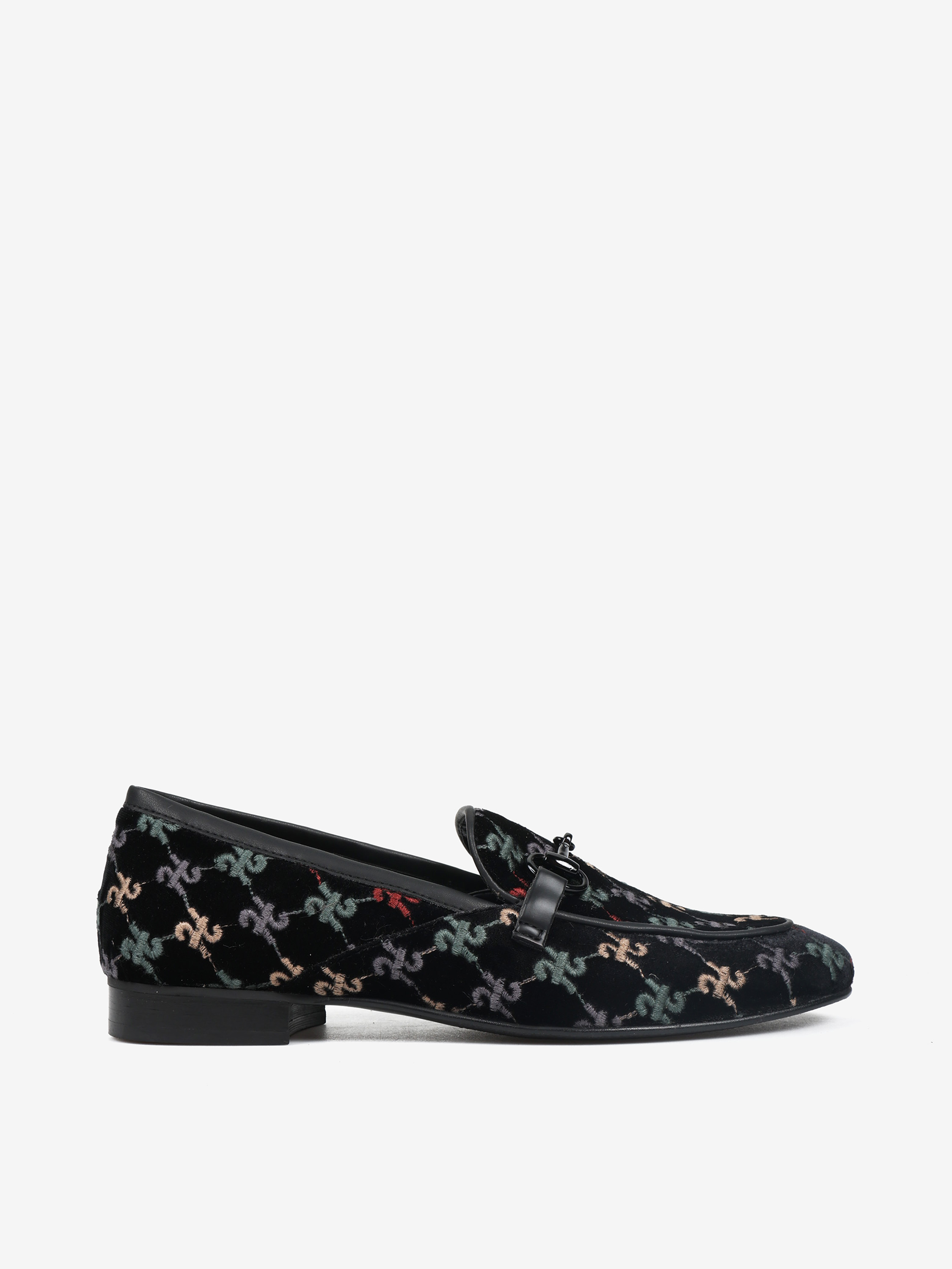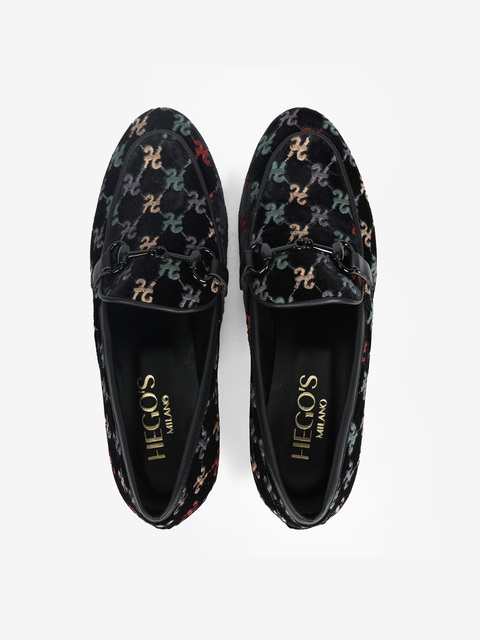 Welurowe mokasyny z haftowanym monogramem. Czarna lamówka i ozdobne, metalowe wędzidło.
