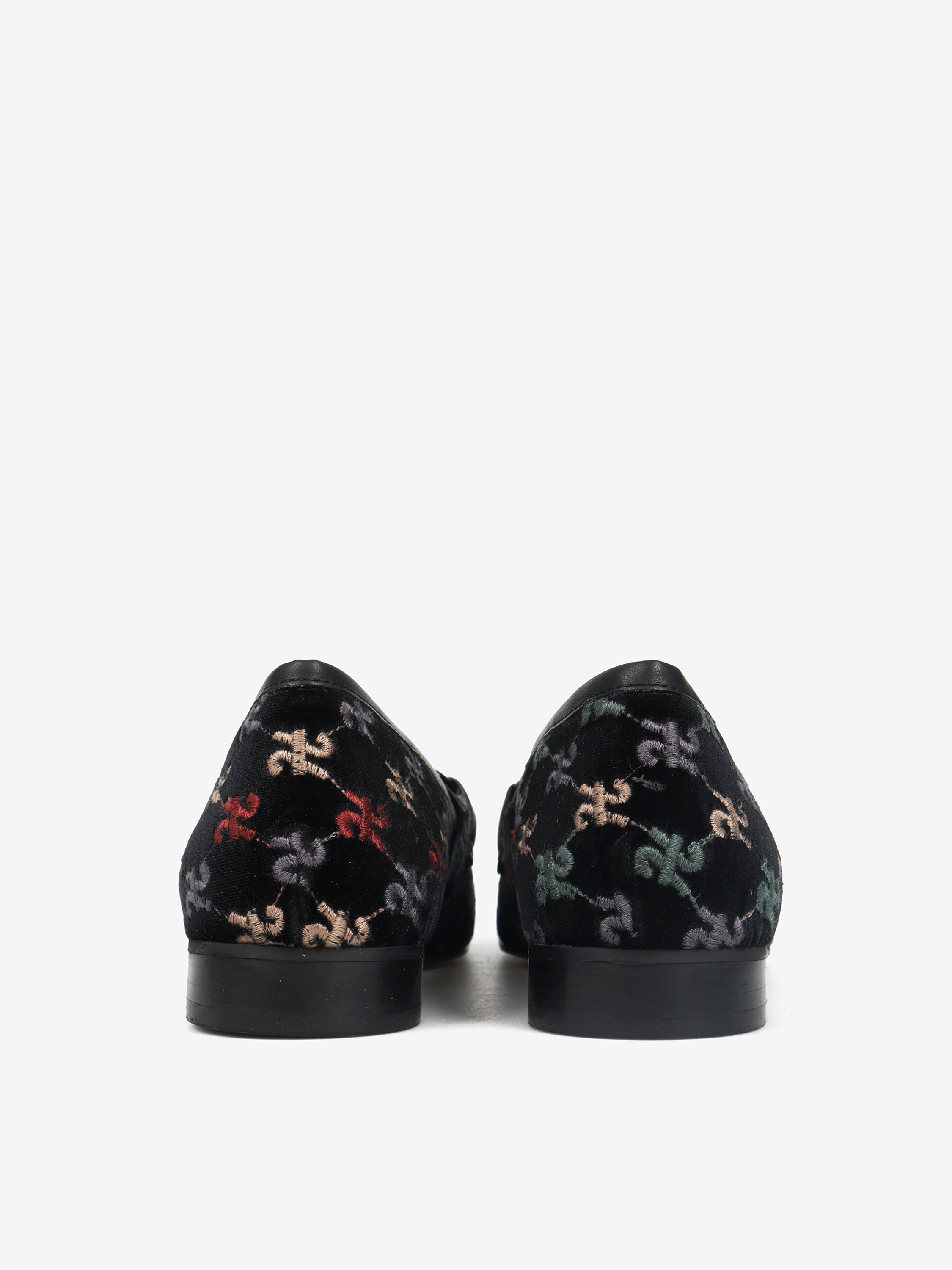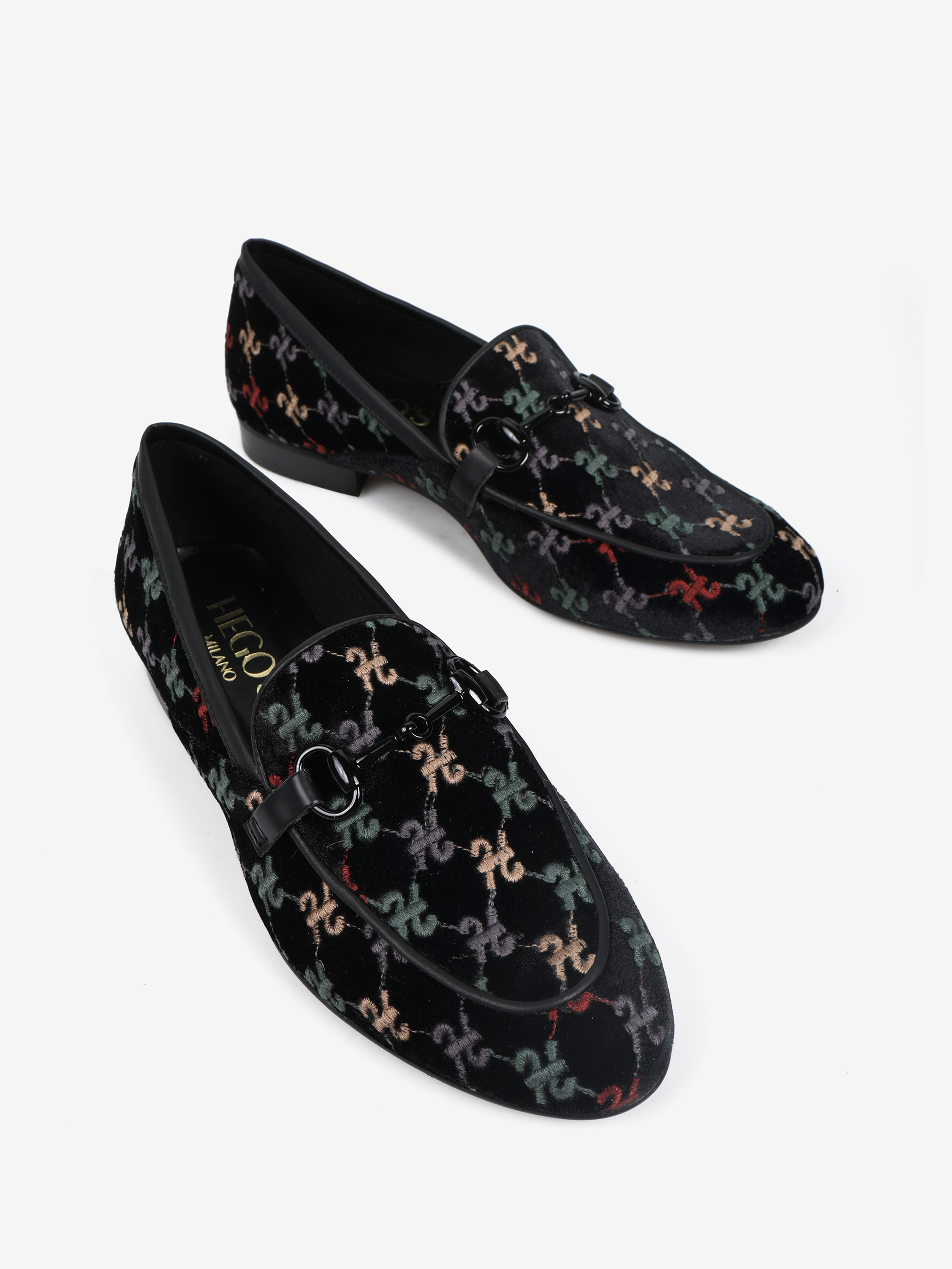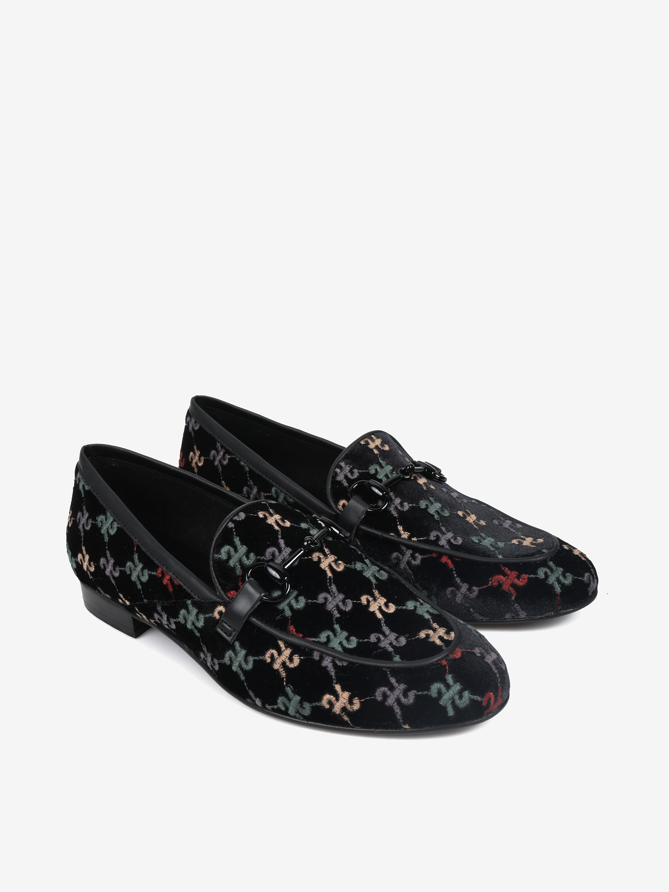 Welurowe mokasyny z haftowanym monogramem. Czarna lamówka i ozdobne, metalowe wędzidło.