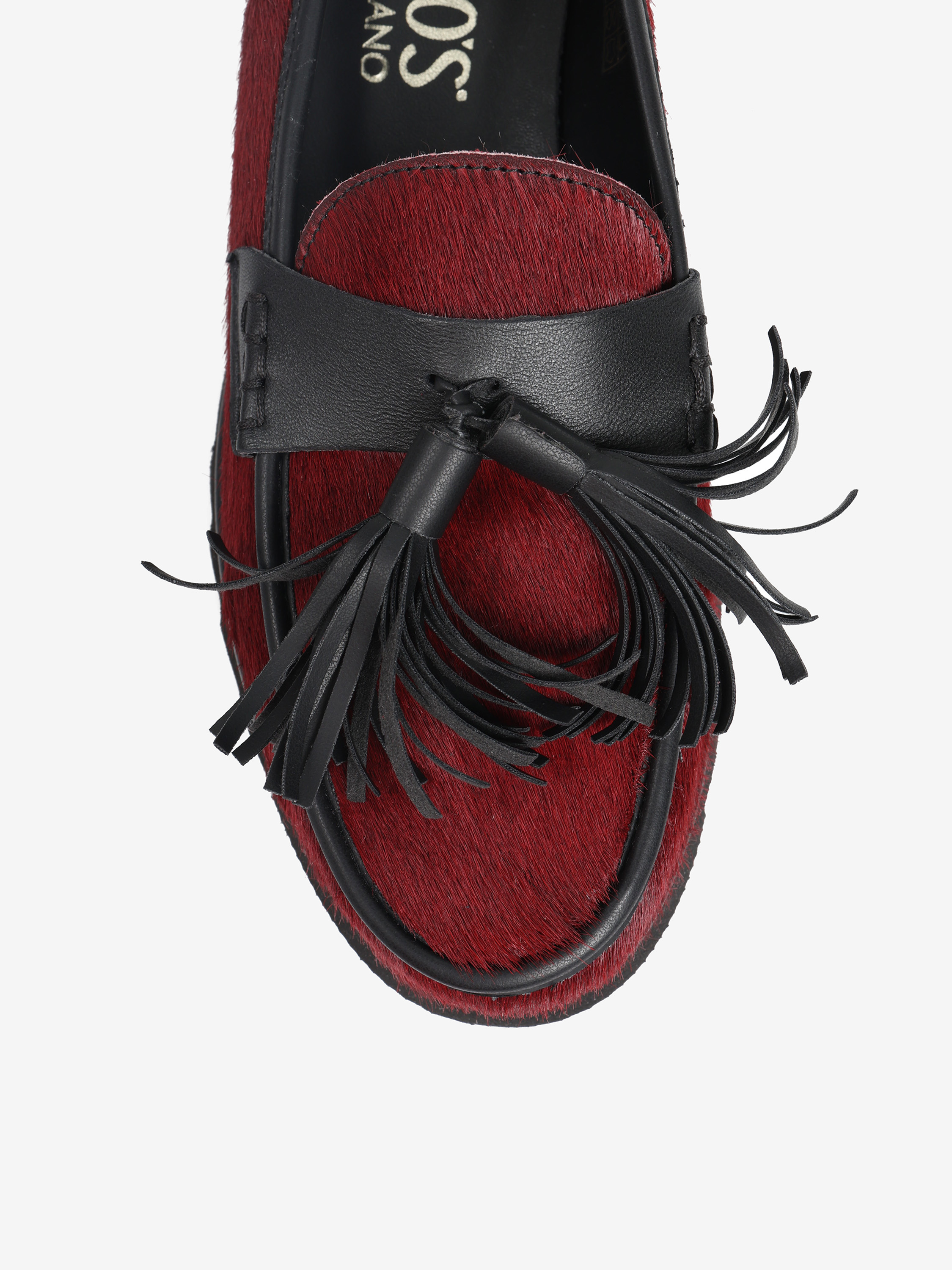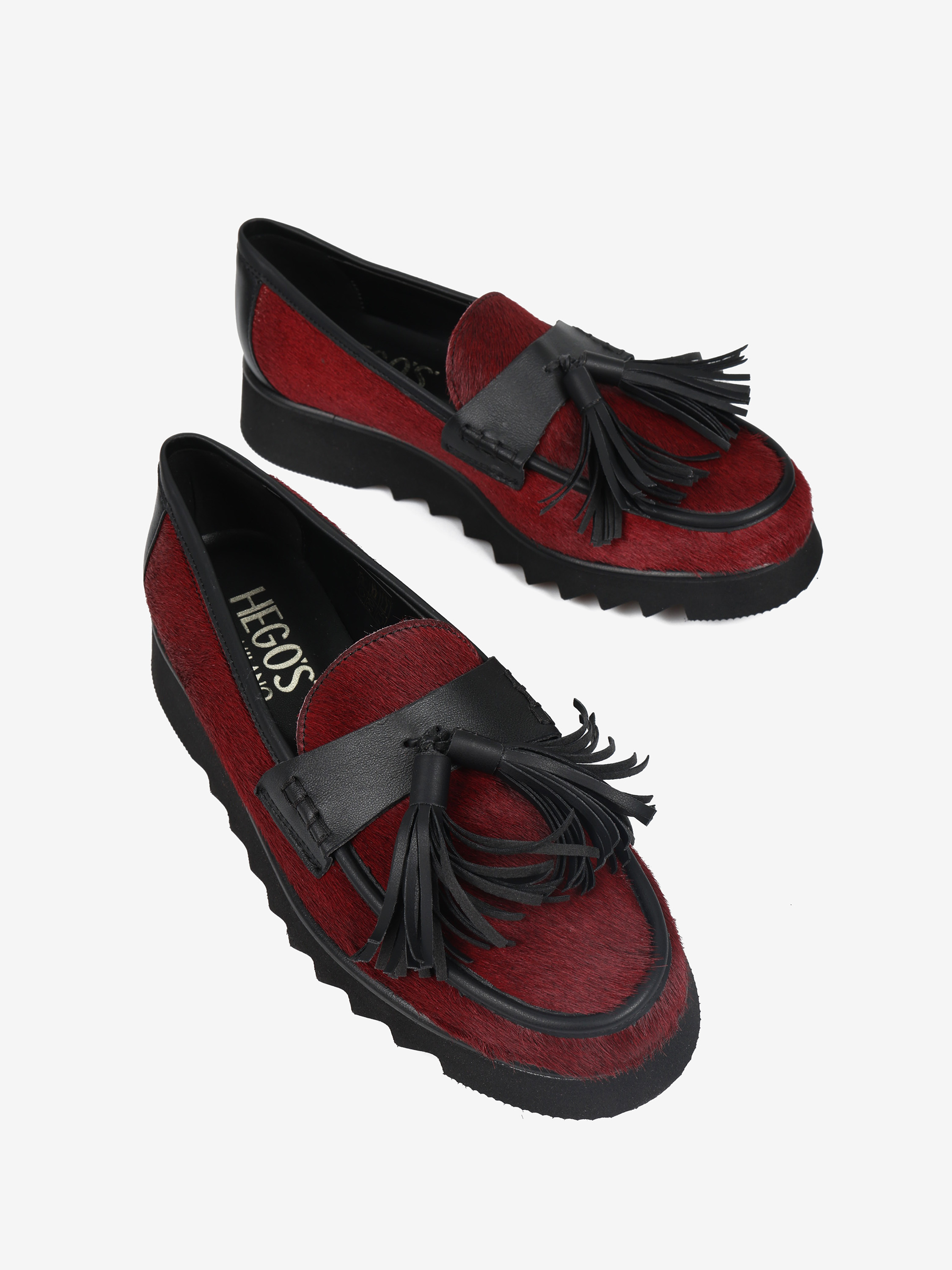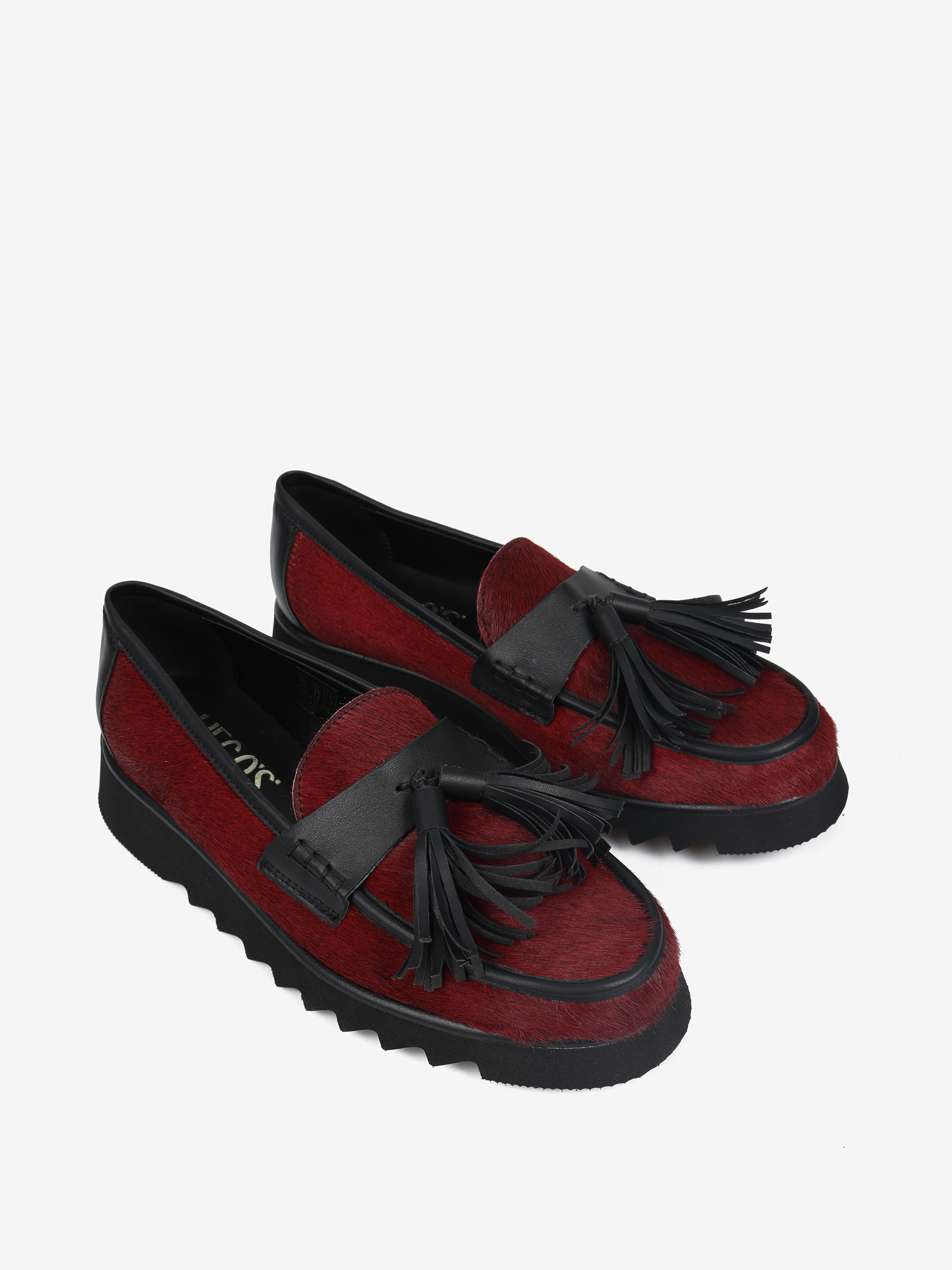 Bordowe mokasyny na efektownej podeszwie wykonane z naturalnej skóry z włosiem. Ozdobna patka z frędzlami.