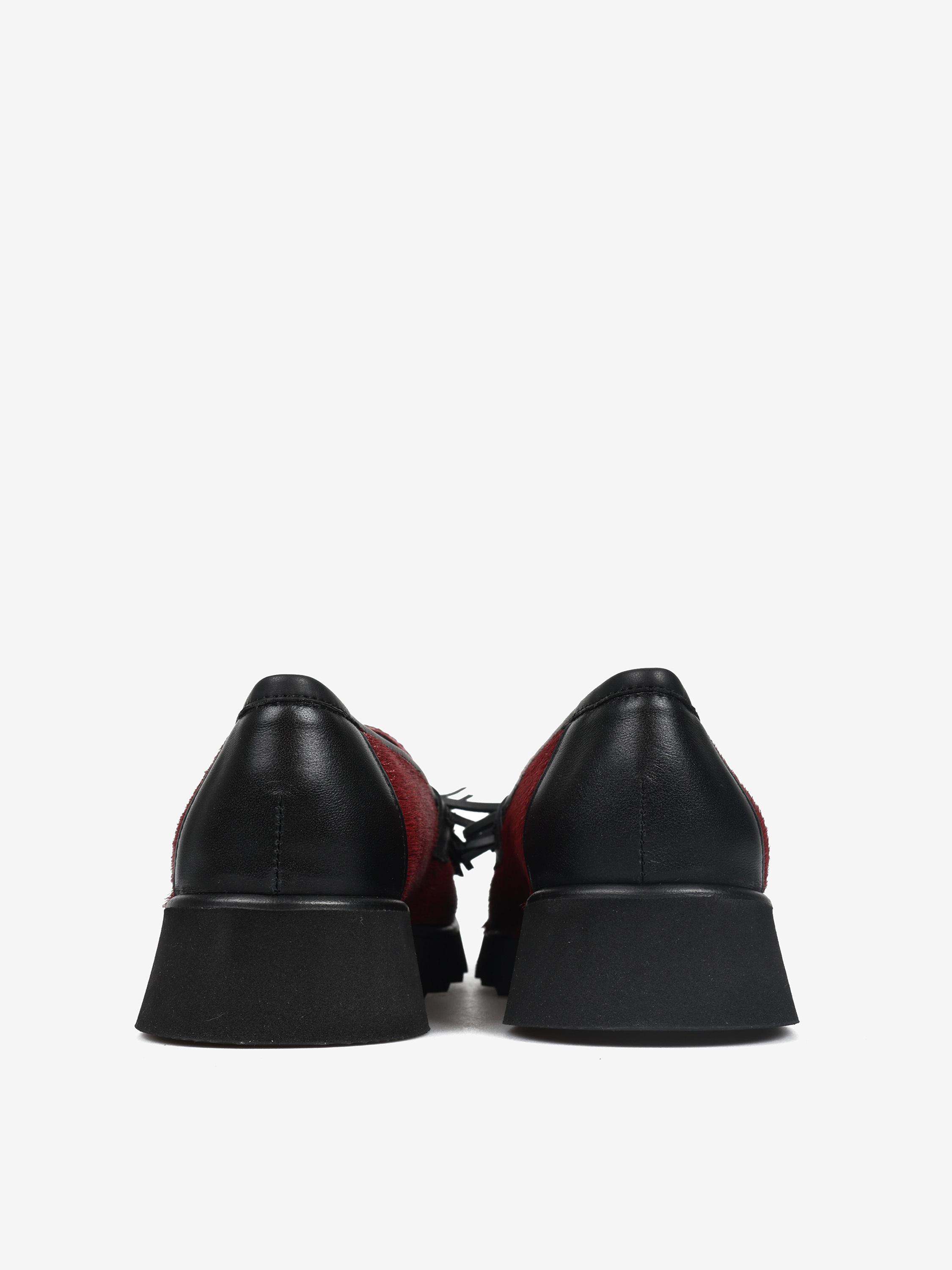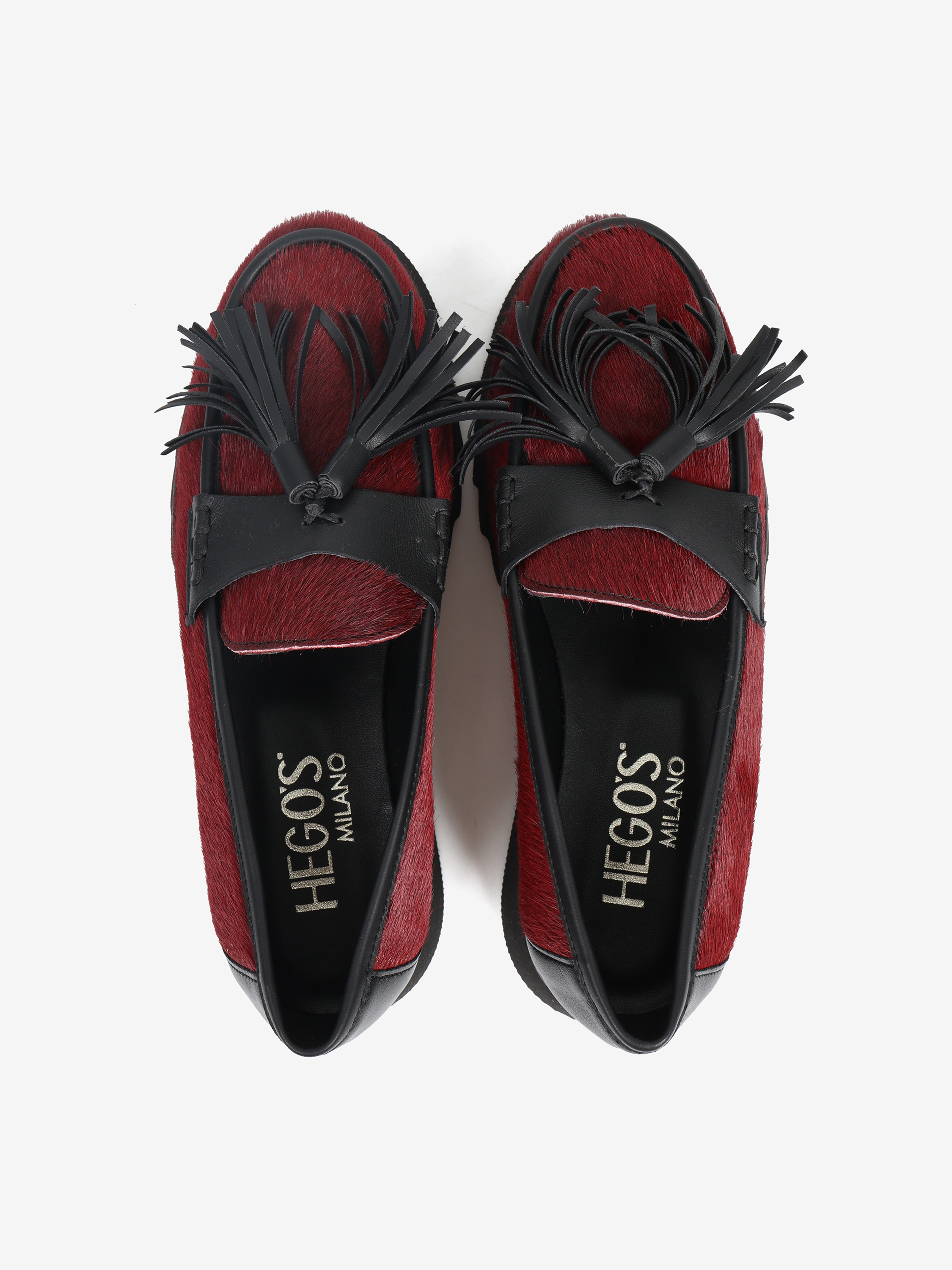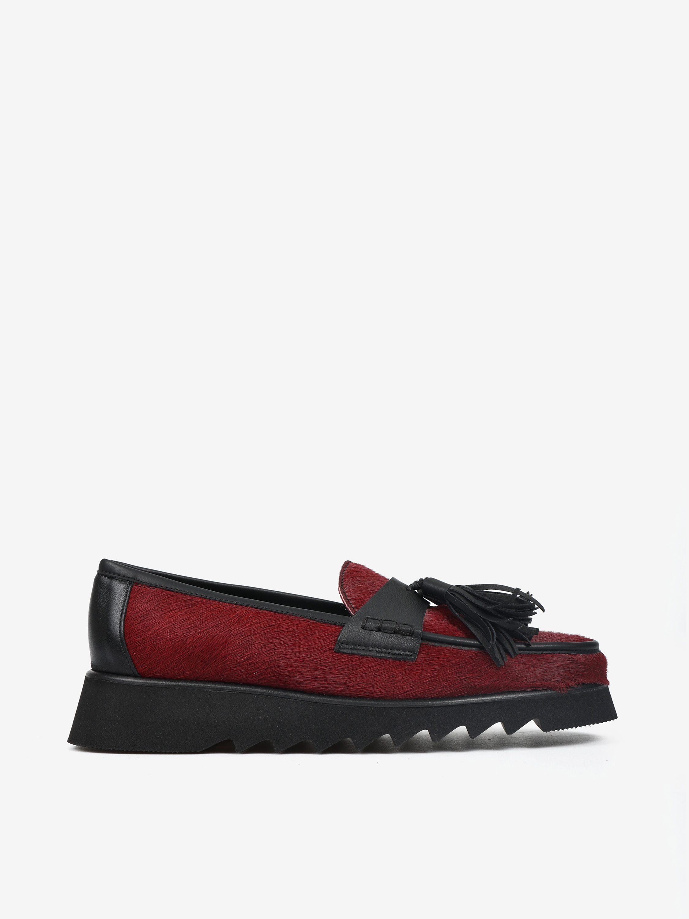 Bordowe mokasyny na efektownej podeszwie wykonane z naturalnej skóry z włosiem. Ozdobna patka z frędzlami.