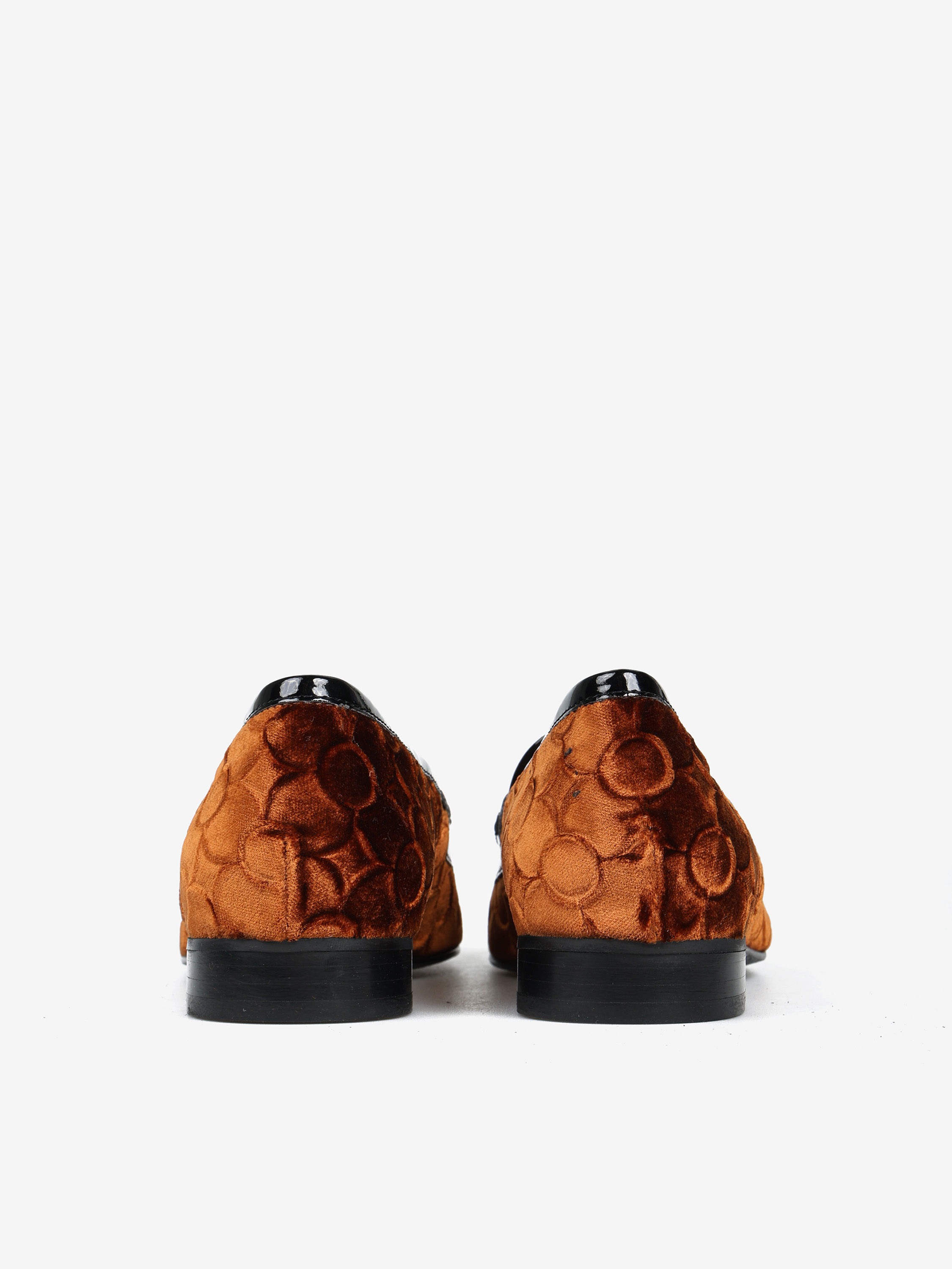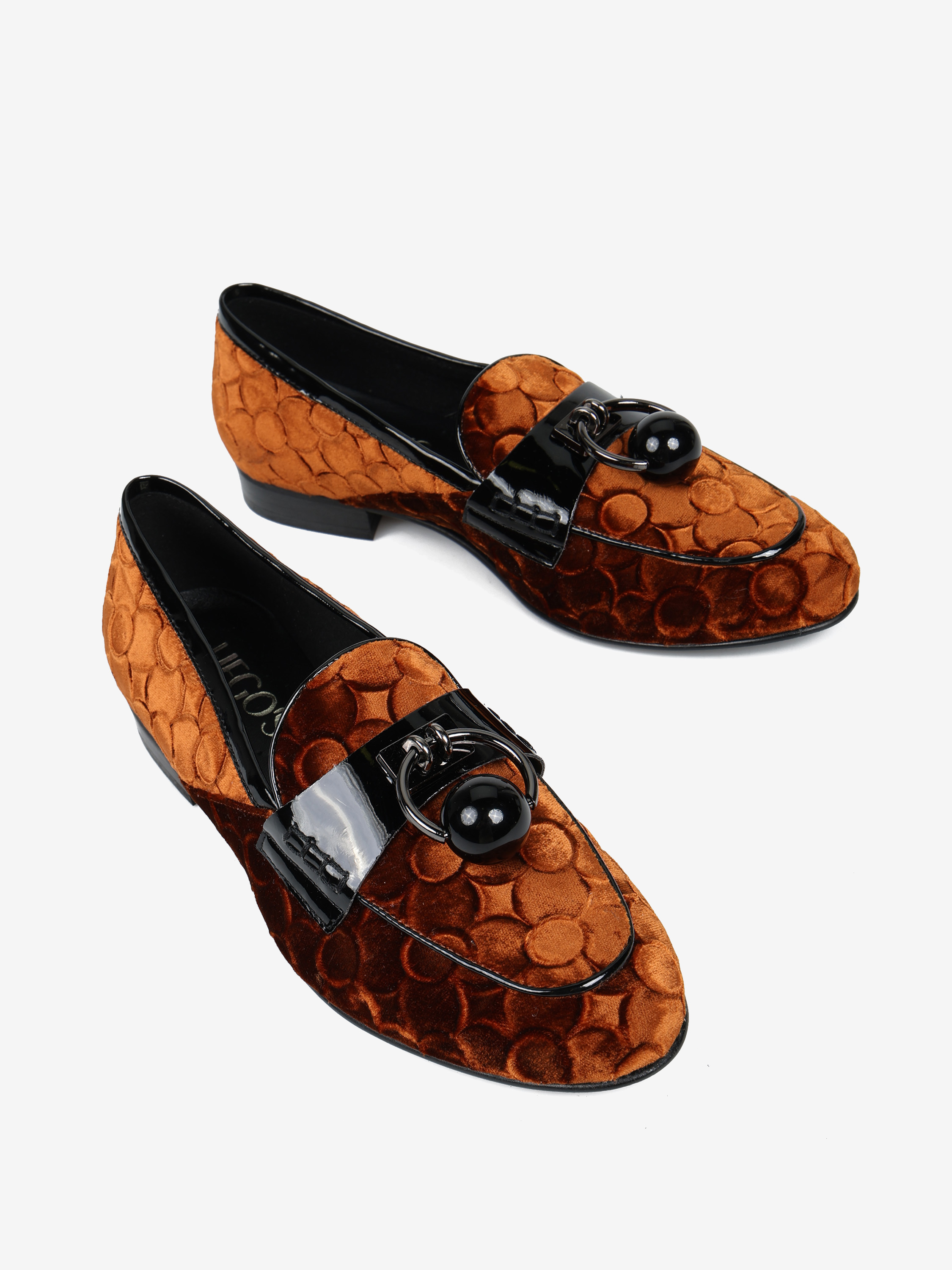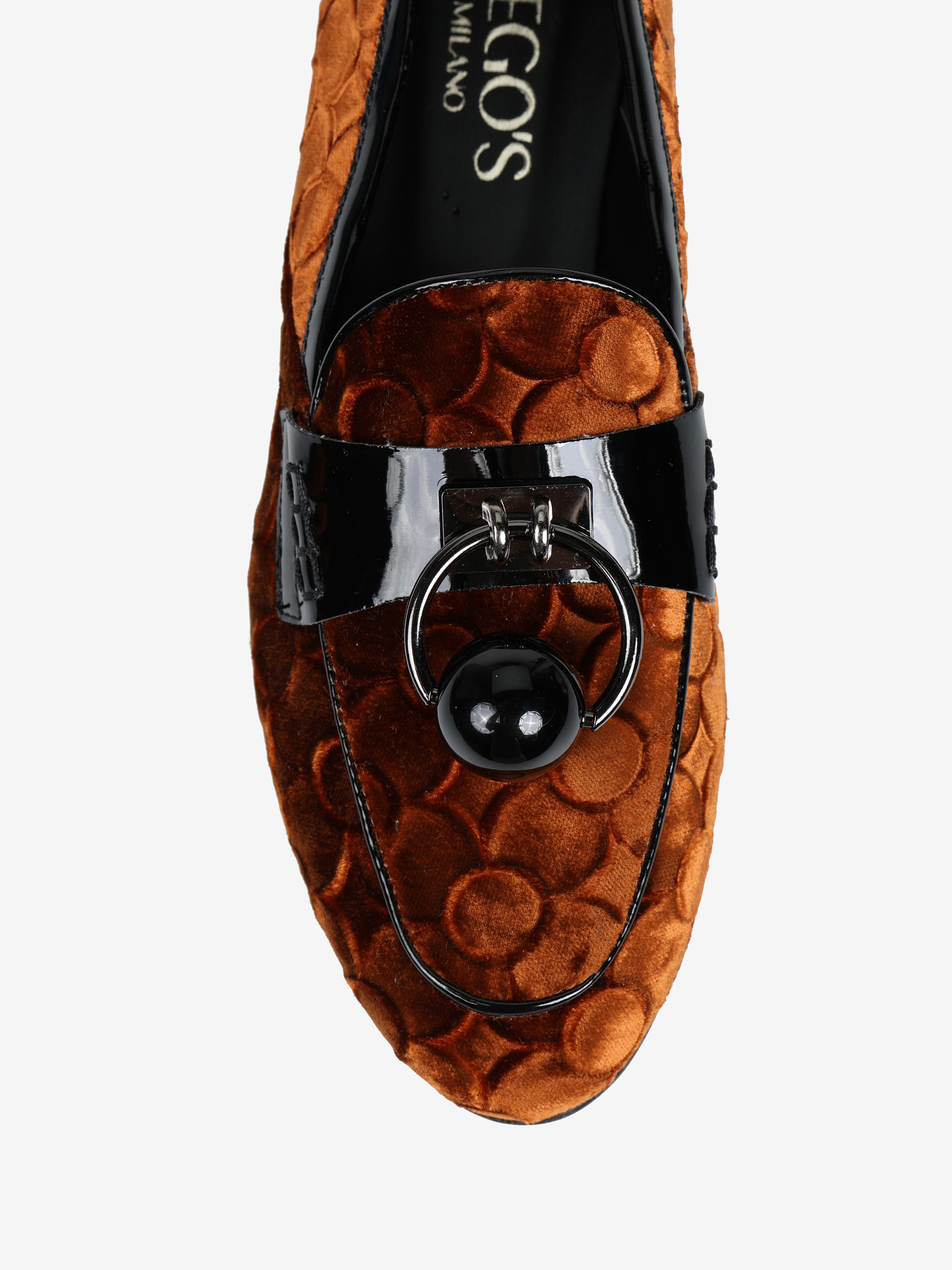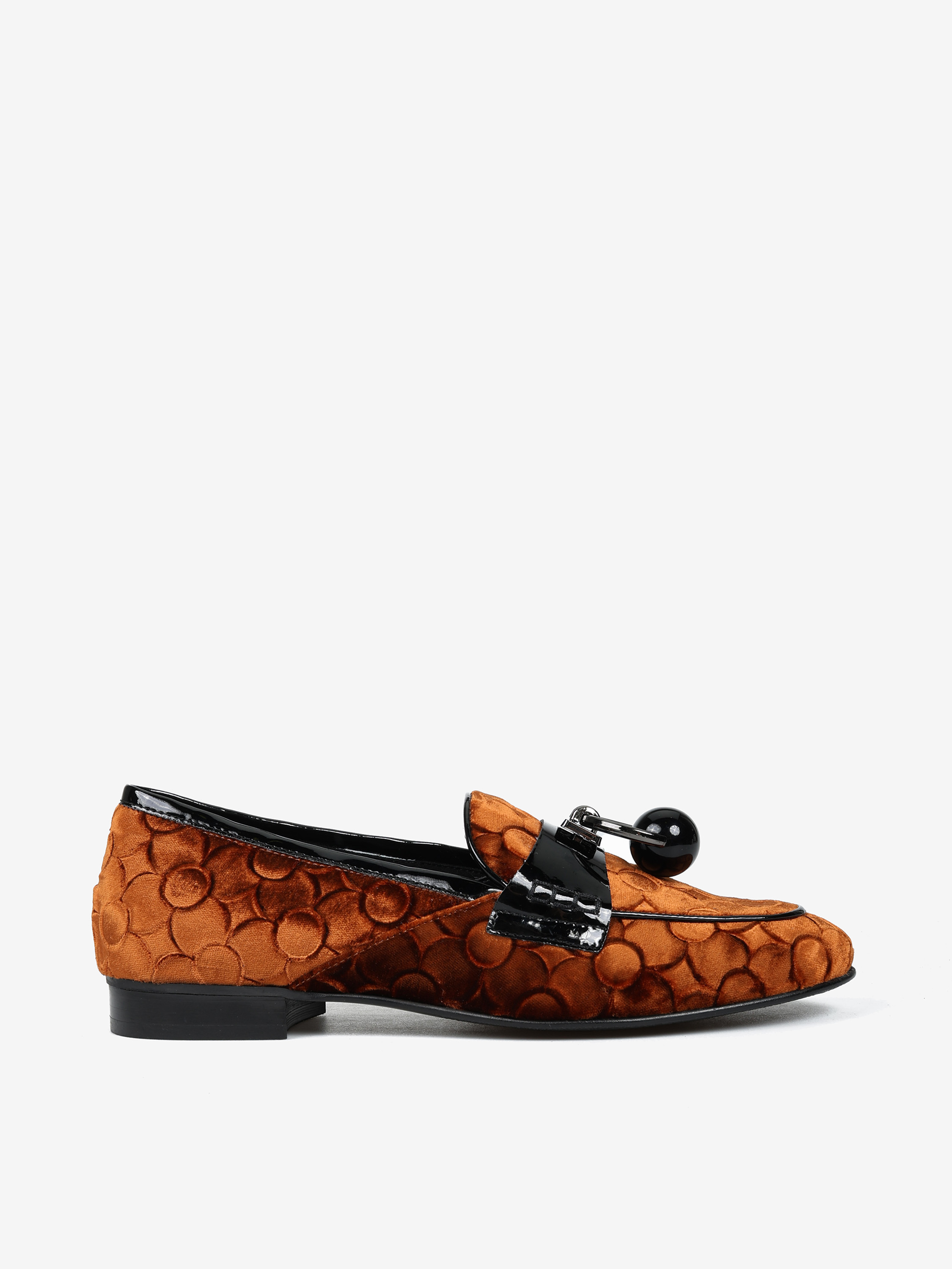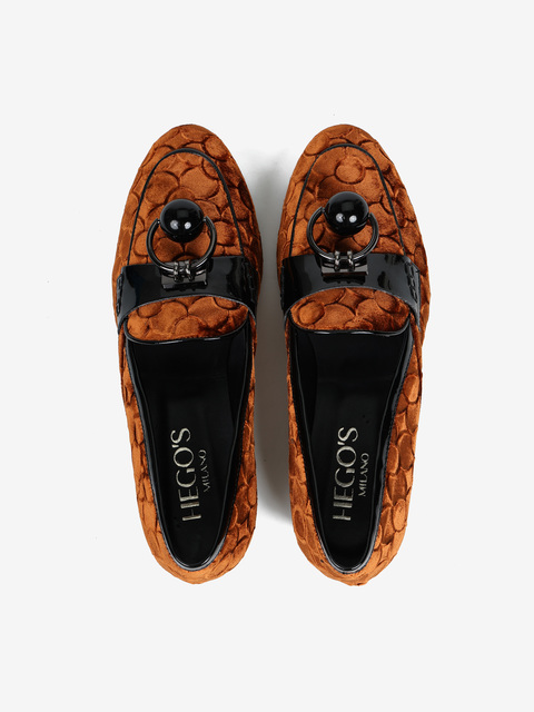 Mokasyny z tłoczonego weluru z wysokopolerowaną patką. Biżuteryjna aplikacja z czarną perłą.