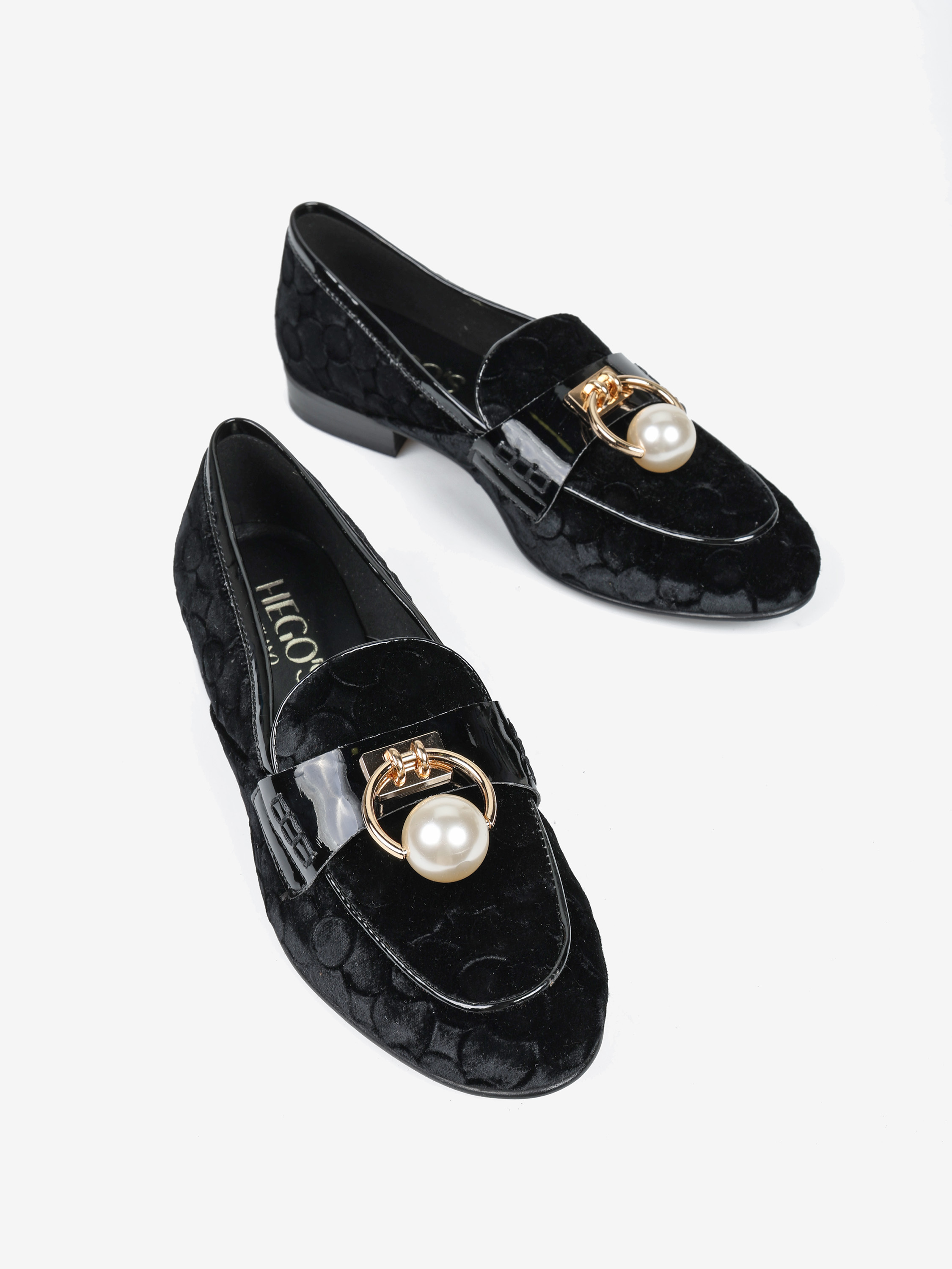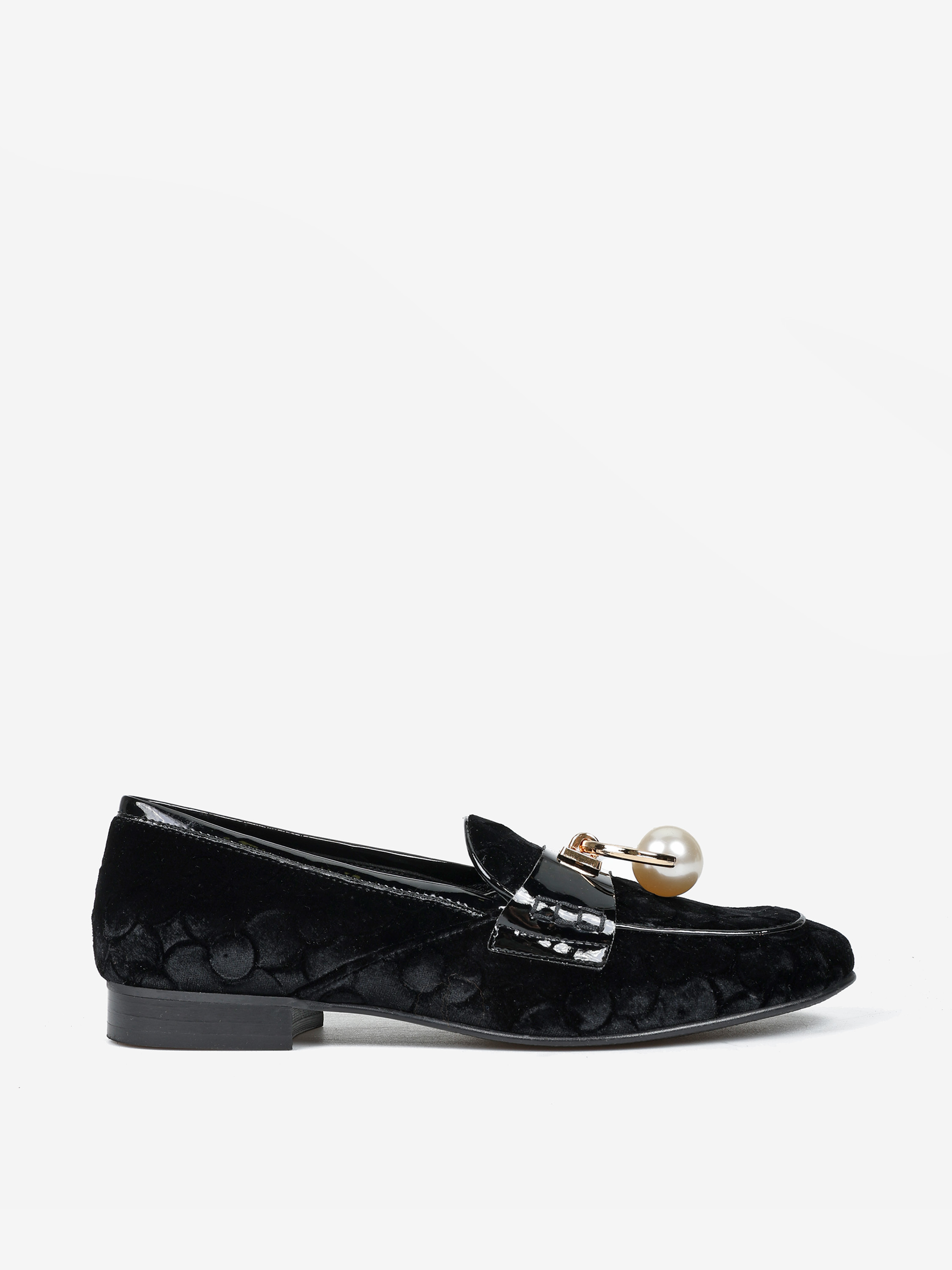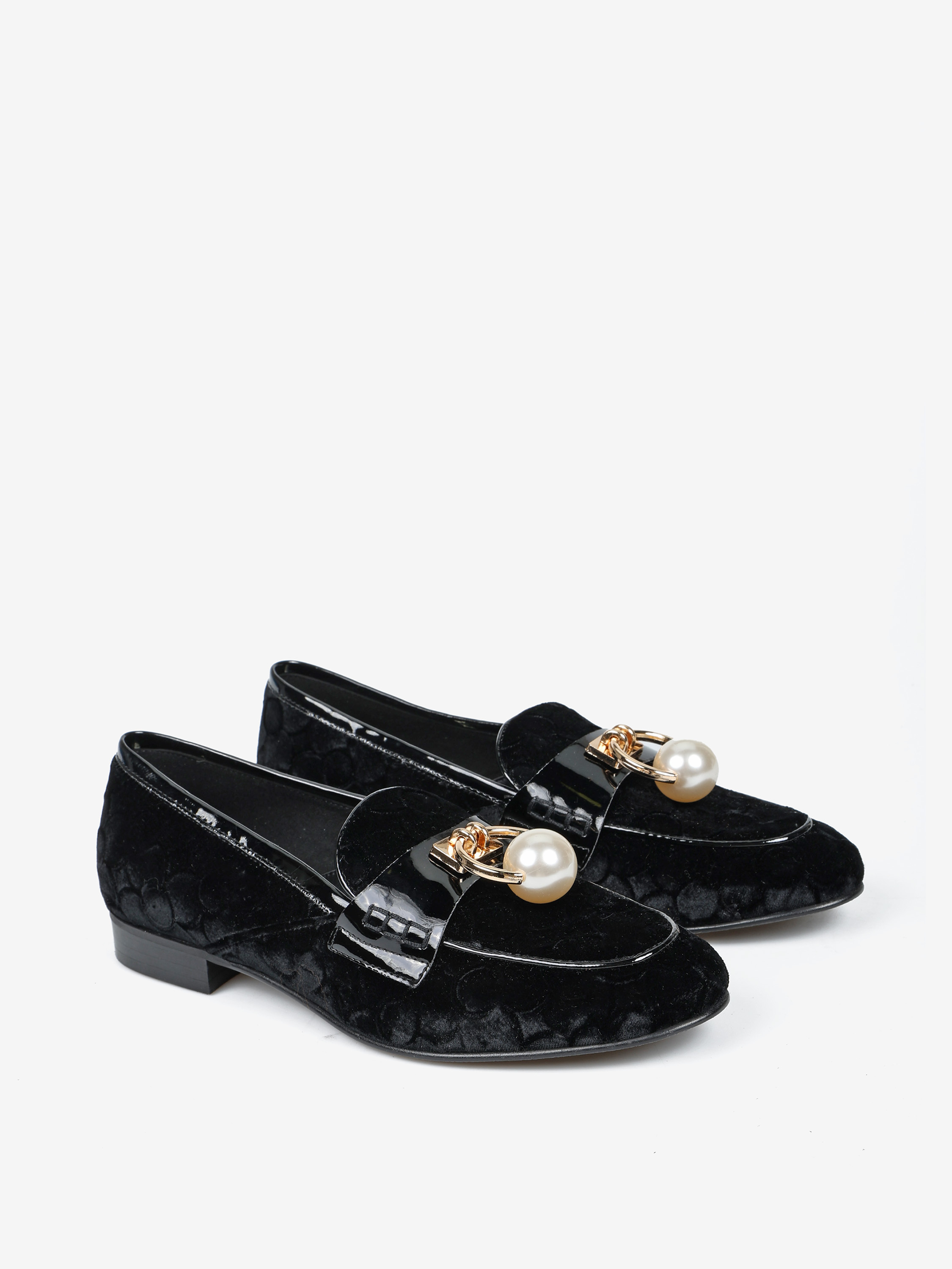 Mokasyny z tłoczonego weluru z wysokopolerowaną patką. Biżuteryjna aplikacja z perłą.
