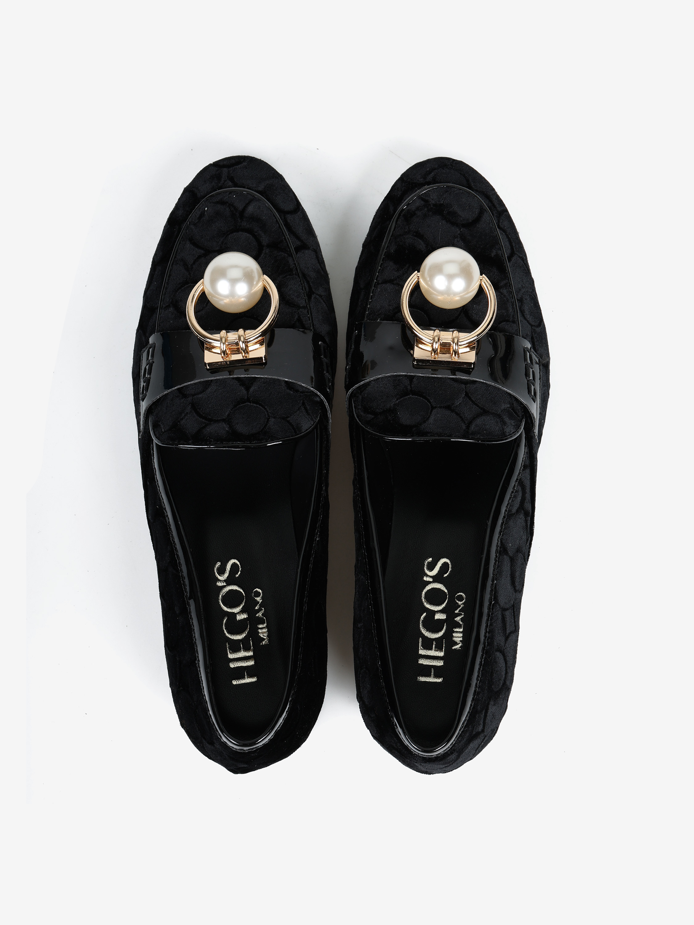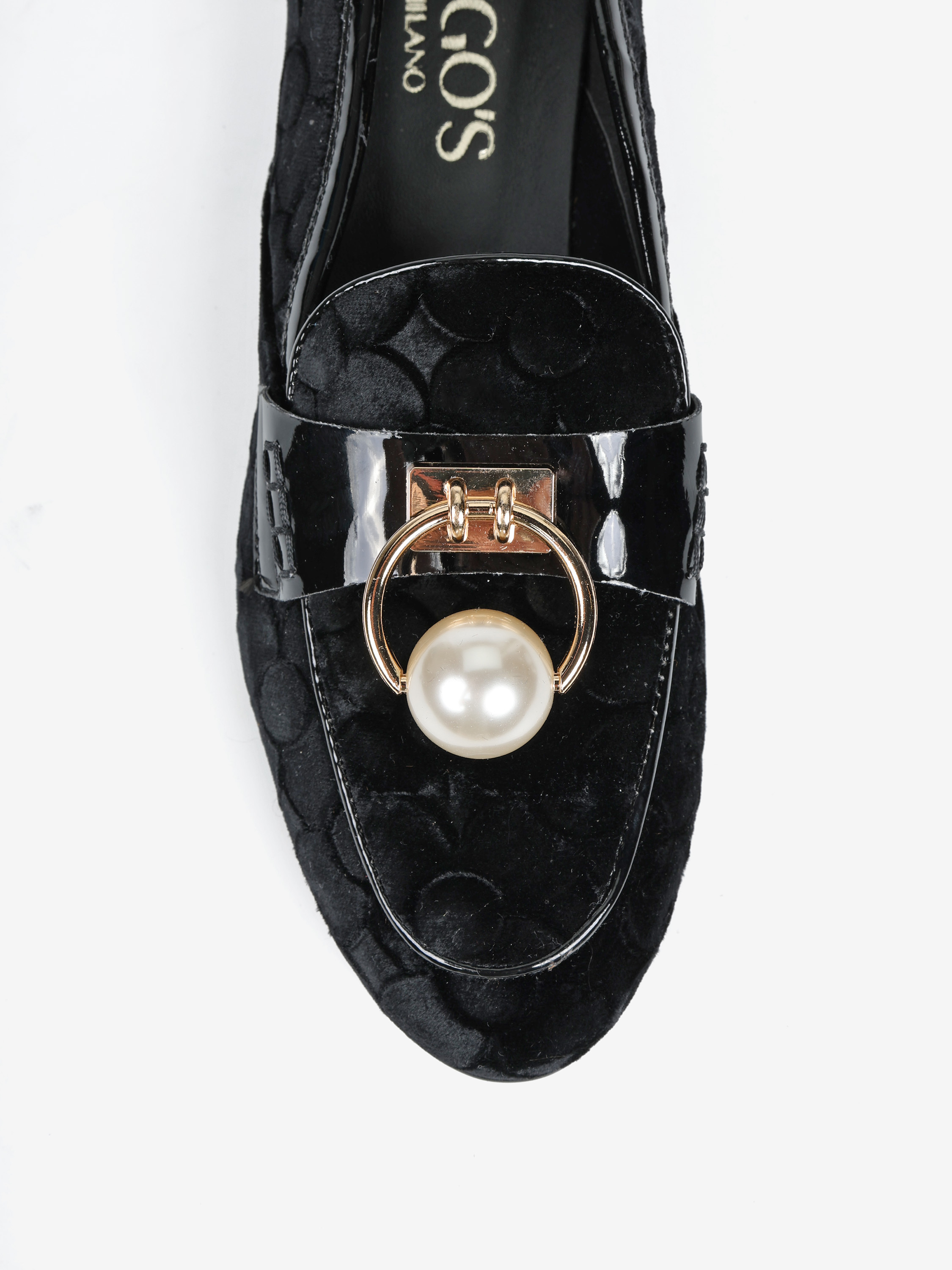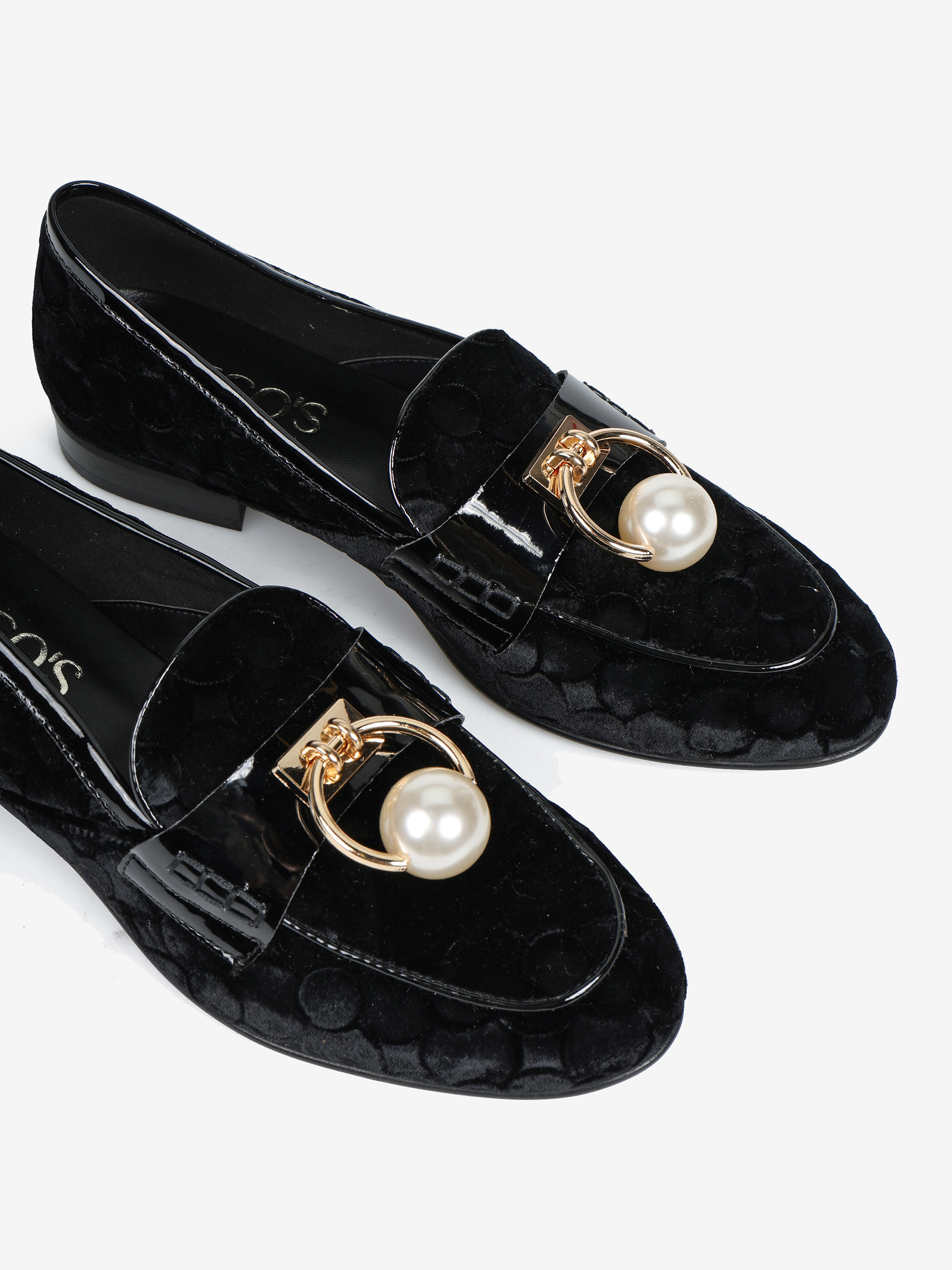 Mokasyny z tłoczonego weluru z wysokopolerowaną patką. Biżuteryjna aplikacja z perłą.
