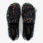 Mokasyny wykończone wielobarwnymi cekinami. Skórzana pięta i patka z frędzlami.
