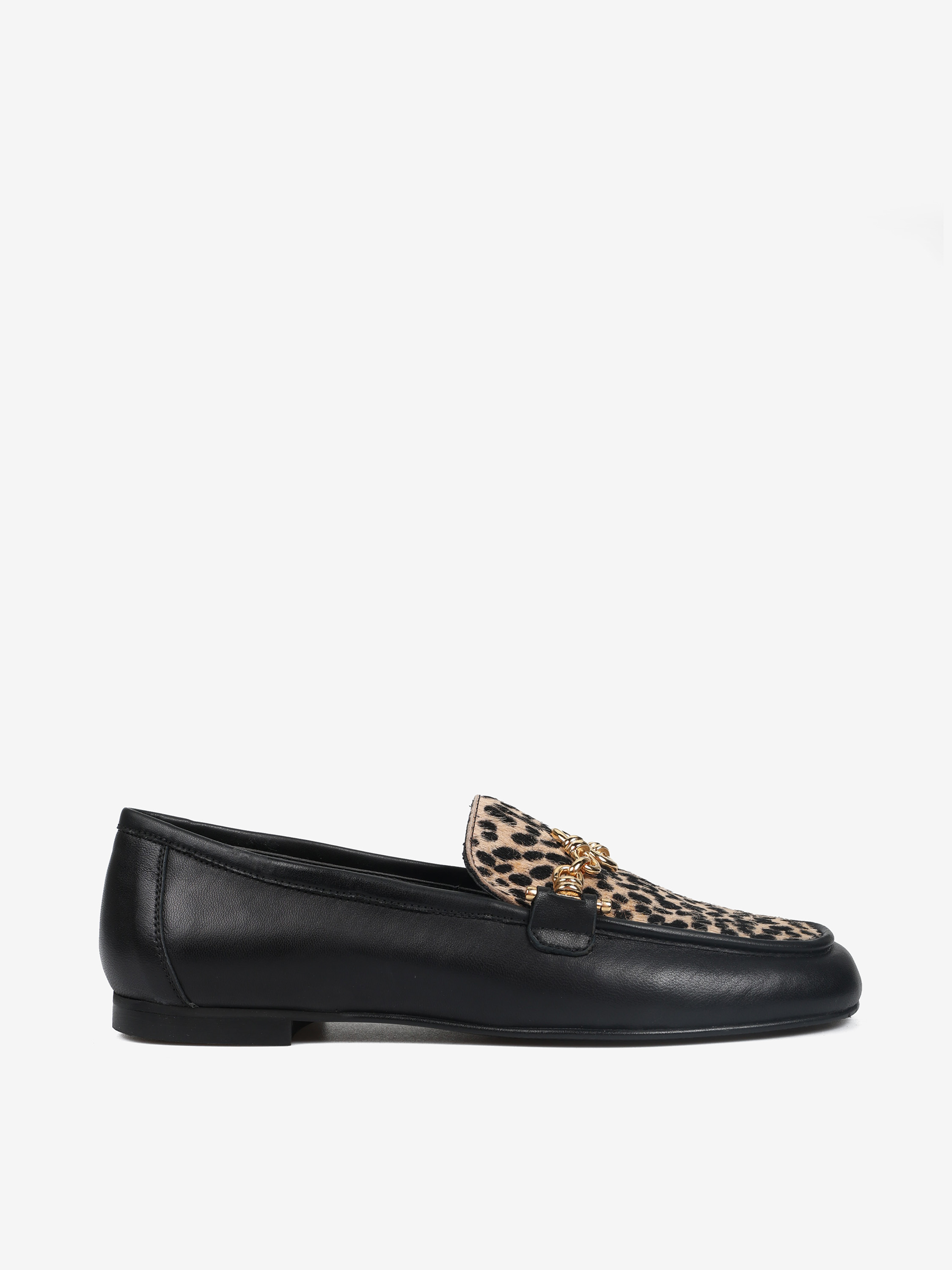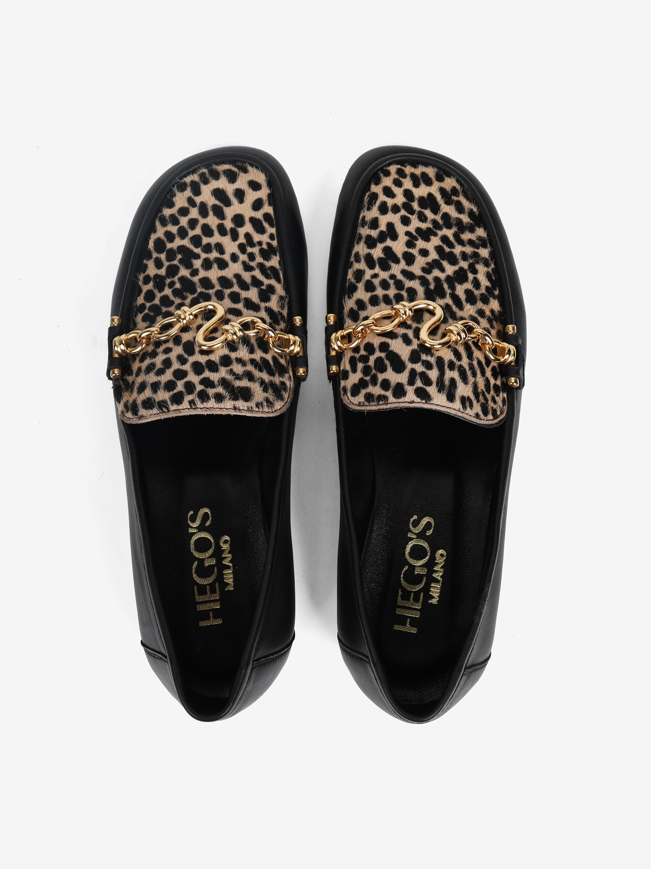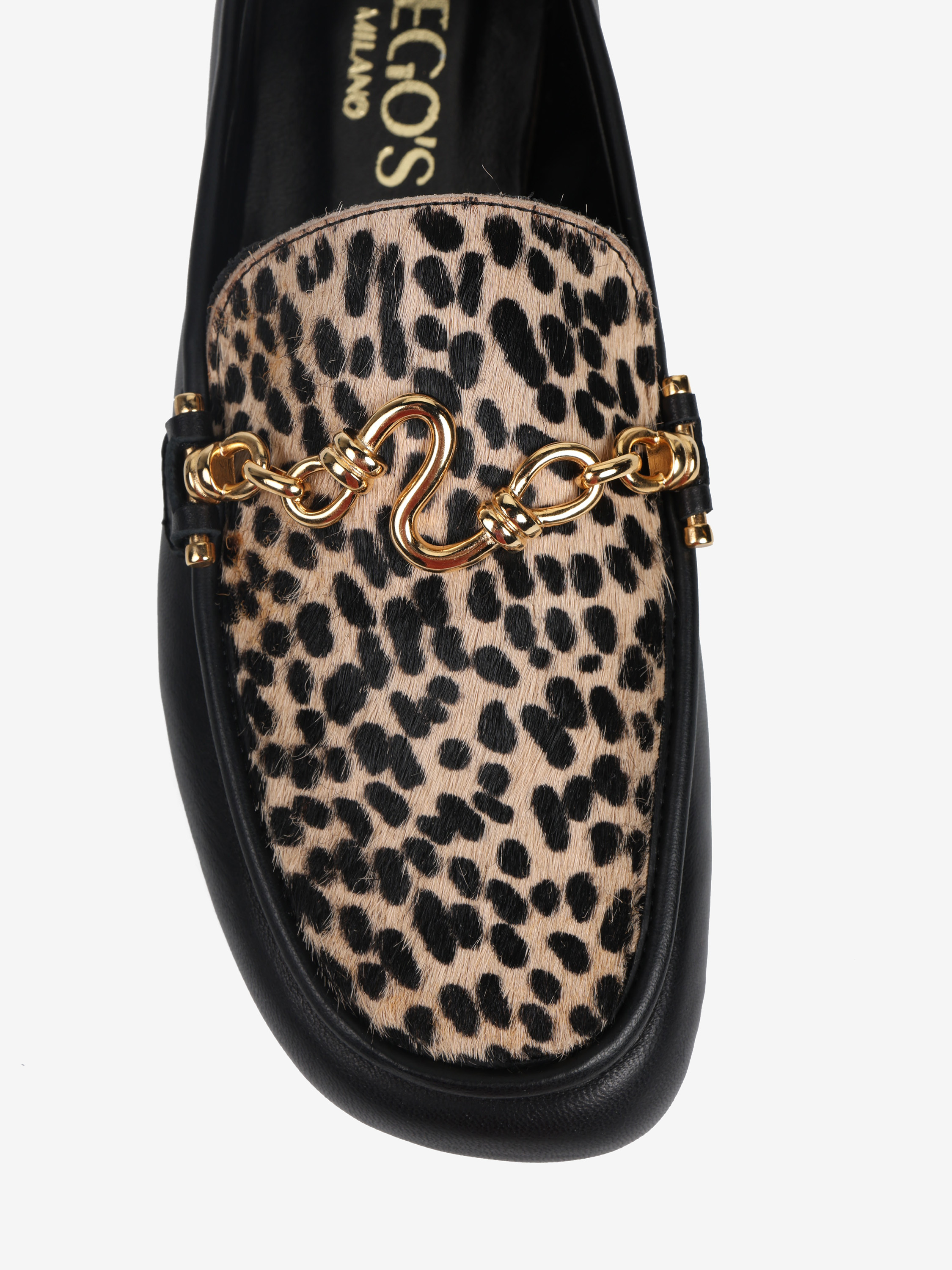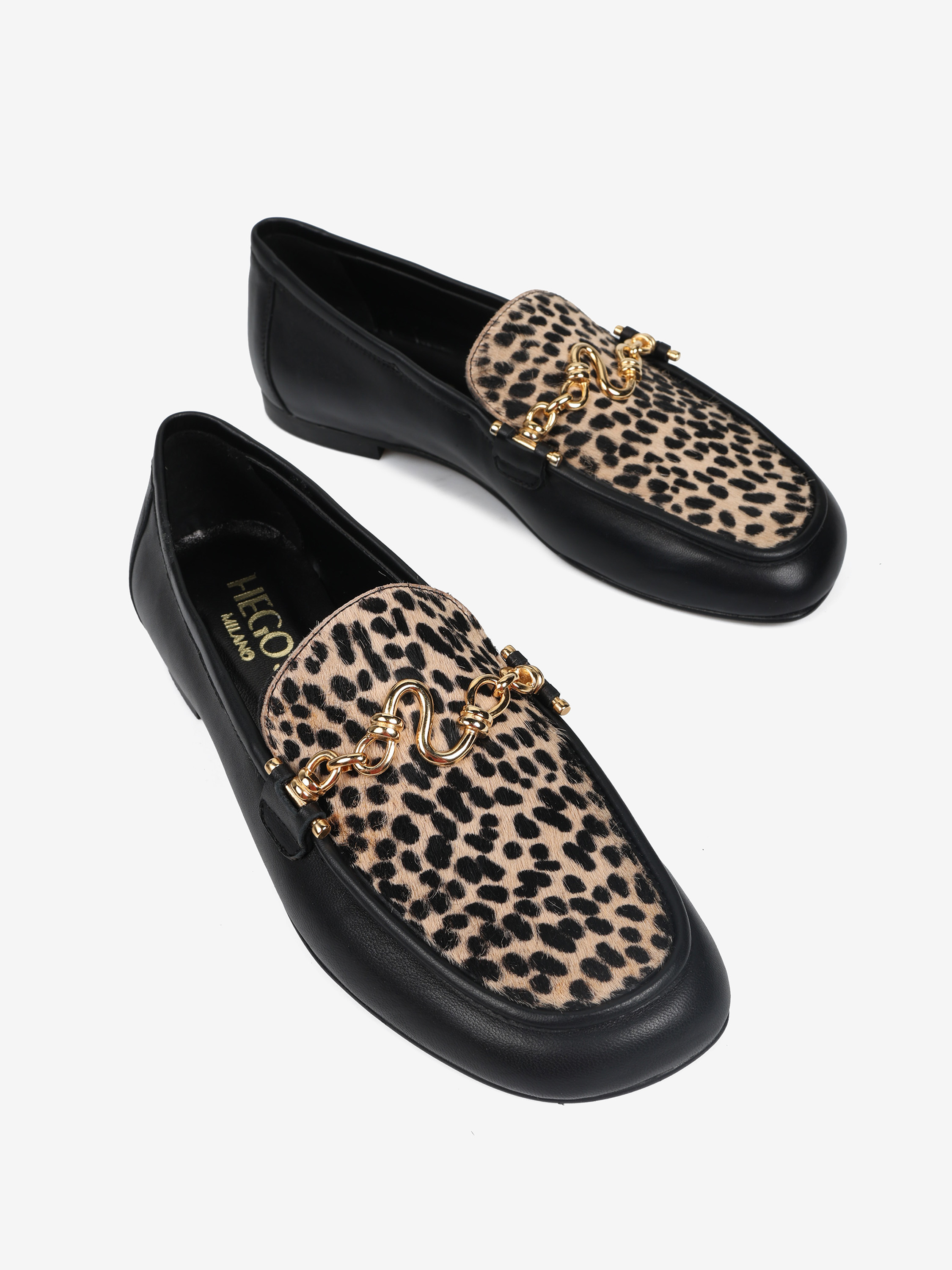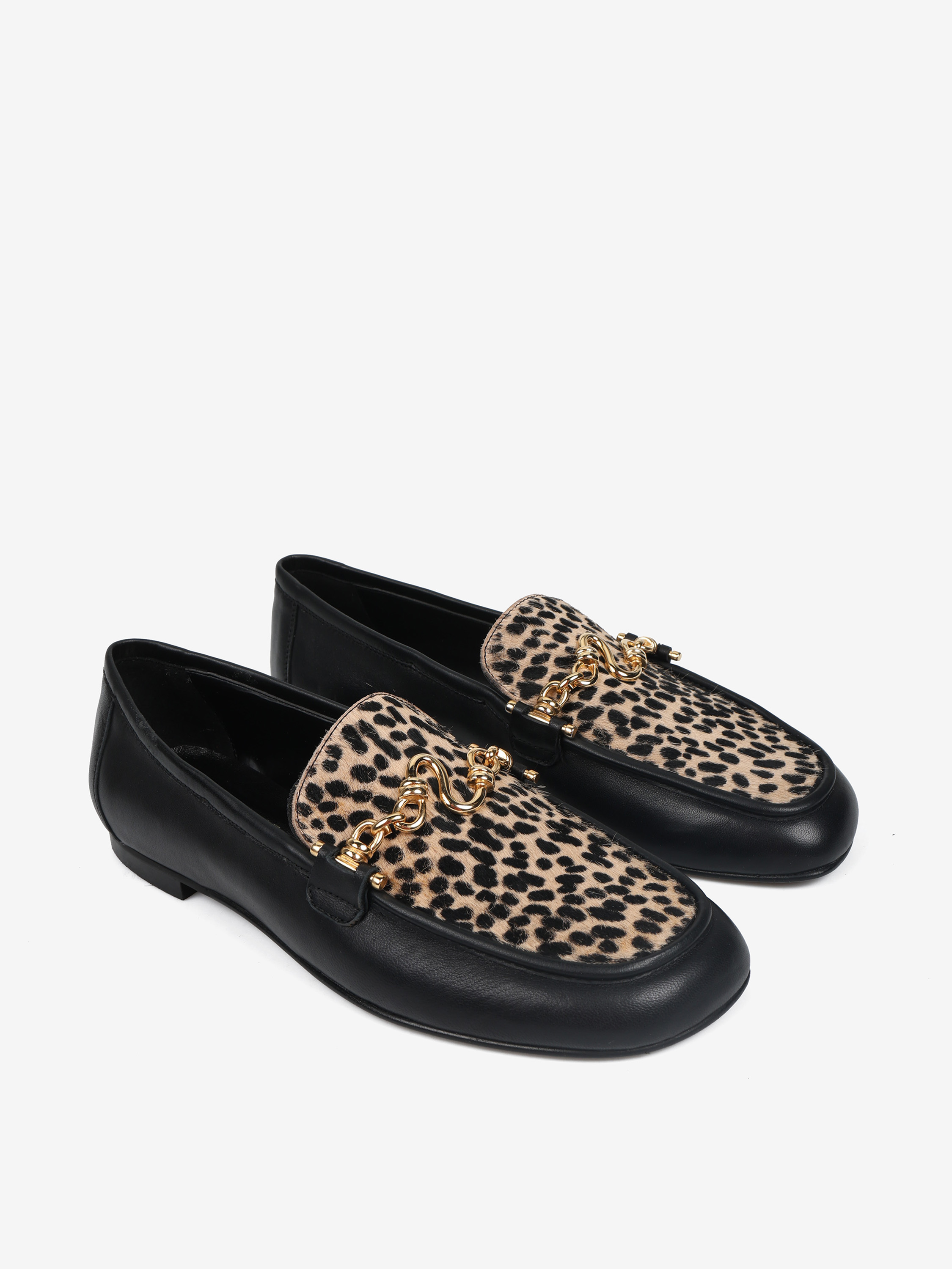 Mokasyny z asymetrycznym noskiem i biżuteryjną aplikacją. Język wykonany z naturalnej skóry z włosiem.