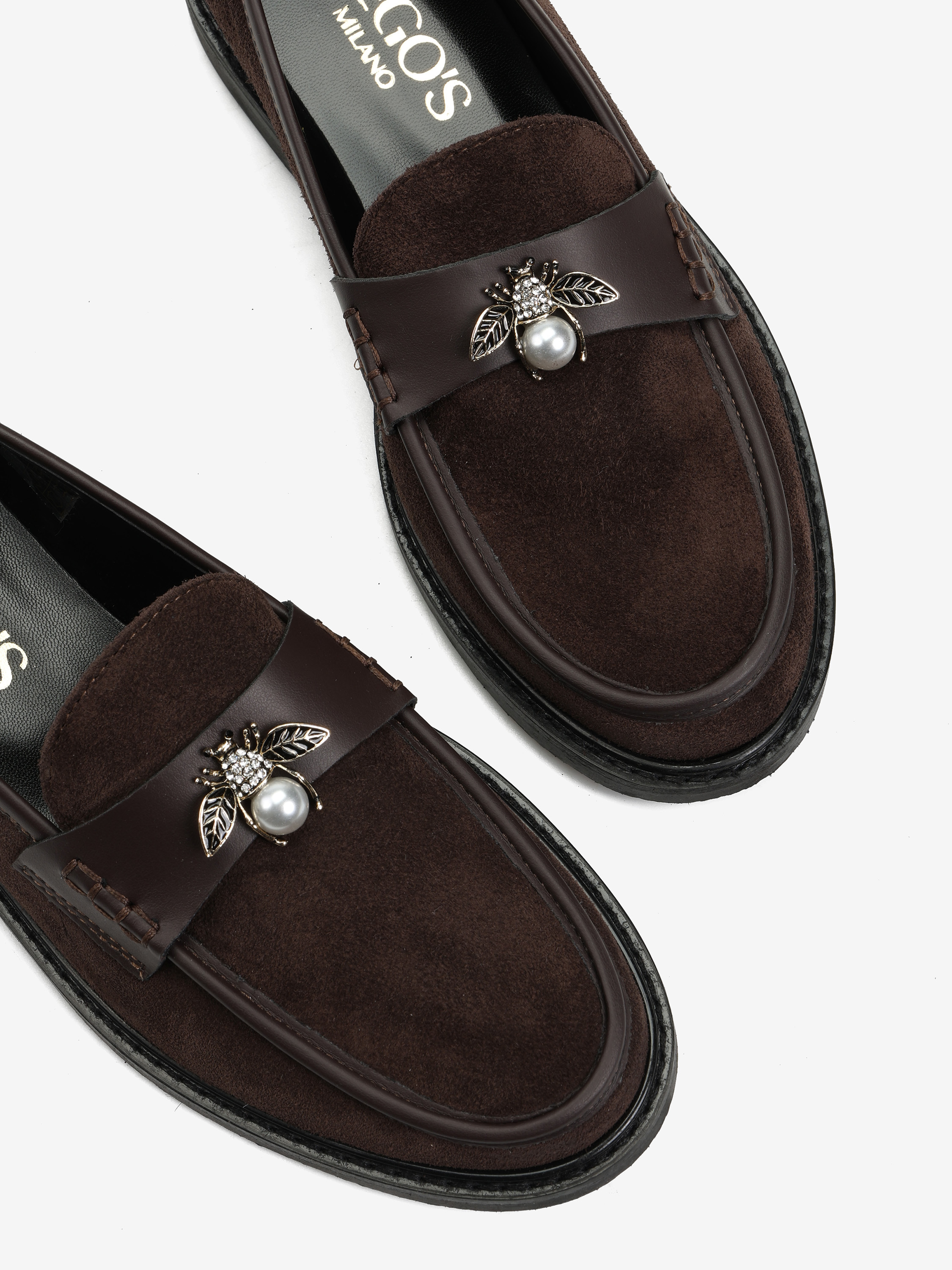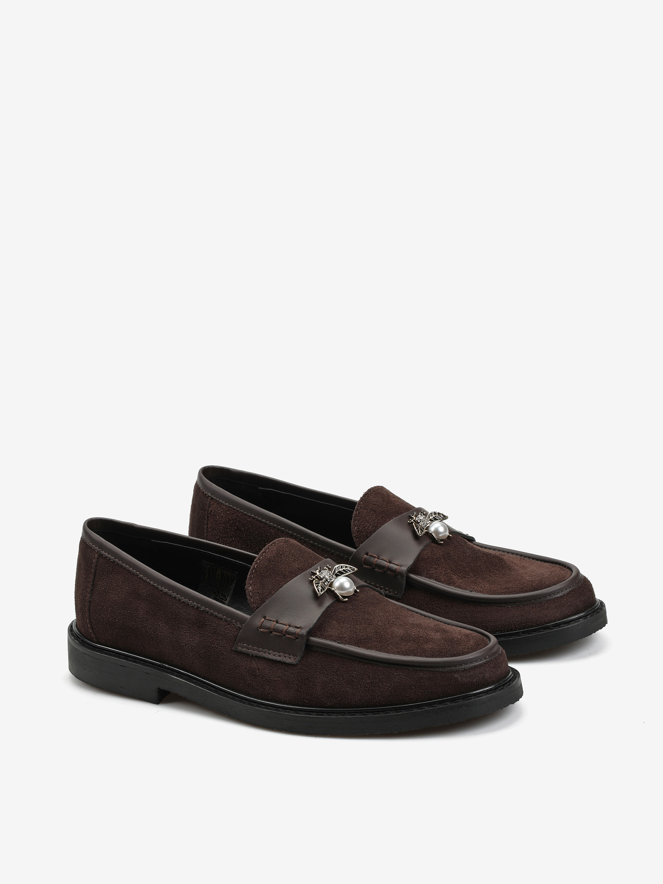 Zamszowe, czekoladowobrązowe mokasyny z lamówką i patką ze skóry licowej. Biżuteryjna aplikacja.