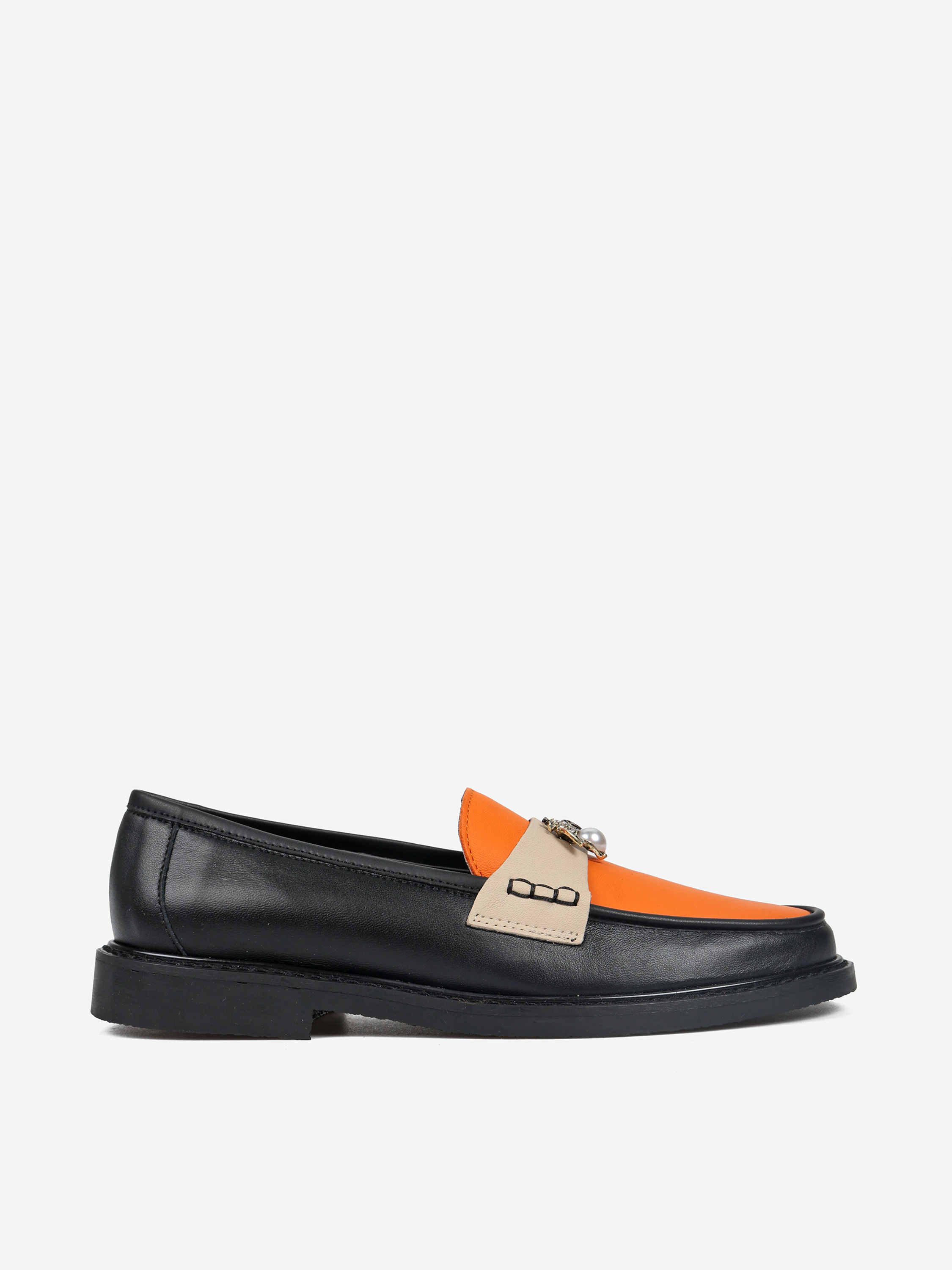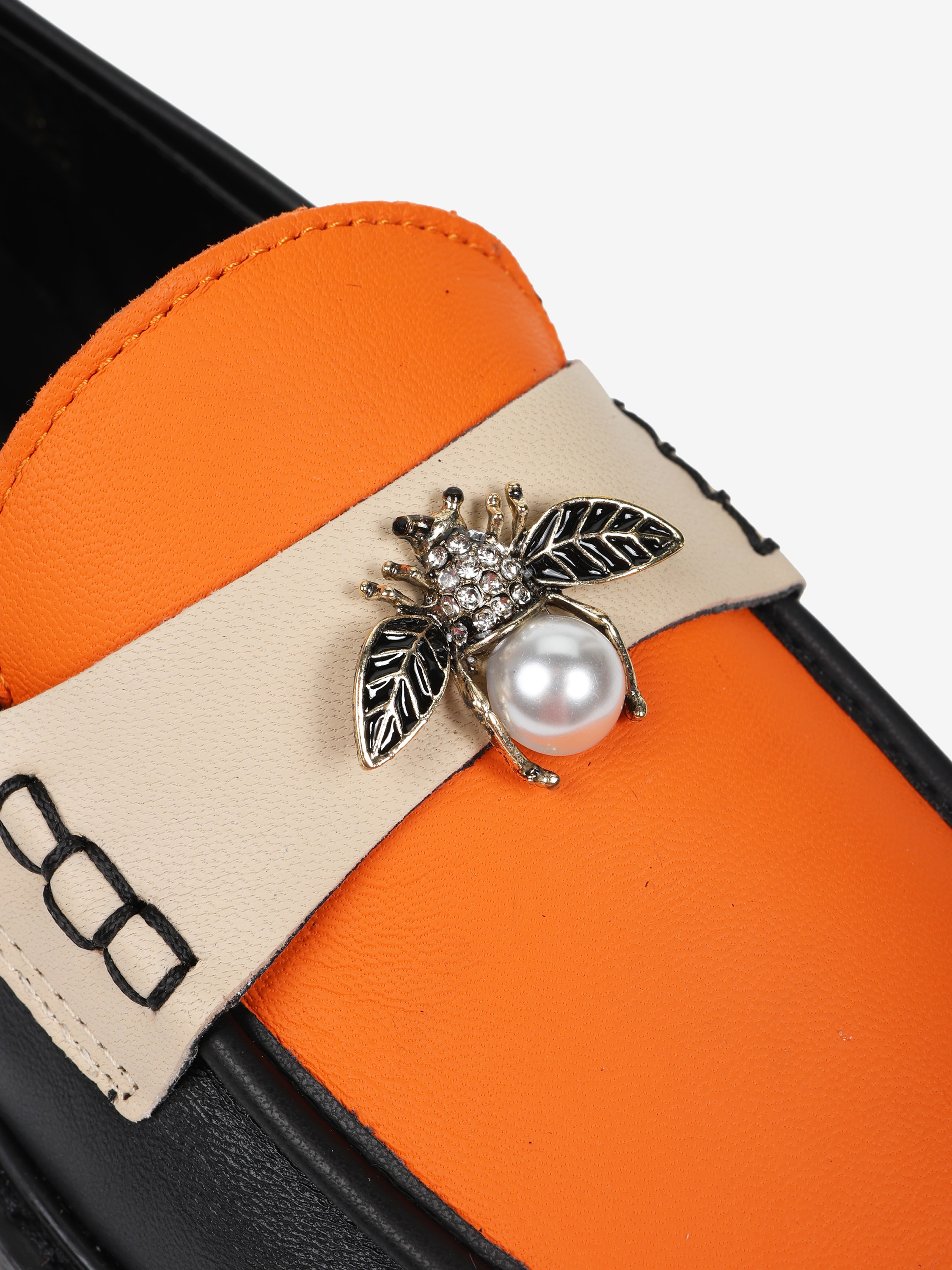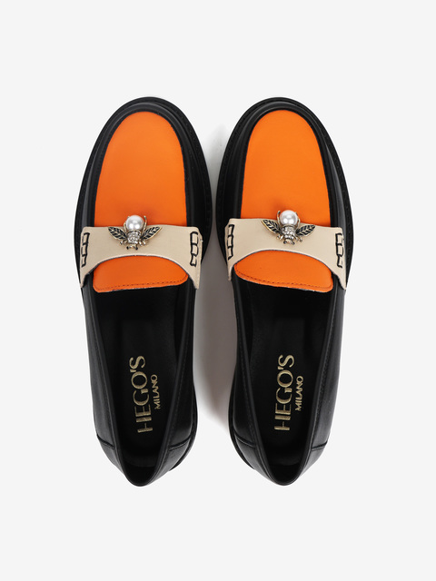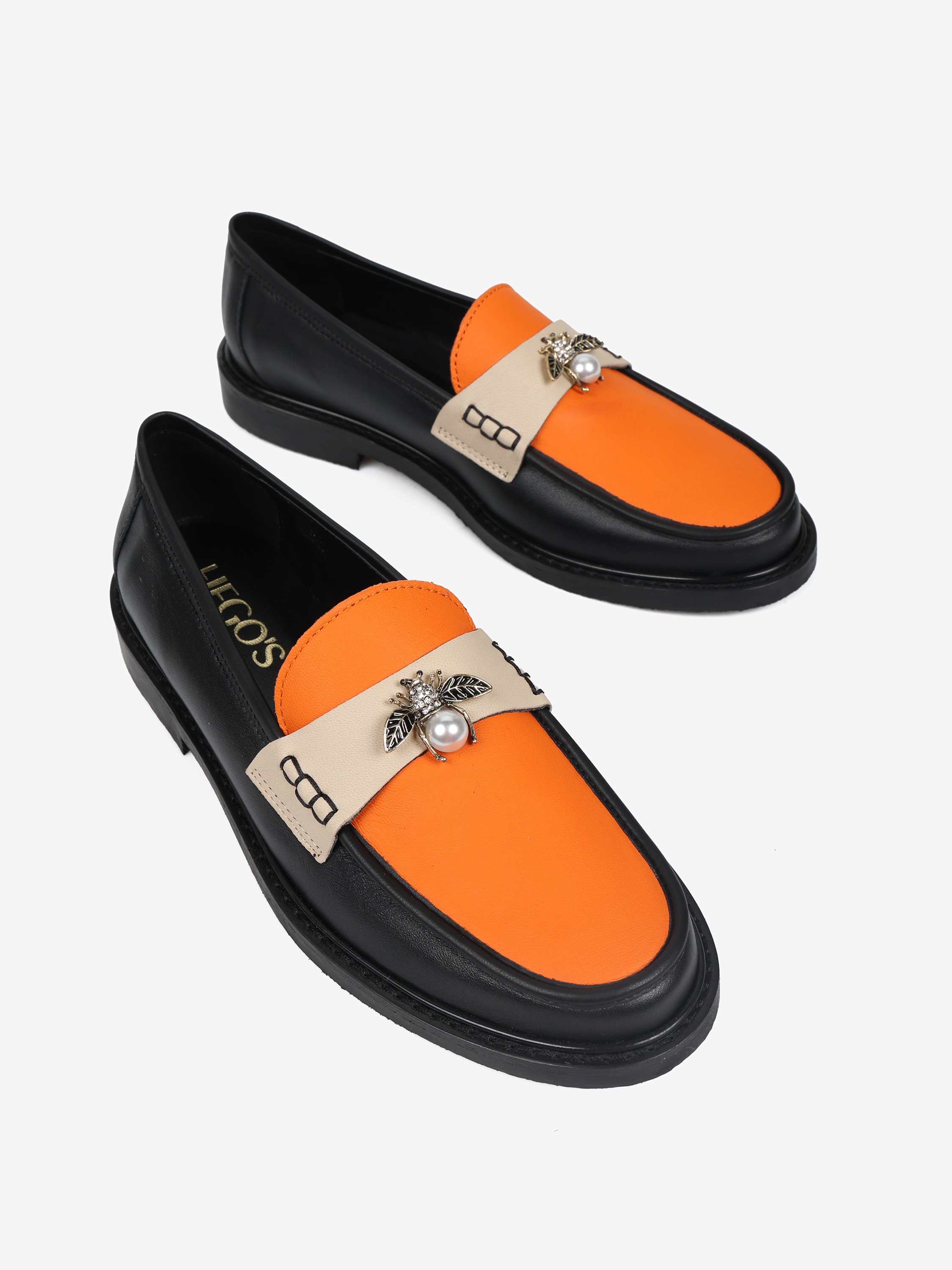 Mokasyny z kontrastującym, pomarańczowym językiem wykonane z miękkiej i delikatnej skóry. Beżowa patka z biżuteryjną aplikacją.