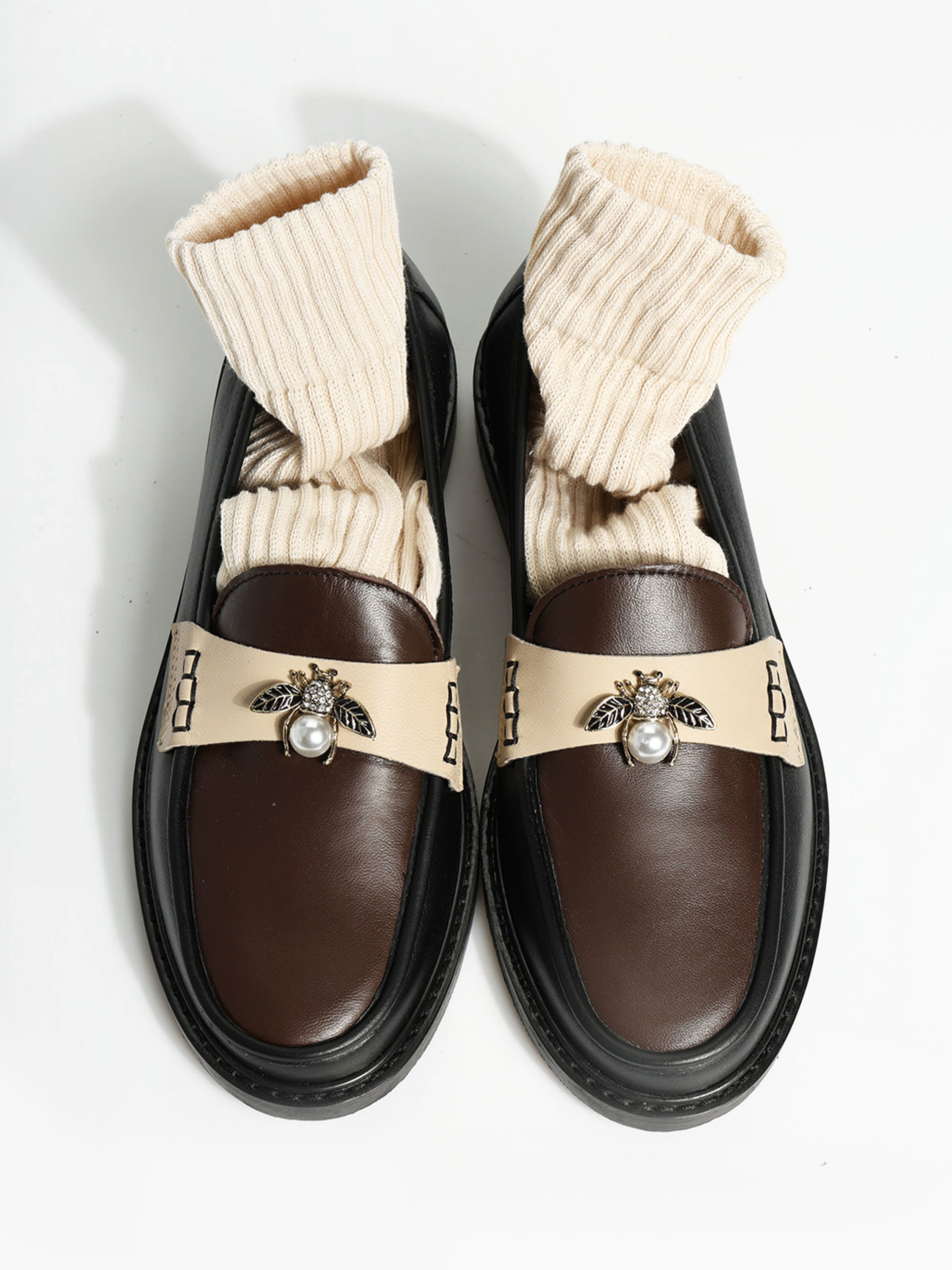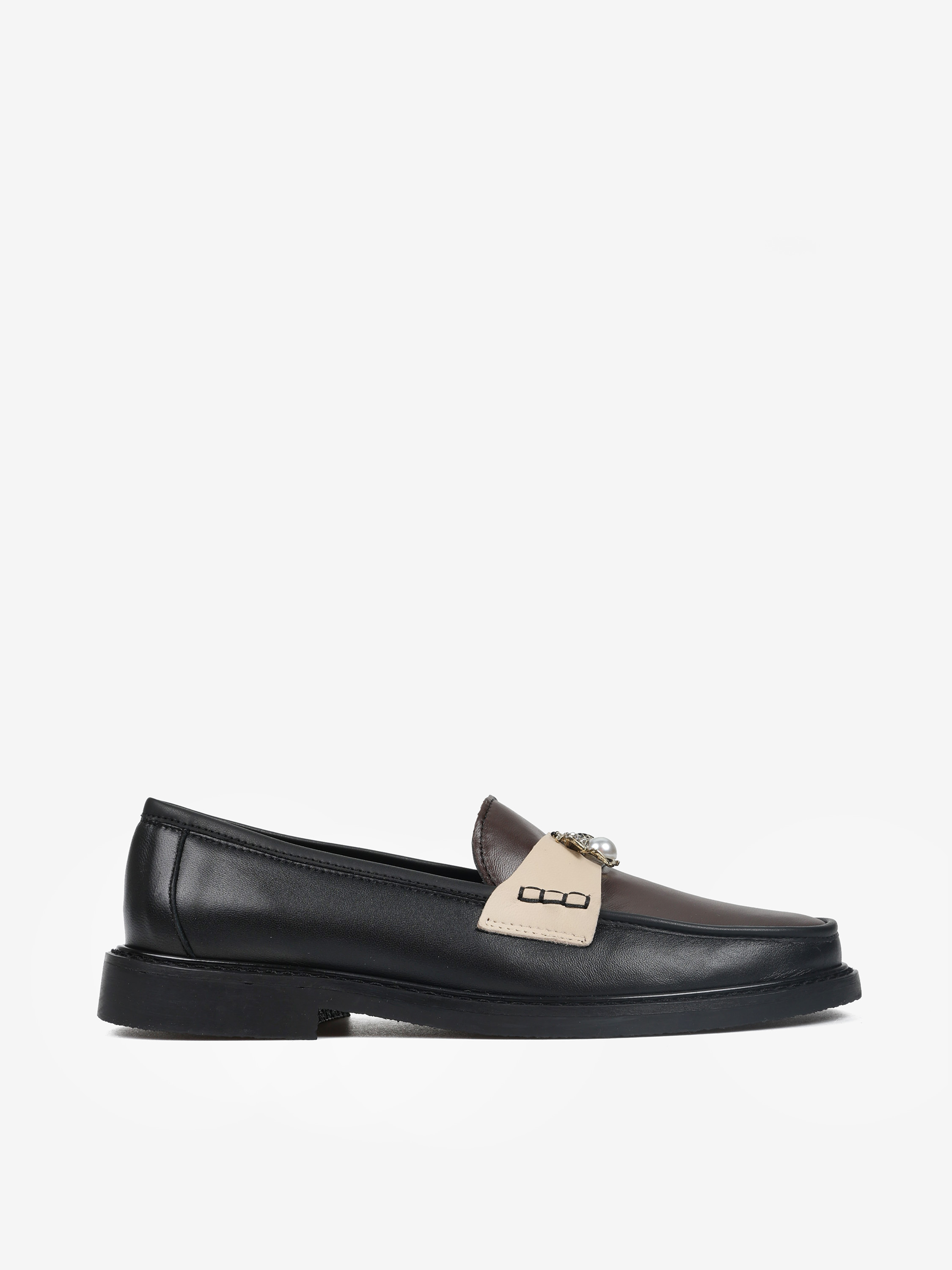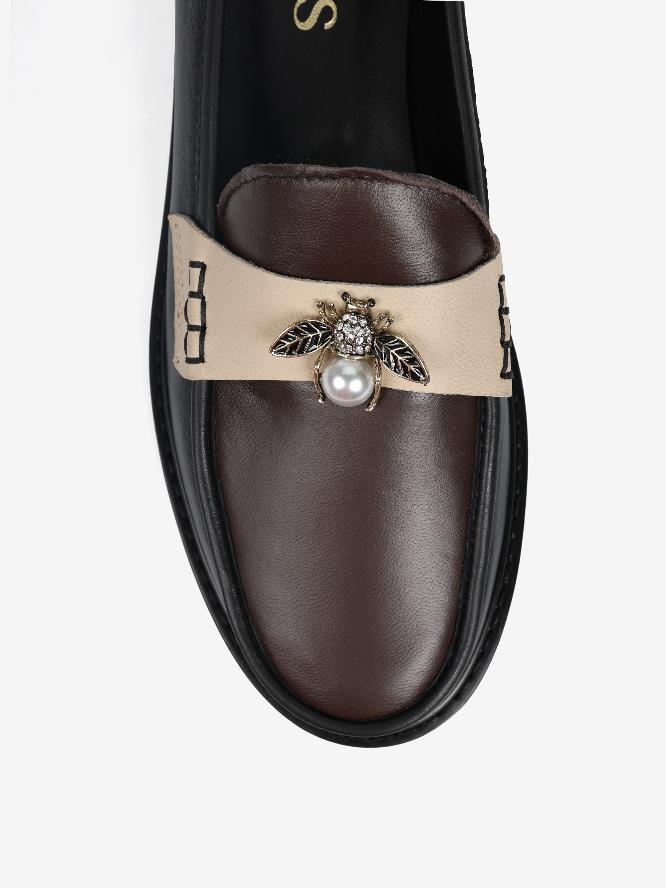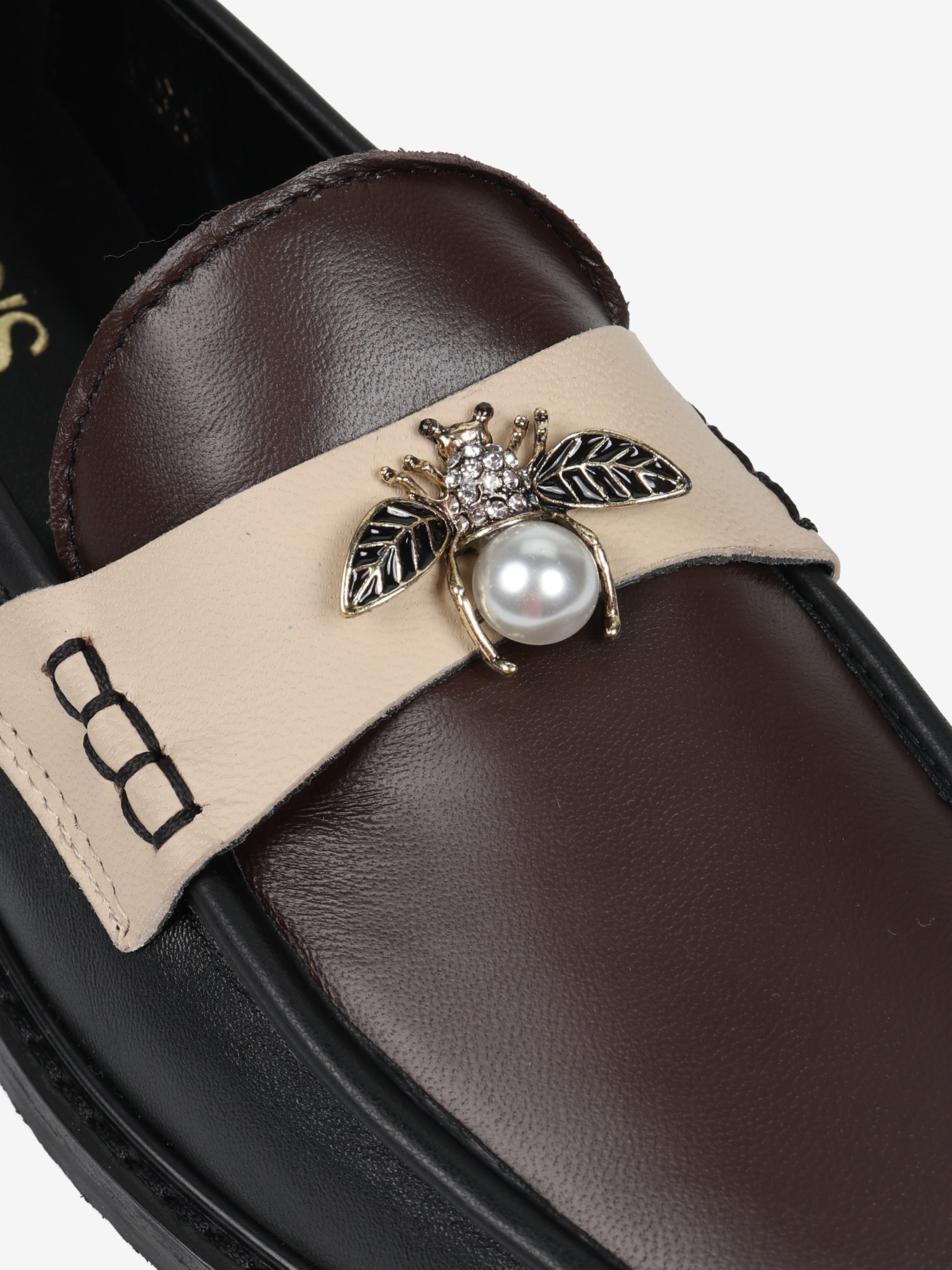 Mokasyny z brązowym językiem wykonane z miękkiej, delikatnej skóry. Beżowa patka z biżuteryjną aplikacją.
