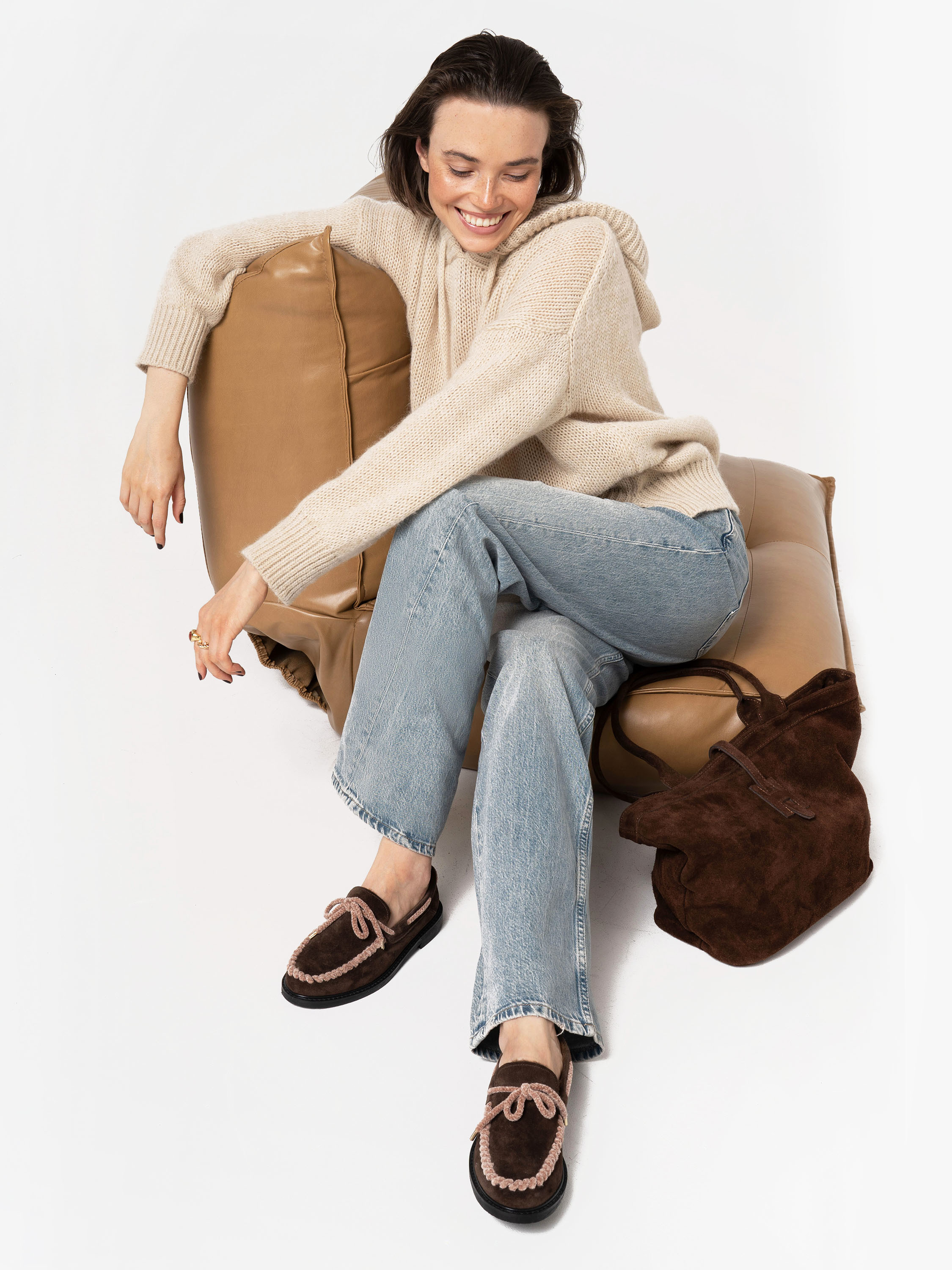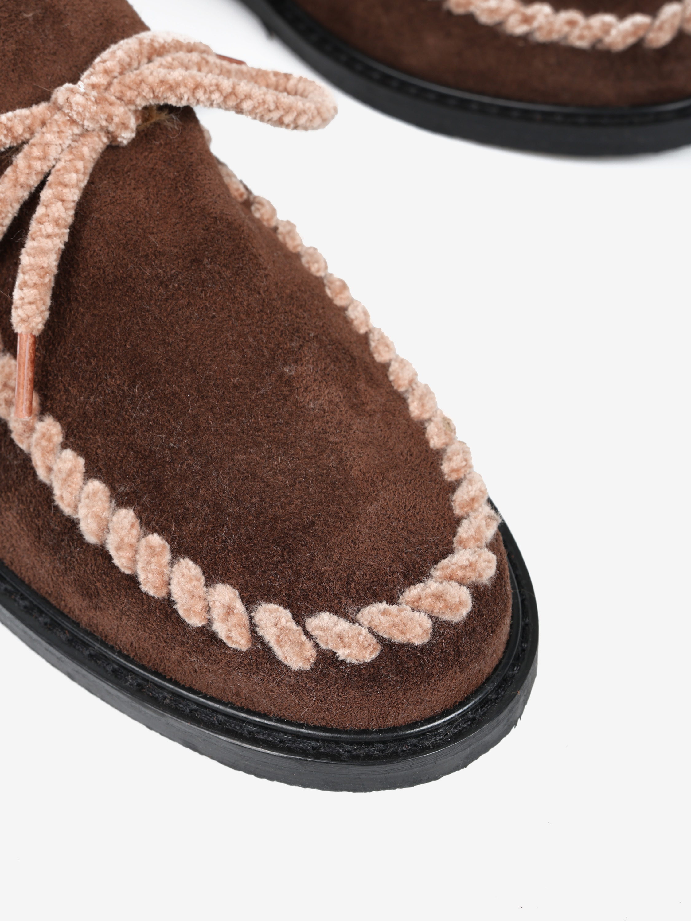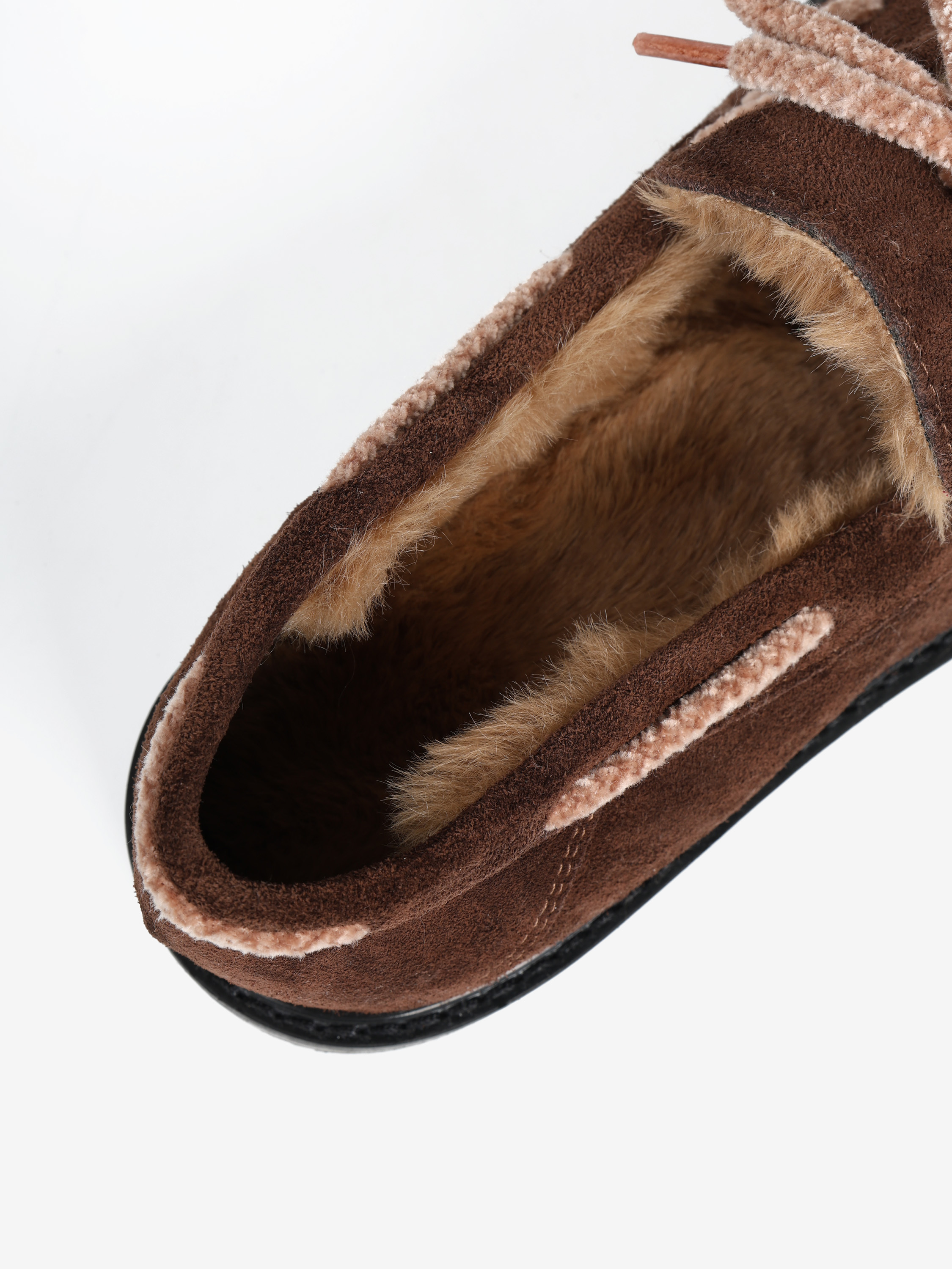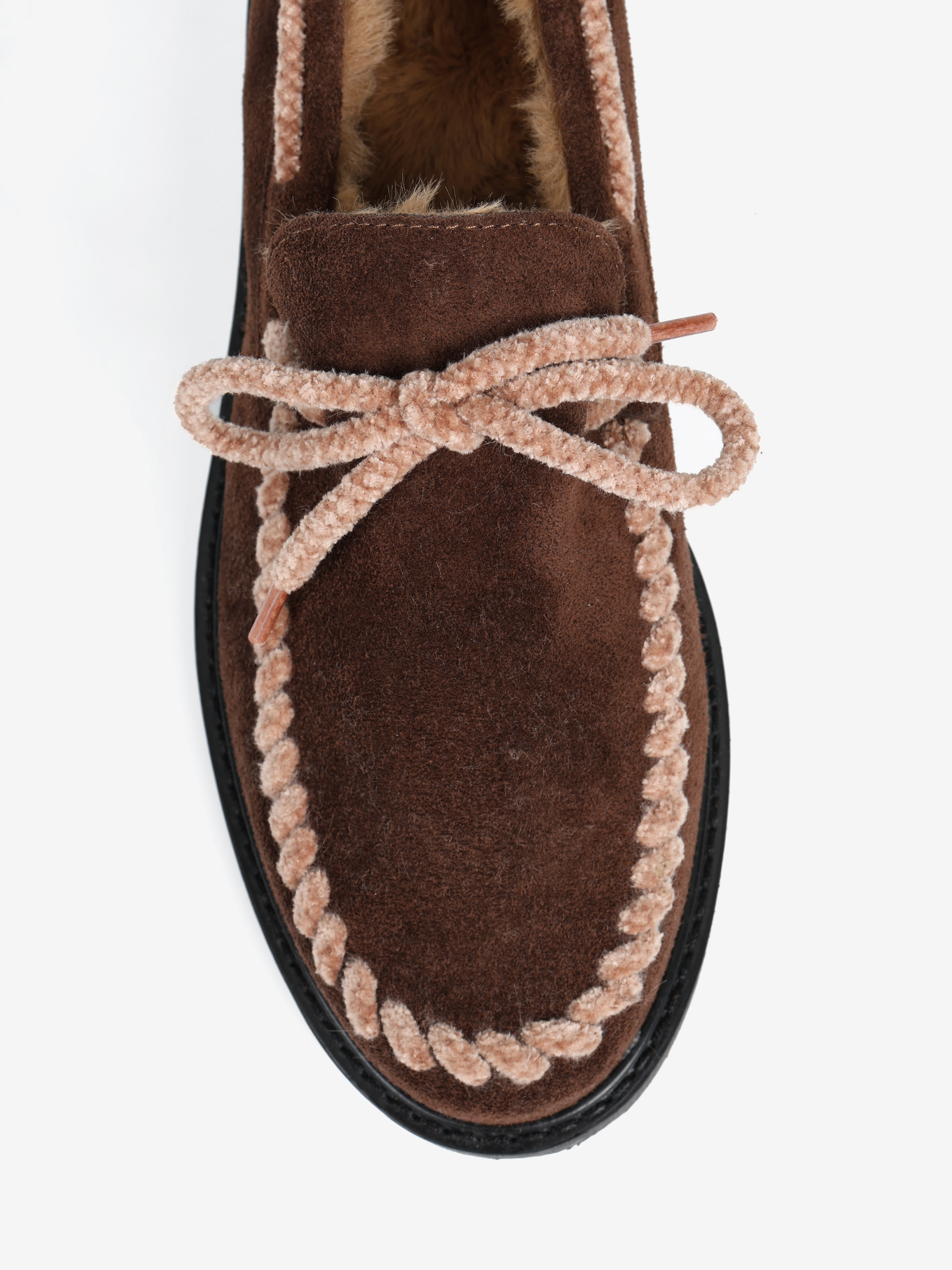 Zamszowe mokasyny z wnętrzem wyłożonym miękkim, sztucznym futrem. Wiązanie ze sznurka pozwala na idealne dopasowanie.