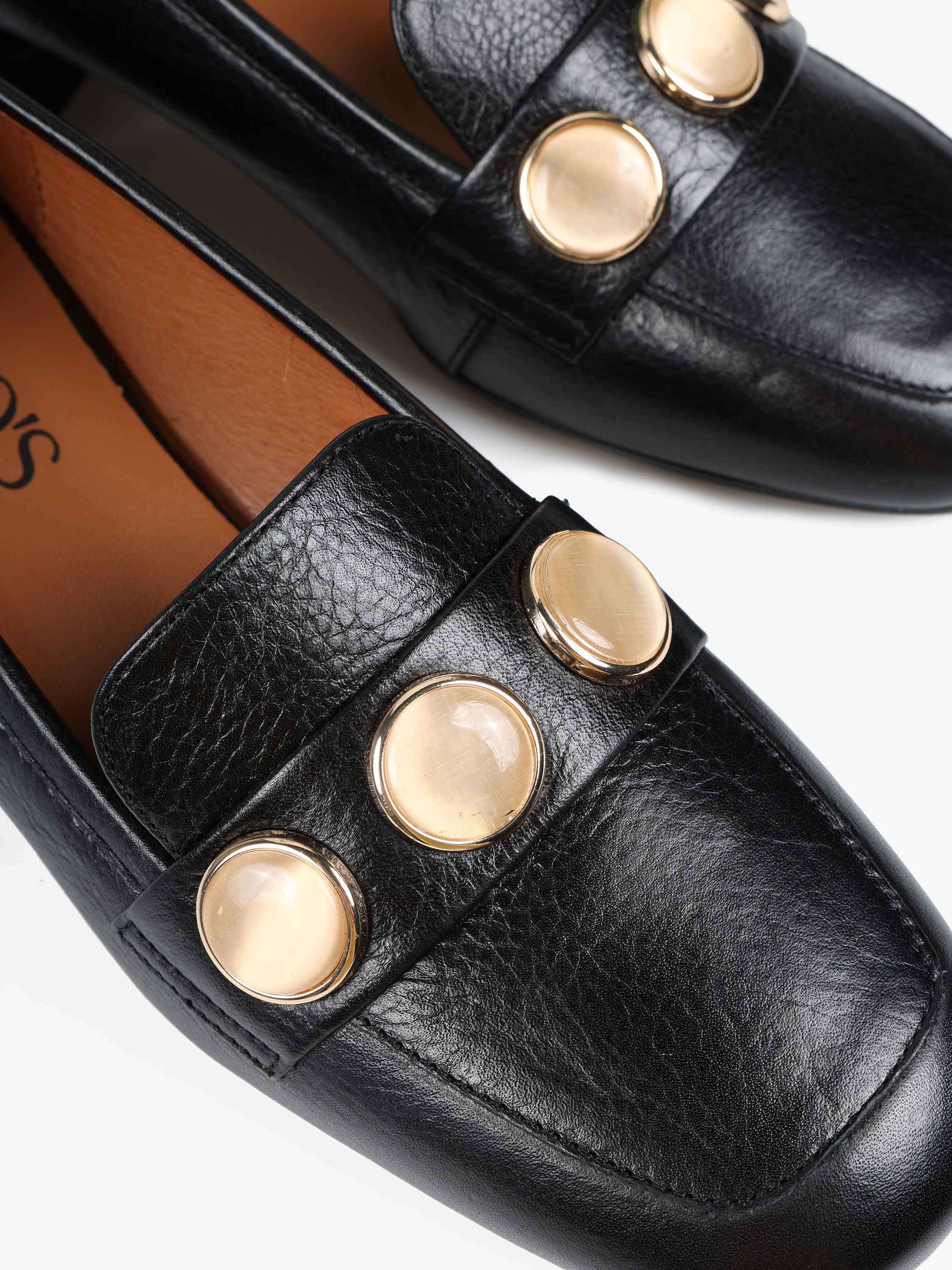 Skórzane mokasyny na niskim obcasie. Ozdobna patka z biżuteryjną aplikacją.