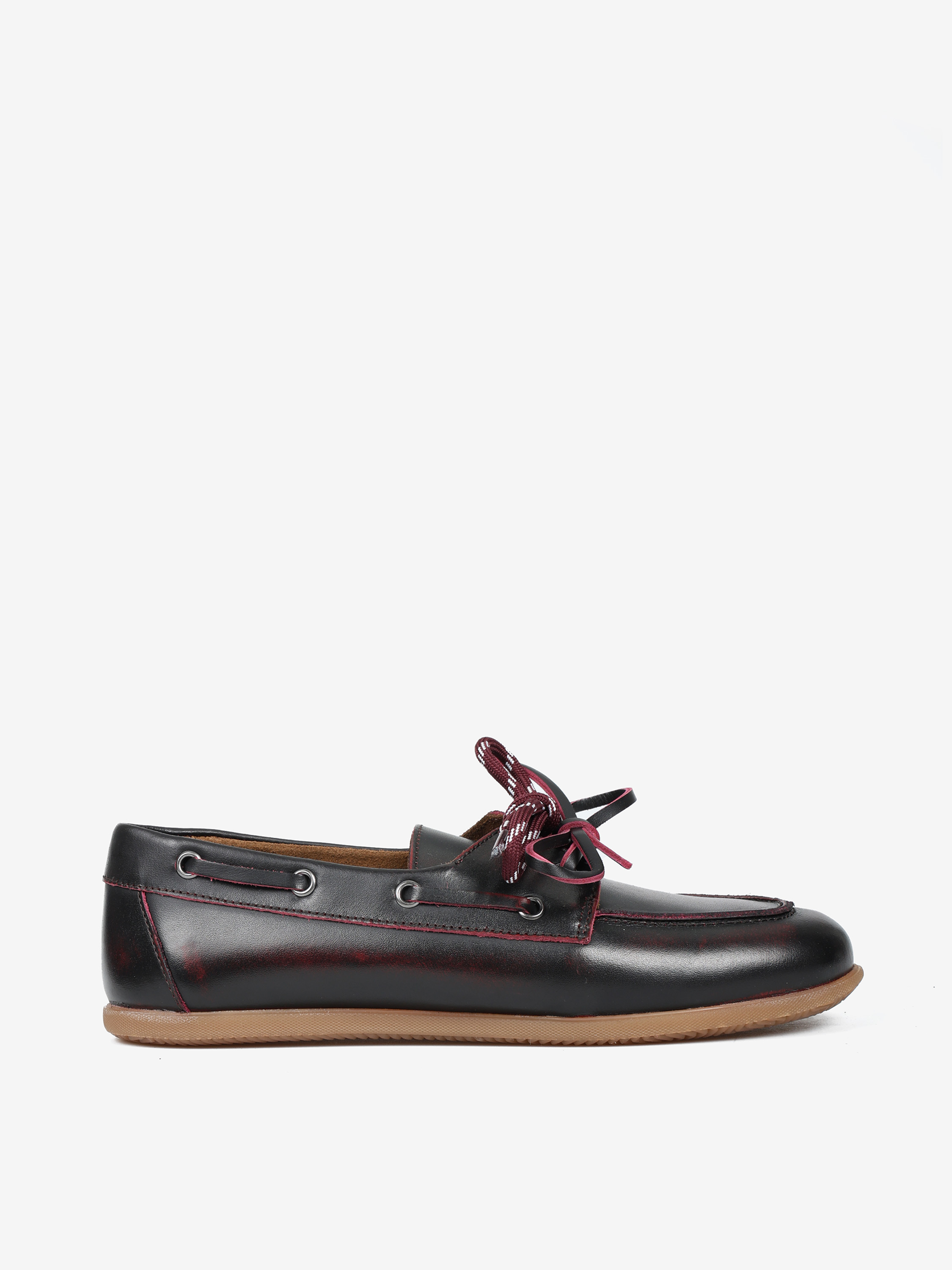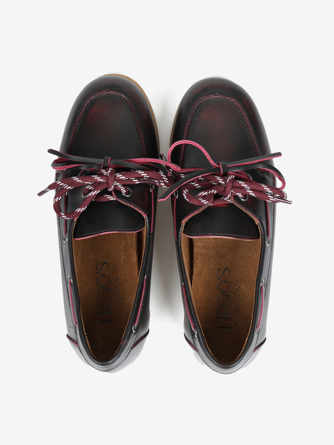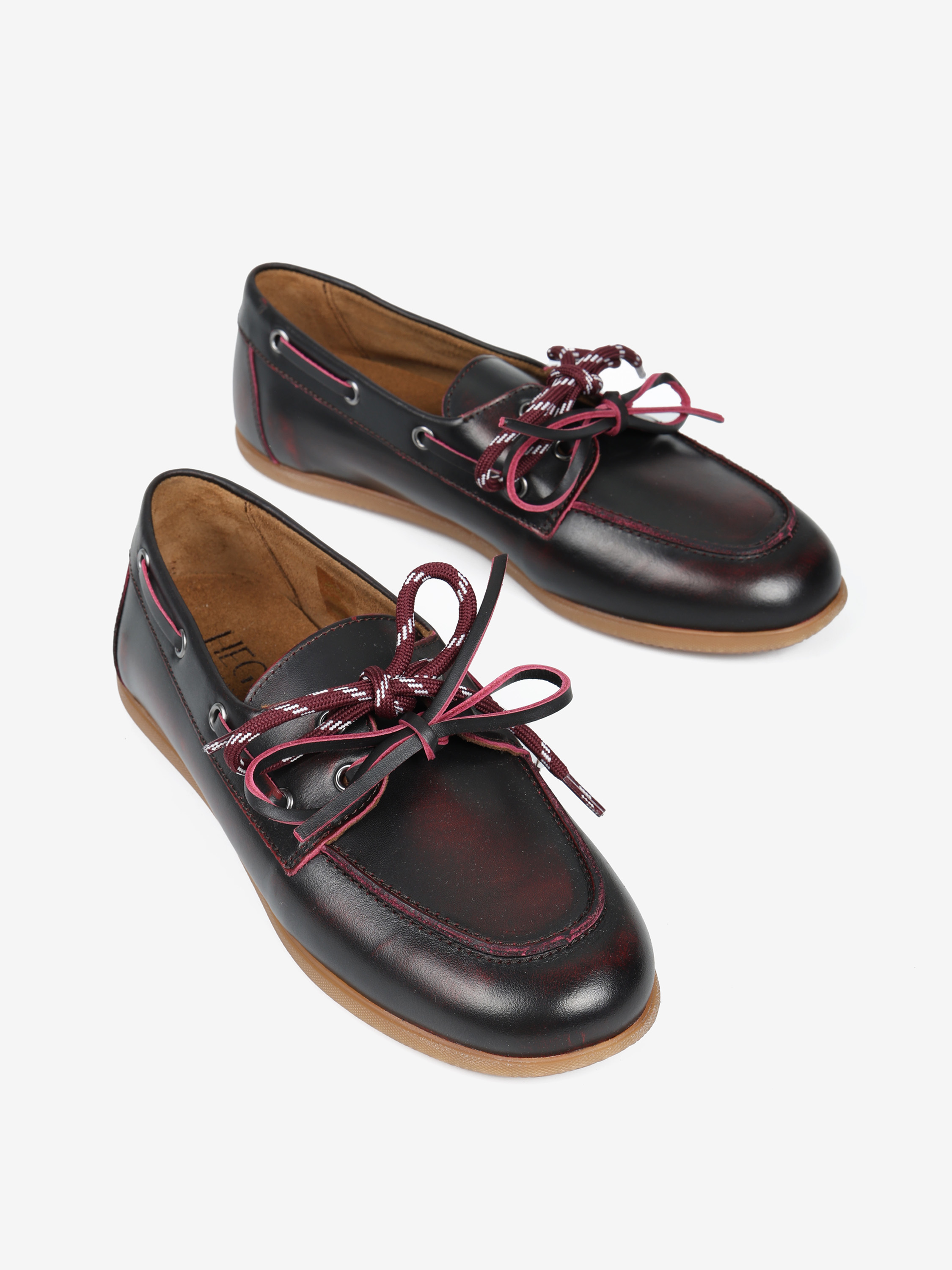 Mokasyny wykonane ze skóry z delikatnym efektem sprania, z wiązaniem pozwalającym na idealne dopasowanie. Dodatkowa para bordowych sznurowadeł.
