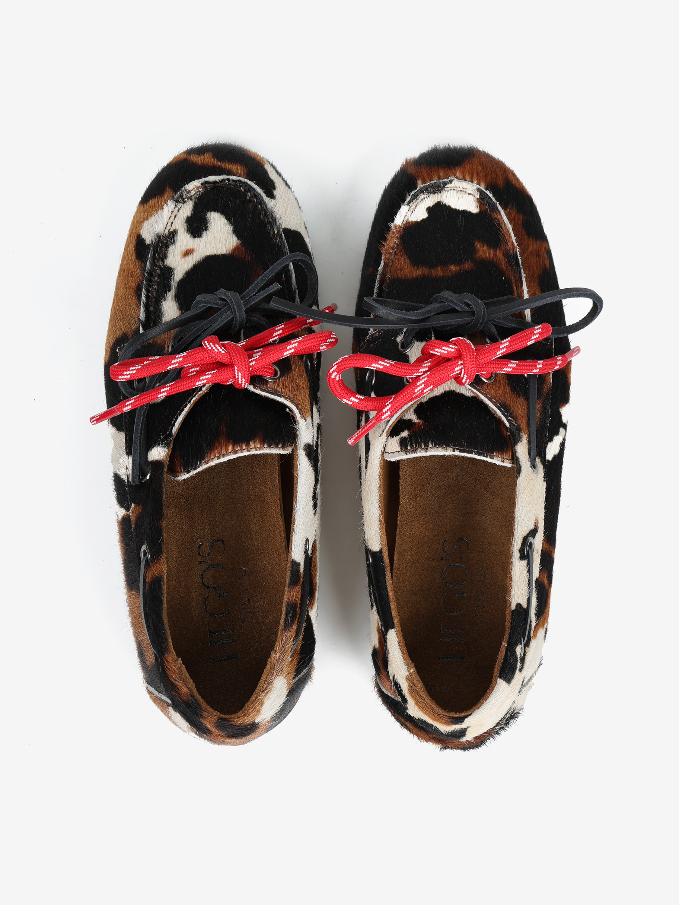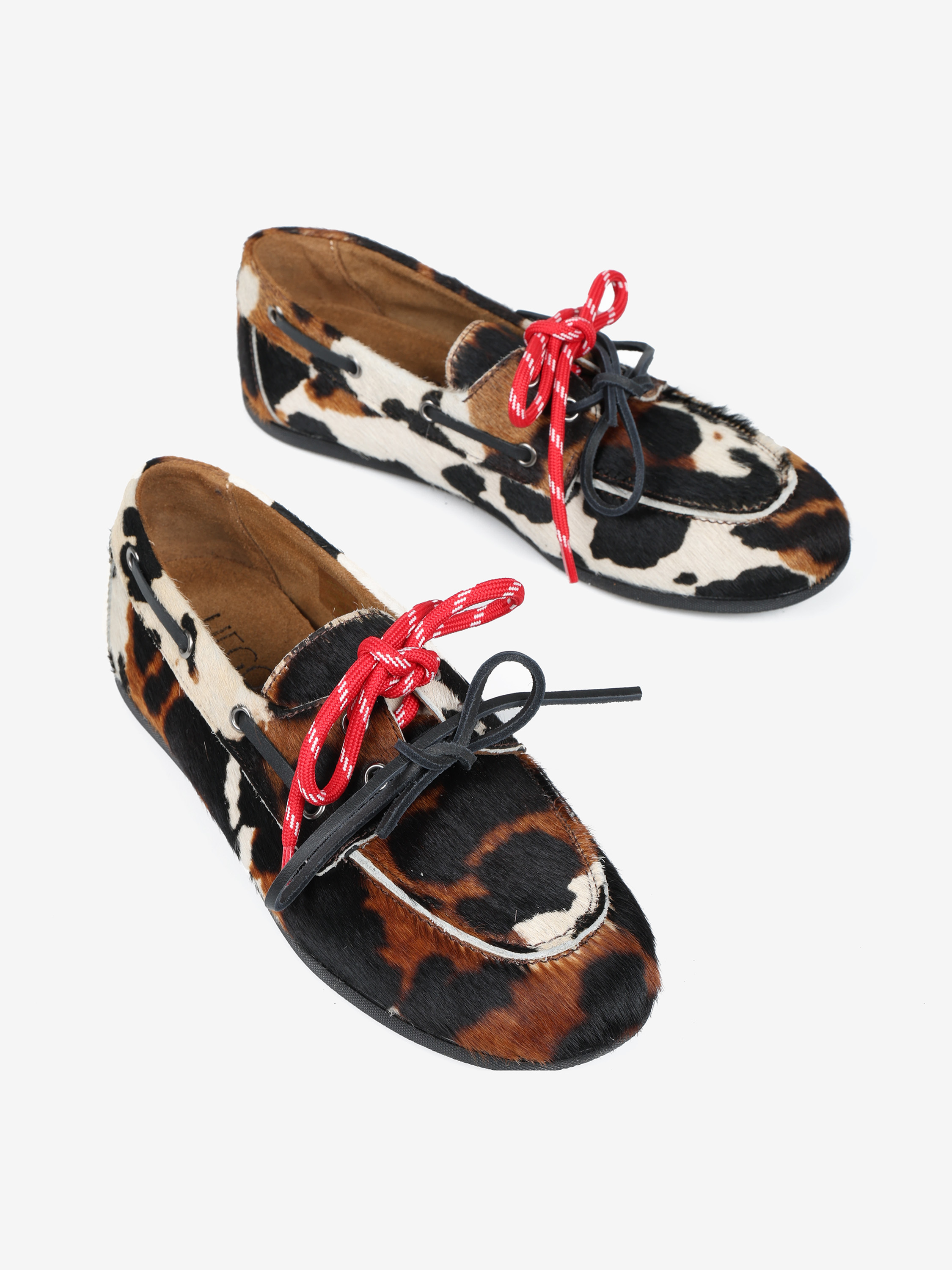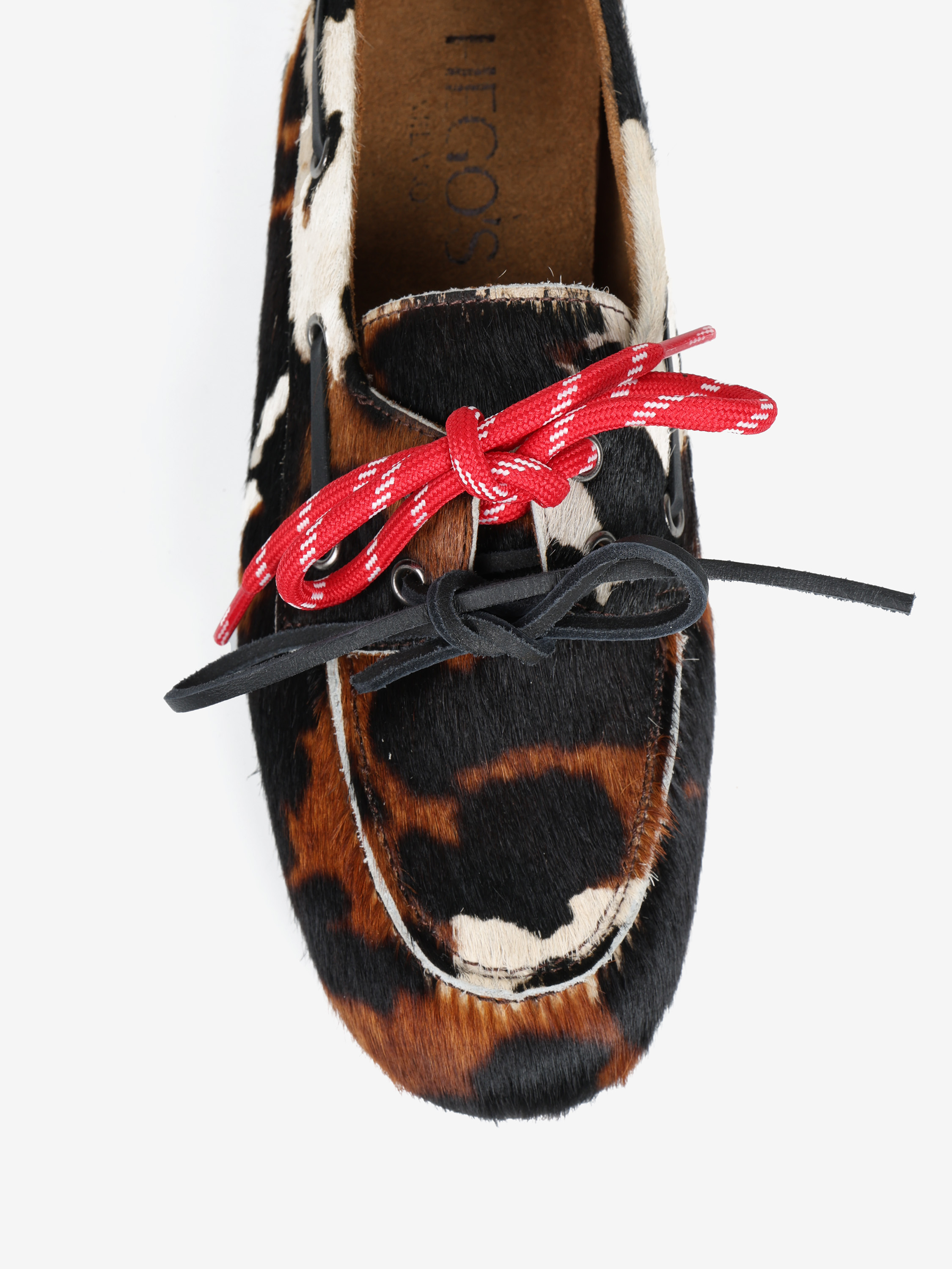Mokasyny wykonane ze skóry z włosiem, z wiązaniem pozwalającym na idealne dopasowanie. Dodatkowe sznurowadła w kontrastującym, czerwonym kolorze.