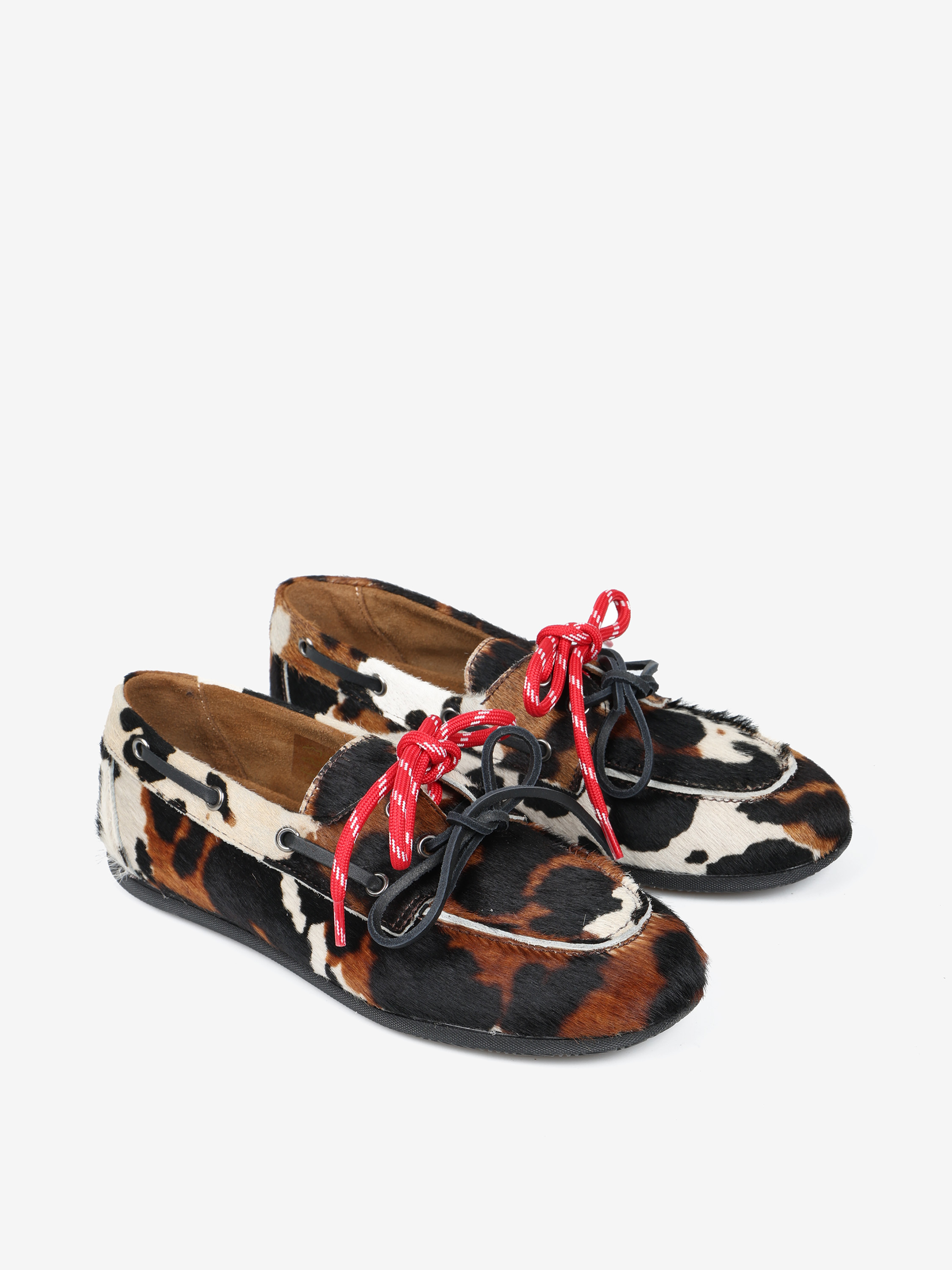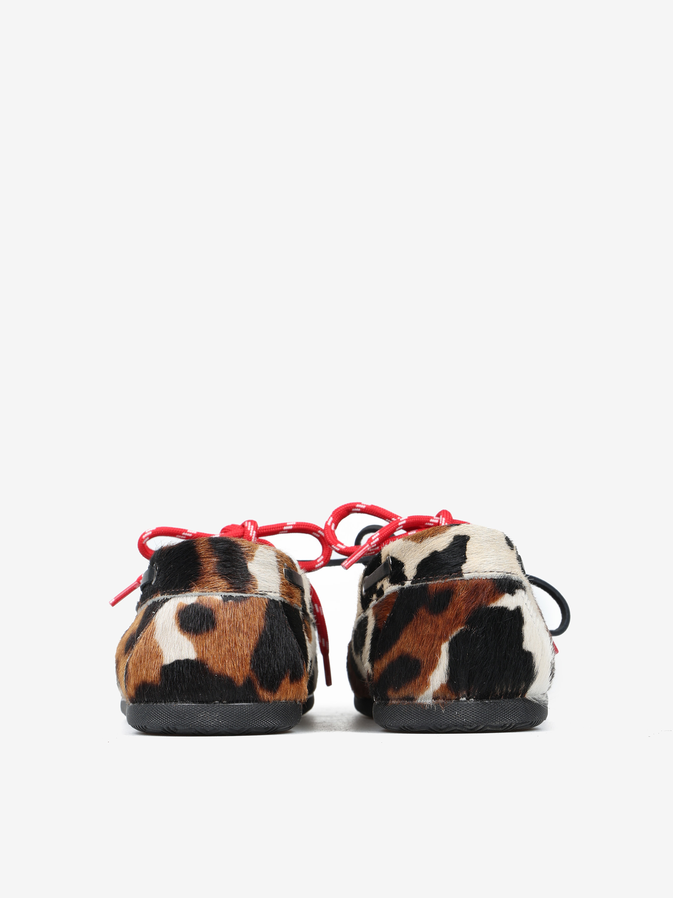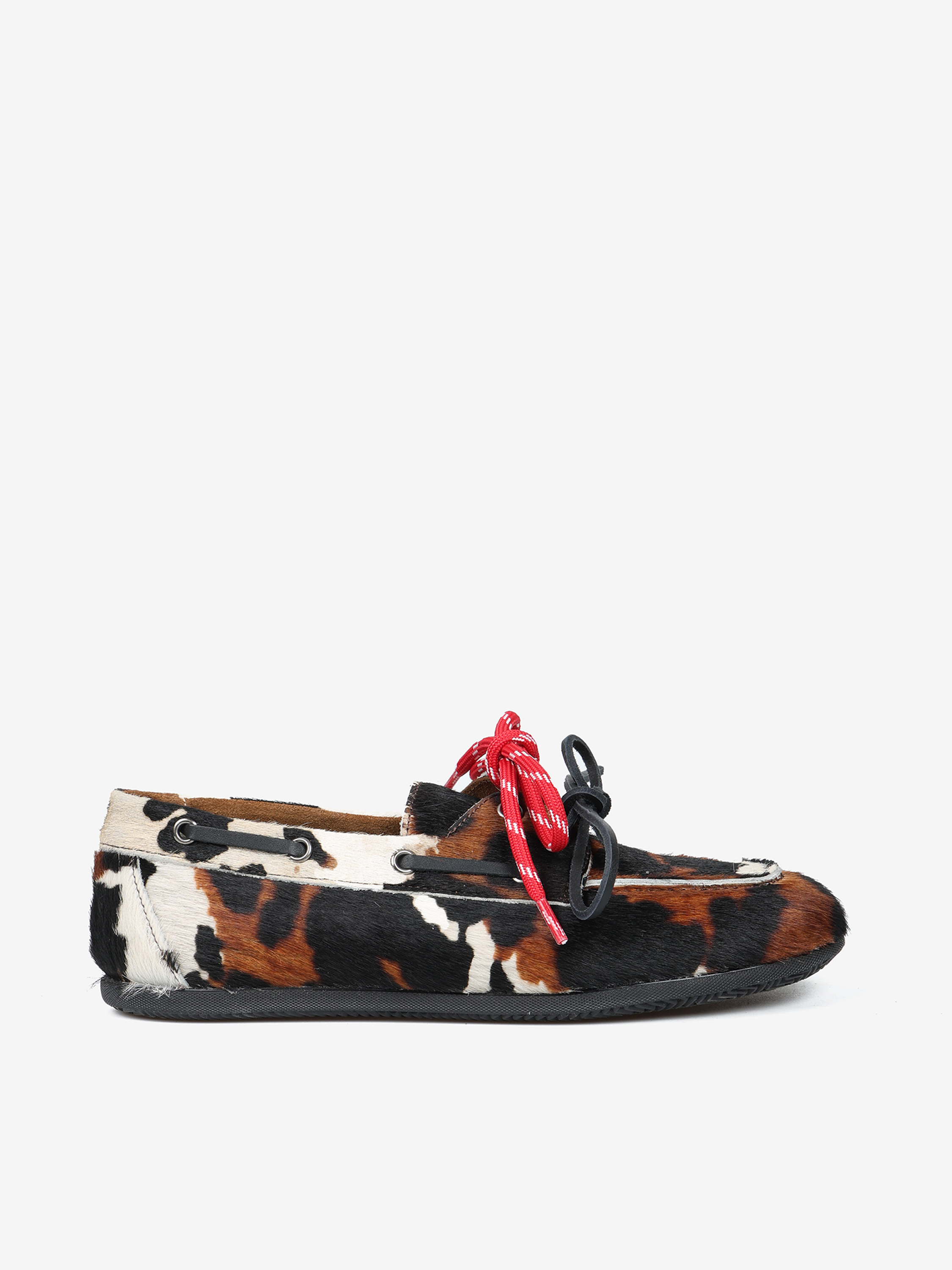 Mokasyny wykonane ze skóry z włosiem, z wiązaniem pozwalającym na idealne dopasowanie. Dodatkowe sznurowadła w kontrastującym, czerwonym kolorze.