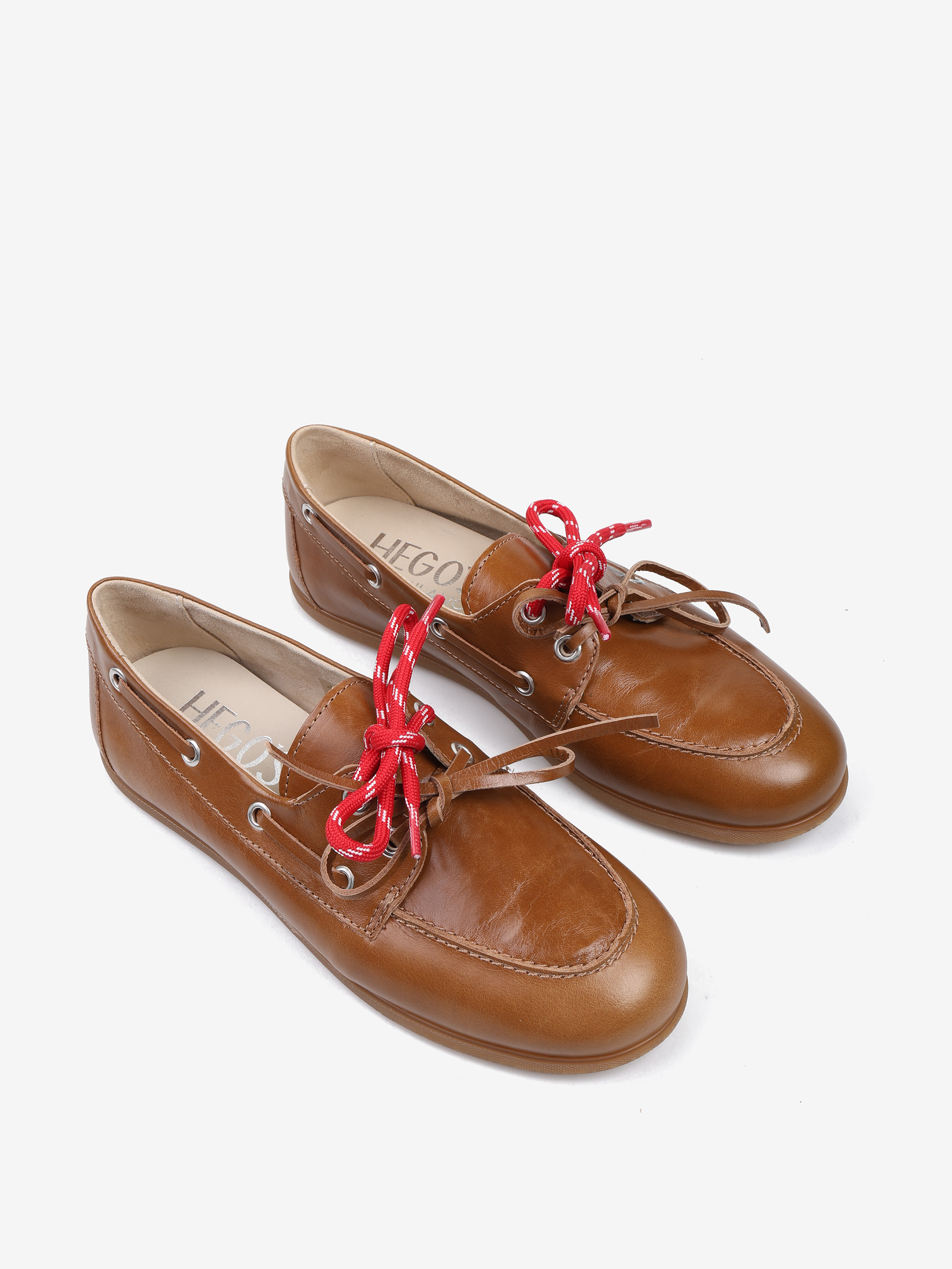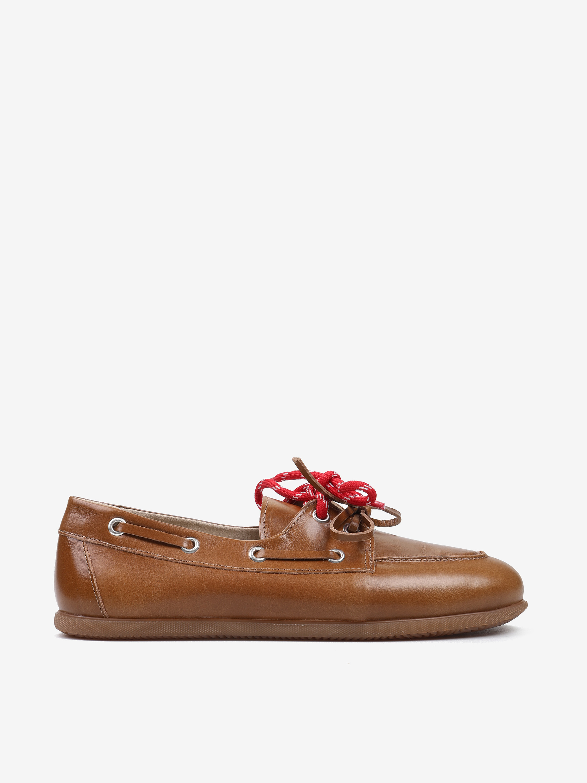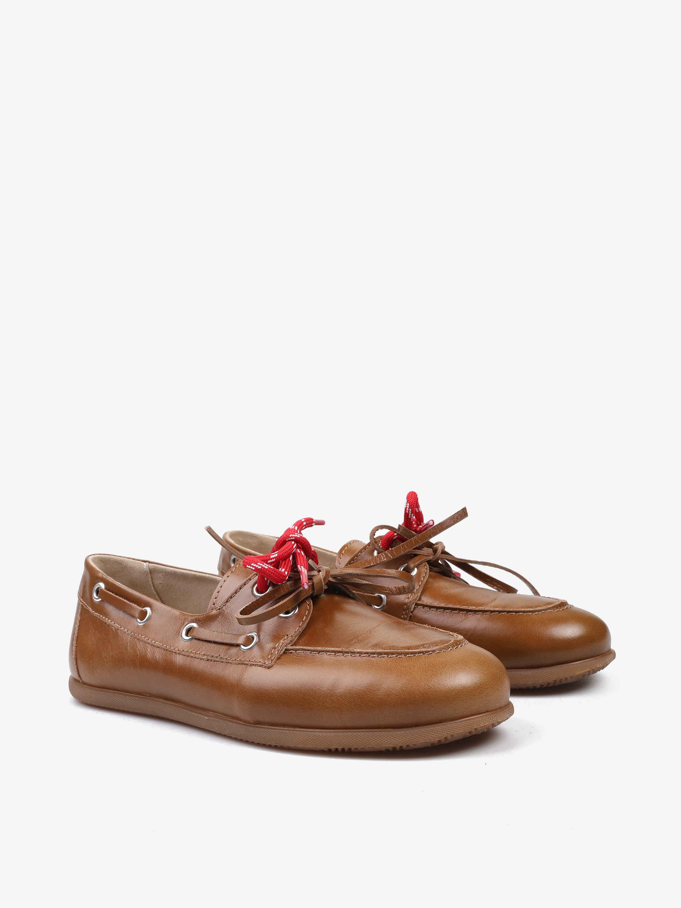 Mokasyny wykonane z rudej skóry z wiązaniem pozwalającym na idealne dopasowanie. Dodatkowe sznurowadła w kontrastującym, czerwonym kolorze.