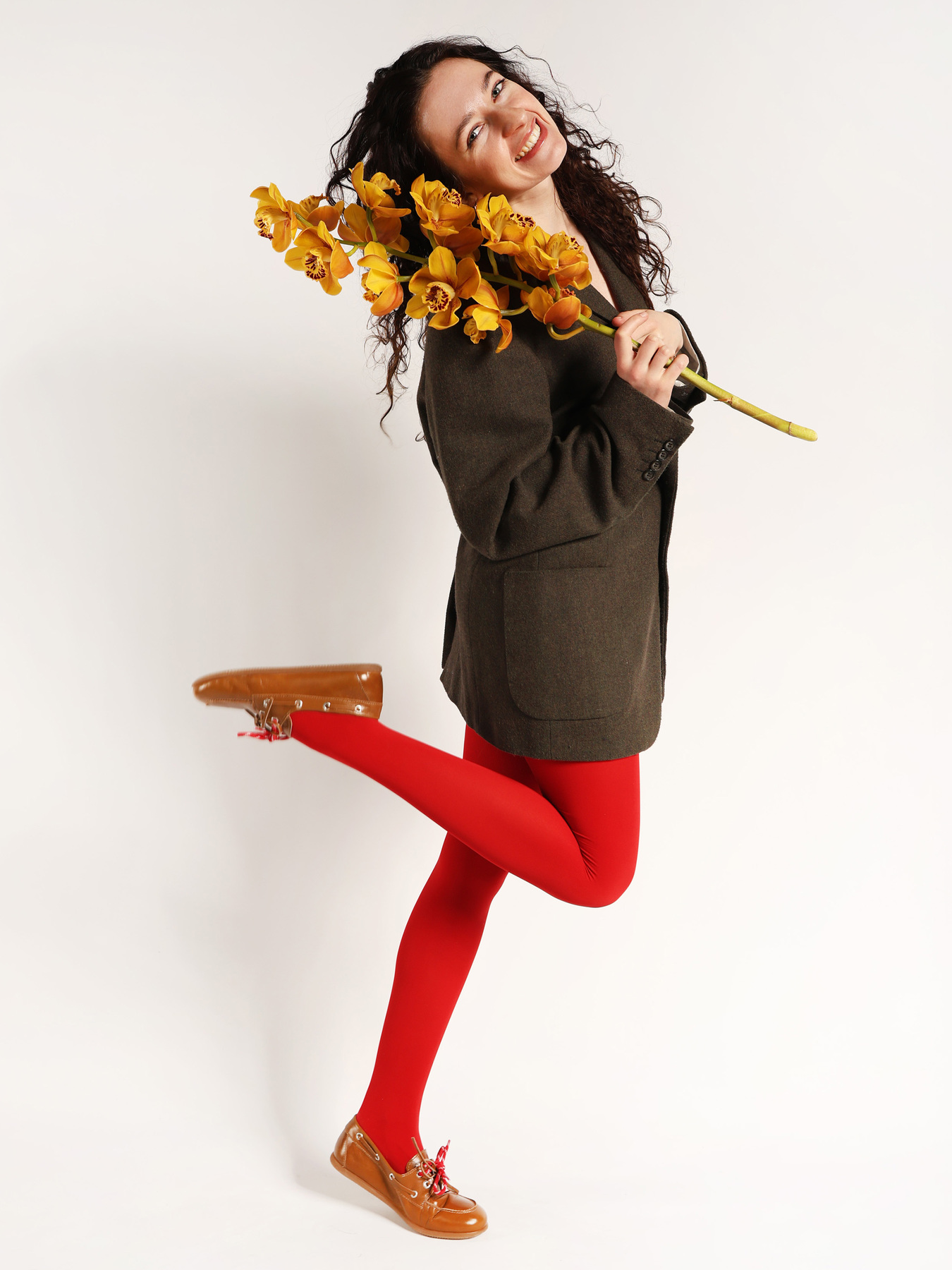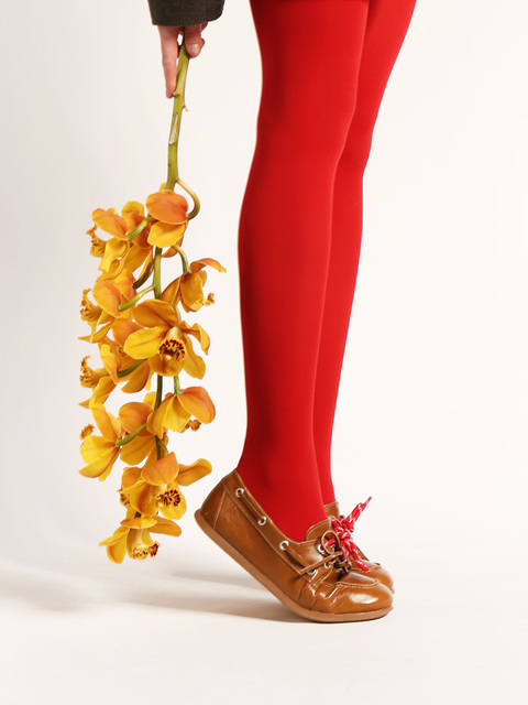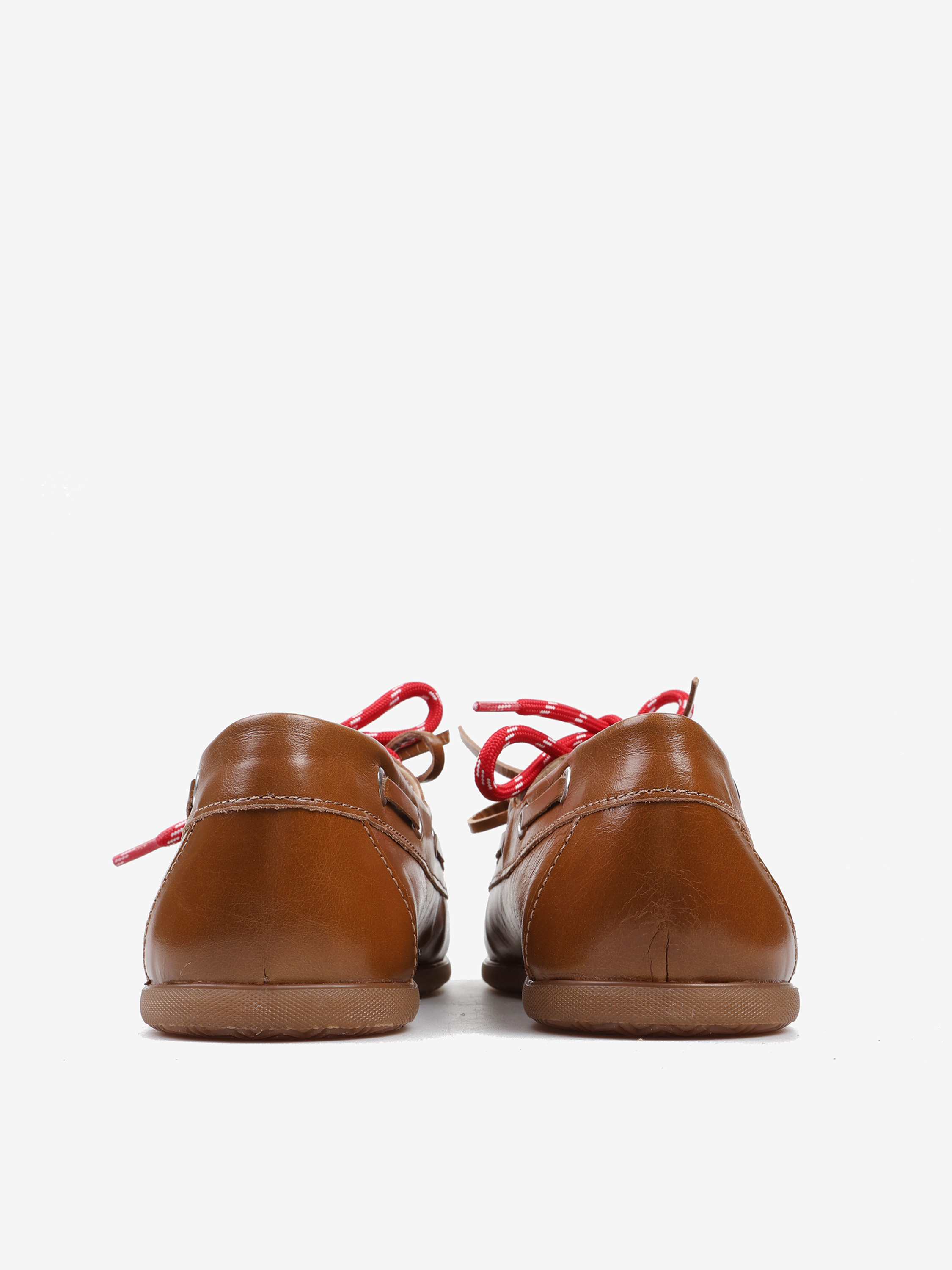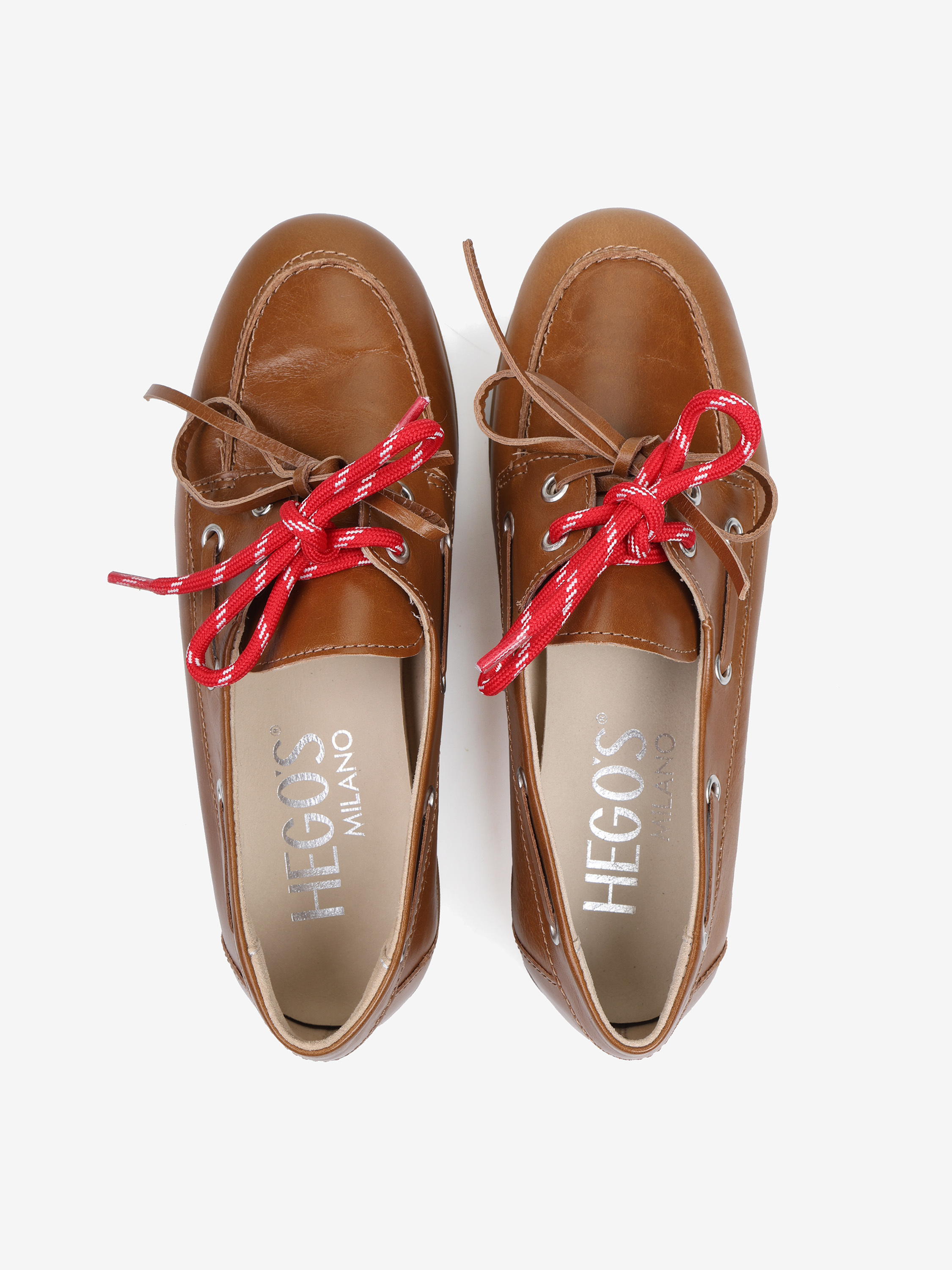 Mokasyny wykonane z rudej skóry z wiązaniem pozwalającym na idealne dopasowanie. Dodatkowe sznurowadła w kontrastującym, czerwonym kolorze.