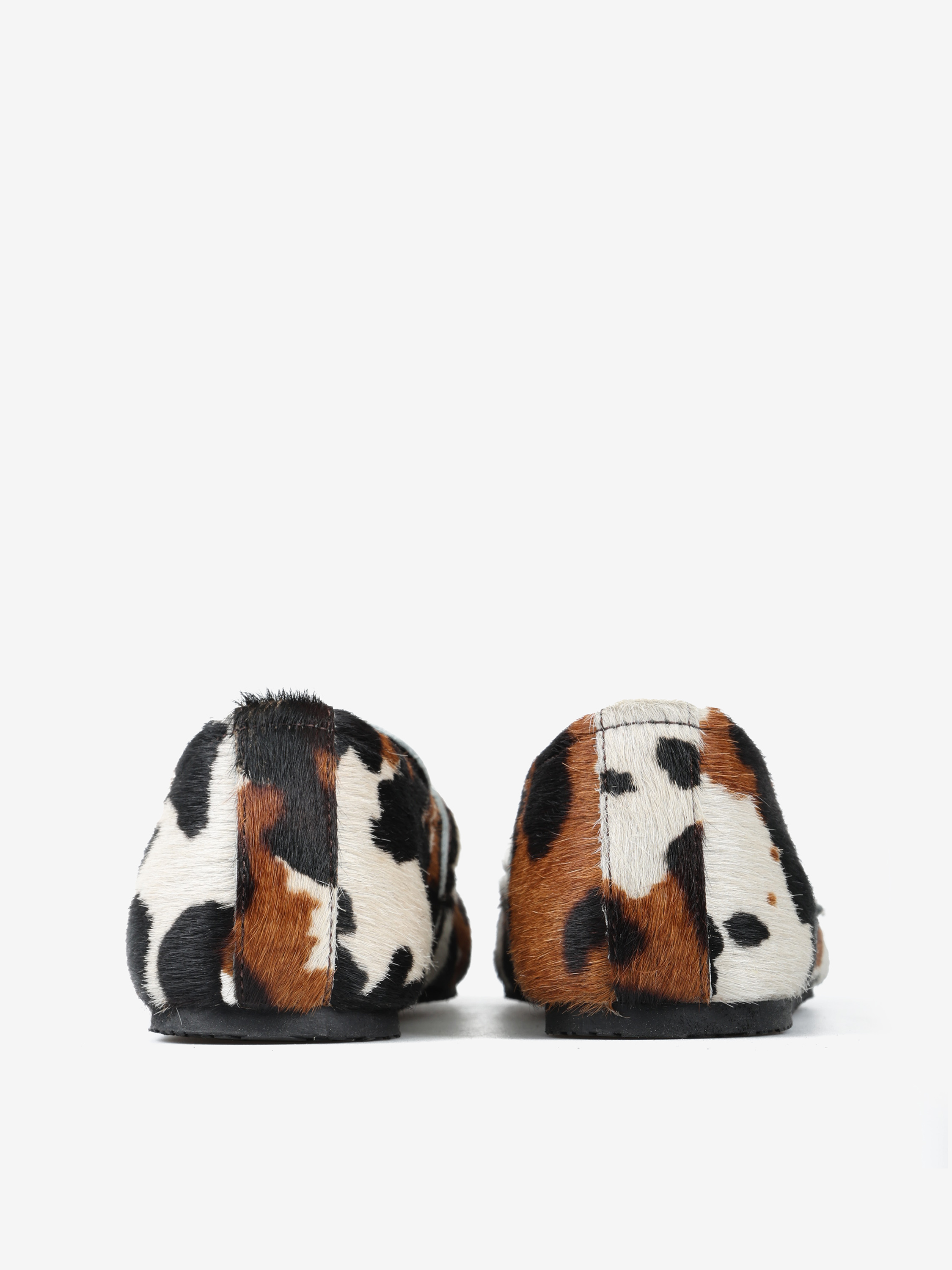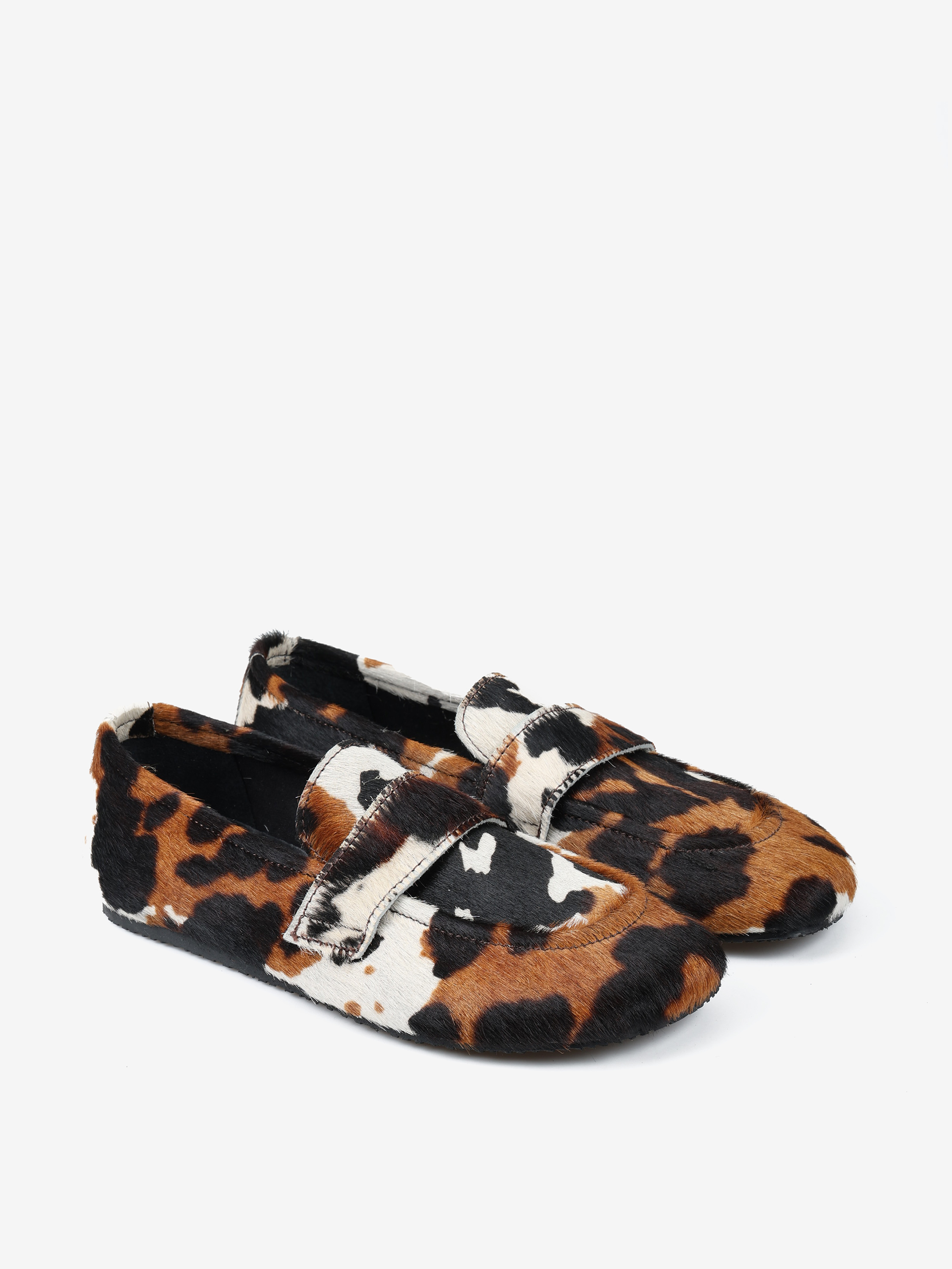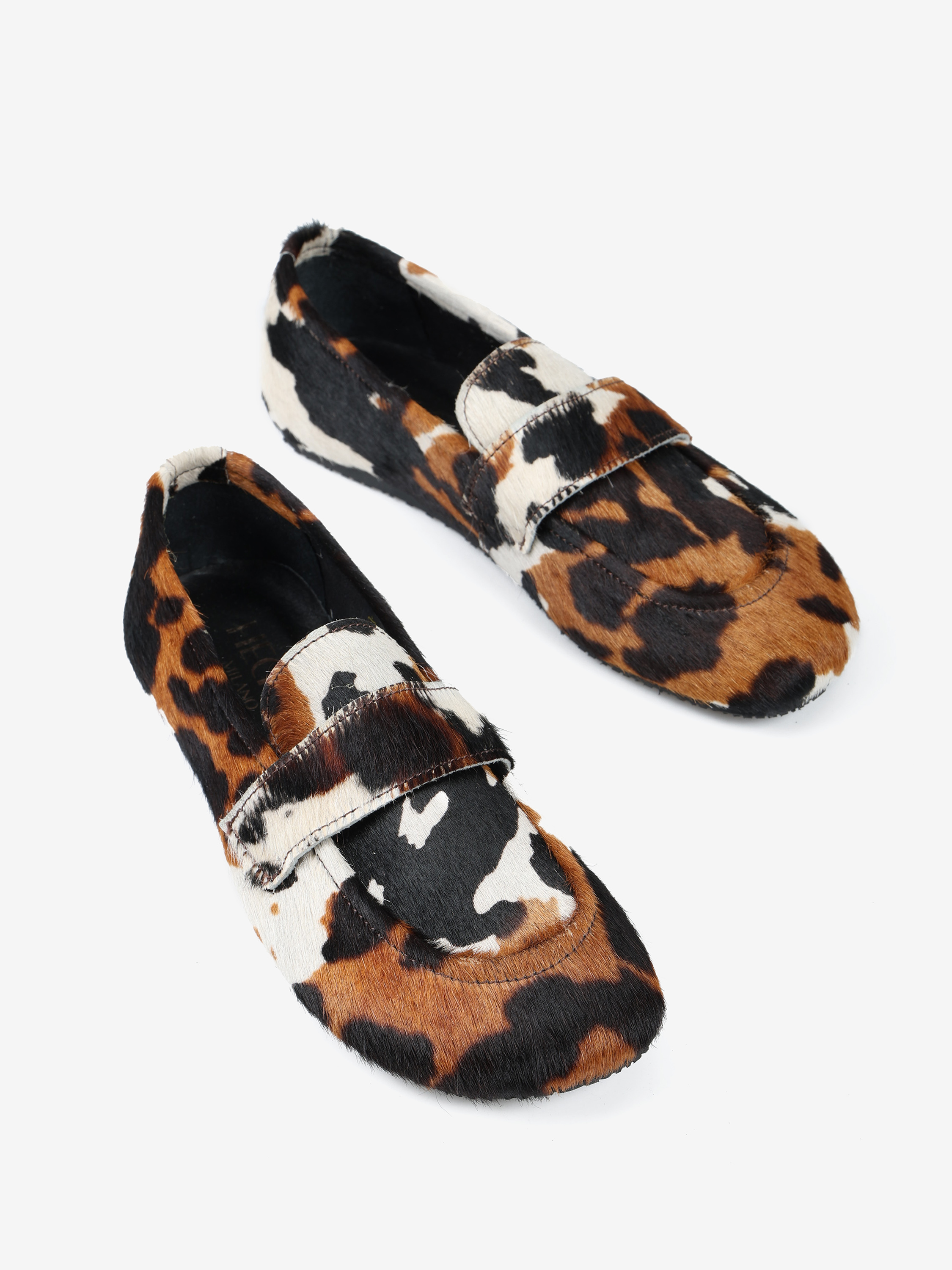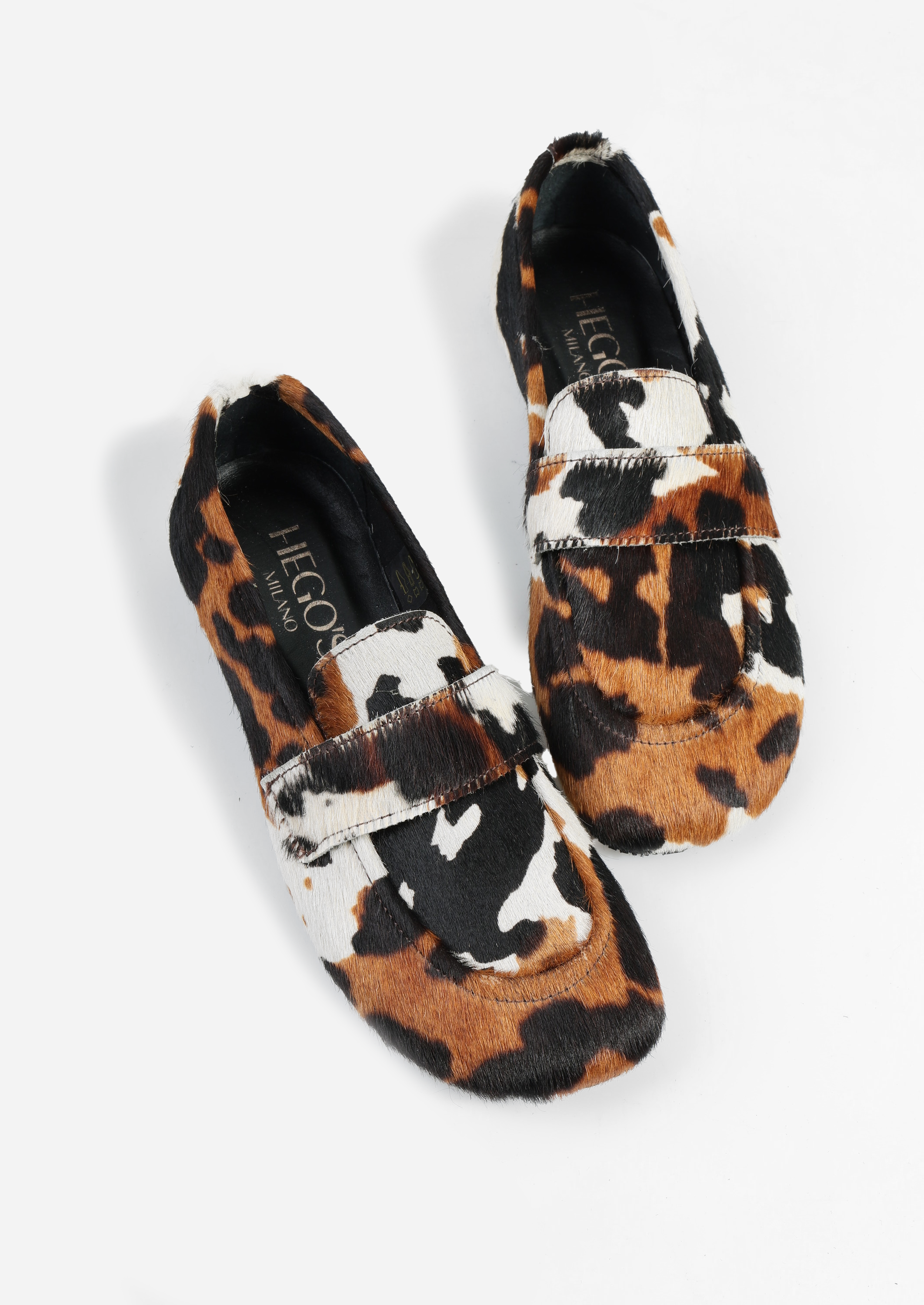 Proste mokasyny na płaskiej podeszwie, wykonanej ze skóry z włosiem w krowi wzór.