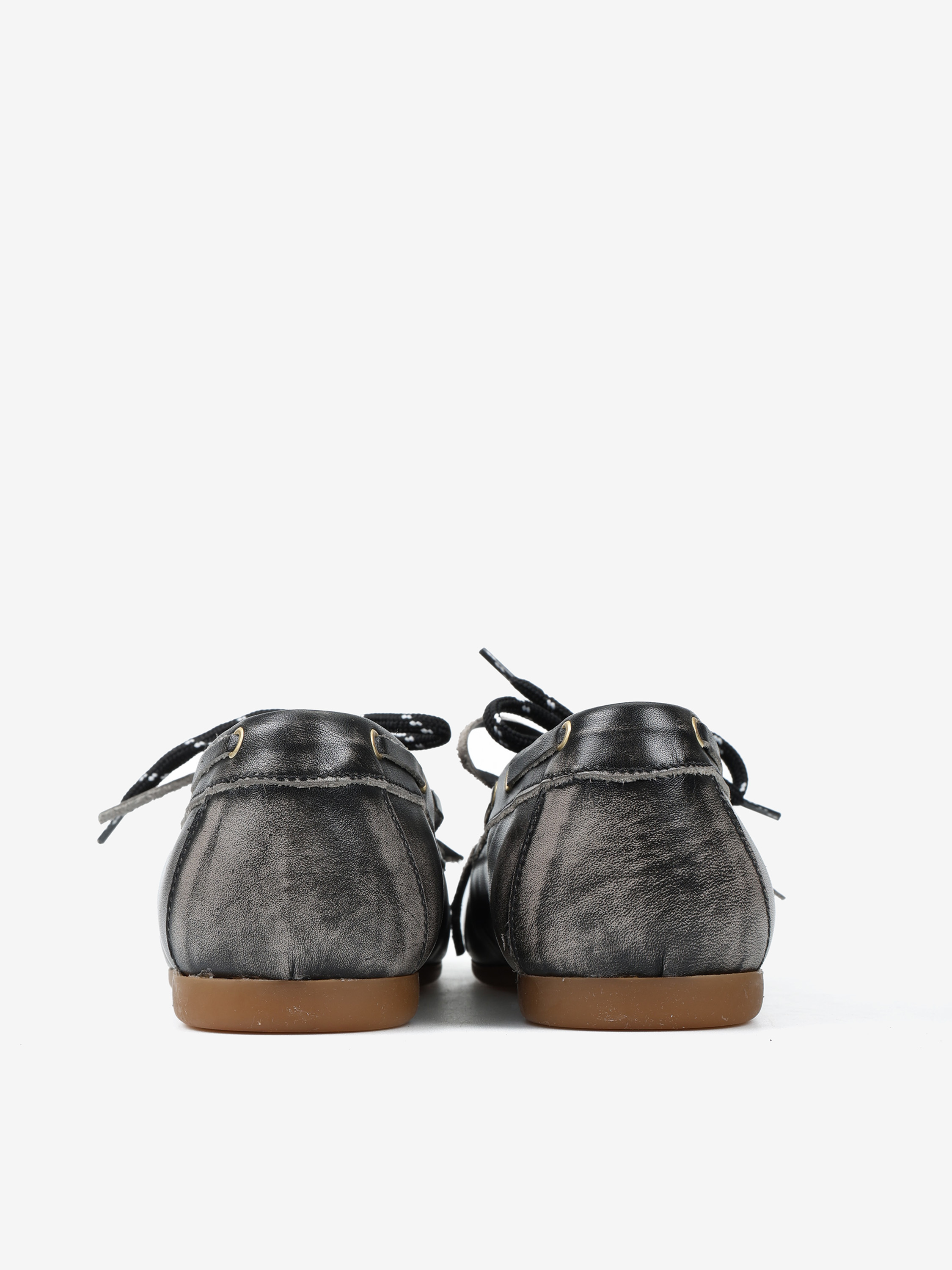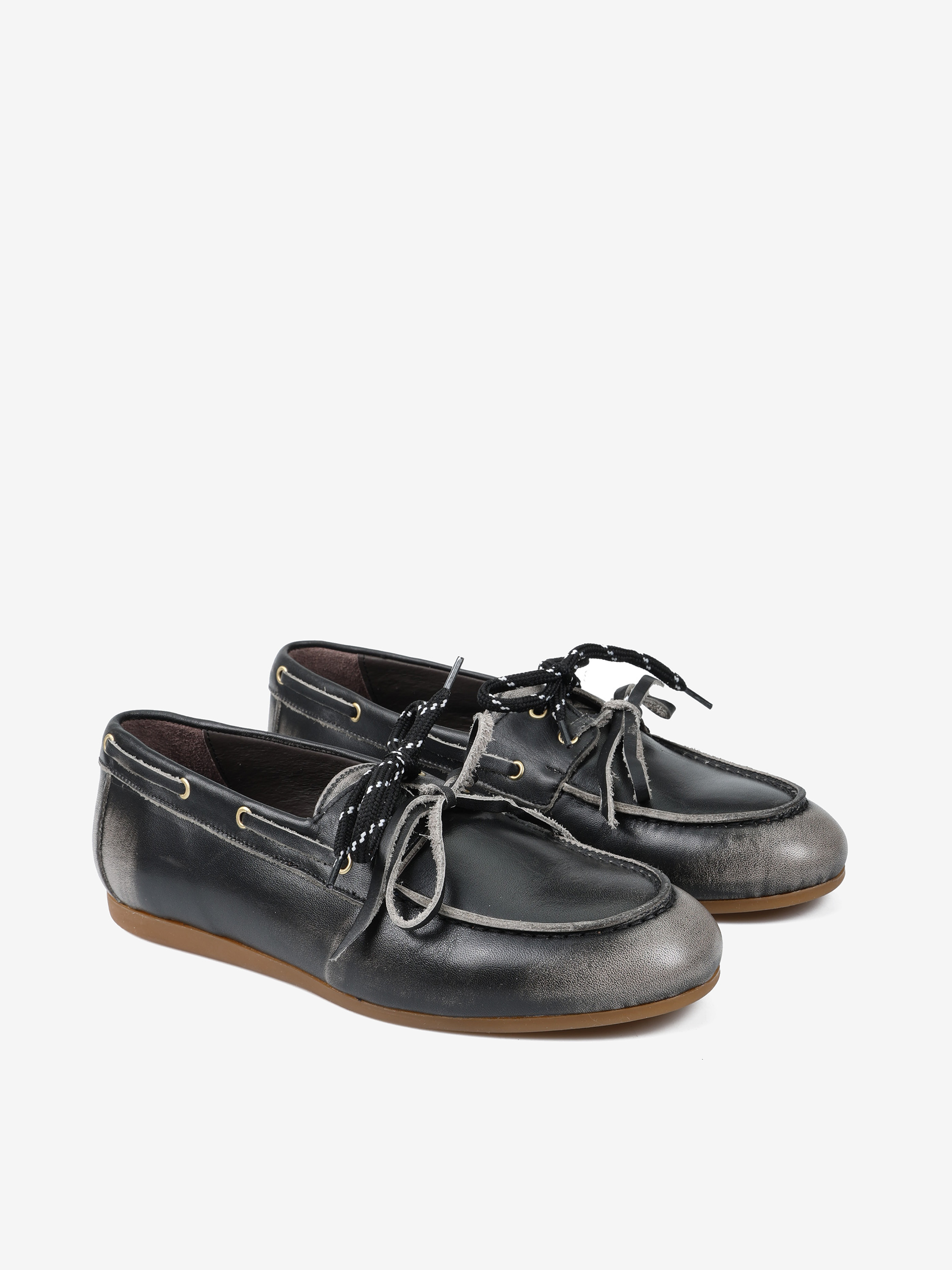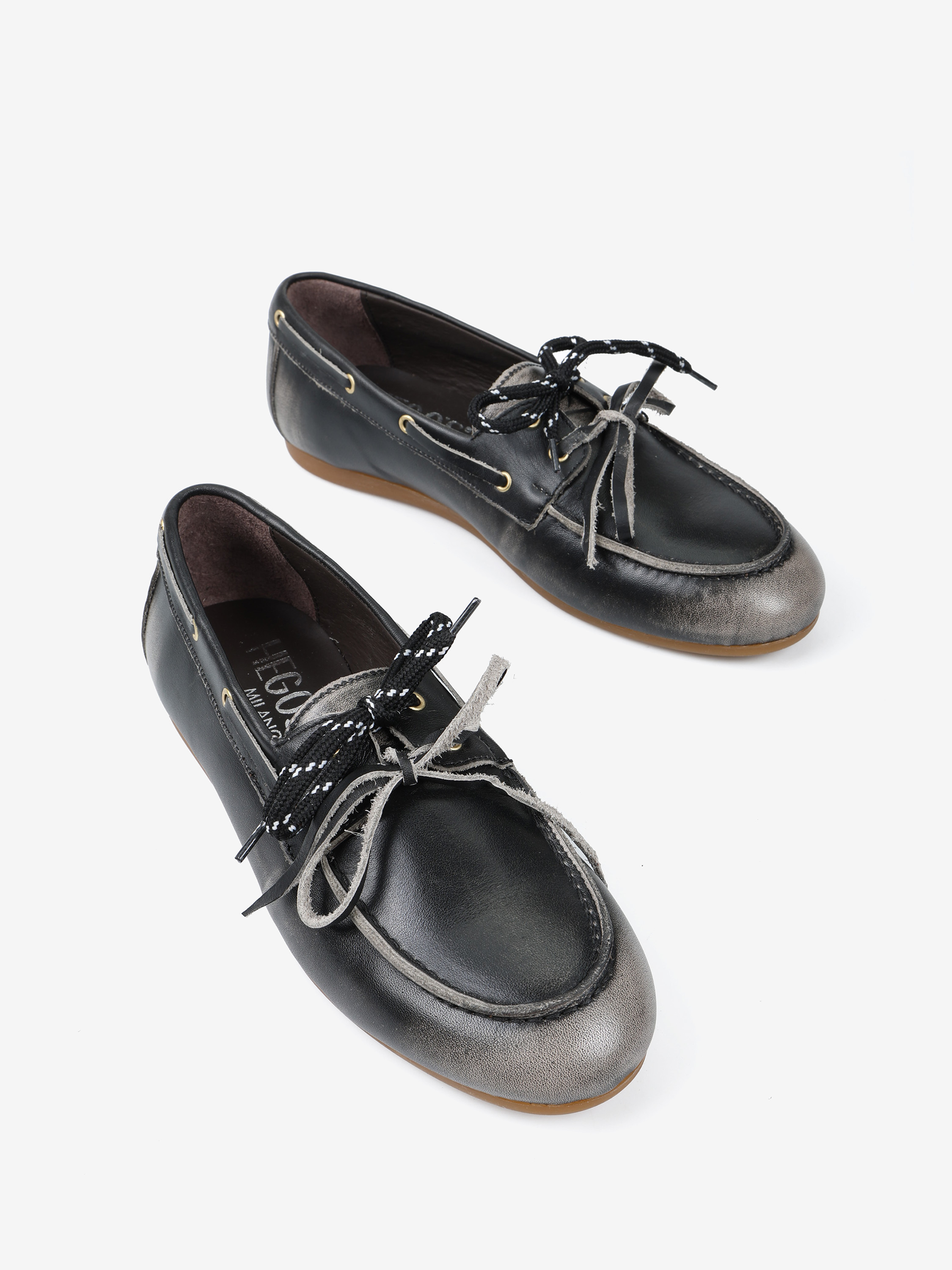 Mokasyny wykonane ze skóry z efektem sprania, z wiązaniem pozwalającym na idealne dopasowanie. Dodatkowa para czarnych sznurowadeł.
