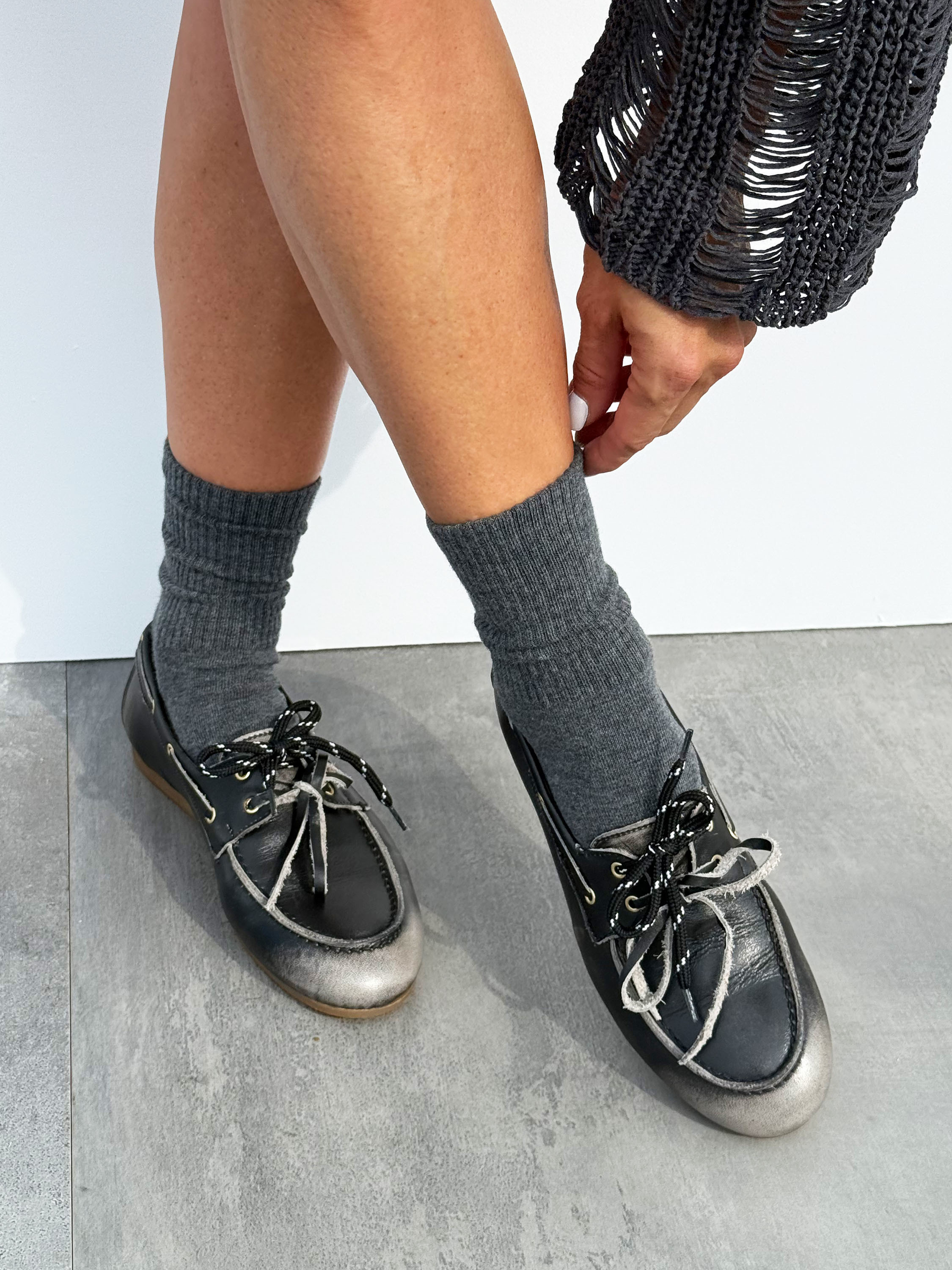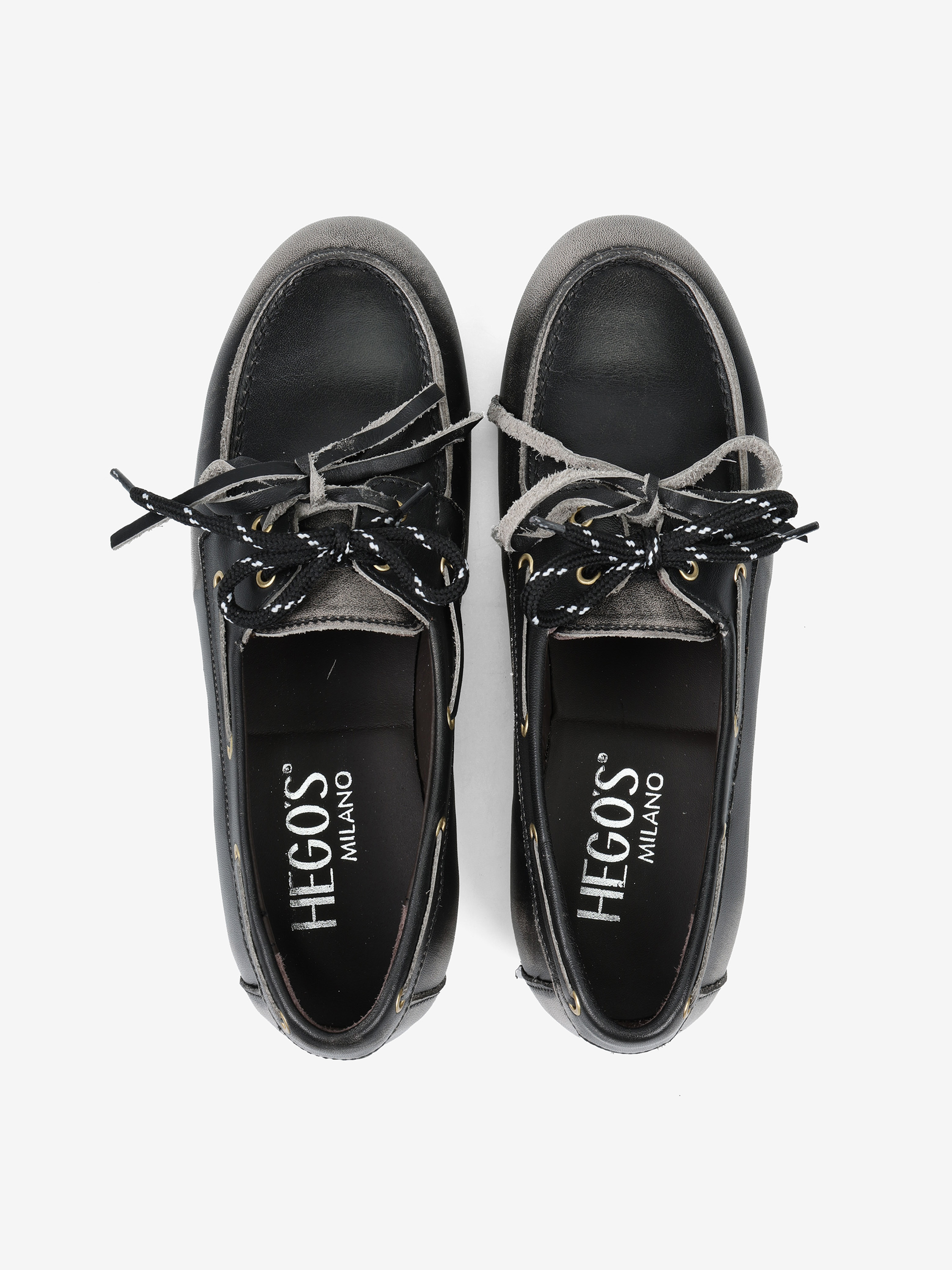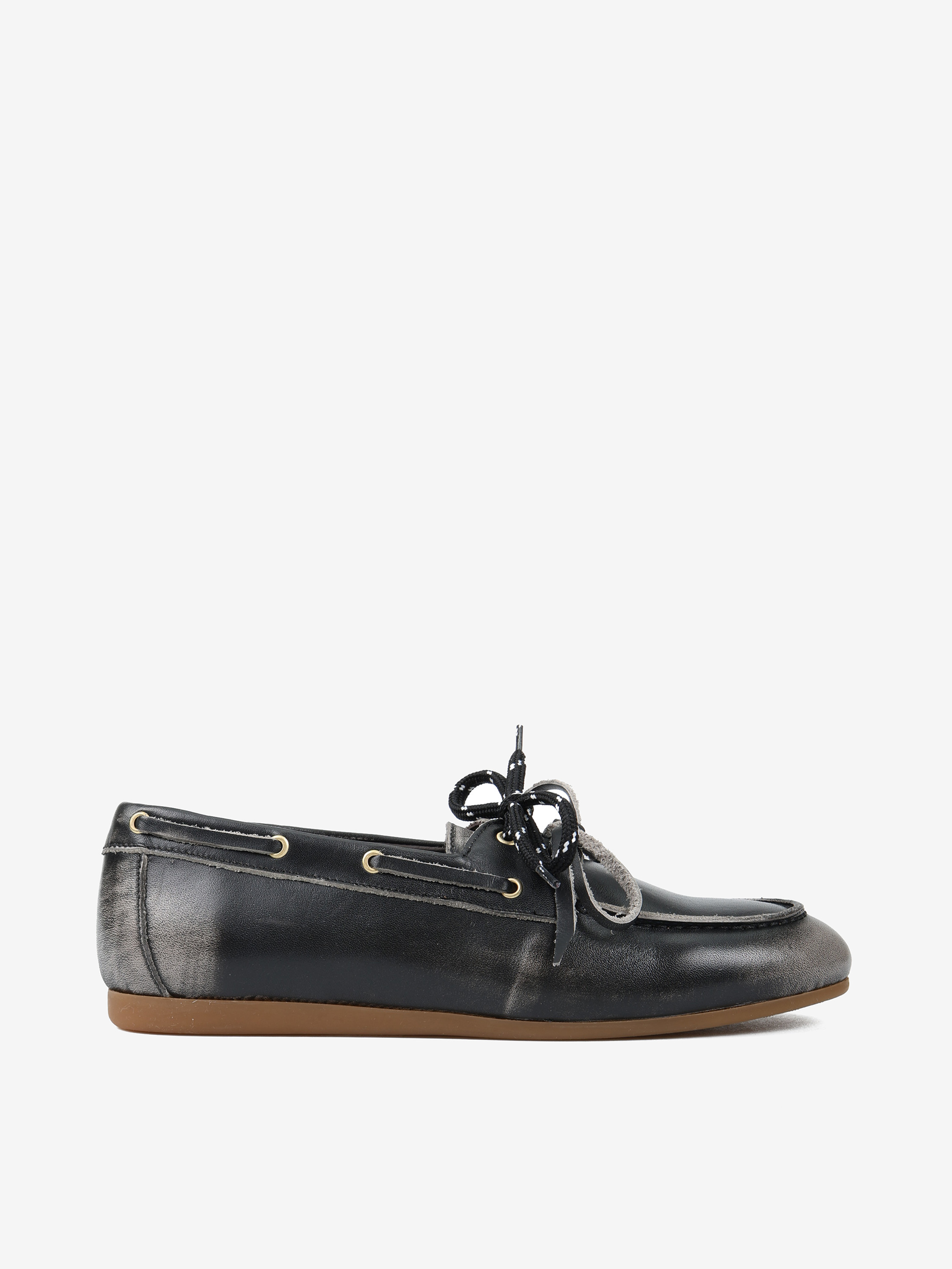 Mokasyny wykonane ze skóry z efektem sprania, z wiązaniem pozwalającym na idealne dopasowanie. Dodatkowa para czarnych sznurowadeł.